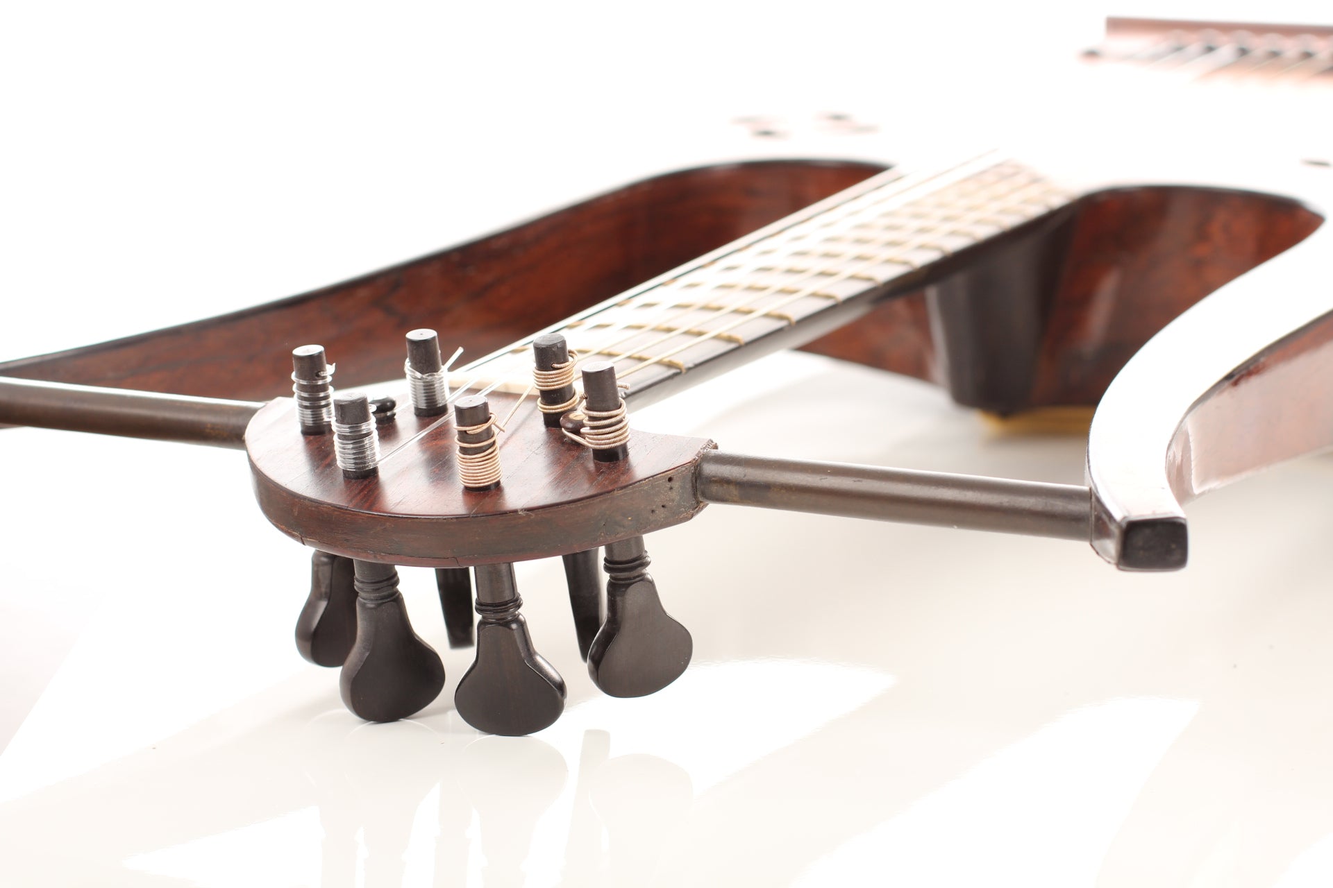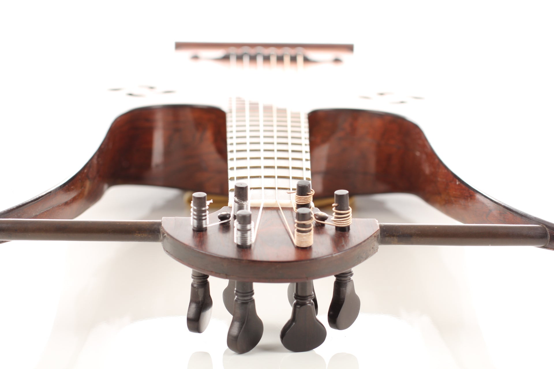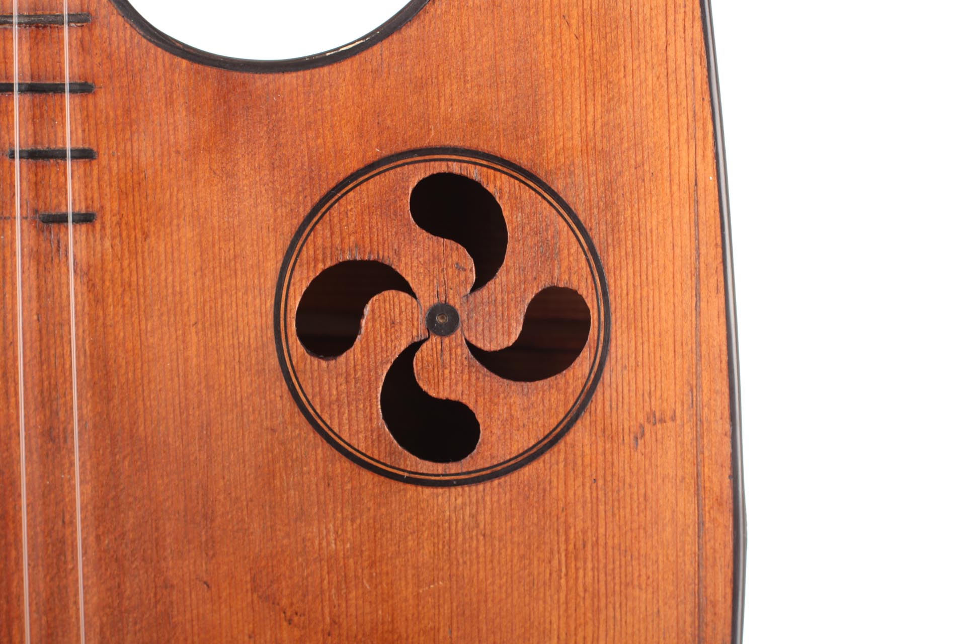 Schöne Terz Lyra Gitarre aus Mirecourt, die um 1820 gebaut wurde. Die Fichtendecke befindet sich in einem guten Zustand. Am rechten Rand befindet sich ein ausgespahnter Riss. Boden und Zargen sind aus Palisander gefertigt. Die Innenseite des Bodens besteht aus Fichte. Die Lyra Gitarre ist spielbereit.