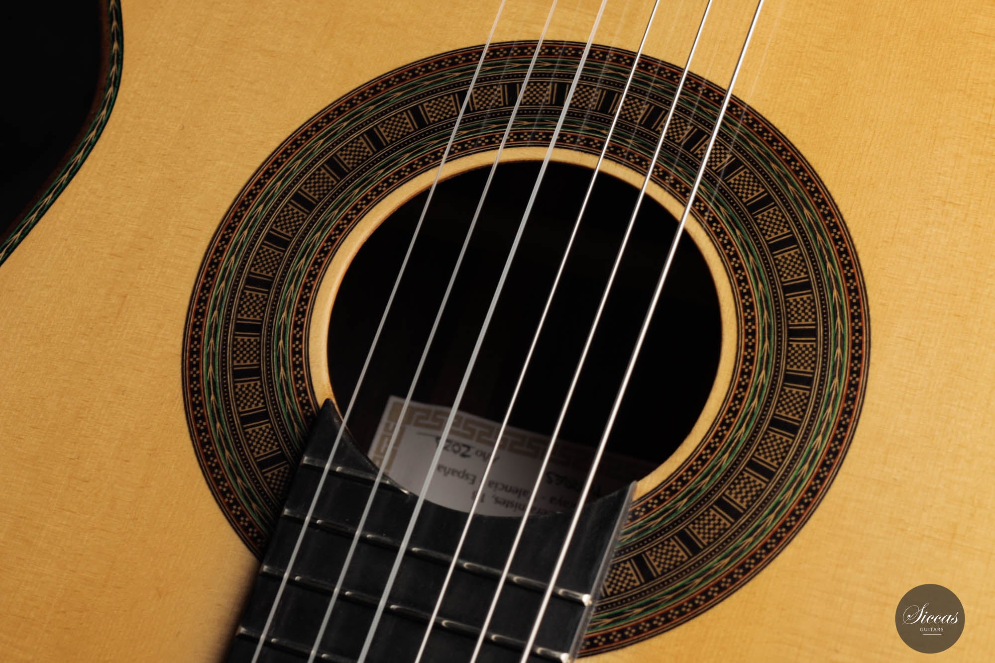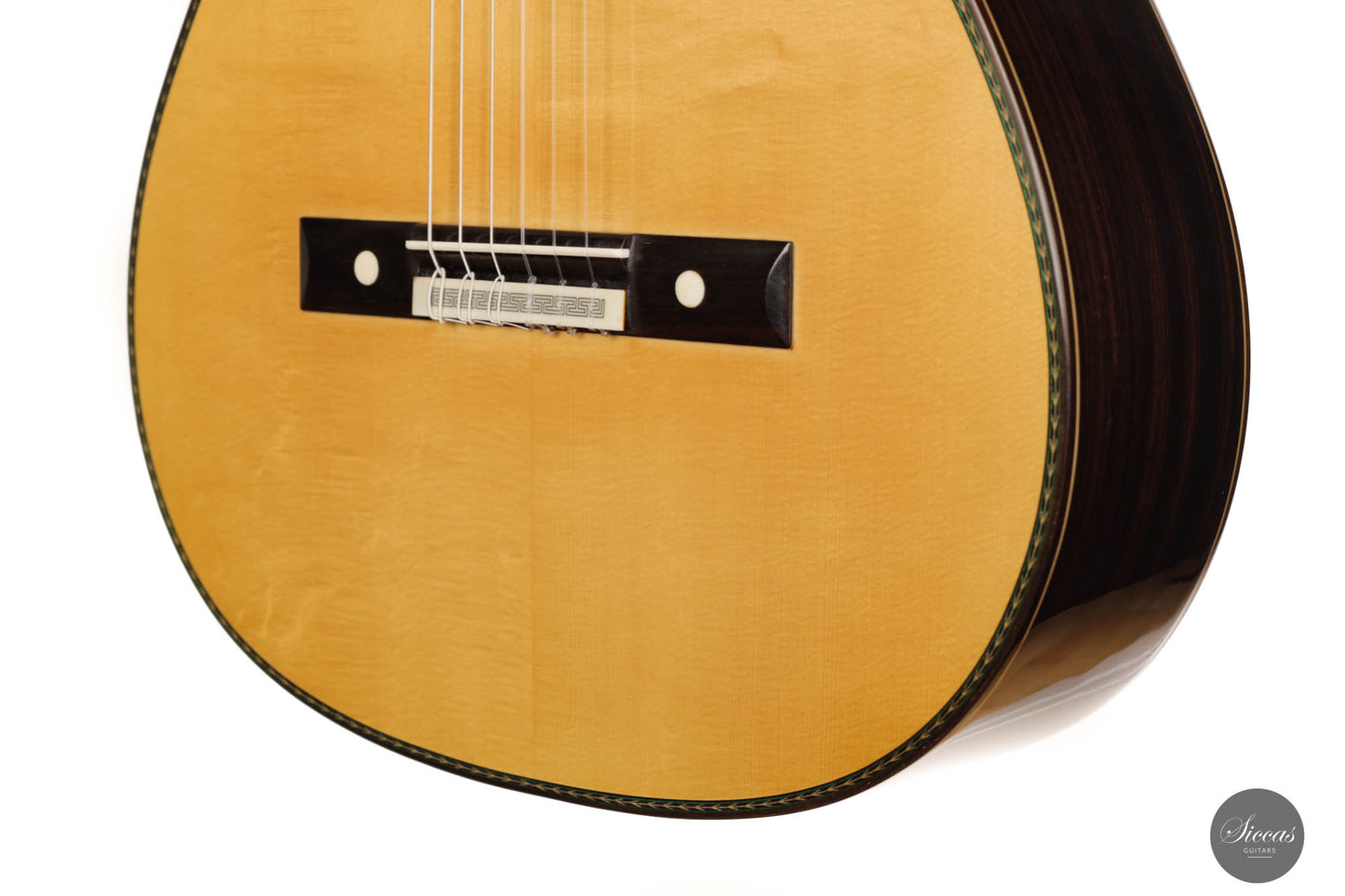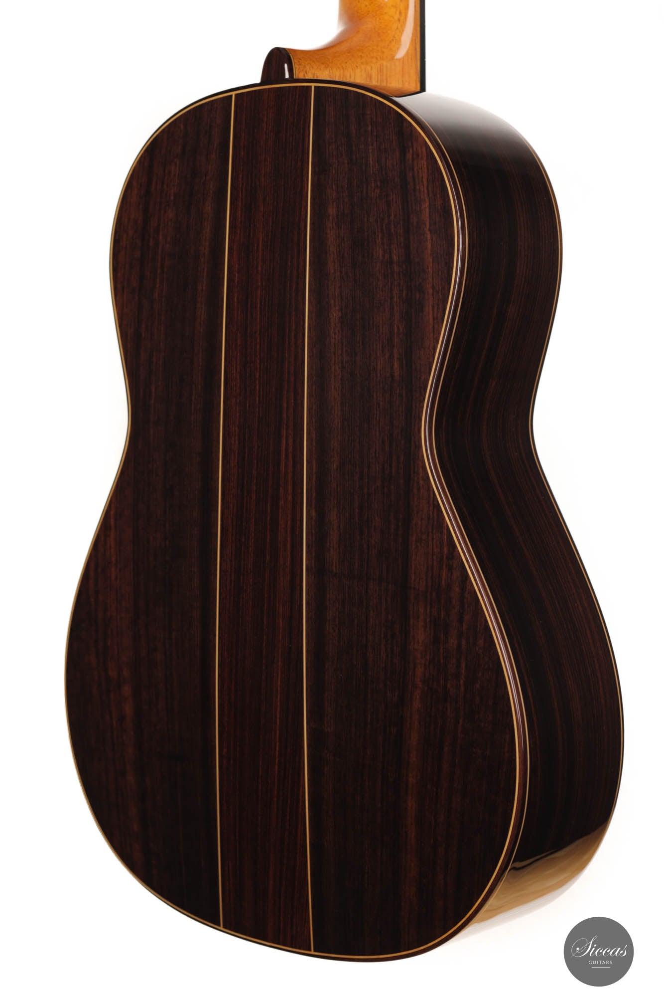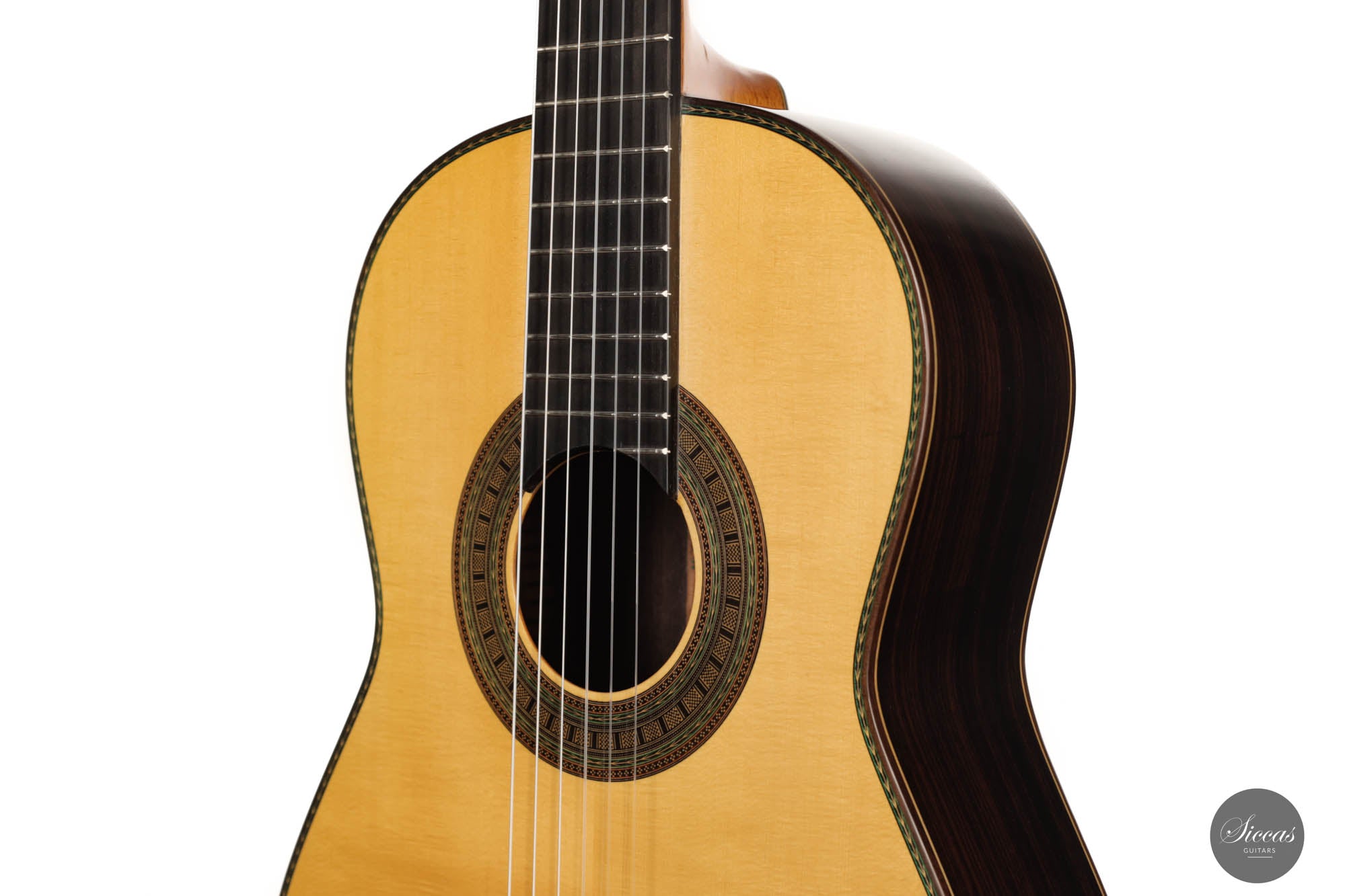 Die 2023 Manuel Adalid "Torres"-Gitarre ist ein wunderbares Instrument, das eine Hommage an die legendäre Antonio de Torres-Gitarre in der heutigen Zeit darstellt. Die Gitarre verfügt über eine wunderschöne Fichtendecke und einen markanten Boden und Zargen aus indischem Palisander, die dem Instrument einen Hauch von Eleganz und Raffinesse verleihen. Die Fichtendecke wurde mit einer Schellackpolitur versehen, die ihr ein glattes und glänzendes Aussehen verleiht, während sie dem Holz erlaubt, frei zu schwingen und einen reichen, komplexen Ton zu erzeugen. Der Boden und die Zargen wurden mit Nitrocellulose behandelt, einer hochwertigen Lackierung, die die Haltbarkeit erhöht, ohne den Ton oder die Resonanz zu beeinträchtigen. Klanglich fängt die Manuel Adalid "Torres"-Gitarre mit ihrer singenden und künstlerischen Qualität das Wesen der spanischen Gitarrencharakteristik des frühen 20. Jahrhunderts mit ihrer singenden und künstlerischen Qualität. Die Gitarre hat einen warmen und ausgewogenen Ton mit hervorragender Projektion und Sustain, was sie zu einem idealen Instrument für klassische Gitarristen macht, die den traditionellen spanischen Klang einfangen wollen. Abgesehen von ihrem außergewöhnlichen Klang und ihrem schönen Design ist die Manuel Adalid "Torres"-Gitarre auch ein hervorragendes Preis-Leistungs-Verhältnis. Sie bietet viele großartige Eigenschaften, die über ihren Preis hinausgehen und sie zu einer erschwinglichen Option für Gitarristen auf allen Ebenen machen. Insgesamt ist diese Gitarre ein Zeugnis für das Können und die Kunstfertigkeit ihres Erbauers und eine schöne Hommage an das Erbe von Antonio de Torres.