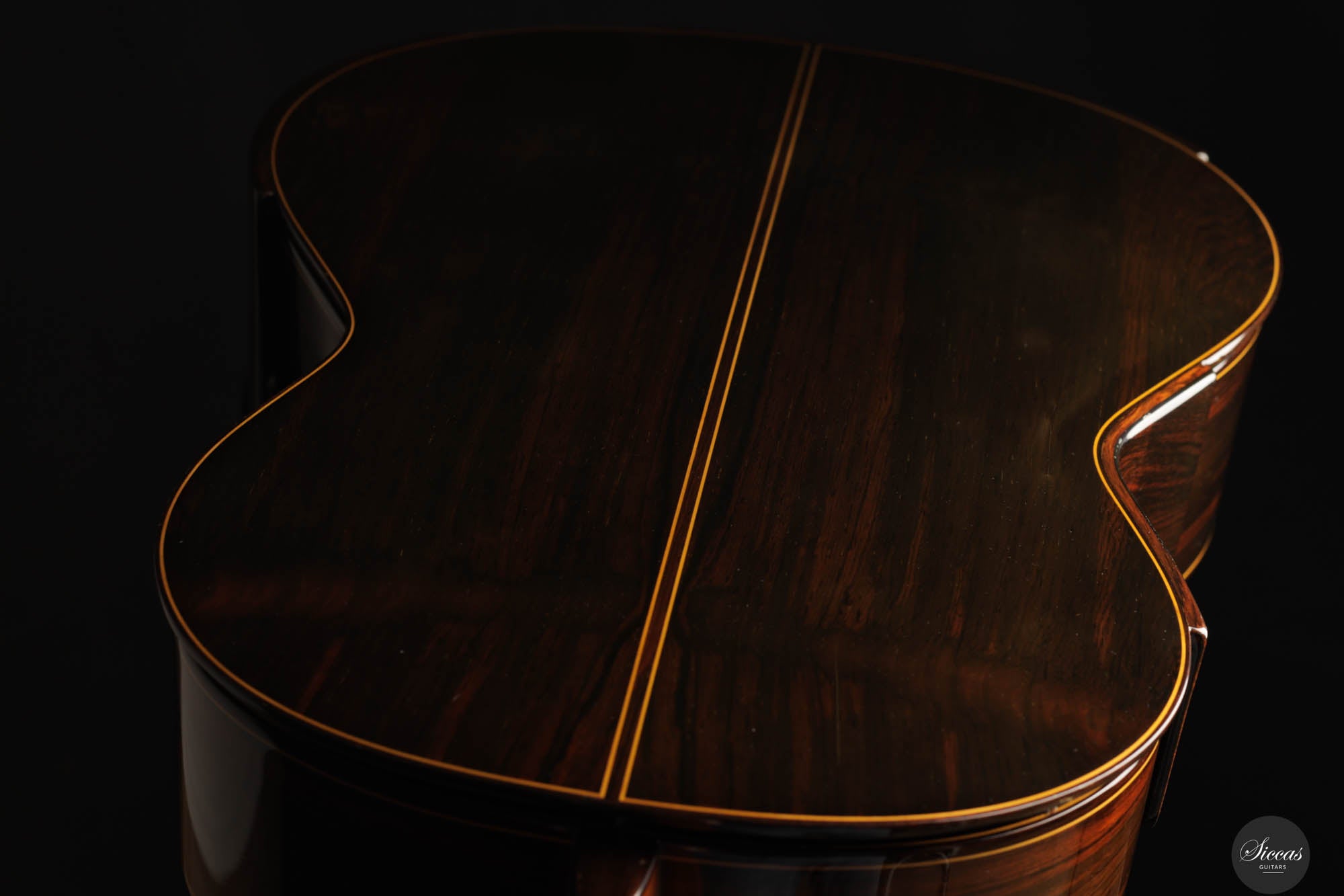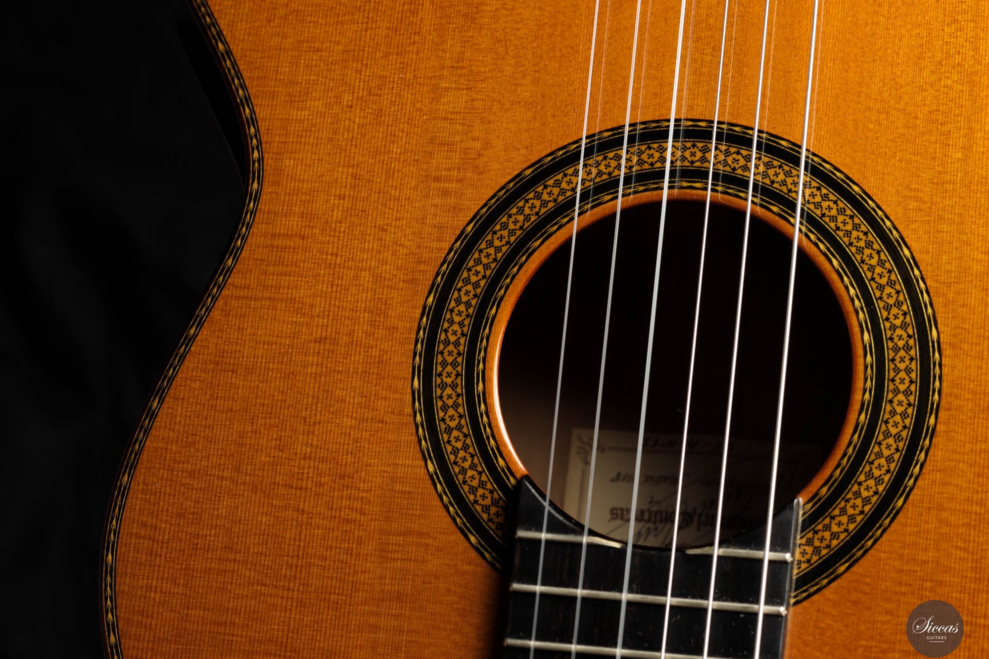This extraordinary instrument, crafted by one of the most renowned Spanish luthiers, features a rare and innovative resonador—an outer resonating shell that completely shields the main guitar body from direct contact with the player. This design eliminates any dampening effect caused by the player’s body, allowing the entire interior body to resonate freely, maximizing projection and tonal depth. While resonador models are already considered rare, this particular instrument is even more exceptional due to its integrated cedar armrest, a unique feature that enhances both comfort and playability. The guitar is in very good condition, with just one expertly repaired crack on the lower bout of the cedar soundboard, ensuring full structural integrity. Sonically, this guitar delivers a huge, voluminous sound, yet retains a romantic warmth that is characteristic of the Madrid school of guitar making. Additionally, the presence of beautiful Brazilian rosewood further enhances its value and desirability, making this an exceptional and rare collector’s piece.Regelmäßige Pflege verlängert die Lebensdauer des Instruments