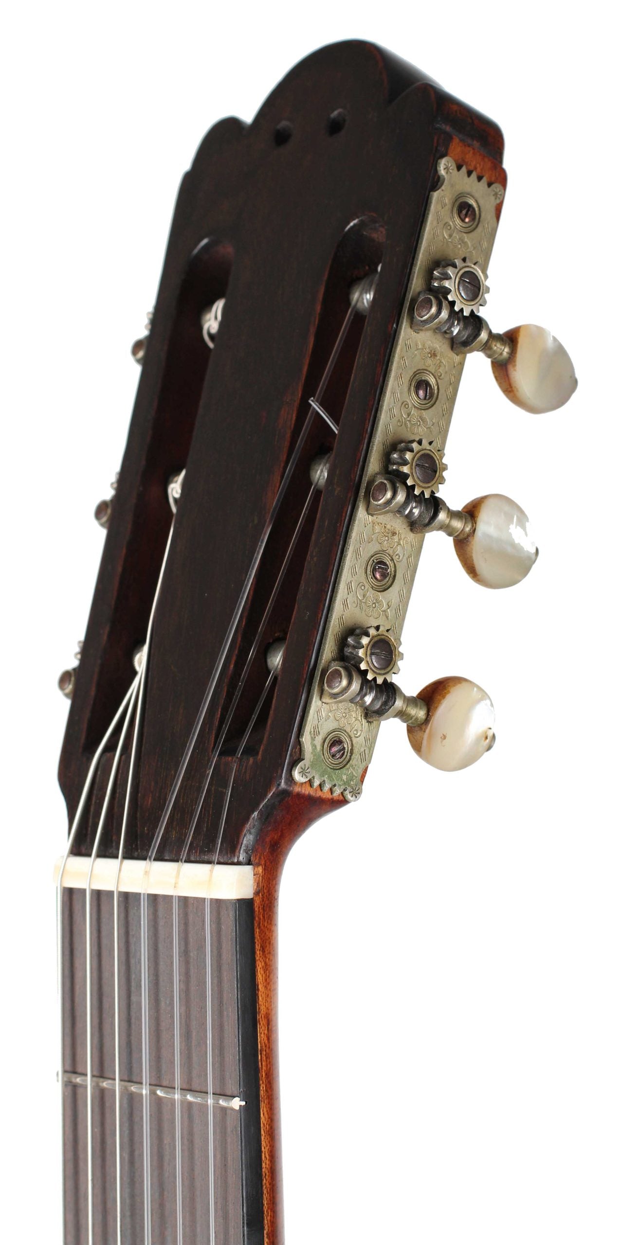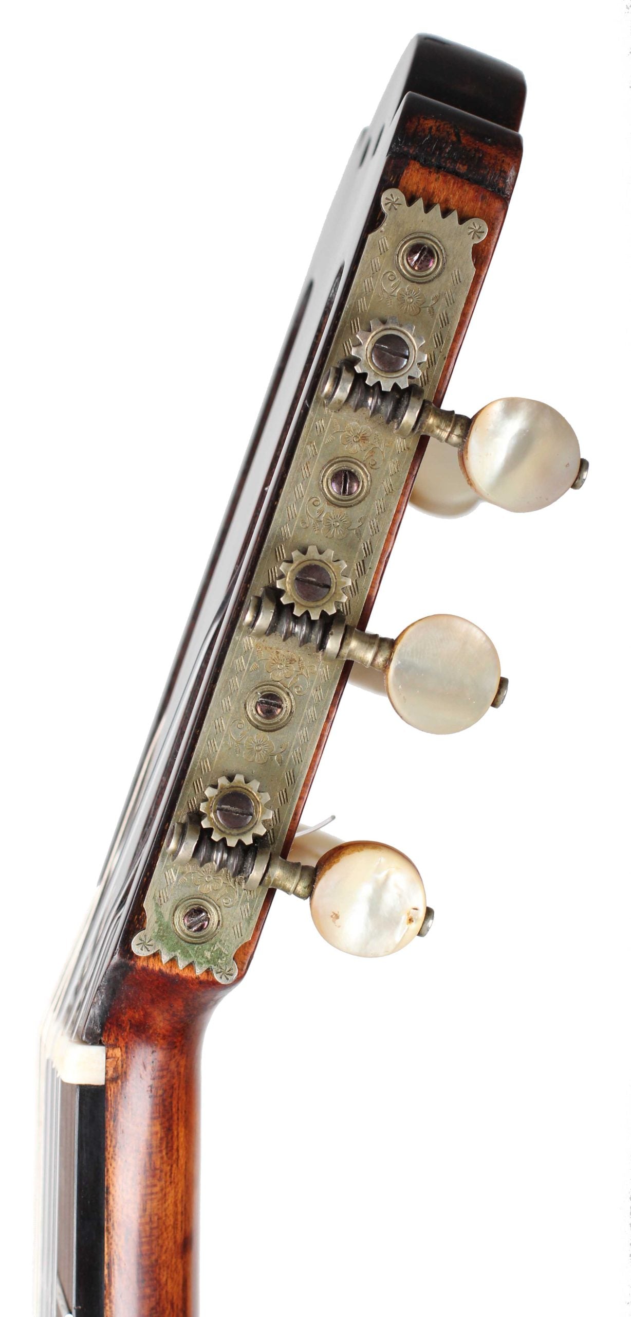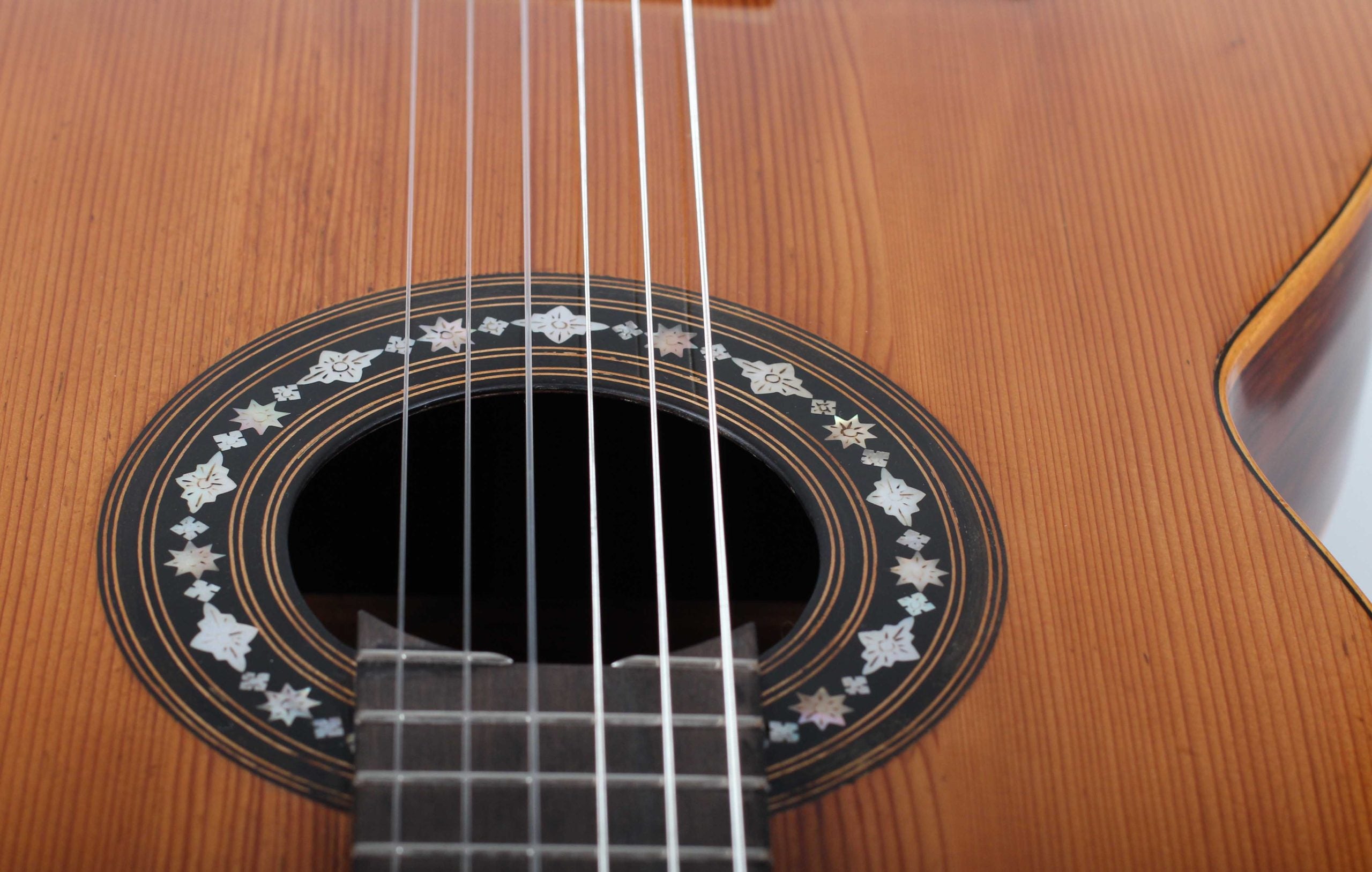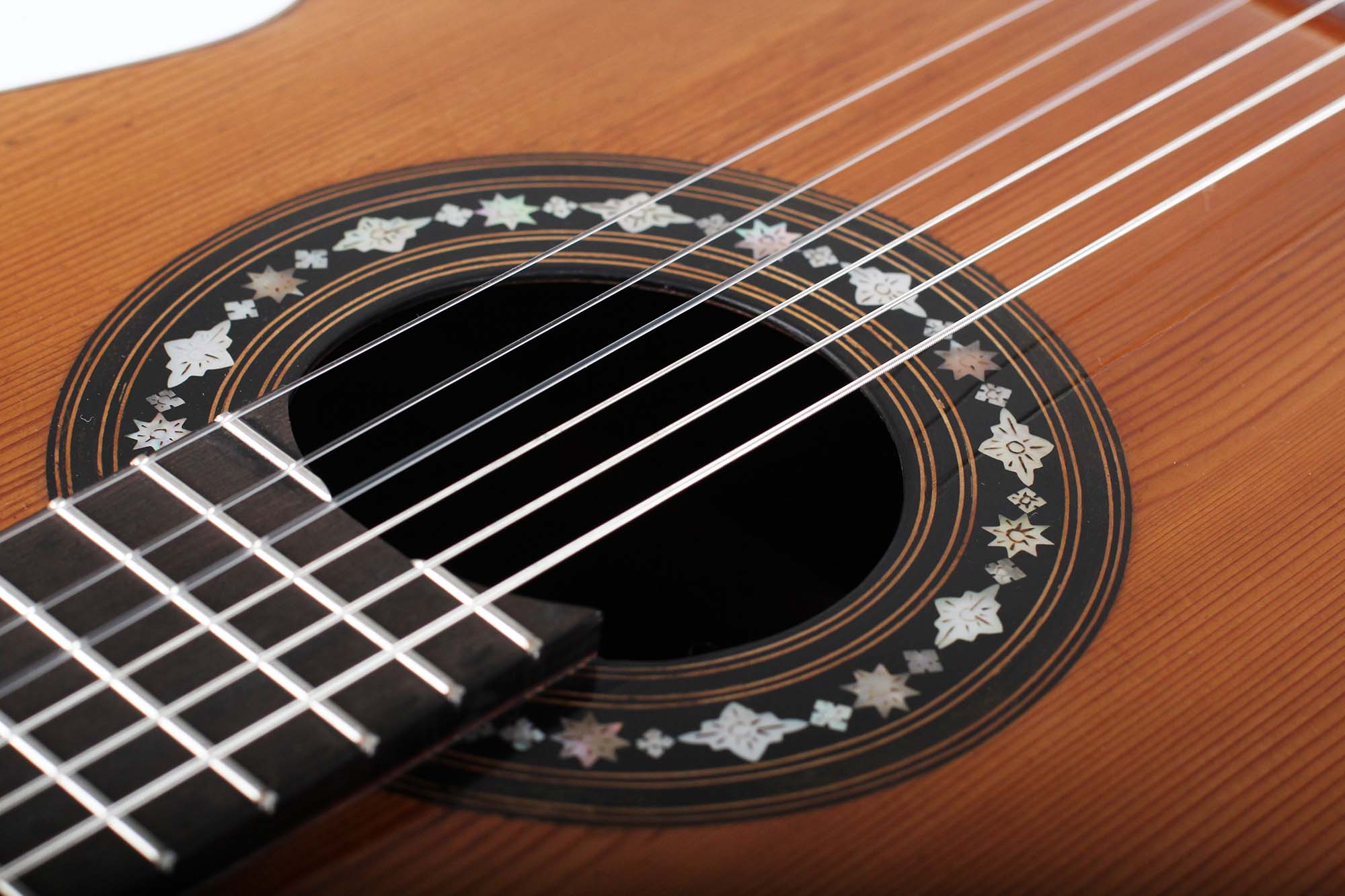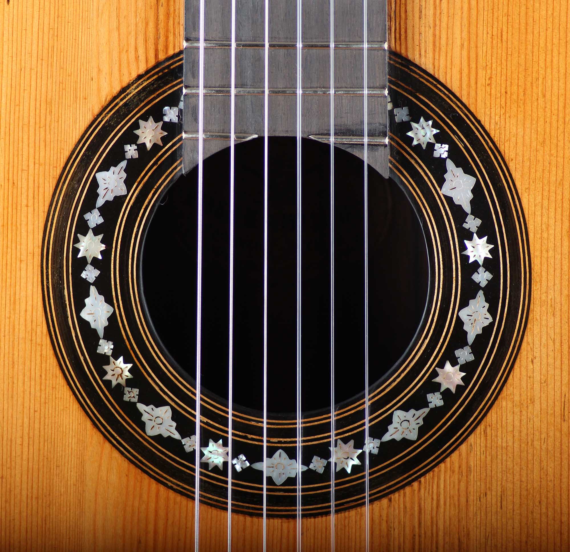Manuel de Soto y Solares (1839-1906) war ein Gitarrenbauer aus Sevilla der seine Werkstatt in der 'Calle Cerragería' hatte, es ist die gleiche Straße, in der auch Antonio de Torres seine Werkstatt hatte. Ganz offensichtlich wurde Manuel durch die Arbeit sehr stark beeinflusst, was man daran erkennen kann, dass er zum Teil verblüffend ähnliche Gitarren wie Torres gebaut hat. De Soto y Solares profitierte sehr auch von Torres' Bekanntheitsgrad. Es war dieser Bekanntheitsgrad, der die Nachfrage für Gitarren im Stile von Torres sehr ansteigen ließ. Diese große Nachfrage konnte jedoch nicht befriedigt werden, sodass viele Kunden auch Gitarren von Gitarrenbauern kauften, die ähnliche Gitarren wie Torres bauten. Diese Gitarre ist in einem sehr guten Zustand, wenn man bedenkt, dass sie beinahe 150 Jahre alt ist. Auf der Decke befinden sich zwei reparierte Risse, die kaum zu sehen sind. Boden und Zargen bestehen aus wunderschön rötlich leuchtendem Palisander. Auf dem Boden befinden sich kleinere reparierte Risse. Ein besonderes Instrument mit hervorragenden klanglichen Eigenschaften. Es macht einfach Freunde, nach und nach das ganze Potential und das Klangspektrum dieses Instruments zu entdecken.