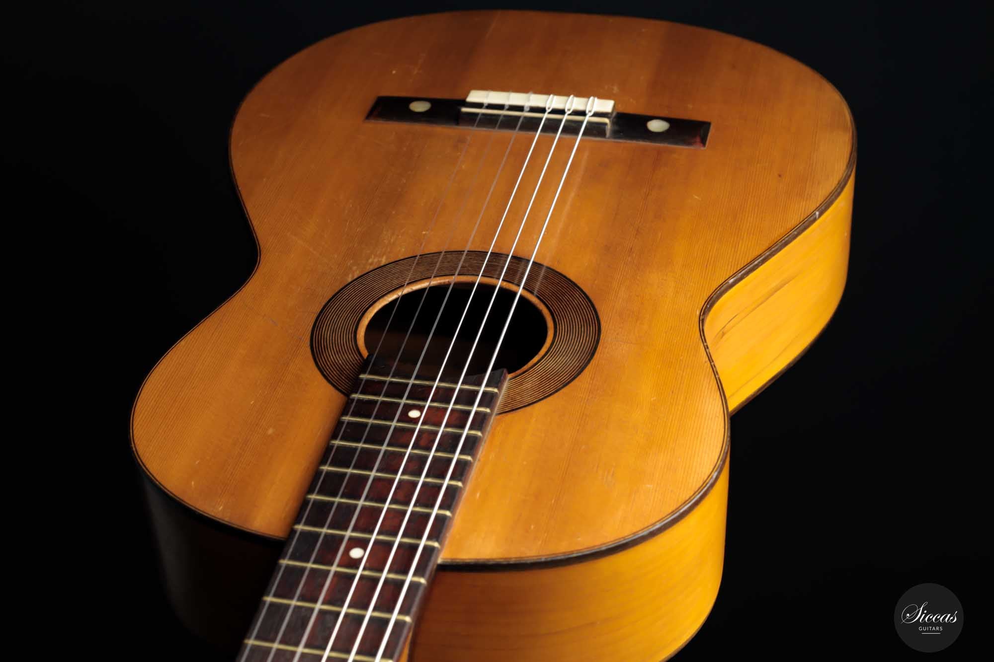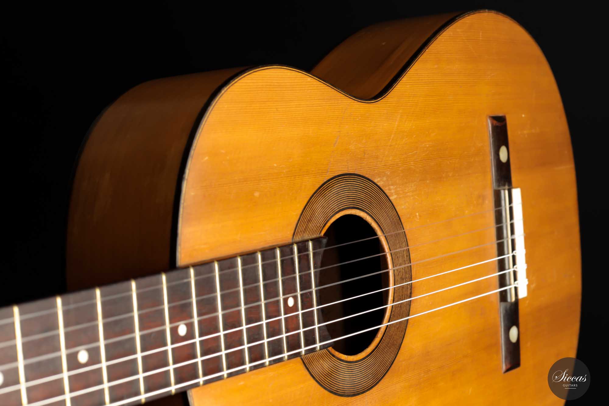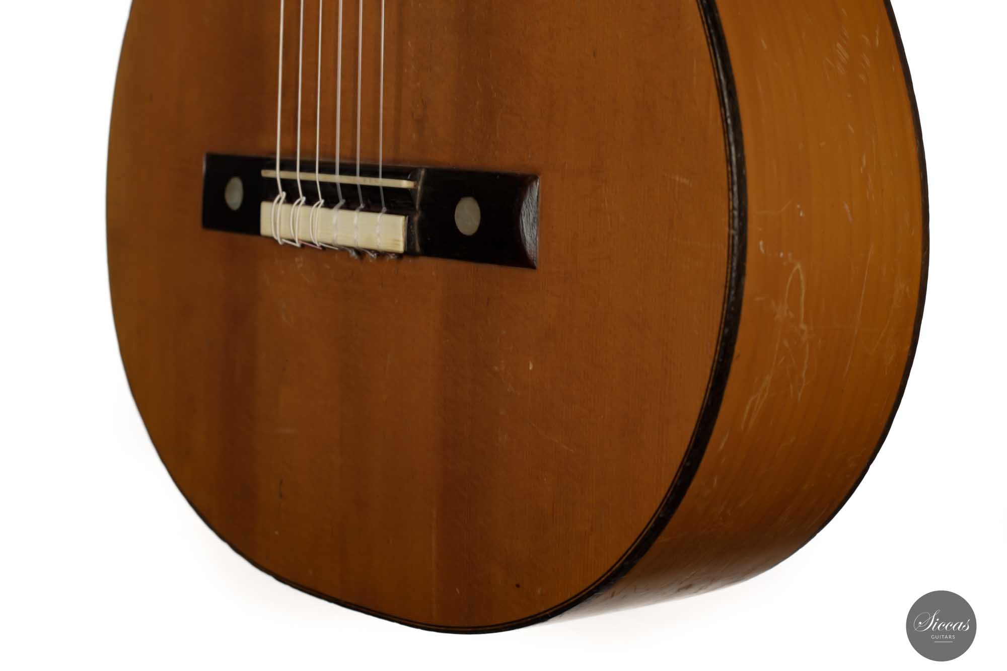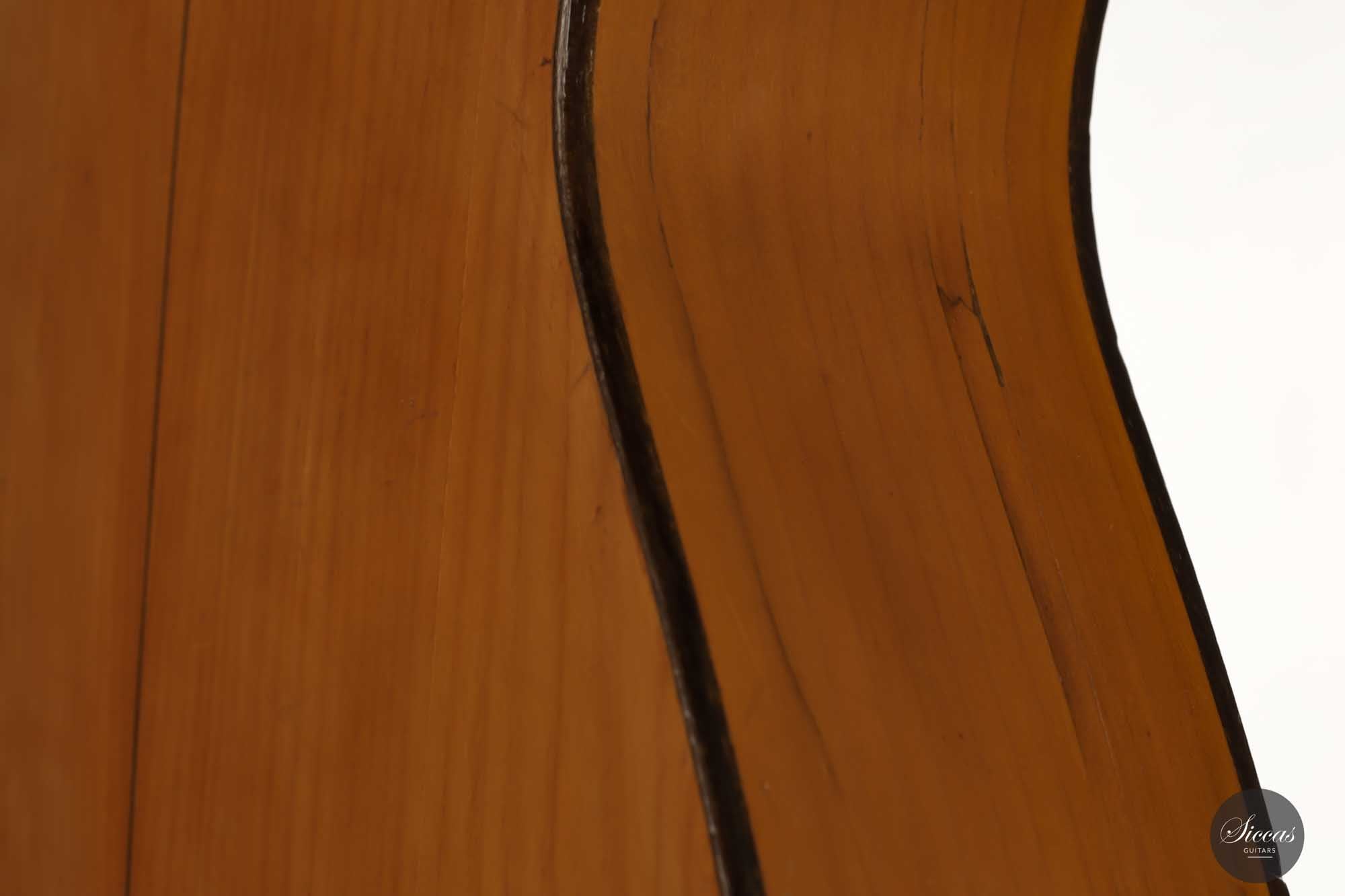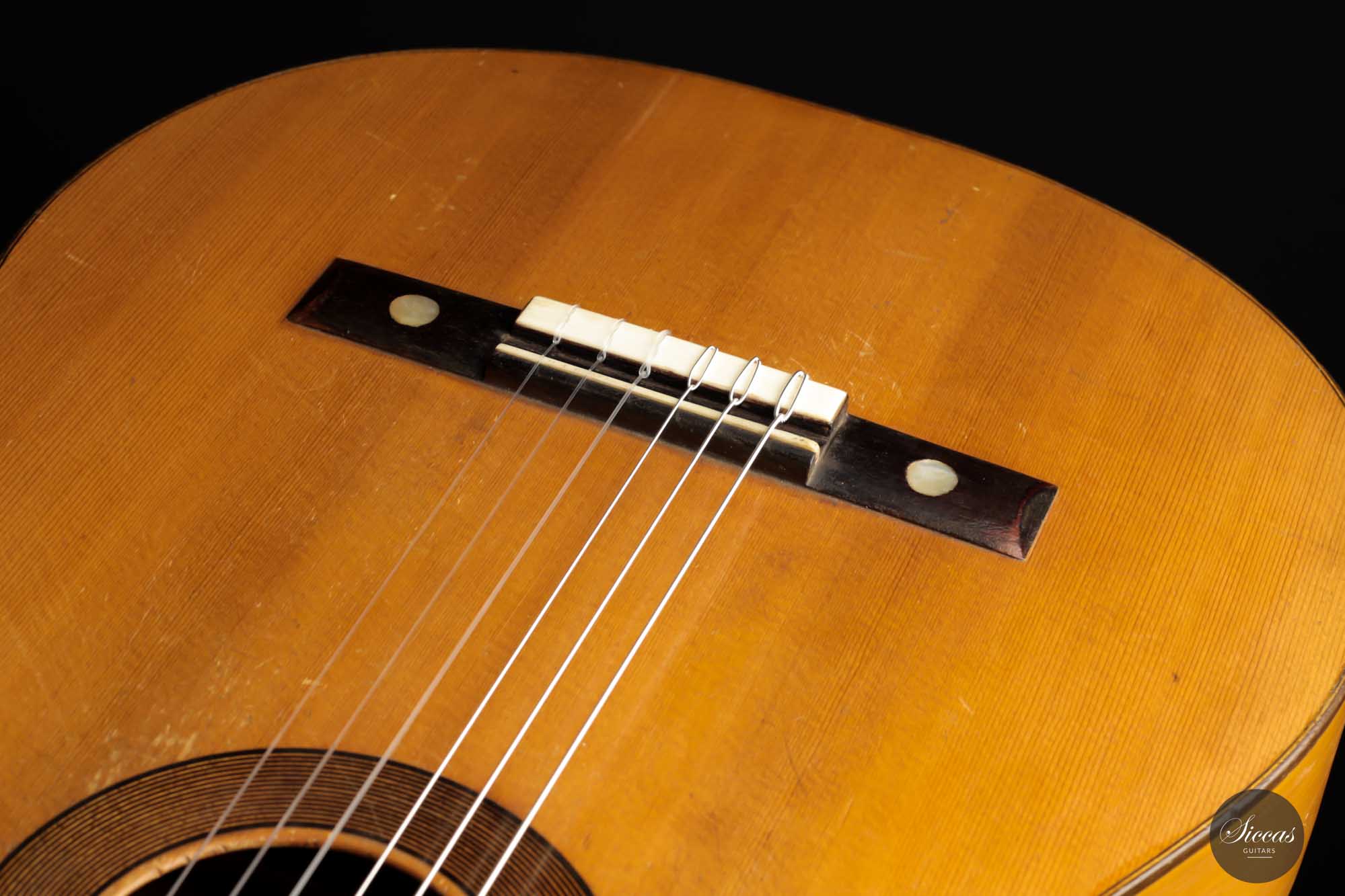 Dieses schöne Modell wurde zwischen 1903 und 1909 angefertigt und ist ein bedeutender Teil der spanischen Gitarrengeschichte. Es ist ein Instrument mit leicht kleinerem Korpus, das einen lebendigen spanischen Klangcharakter mit tiefen, dunklen, geheimnisvollen Bässen und klaren, glockenartigen, weichen Höhen hat. Durch das federleichte Gewicht verfügt diese Manuel Ramirez über ein beachtliches Volumen und eine unverzügliche Ansprache. Der geheimnisvolle Charakter und ihr Charme faszinieren nach wie vor Spieler und Zuhörer unterschiedlichster Art. Trotz ihres Alters ist diese Gitarre in einem ausgezeichneten Spielzustand, mit nur einem gut reparierten Riss an der Zarge. Die gut gealterte Fichtendecke und der Zypressenboden sind in einem bemerkenswerten Zustand und weisen nur geringe Spielspuren auf. Diese Manuel Ramirez-Gitarre ist ein Stück Zeitgeschichte, an dem Sammler und Spieler sich gleichermaßen erfreuen werden.