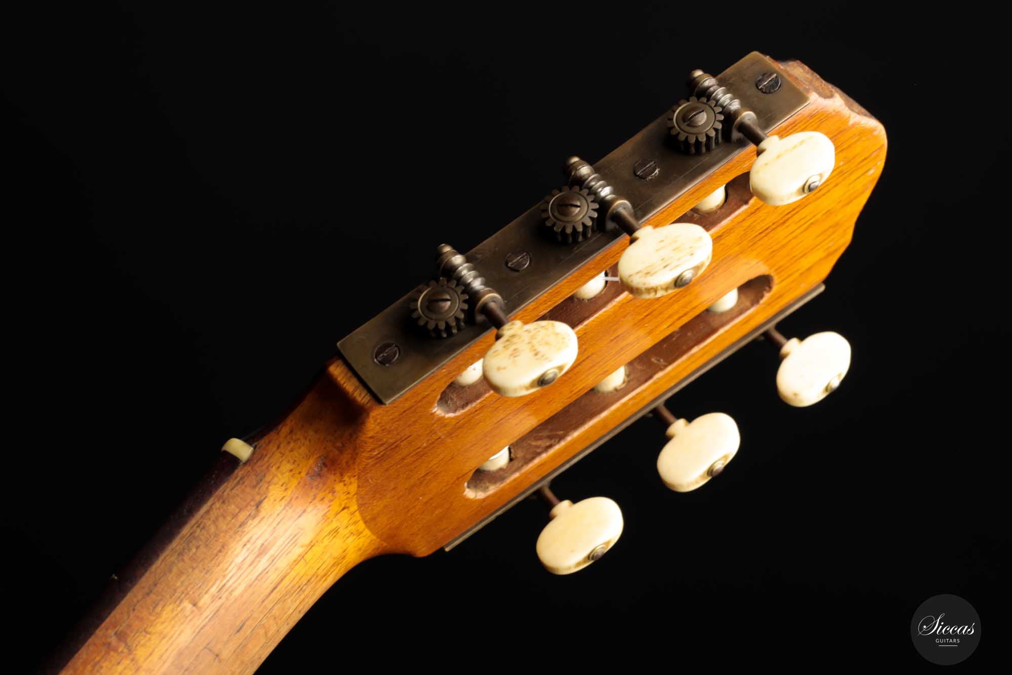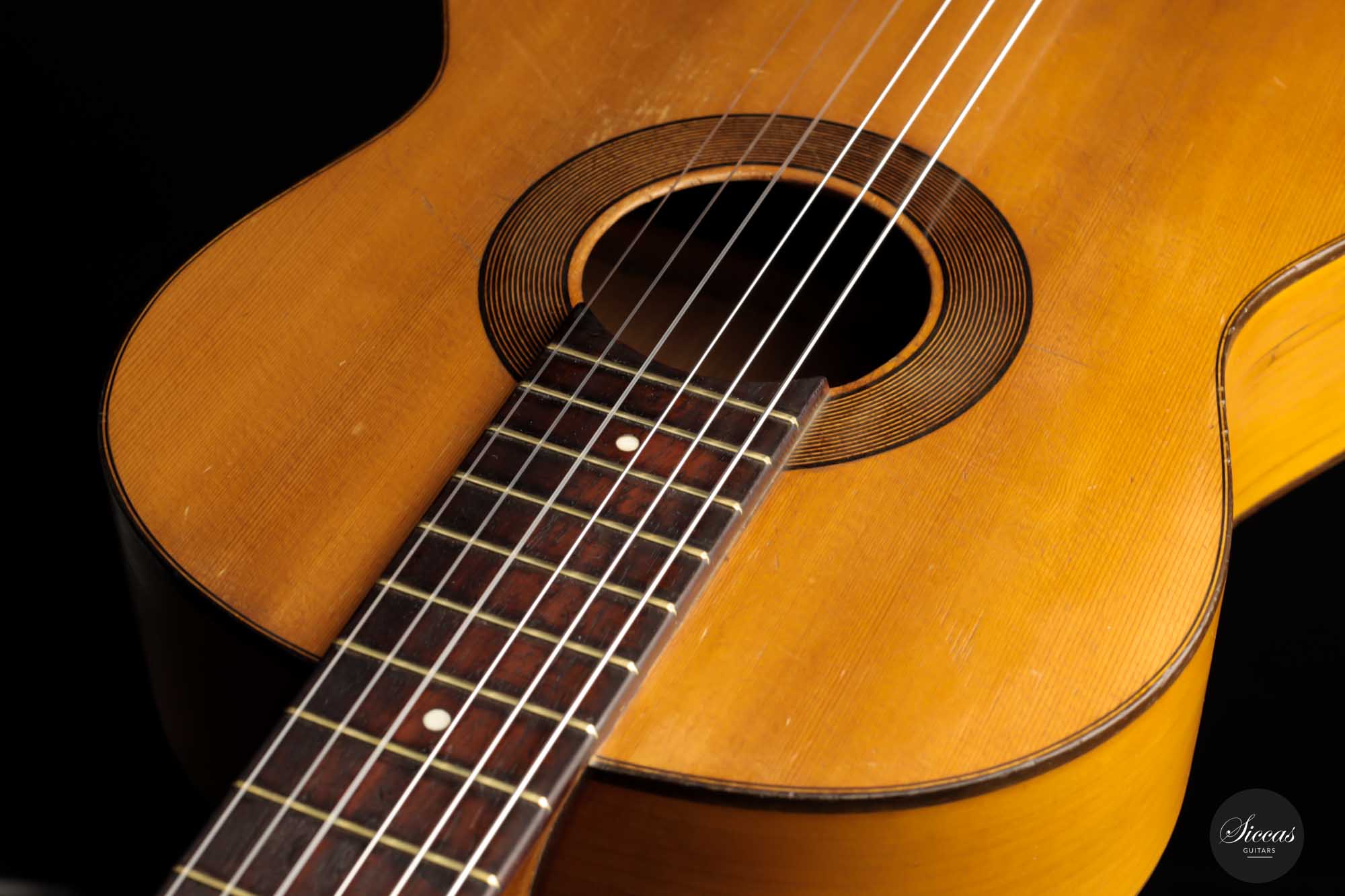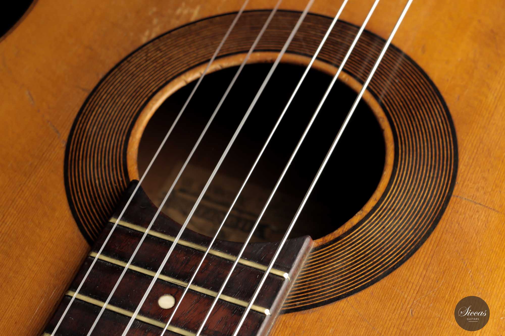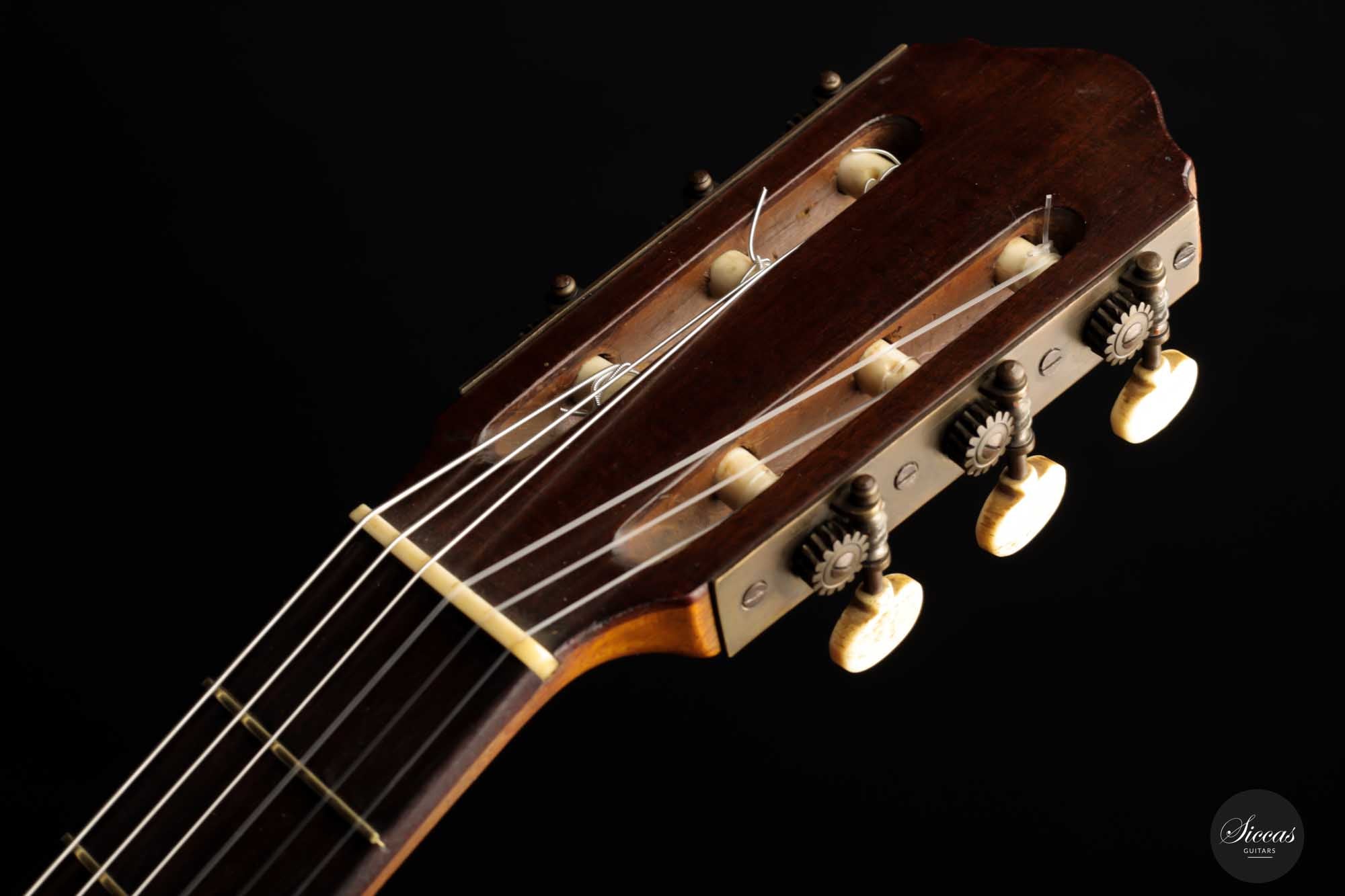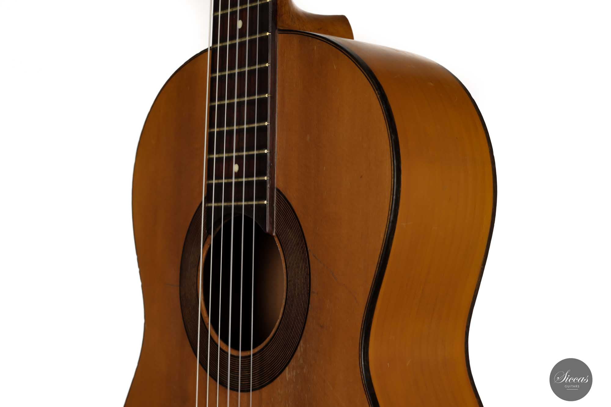 Dieses schöne Modell wurde zwischen 1903 und 1909 angefertigt und ist ein bedeutender Teil der spanischen Gitarrengeschichte. Es ist ein Instrument mit leicht kleinerem Korpus, das einen lebendigen spanischen Klangcharakter mit tiefen, dunklen, geheimnisvollen Bässen und klaren, glockenartigen, weichen Höhen hat. Durch das federleichte Gewicht verfügt diese Manuel Ramirez über ein beachtliches Volumen und eine unverzügliche Ansprache. Der geheimnisvolle Charakter und ihr Charme faszinieren nach wie vor Spieler und Zuhörer unterschiedlichster Art. Trotz ihres Alters ist diese Gitarre in einem ausgezeichneten Spielzustand, mit nur einem gut reparierten Riss an der Zarge. Die gut gealterte Fichtendecke und der Zypressenboden sind in einem bemerkenswerten Zustand und weisen nur geringe Spielspuren auf. Diese Manuel Ramirez-Gitarre ist ein Stück Zeitgeschichte, an dem Sammler und Spieler sich gleichermaßen erfreuen werden.