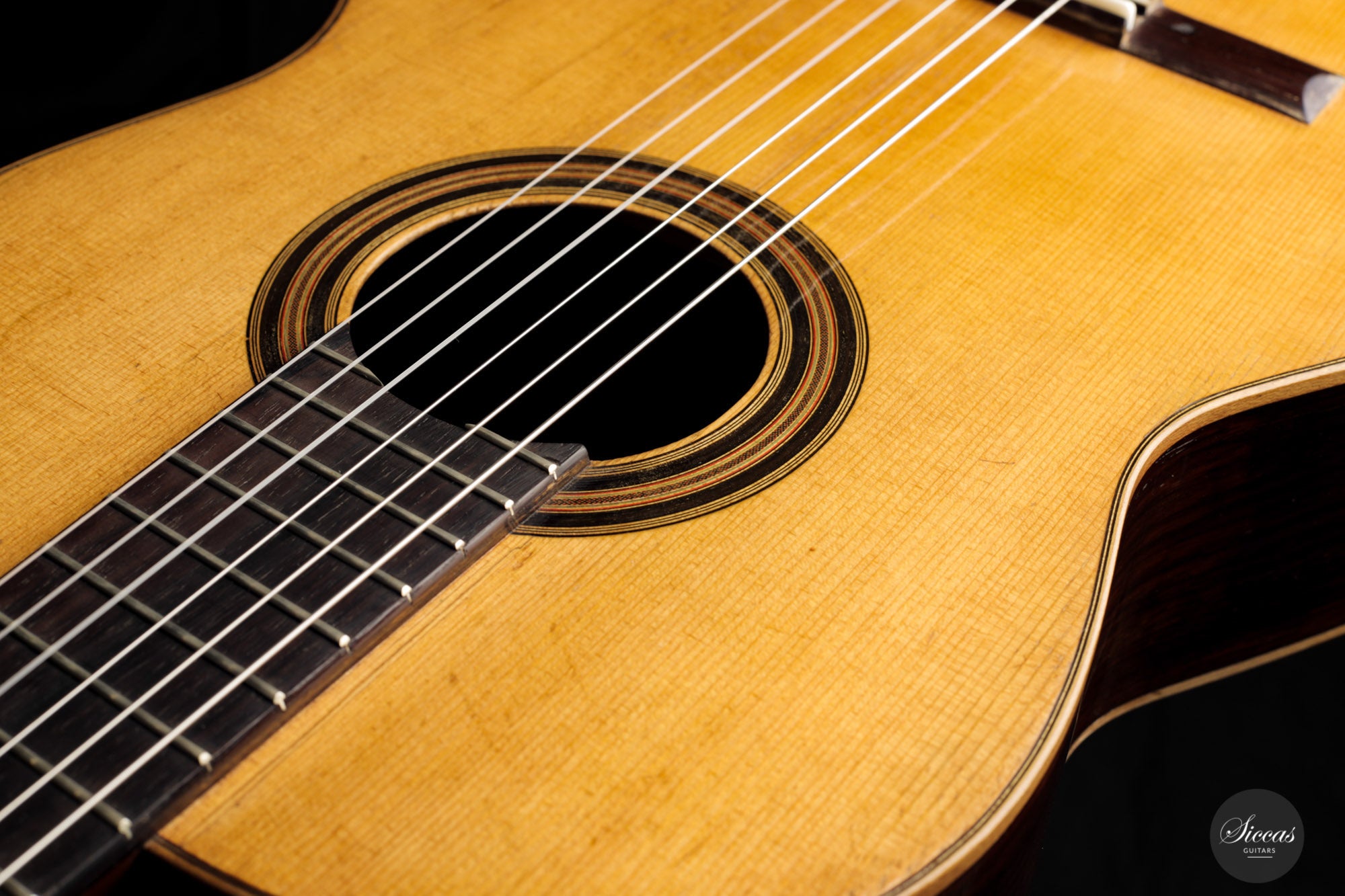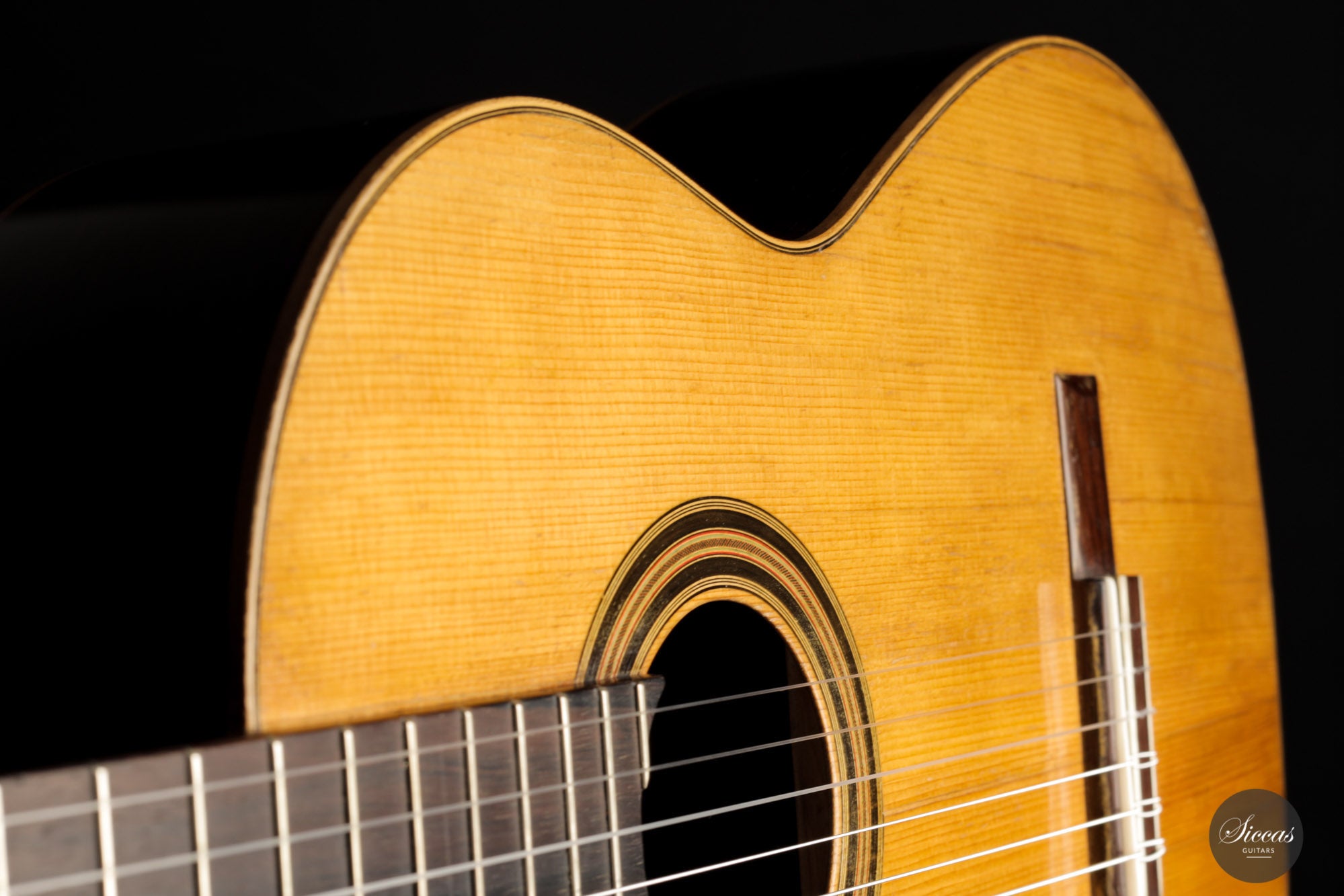 Manuel Ramirez' Konzertgitarrenmodelle in voller Größe sind rar, da diese auf Bestellung gebauten Instrumente teuer und exklusiv waren. Außerdem sind die Instrumente, die bis heute verblieben haben, sehr selten, so dass es ein echter Gewinn ist, eine dieser Gitarren zu finden. Diese herausragende Konzertgitarre in voller Größe aus dem Jahr 1915 ist faszinierend. Sie wurde in den letzten Jahren der Tätigkeit von Manuel Ramirez gebaut, die auch als seine goldene Ära gelten. Zu dieser Zeit wurde seine Werkstatt von den drei legendären Gitarrenbauern geleitet: Santos Hernandez, Domingo Esteso und Modesto Borreguero. Diese Gitarre aus Fichte und brasilianischem Palisander (pre-CITES) ist eine Sonderbestellung des angesehenen madrilenischen Gitarristen, Professors und Vizepräsidenten der Gitarrengesellschaft "Los cuatro gatos", Ignacio Balgañón. Diese Gesellschaft zählte unter ihren Mitgliedern José Ramirez I (1858-1923), Santos Hernandez und Modesto Borreguero zu den einflussreichsten Persönlichkeiten der madrilenischen Gitarrenwelt. Eine der besonders faszinierenden Eigenschaften dieser außergewöhnlichen Gitarre ist, dass sie eine von nur zwei bekannten Gitarren mit einem speziell gewidmeten Etikett ist. Darauf steht in sehr eleganten Druckbuchstaben: "Construida para mi amigo Ignacio Balgañón / Manuel Ramirez / Año 1915 / MADRID". Die erste Zeile ist besonders interessant, da sie die Nähe von Manuel Ramirez und Ignacio Balgañon zeigt: "Gebaut für meinen Freund Ignacio Balgañón".