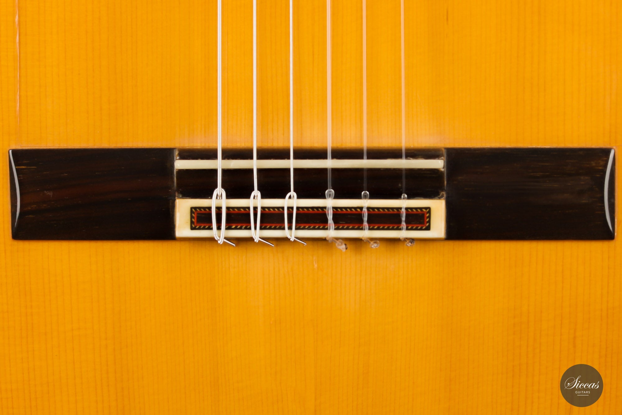 This wonderful Manuel Reyes from 1964 has not only the sound character so typical of his guitars but also an interesting history. For about ten years, this guitar was part of Pepe Romero's famous collection. This extremely versatile guitarist, who has recorded more than 60 albums and played countless concerts all over the world, is known for choosing the most beautiful examples of guitar-making history for his personal collection, and this guitar is an impressive representative of that. But even before that, this wonderful Flamenca Blanca belonged to the famous flamenco guitarist Pepe Martinez, so it was owned by two great musicians alike. Moreover, the repair of some cracks as well as the finish of this guitar was done by none other than Manuel Reyes himself, as evidenced by an invoice from his workshop. This guitar plays with amazing ease, and its tone is simply exceptional, with sparkling, lively trebles and crisp, powerful basses. A truly exceptional guitar with a very intriguing tonal character.