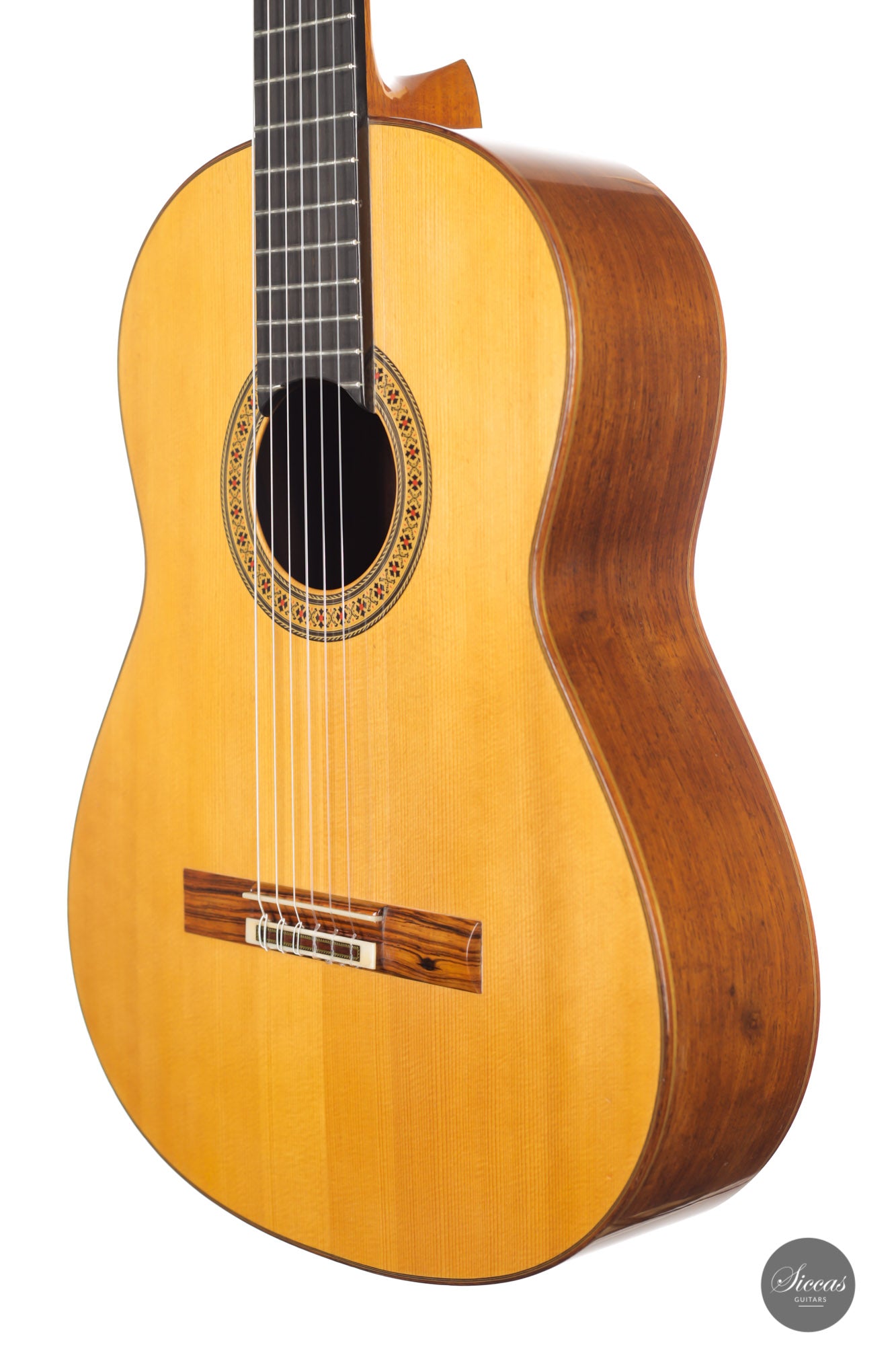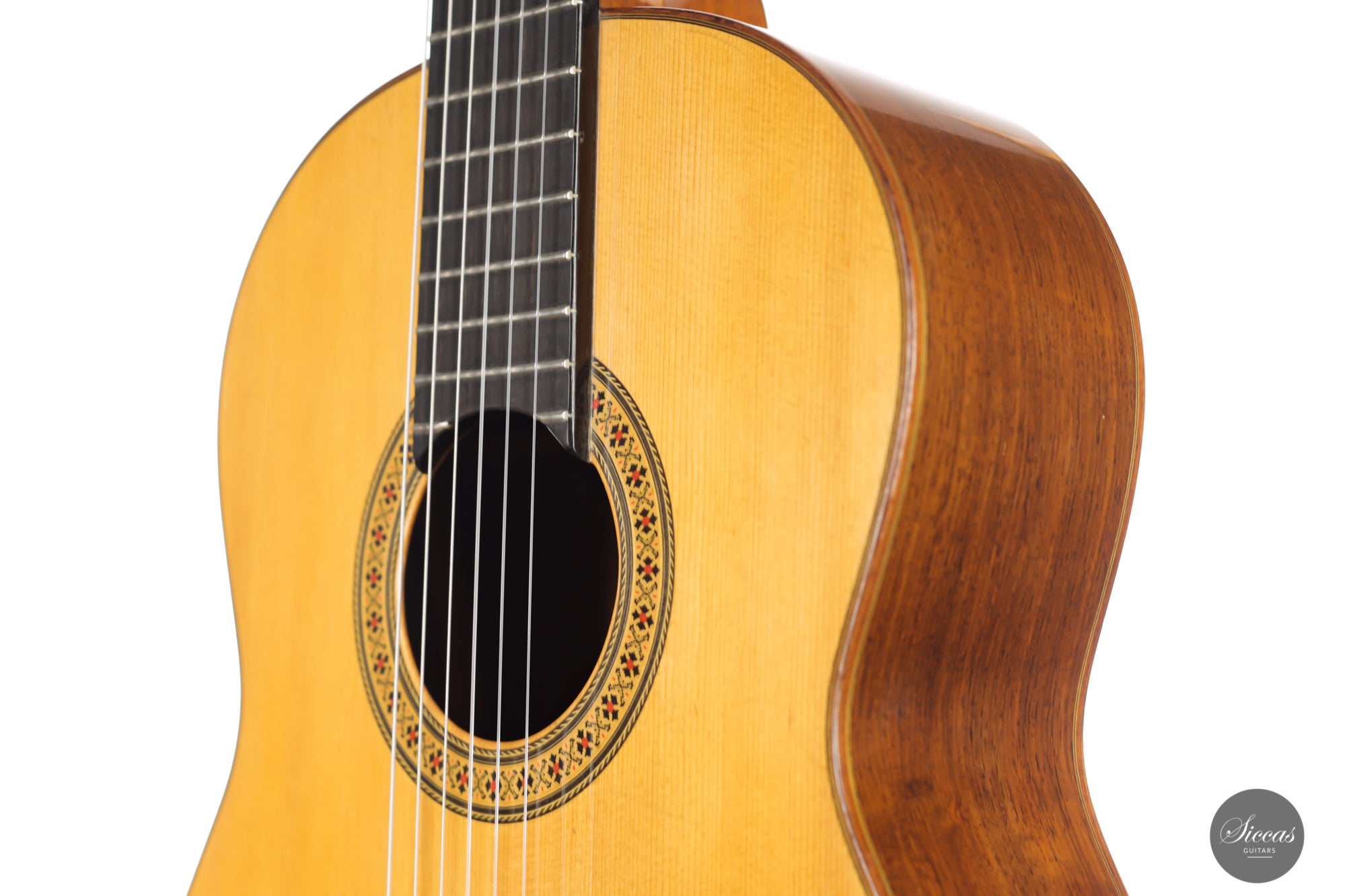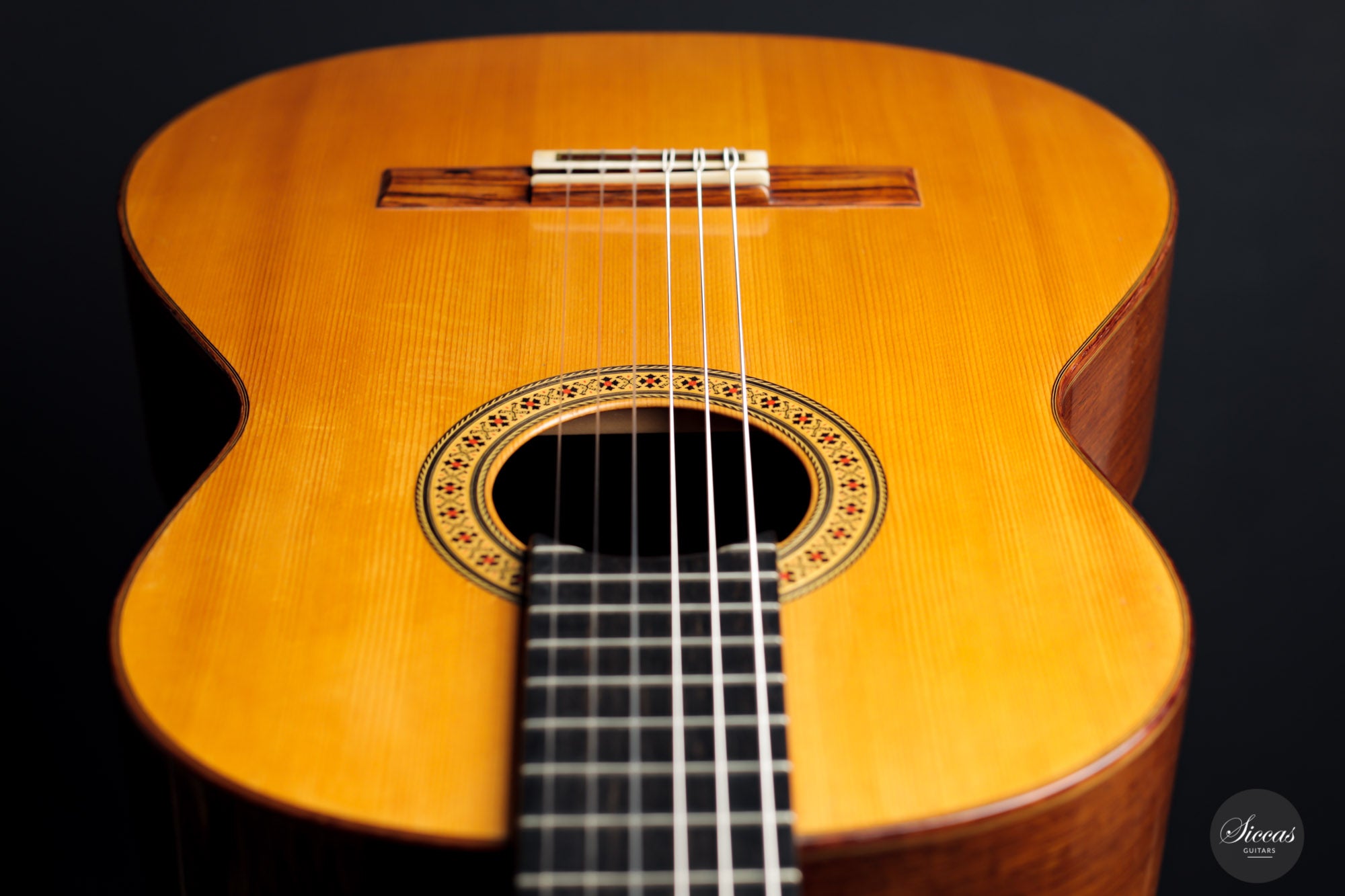 This Manuel Reyes is a very rare example with Brazilian rosewood (CITES certified) from the 1980s, which is in exceptionally good condition. There are only a few light signs of playing visible overall. This guitar is free of cracks and has only a discrete repair to the side rib. The top is made of finely grained spruce that has taken on a light honey color over time. A thin coat of shellac has been applied to the original shellac polish in the past. Excellent Rodgers tuners complete the noble overall appearance of this instrument. This guitar has a fascinating power with a textured, rich timbre and impressive sustain. The direct response and comfortable playability are also much-appreciated qualities for a classical guitar. Finally, the wide range of tonal colors makes this Reyes guitar an excellent and inspiring instrument that doesn't leave anything to be desired.