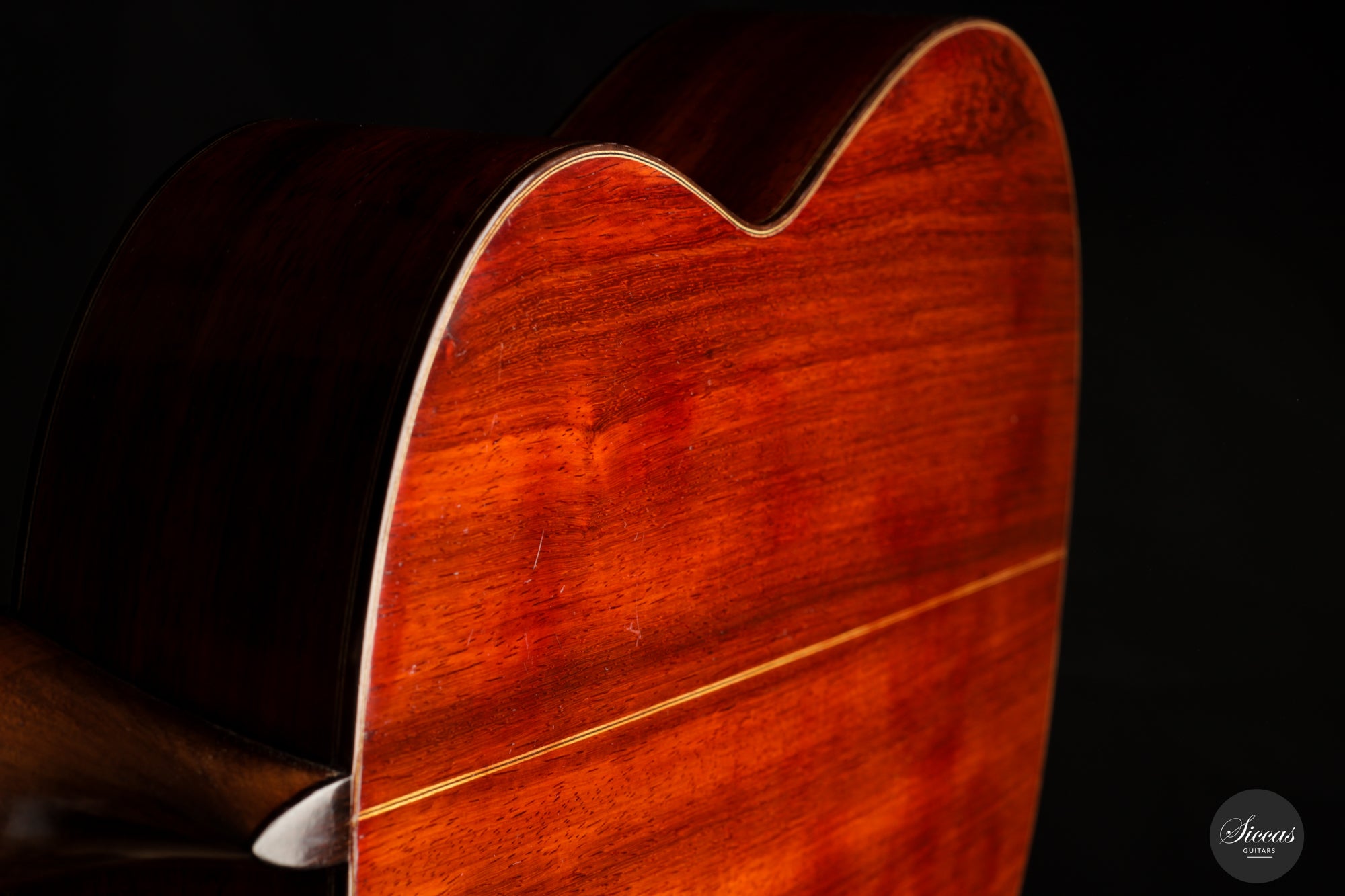 Trotz ihres Alters bleibt diese Gitarre in sehr gutem Zustand, ein Zeugnis für die Qualität ihrer Konstruktion und die Pflege, die sie im Laufe der Jahre erhalten hat. Der einzelne reparierte Riss zwischen dem Schallloch und der Brücke mindert weder ihre Schönheit noch ihren Klang, sondern fügt der Geschichte der Gitarre hinzu und markiert ihre Reise durch die Zeit.