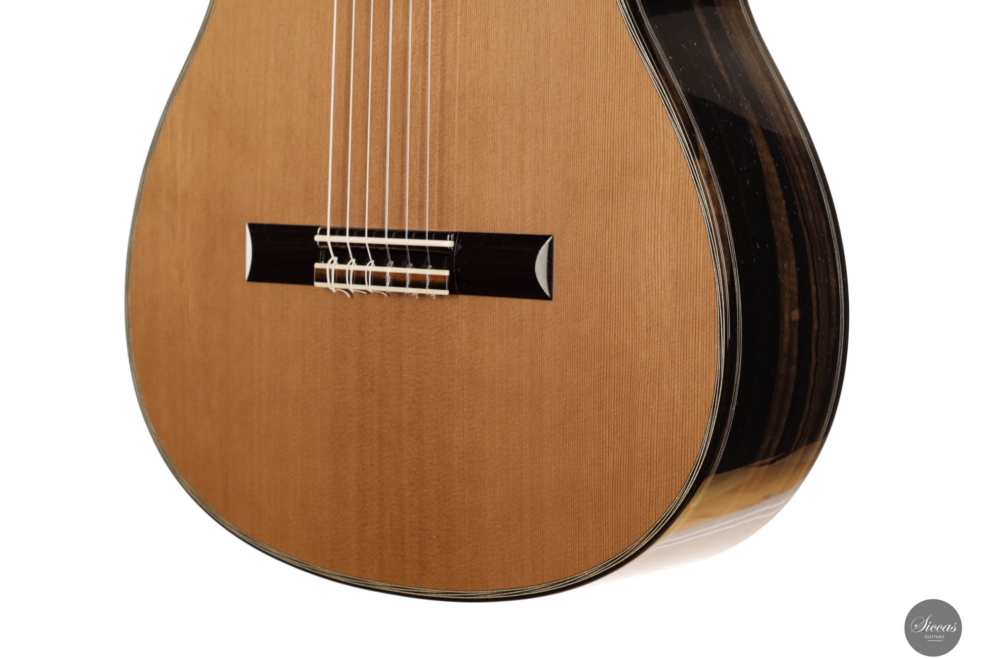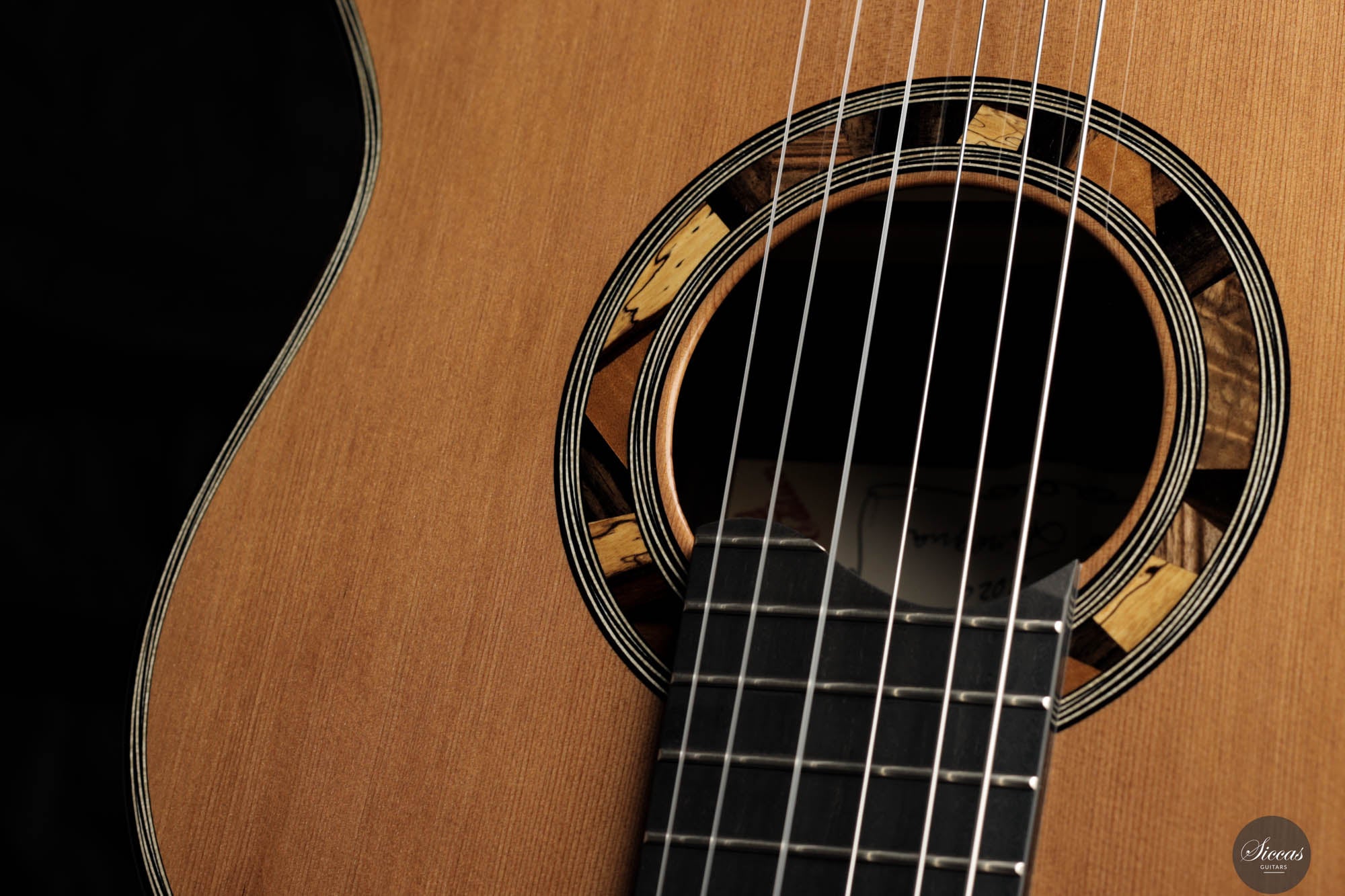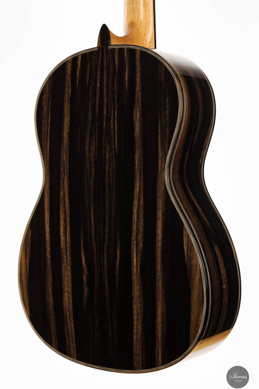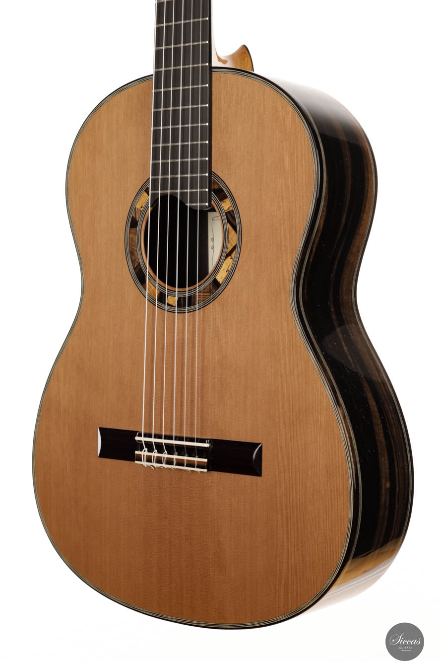 Die Limited Edition REG 2024 Gitarre von Marco Dissegna vereint traditionellen Gitarrenbau mit modernen Anforderungen und eignet sich daher hervorragend für zeitgenössische Musiker. Das Instrument verfügt über eine Decke aus Rotzeder, die aufgrund ihrer ansprechenden Eigenschaften über ein breites Frequenzspektrum ausgewählt wurde, ergänzt durch geflammtes Ebenholz für Rücken und Seiten, um Steifigkeit und Klangprojektion zu verbessern. Der Aufbau umfasst ein 7-Fächer-Verstrebungsmuster, das entwickelt wurde, um ein dynamisches Spielerlebnis zu unterstützen und eine leichte Bespielbarkeit für nuancierte Aufführungen zu gewährleisten. In Bezug auf das Design hat Marco individuelle Zierleisten hinzugefügt, die die Konturen von Rücken und Seiten hervorheben, zusammen mit fein gearbeiteten Alessi-Stimmmechaniken und einem Schellack-Finish, die seinen akribischen Ansatz beim Gitarrenbau unterstreichen.