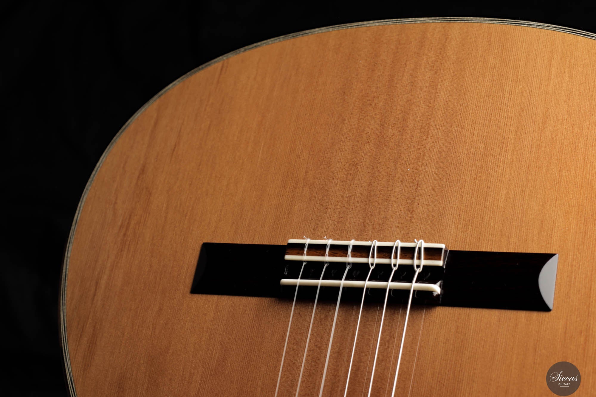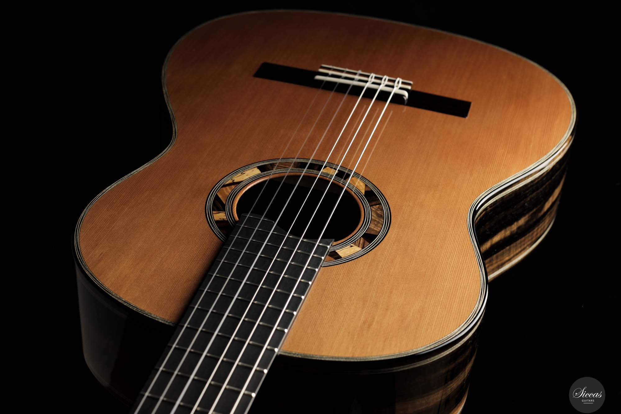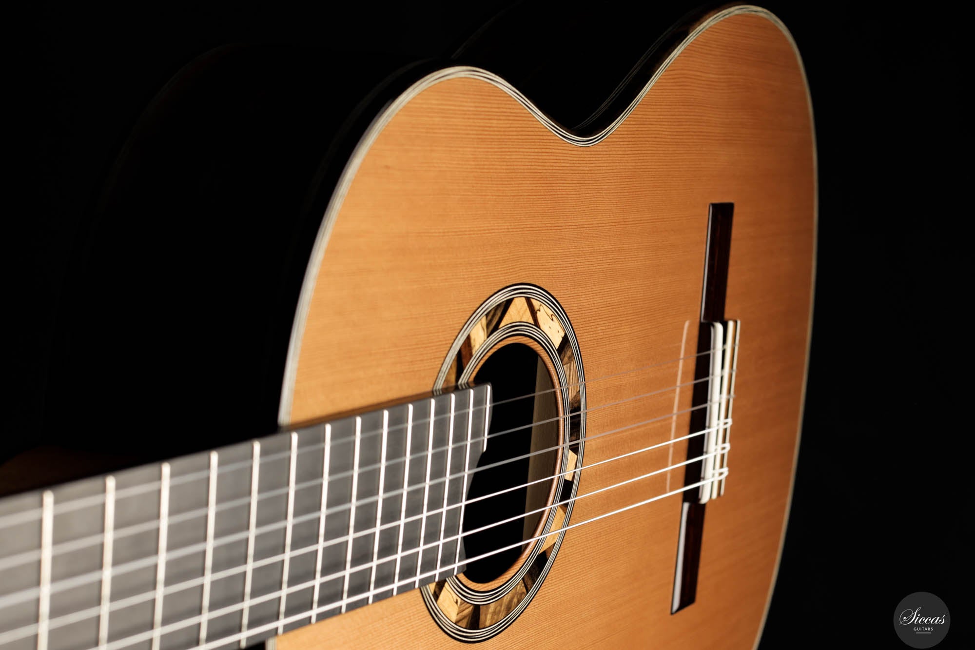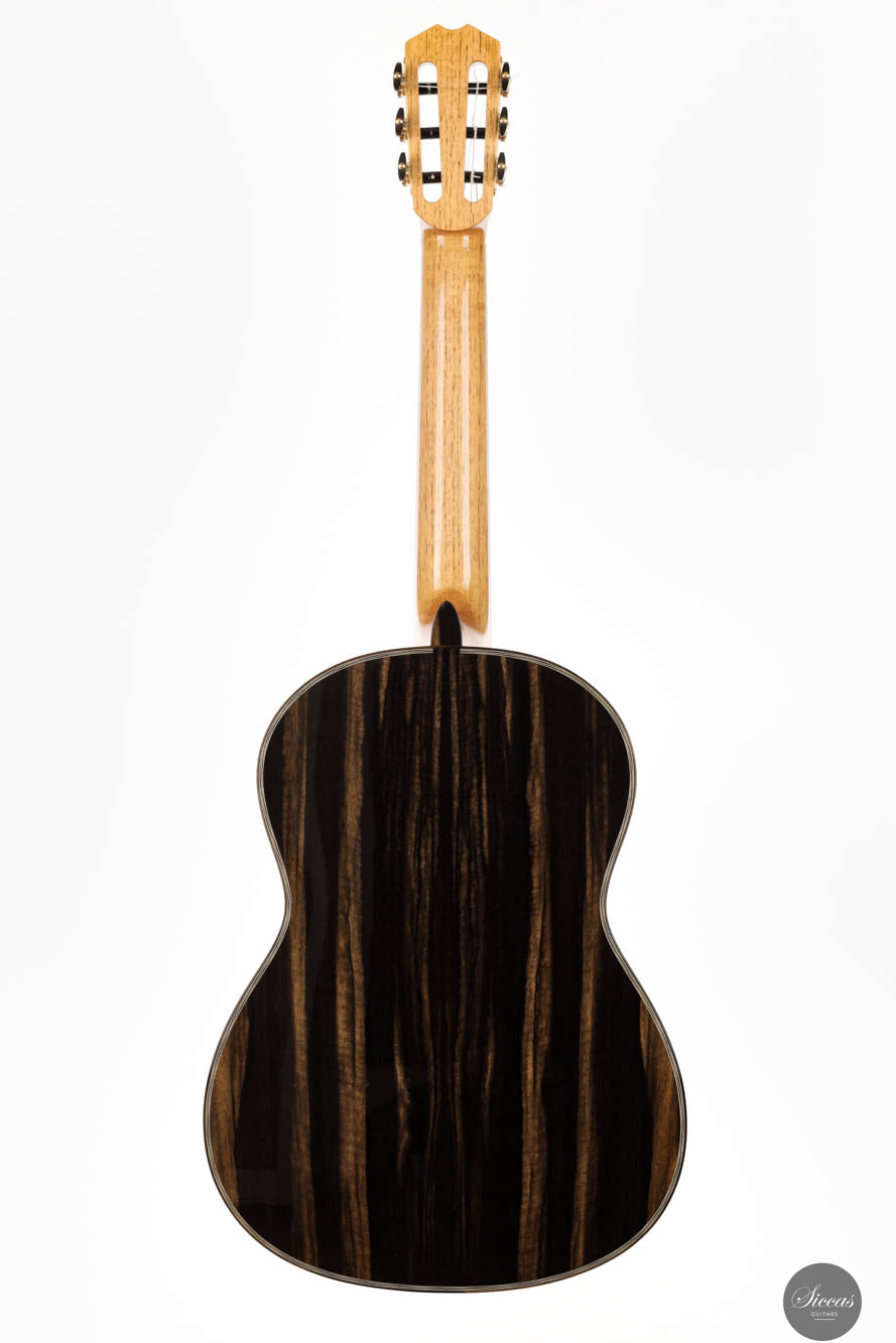 Die Limited Edition REG 2024 Gitarre von Marco Dissegna vereint traditionellen Gitarrenbau mit modernen Anforderungen und eignet sich daher hervorragend für zeitgenössische Musiker. Das Instrument verfügt über eine Decke aus Rotzeder, die aufgrund ihrer ansprechenden Eigenschaften über ein breites Frequenzspektrum ausgewählt wurde, ergänzt durch geflammtes Ebenholz für Rücken und Seiten, um Steifigkeit und Klangprojektion zu verbessern. Der Aufbau umfasst ein 7-Fächer-Verstrebungsmuster, das entwickelt wurde, um ein dynamisches Spielerlebnis zu unterstützen und eine leichte Bespielbarkeit für nuancierte Aufführungen zu gewährleisten. In Bezug auf das Design hat Marco individuelle Zierleisten hinzugefügt, die die Konturen von Rücken und Seiten hervorheben, zusammen mit fein gearbeiteten Alessi-Stimmmechaniken und einem Schellack-Finish, die seinen akribischen Ansatz beim Gitarrenbau unterstreichen.