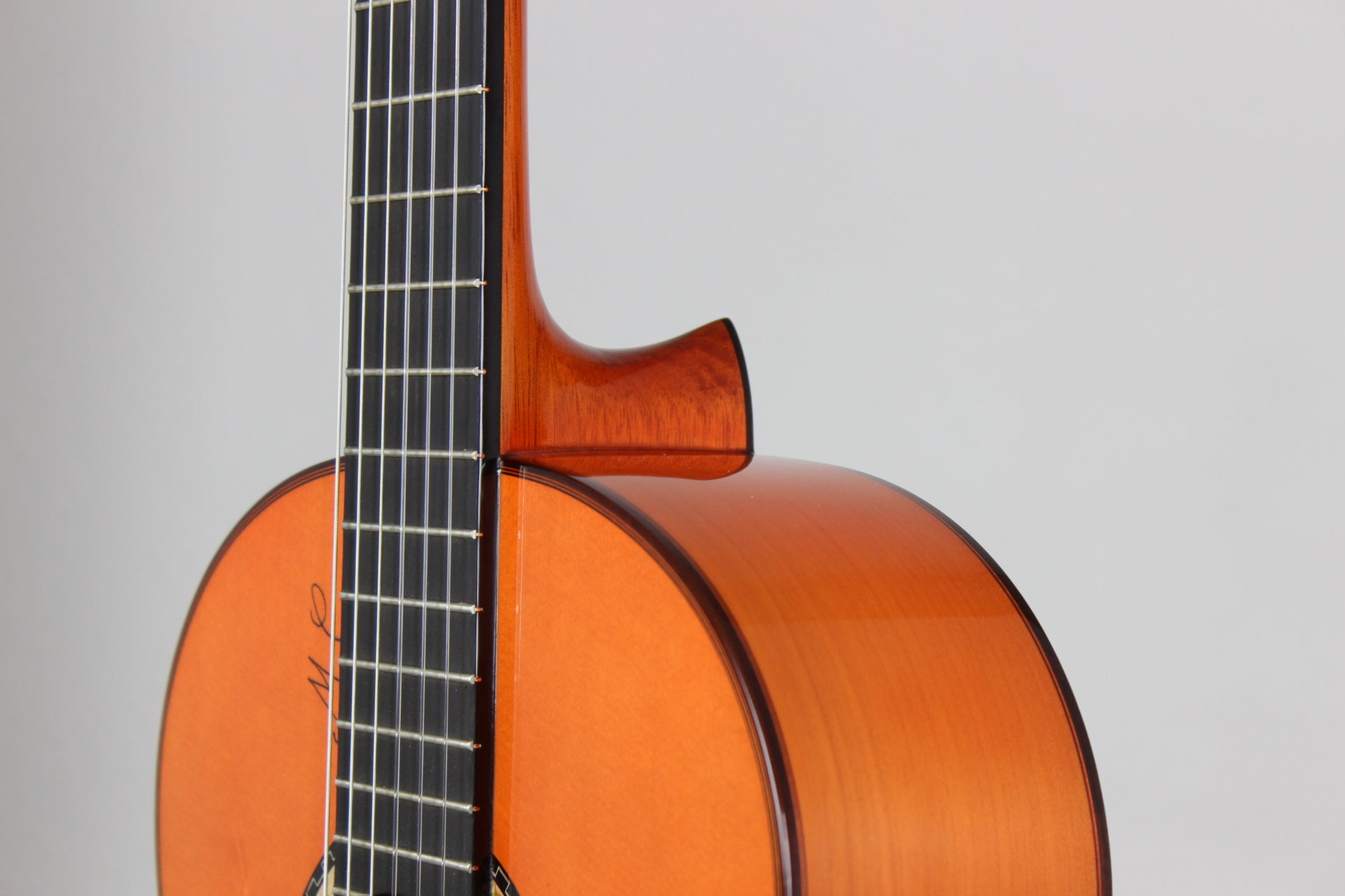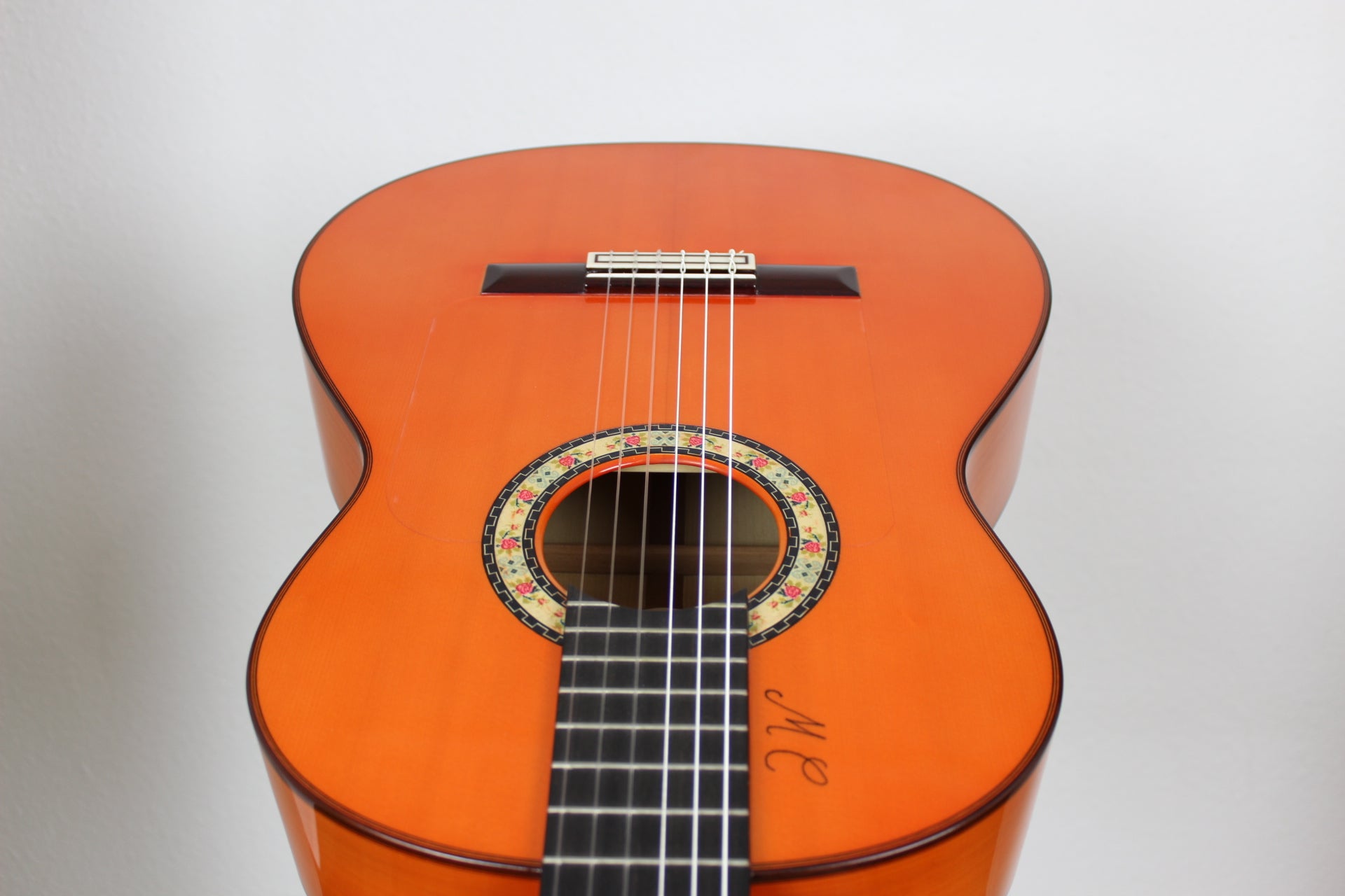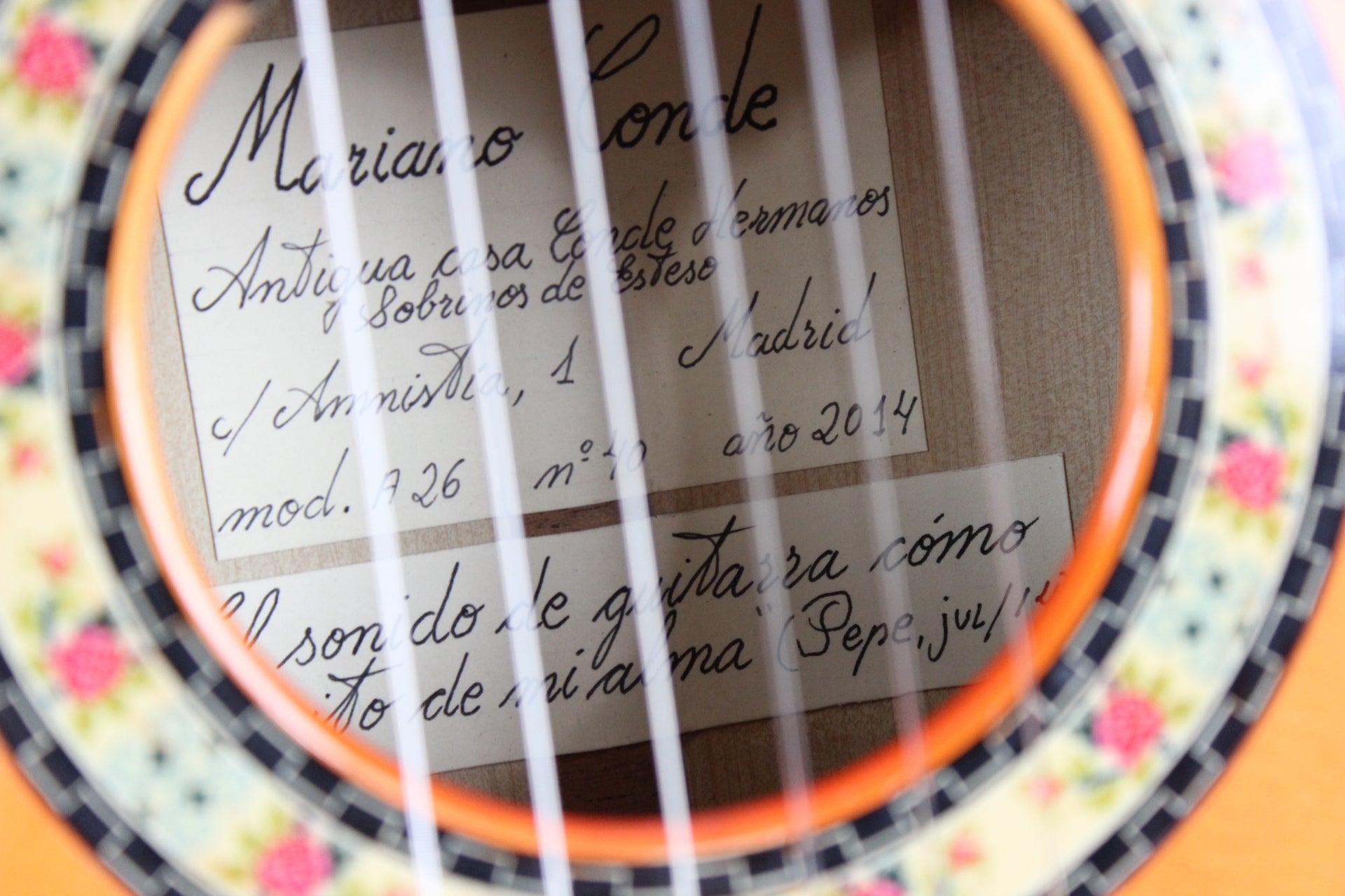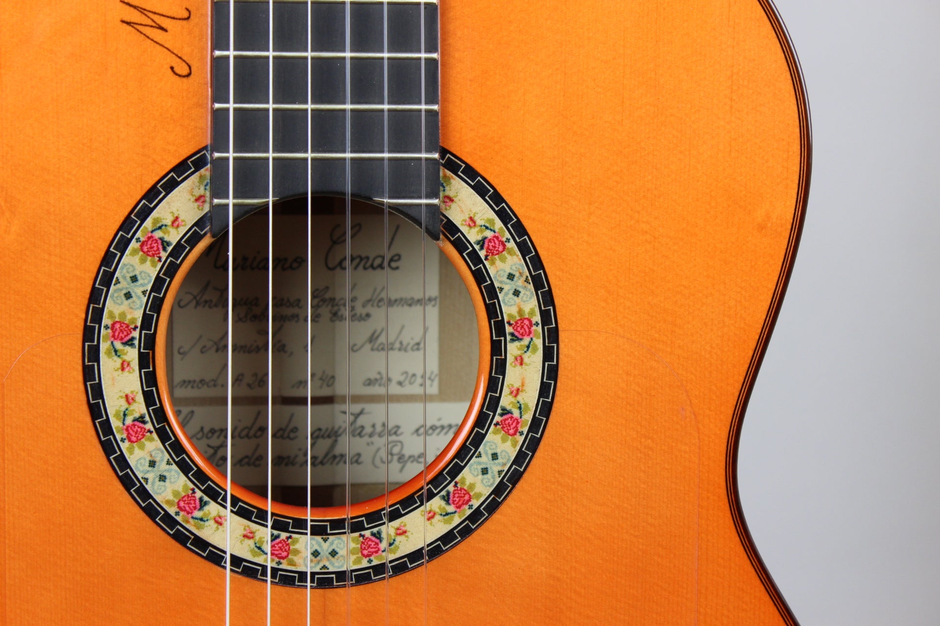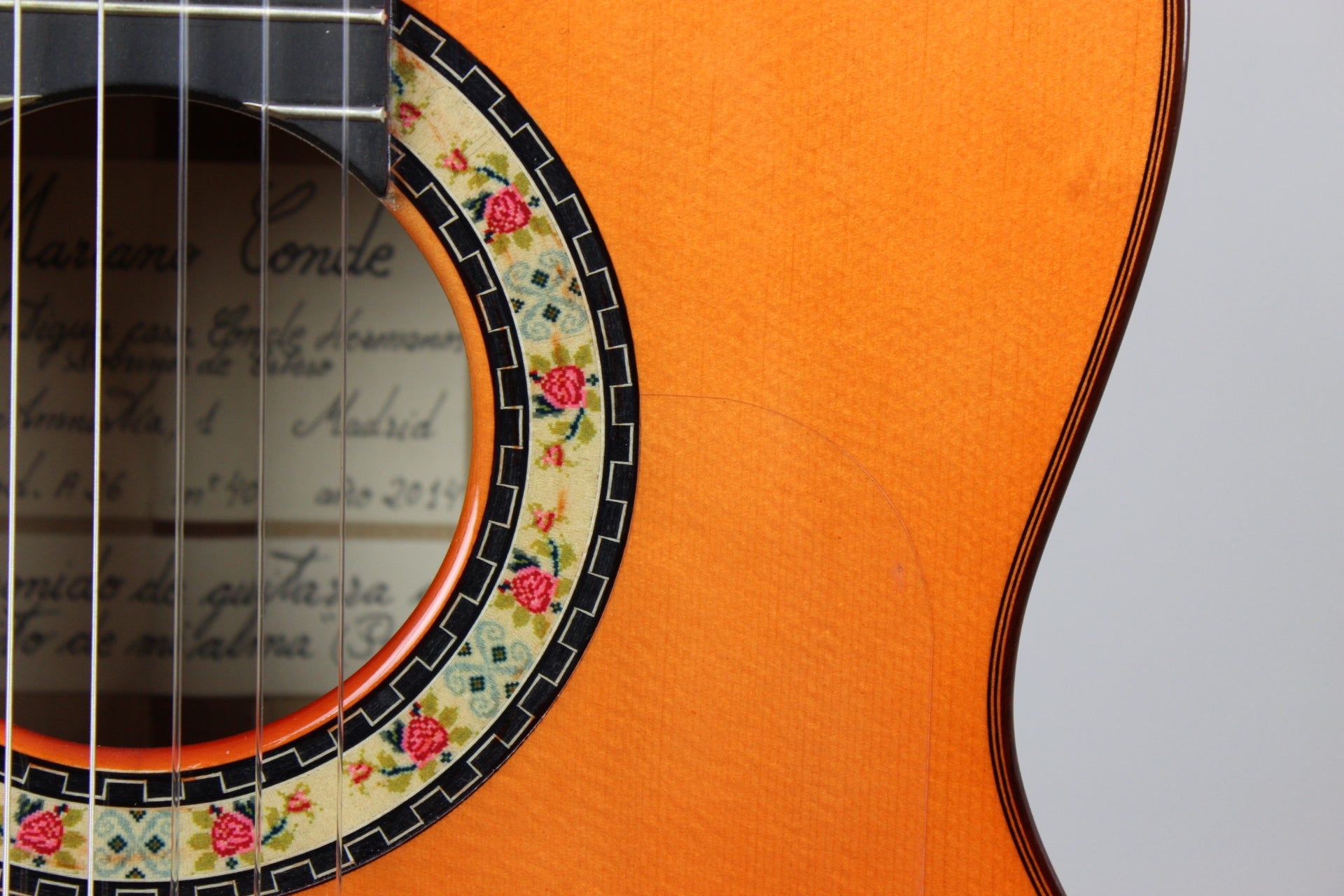 This is a beautiful A26 Cypress Flamenco guitar by Mariano Conde with a “half-moon” head stock and Antigua Domingo Esteso Rosette. The top is made of finest German spruce. About the sound we can say that the guitar has a loud volume and a very dry, percussive and aggressive sound.