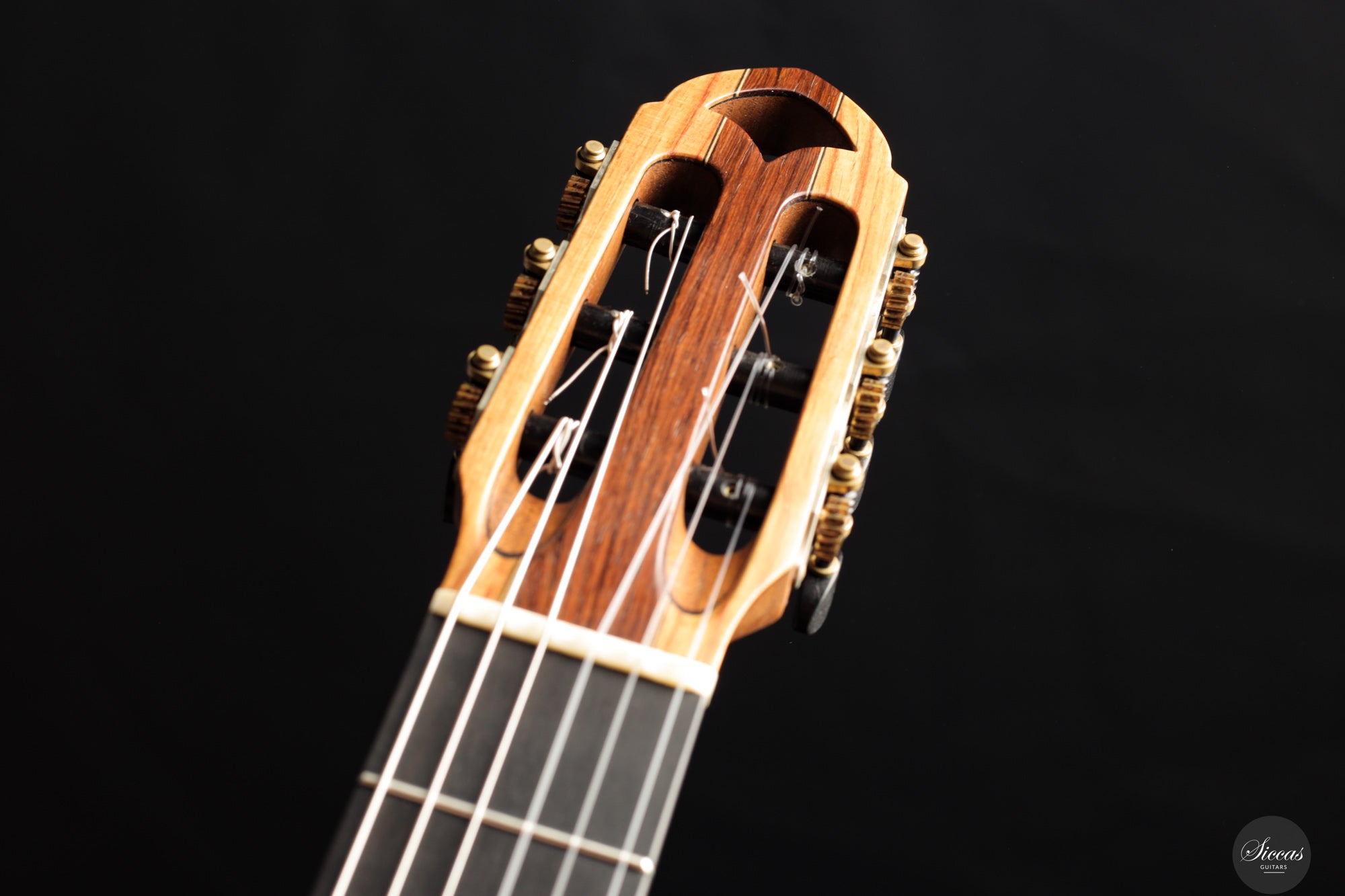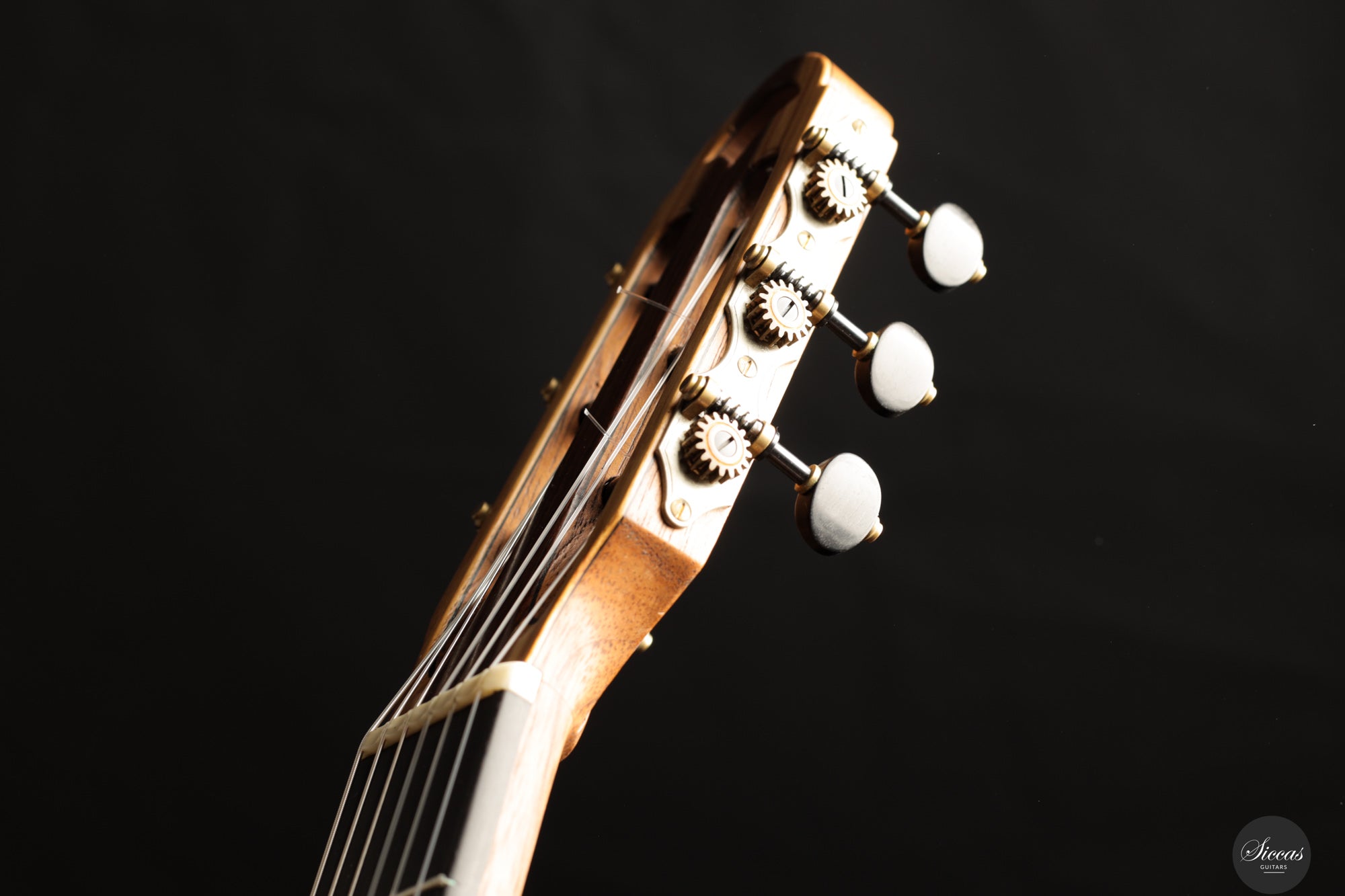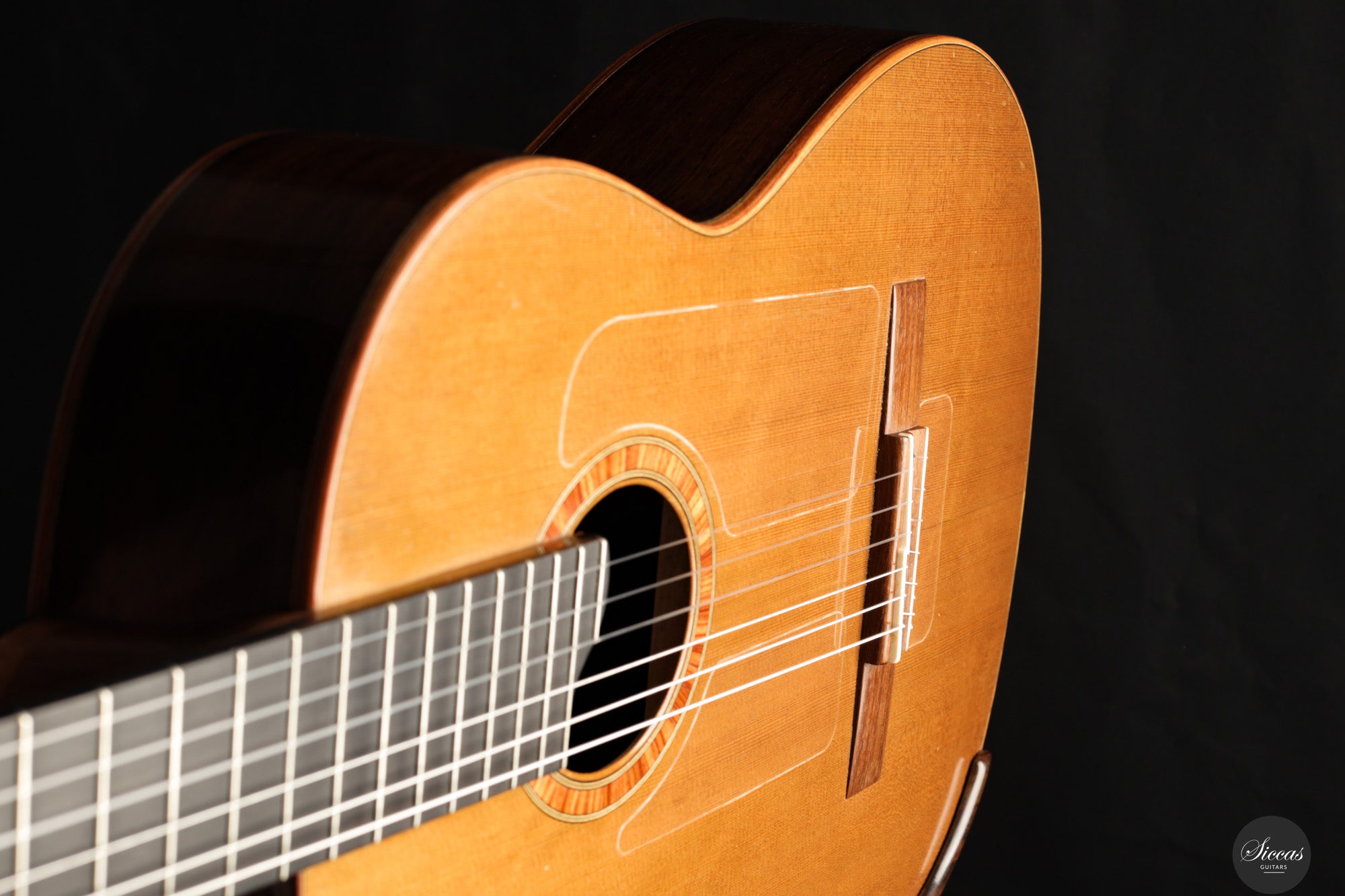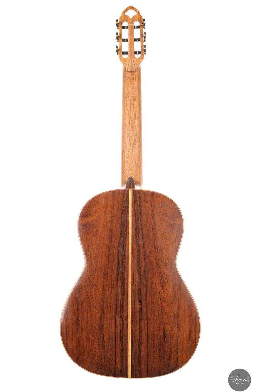 Diese Konzertgitarre wurde im Jahr 2018 gebaut und steht exemplarisch für Mario Gropps ausgereiften Ansatz im modernen Konzertgitarrenbau. Die Kombination aus Zederndecke sowie Boden und Zargen aus madagassischem Palisander bildet die Grundlage für ein klanglich reiches, stabiles und über alle Register hinweg ausgewogenes Klangbild.