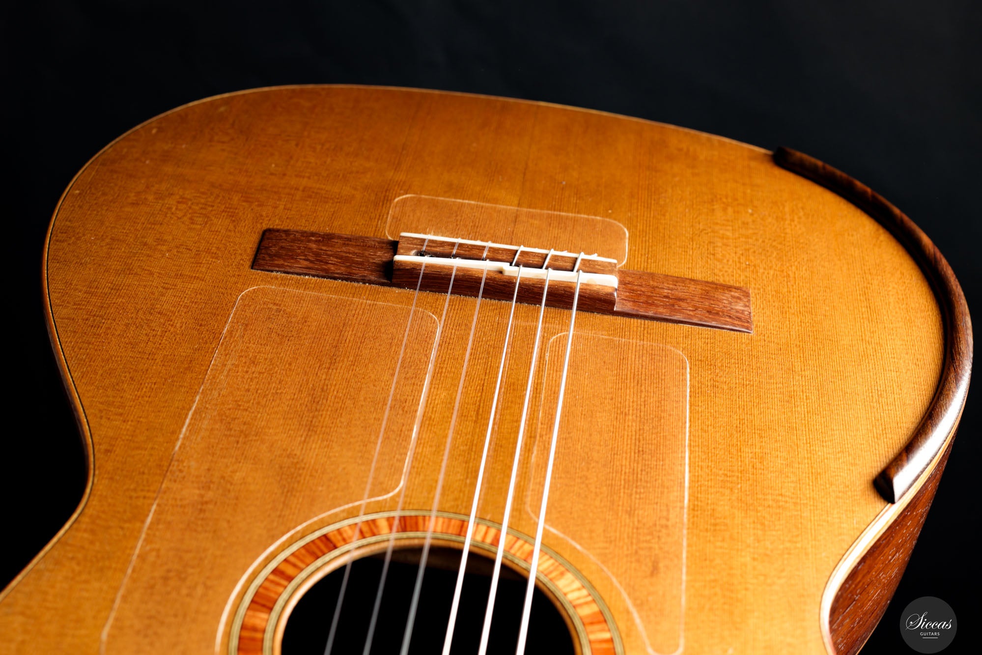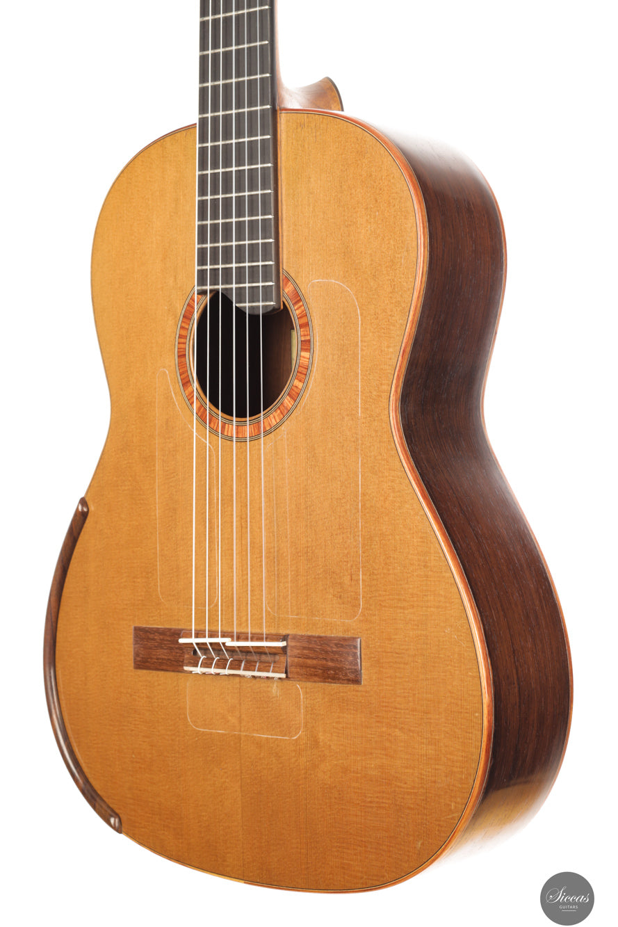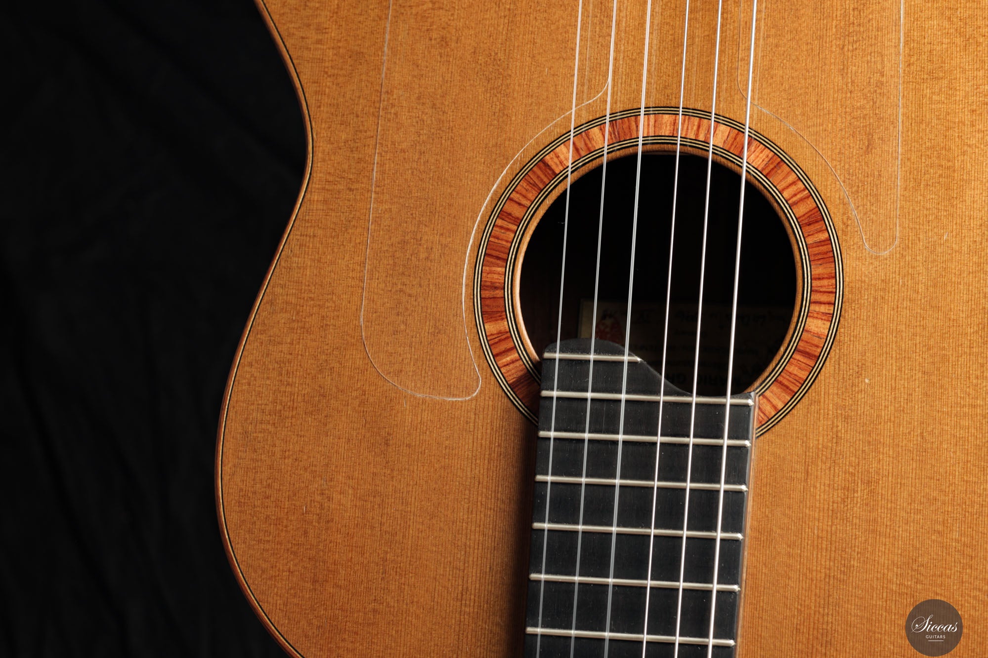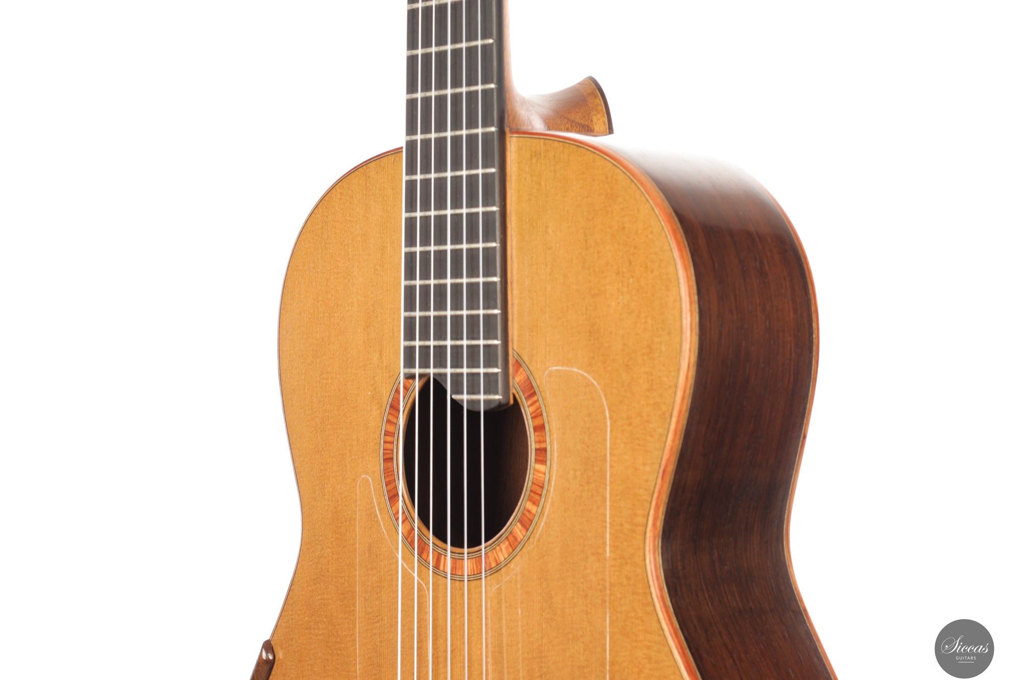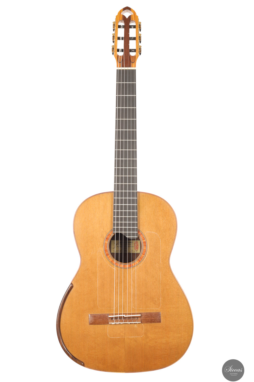 Diese Konzertgitarre wurde im Jahr 2018 gebaut und steht exemplarisch für Mario Gropps ausgereiften Ansatz im modernen Konzertgitarrenbau. Die Kombination aus Zederndecke sowie Boden und Zargen aus madagassischem Palisander bildet die Grundlage für ein klanglich reiches, stabiles und über alle Register hinweg ausgewogenes Klangbild.