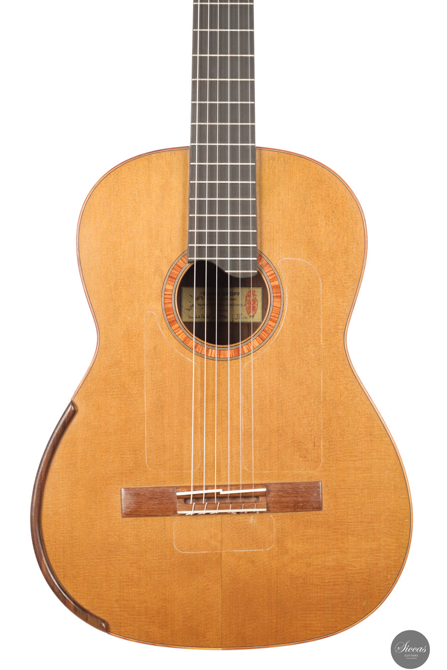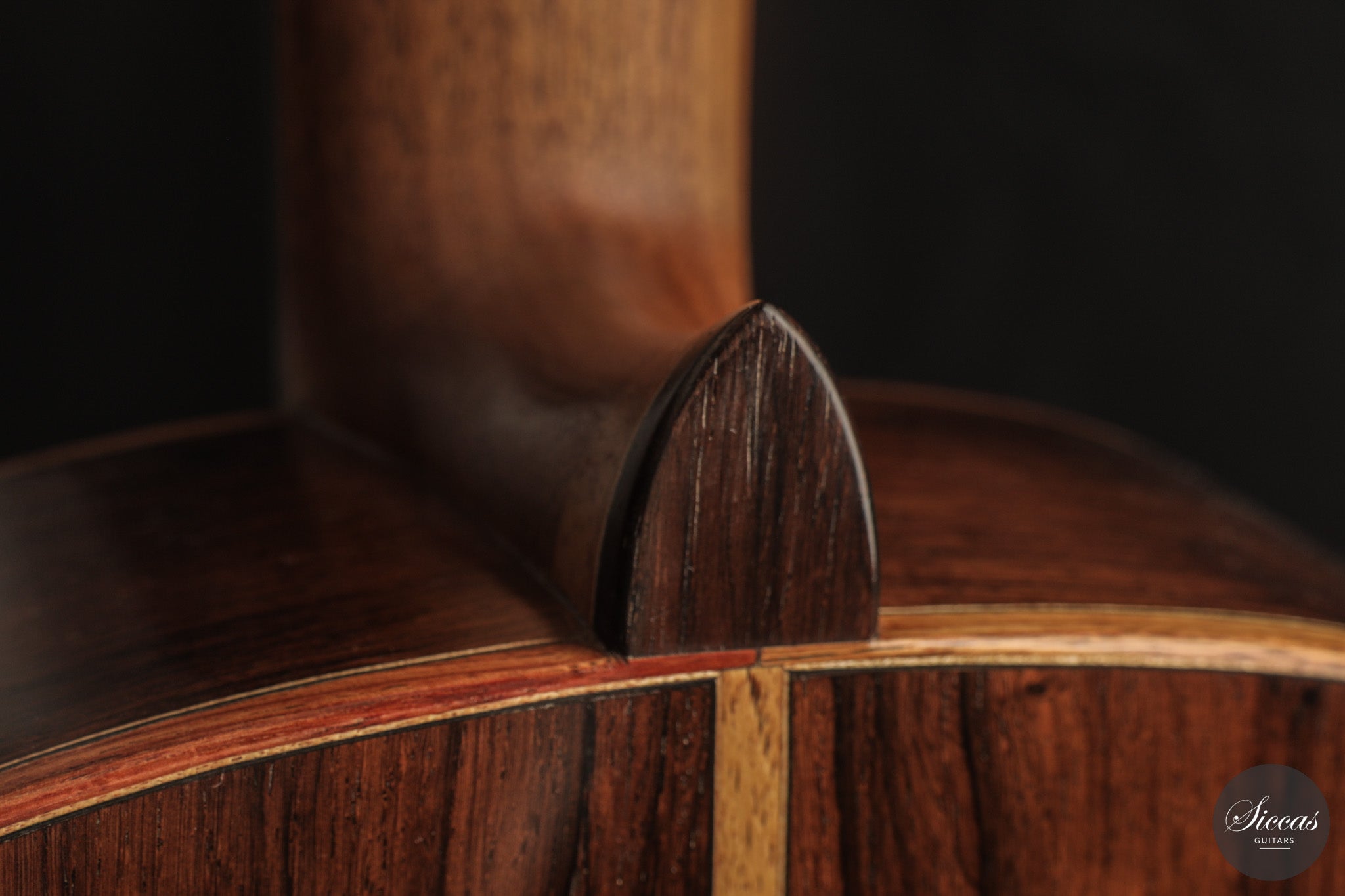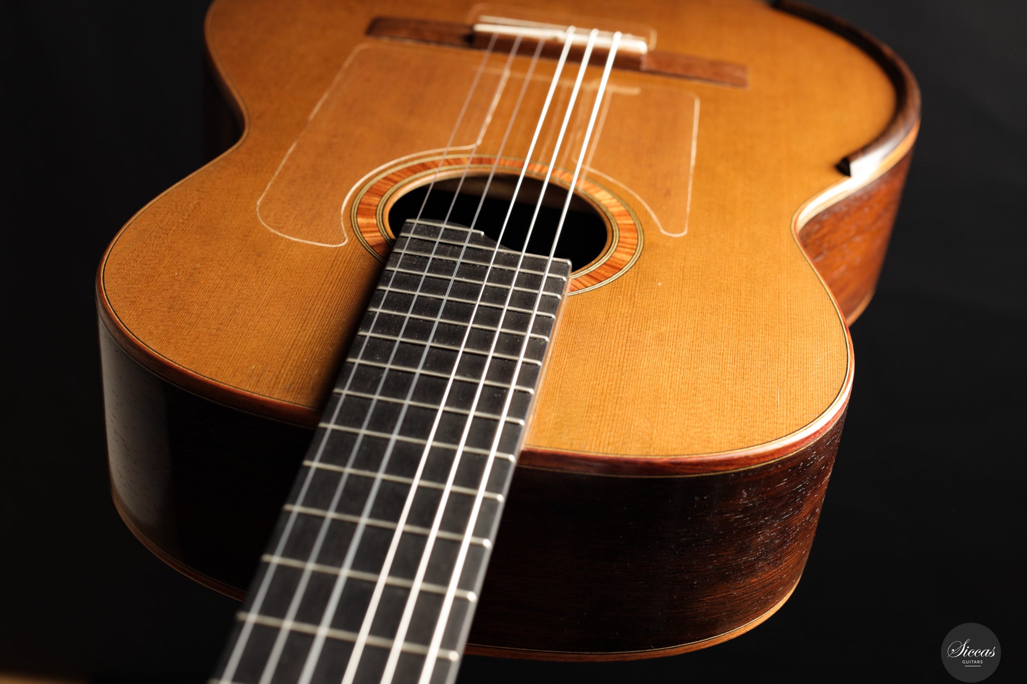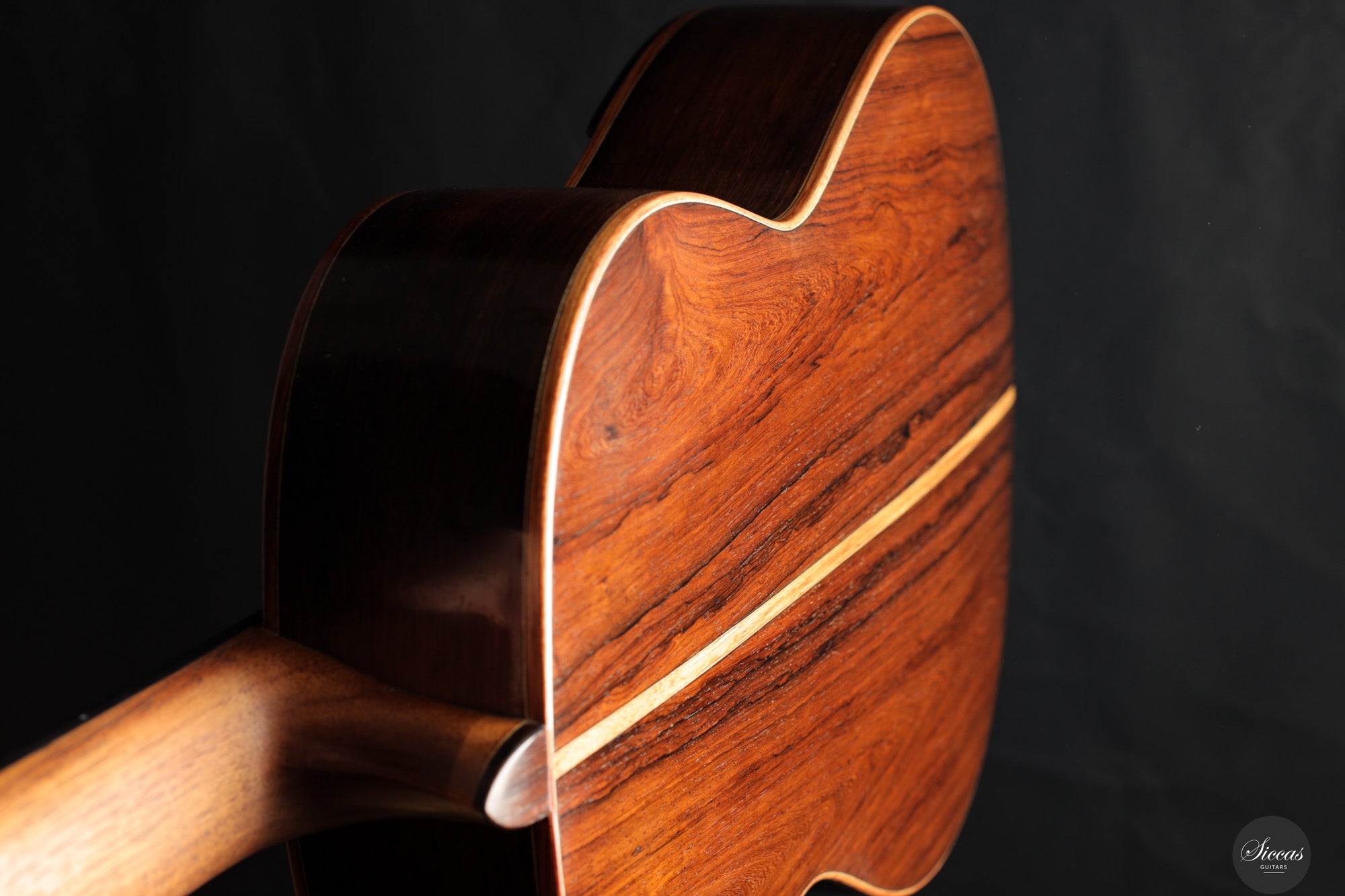 Diese Konzertgitarre wurde im Jahr 2018 gebaut und steht exemplarisch für Mario Gropps ausgereiften Ansatz im modernen Konzertgitarrenbau. Die Kombination aus Zederndecke sowie Boden und Zargen aus madagassischem Palisander bildet die Grundlage für ein klanglich reiches, stabiles und über alle Register hinweg ausgewogenes Klangbild.