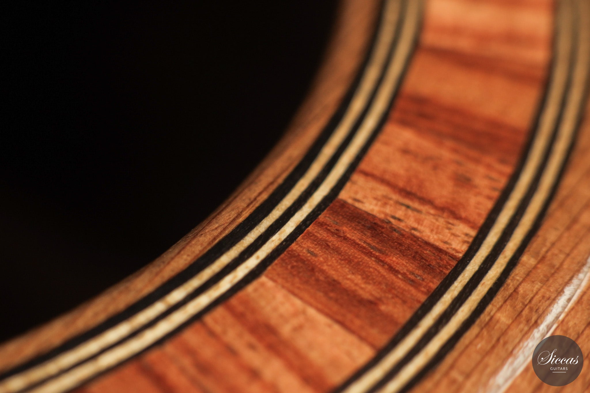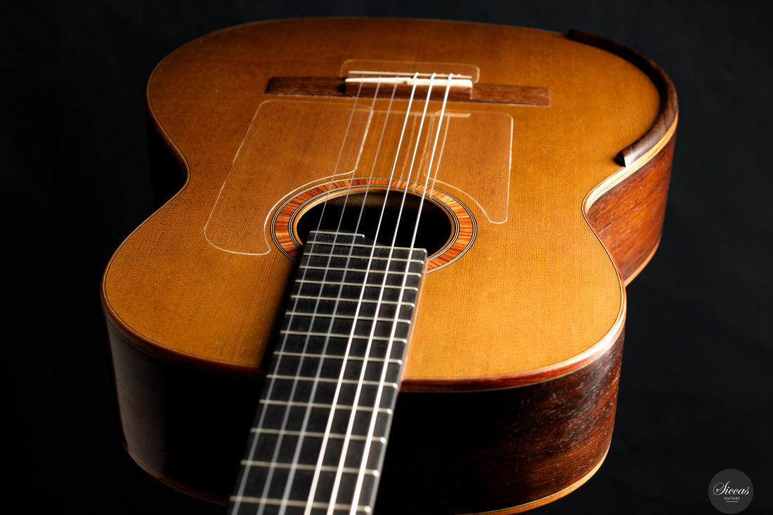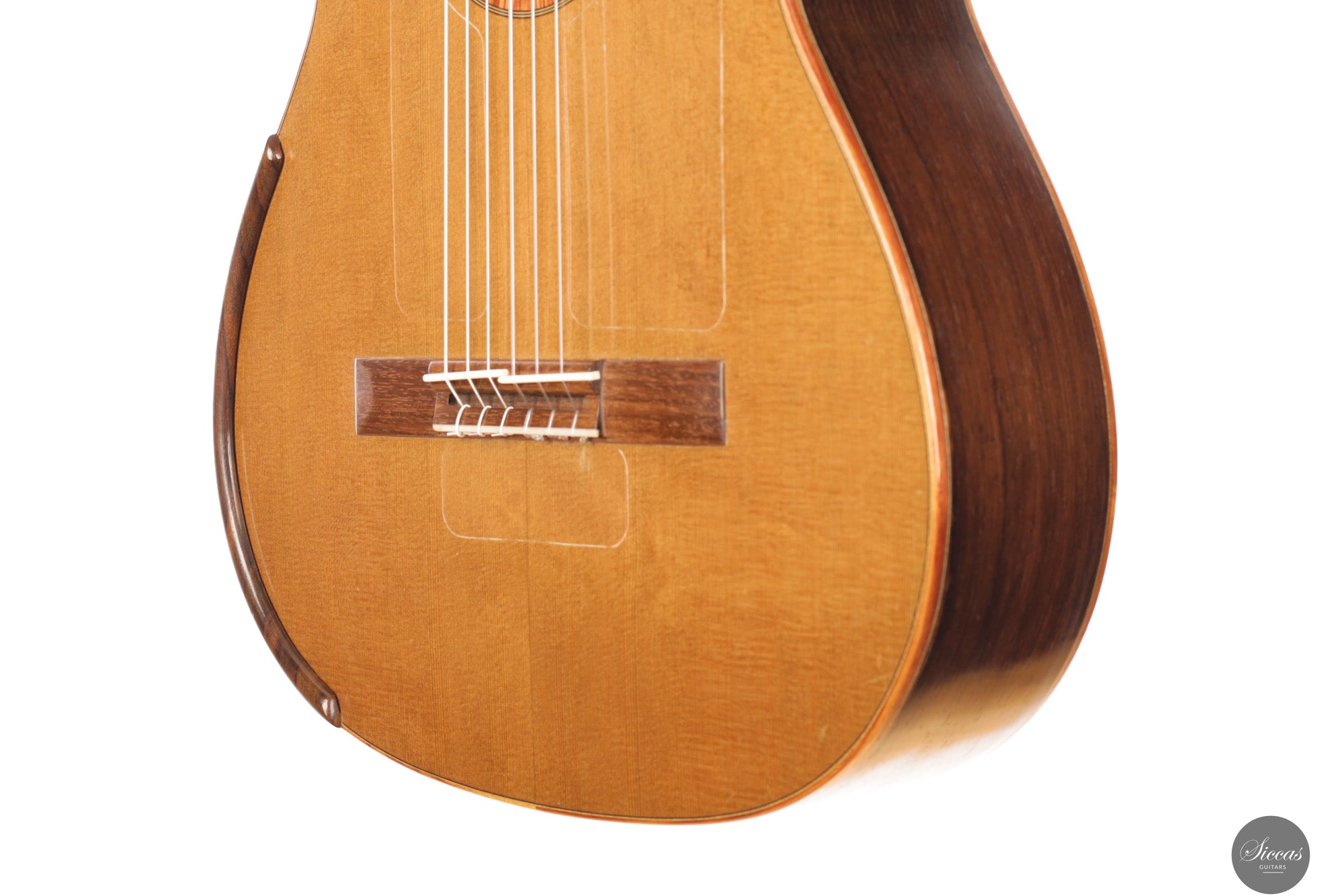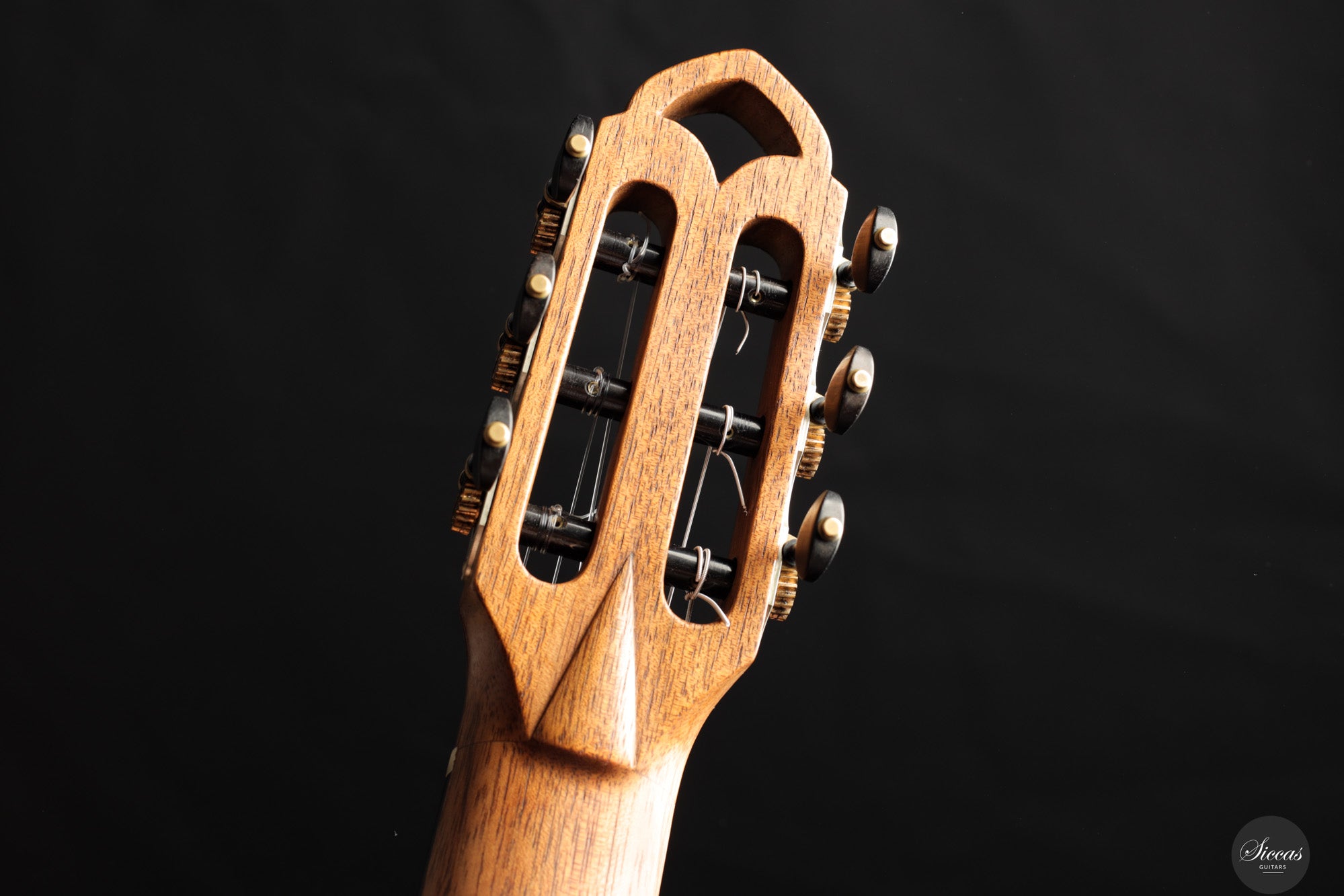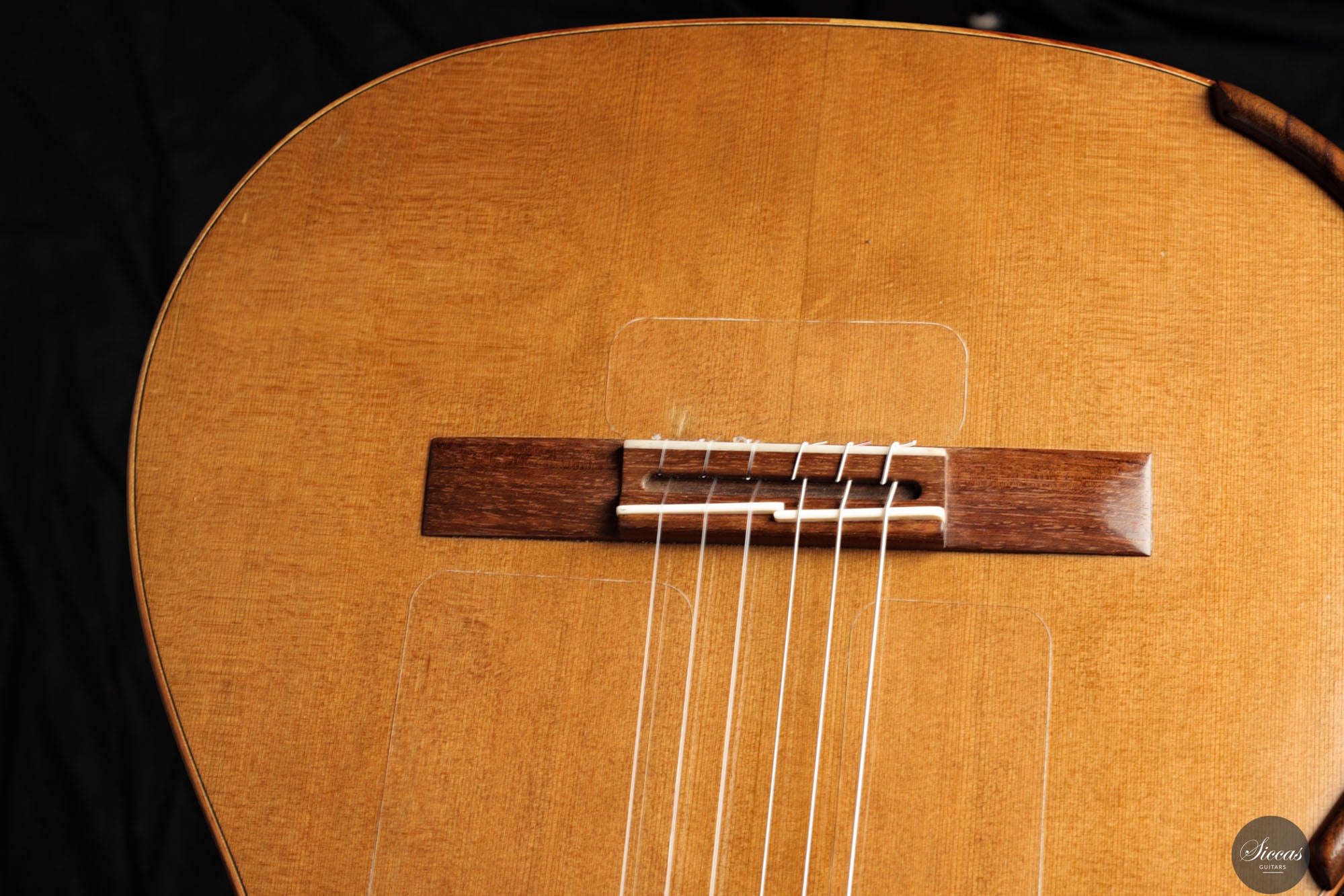 Diese Konzertgitarre wurde im Jahr 2018 gebaut und steht exemplarisch für Mario Gropps ausgereiften Ansatz im modernen Konzertgitarrenbau. Die Kombination aus Zederndecke sowie Boden und Zargen aus madagassischem Palisander bildet die Grundlage für ein klanglich reiches, stabiles und über alle Register hinweg ausgewogenes Klangbild.