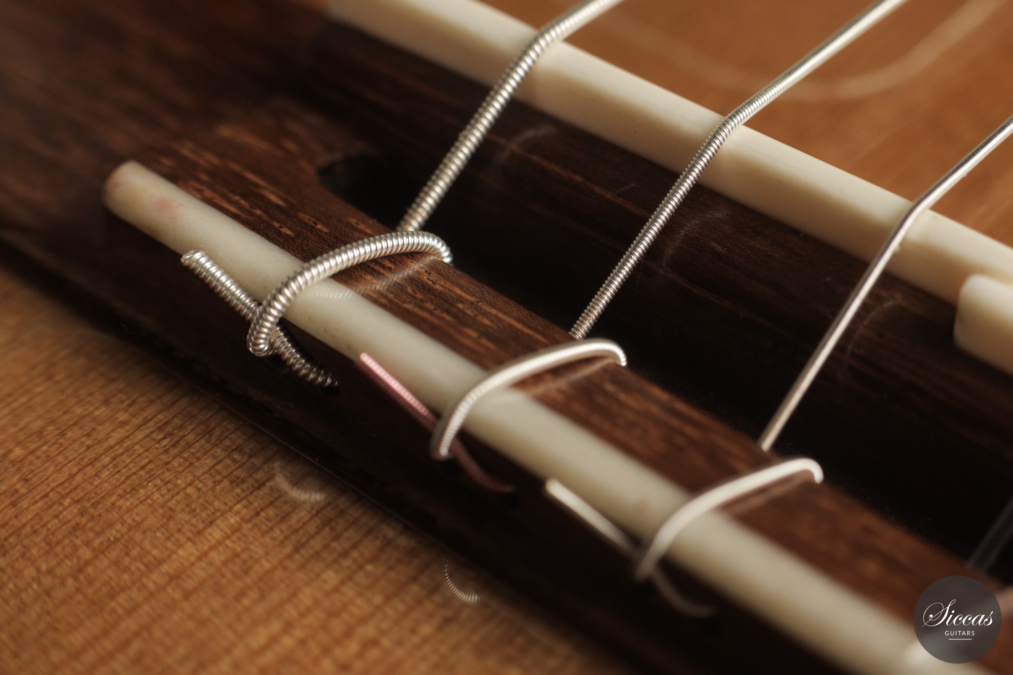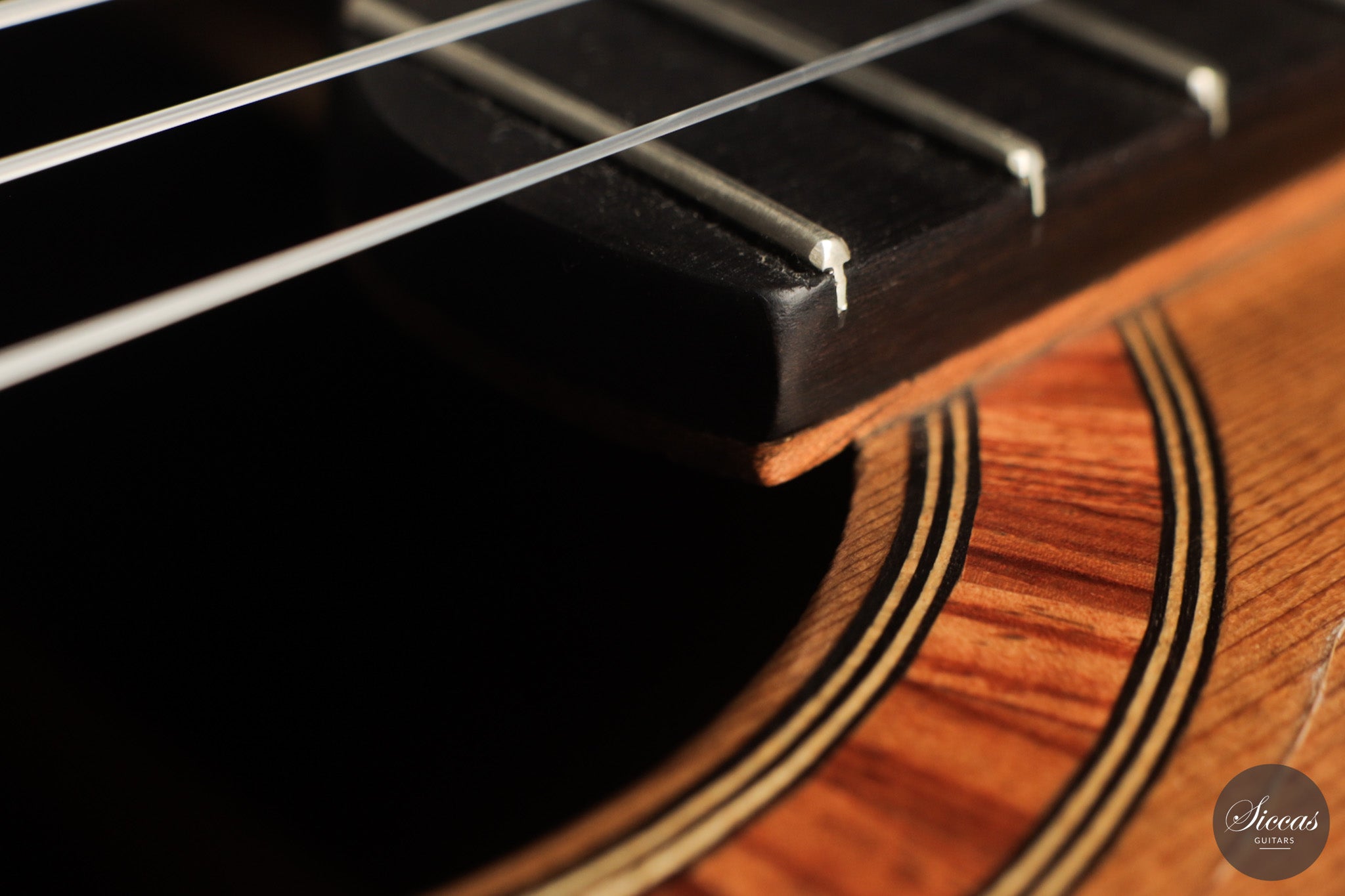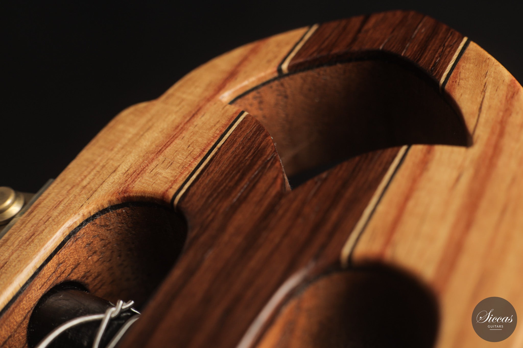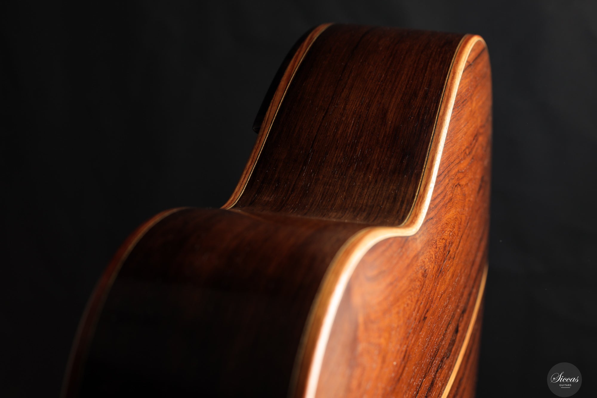 Diese Konzertgitarre wurde im Jahr 2018 gebaut und steht exemplarisch für Mario Gropps ausgereiften Ansatz im modernen Konzertgitarrenbau. Die Kombination aus Zederndecke sowie Boden und Zargen aus madagassischem Palisander bildet die Grundlage für ein klanglich reiches, stabiles und über alle Register hinweg ausgewogenes Klangbild.