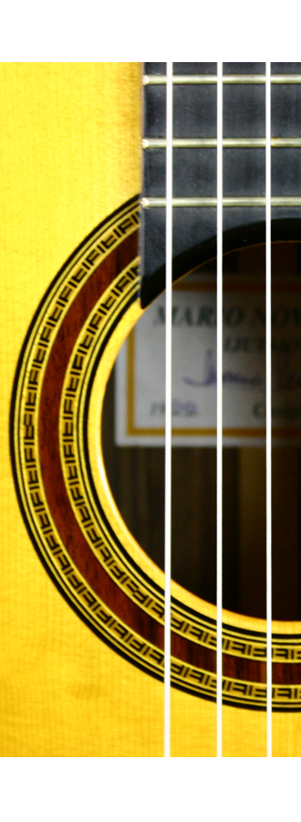 Mario Novelli wurde 1926 in Florenz geboren. Er begann früh als Instrumentenbauer zu arbeiten und legte sehr viel Wert, darauf alle Bestandteile der Gitarre selbst zu fertigen. So baute und schnitze er nicht nur den Kopf und den Korpus der Gitarre, sondern fertigte auch die Mechaniken bis hin zu den Schrauben in zeitintensiver Arbeit selbst an. Diese Gitarre hat eine Decke aus Fichte. Der Boden und die Zargen sind aus ostindischer Palisander.
