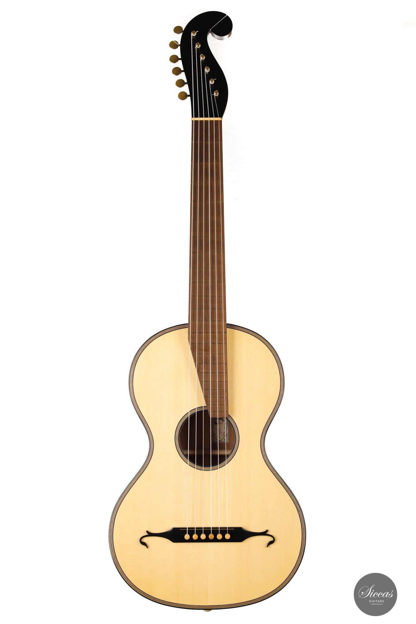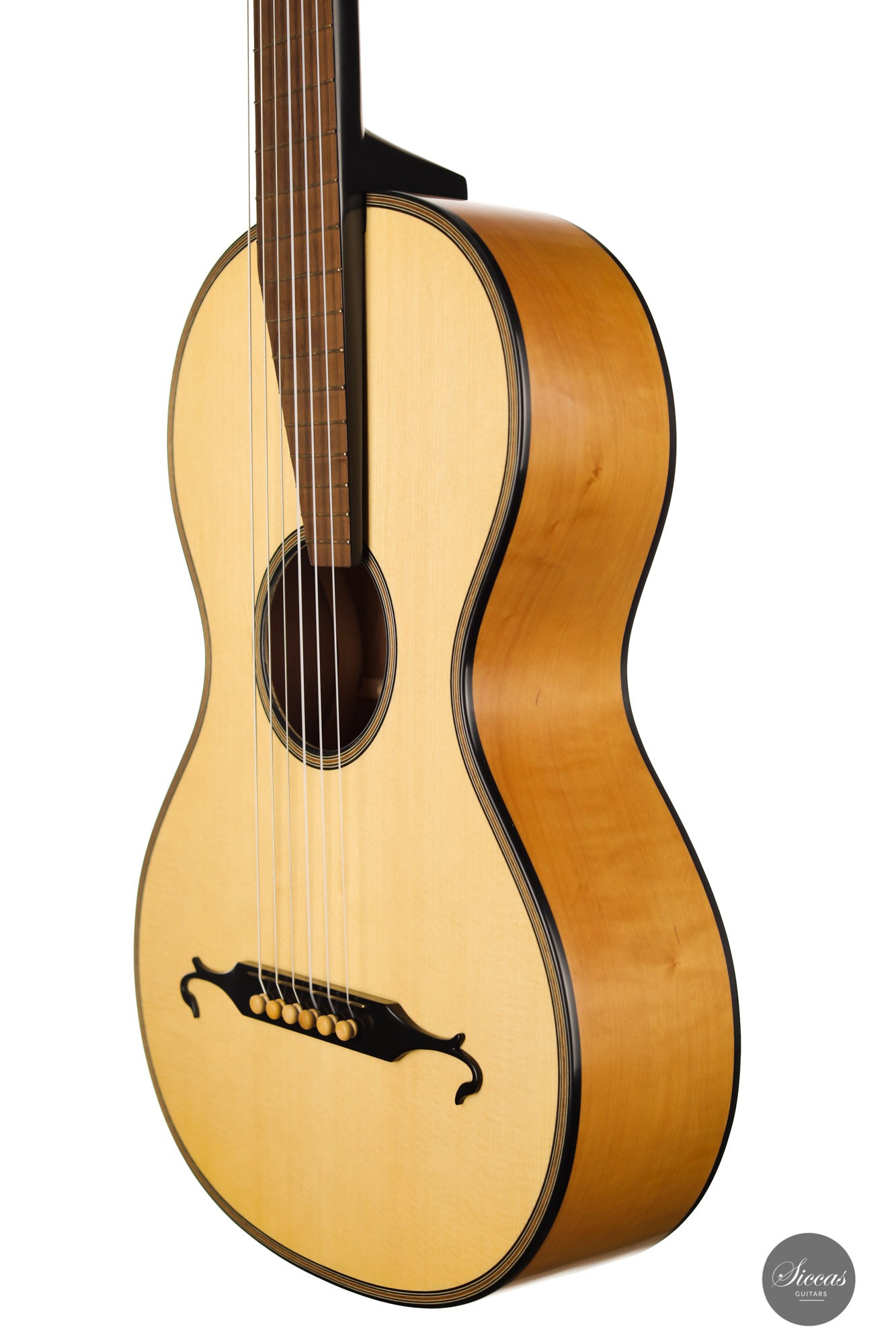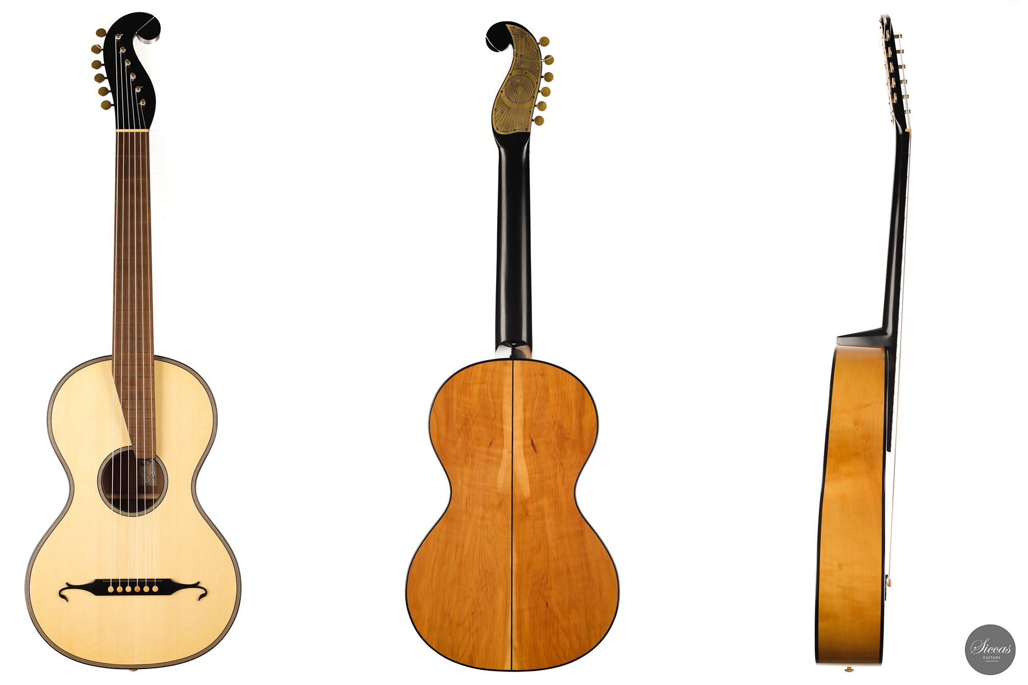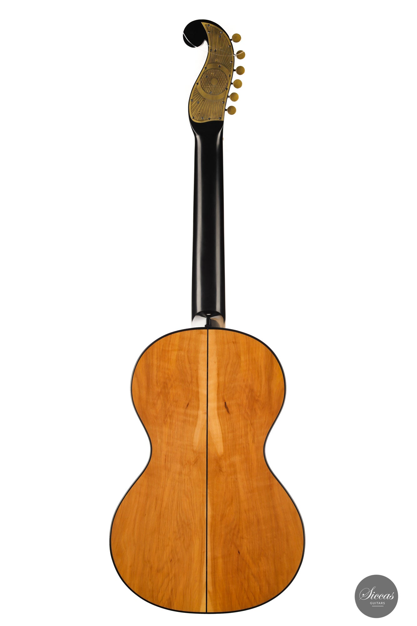 This guitar, opus 40 built in 2020, comes straight from Martin Okenica's workshop. It is a faithful copy of a Johann Georg Stauffer guitar (1778 - 1853) from 1829. Even the tuning mechanics has been copied identically and handcrafted by the Slovakian luthier himself. The fantastic playability and the impressive sound of Stauffer guitars are easily found and matched in this instrument. Moreover, the playing ease in the left hand is enhanced by the possibility of adjusting the height of the strings with a single turn of a key. This is made possible by a mechanical system for adjusting the angle of the neck, which has also been copied from the original guitar. In short, it is an excellent romantic guitar, ready to accompany the guitarist in the discovery of the sounds of the Viennese guitar tradition of the 19th century.