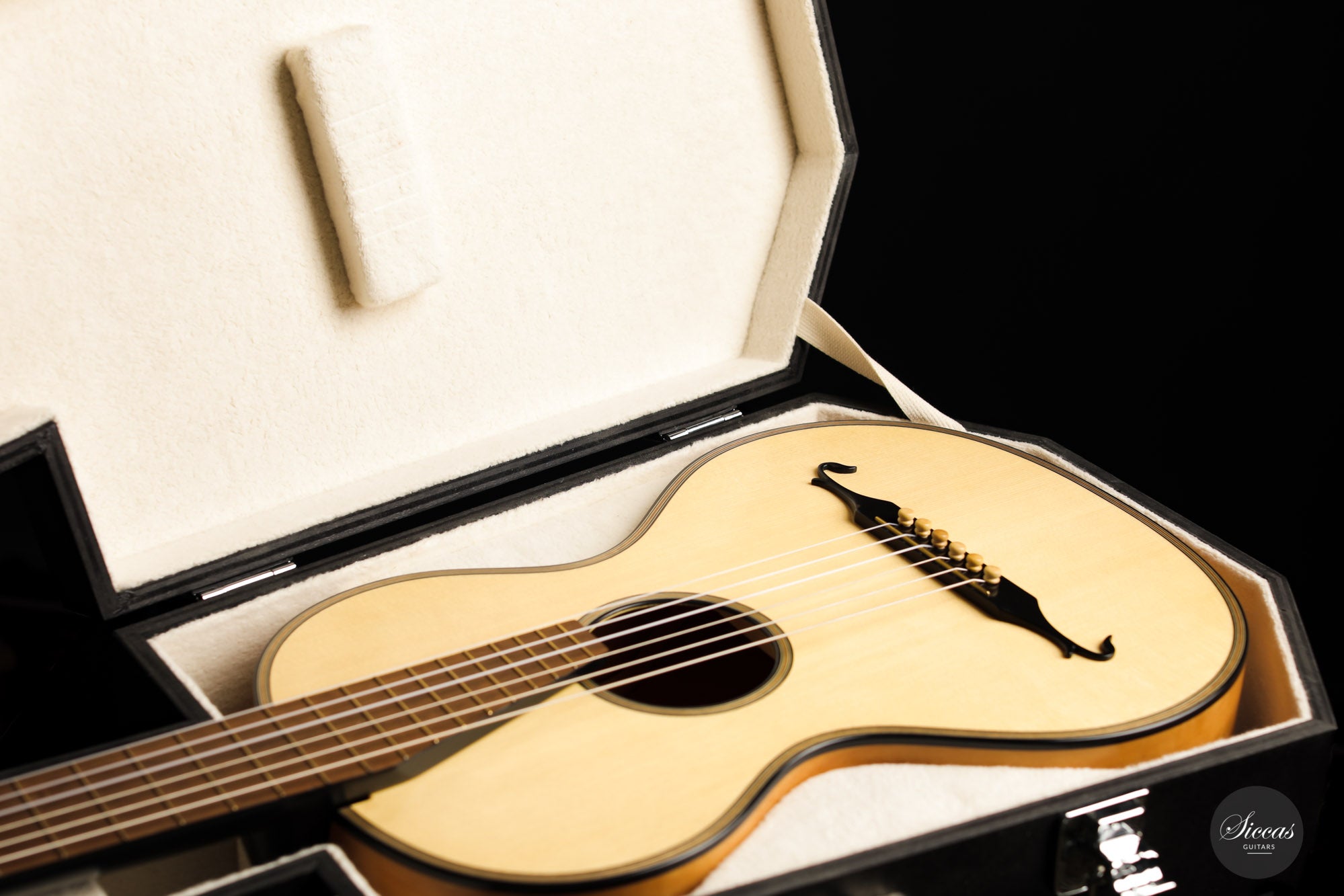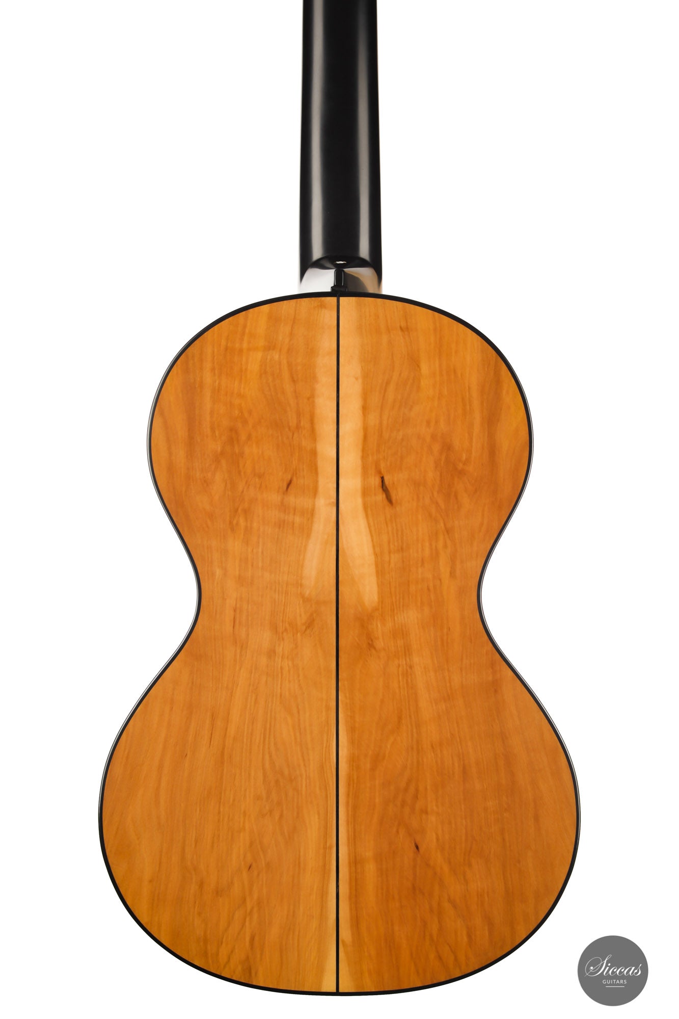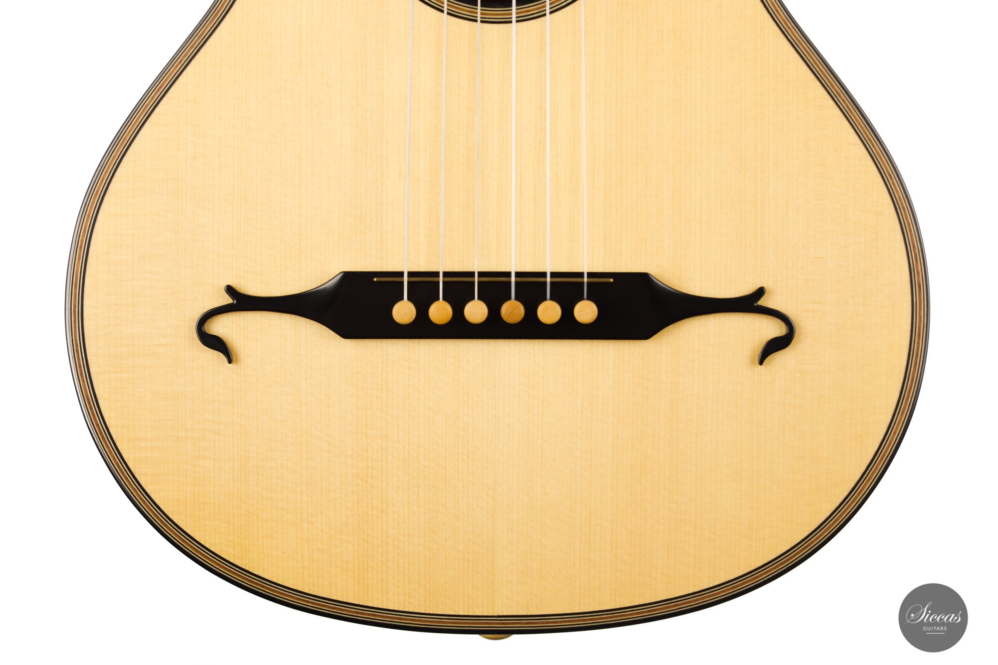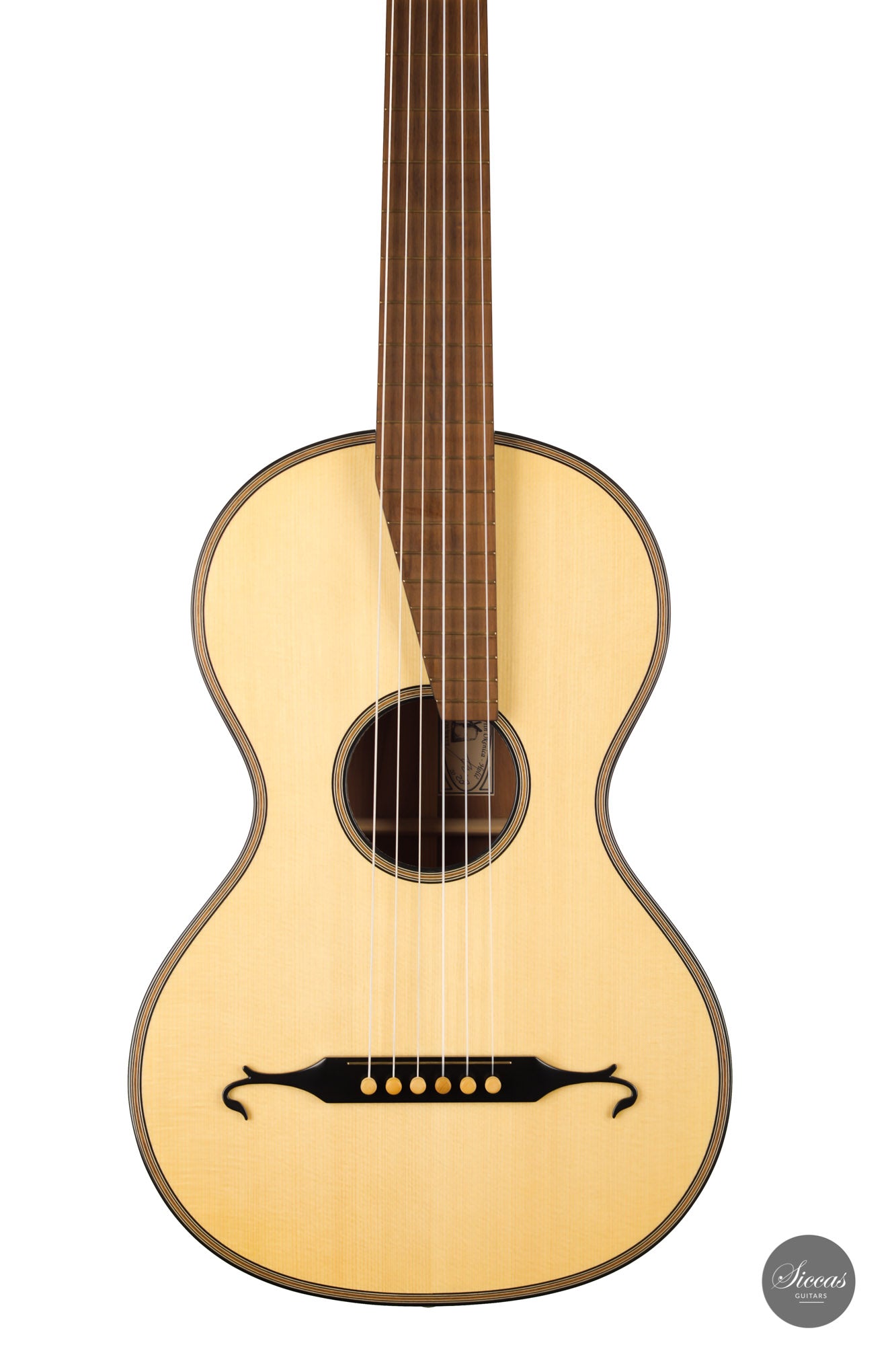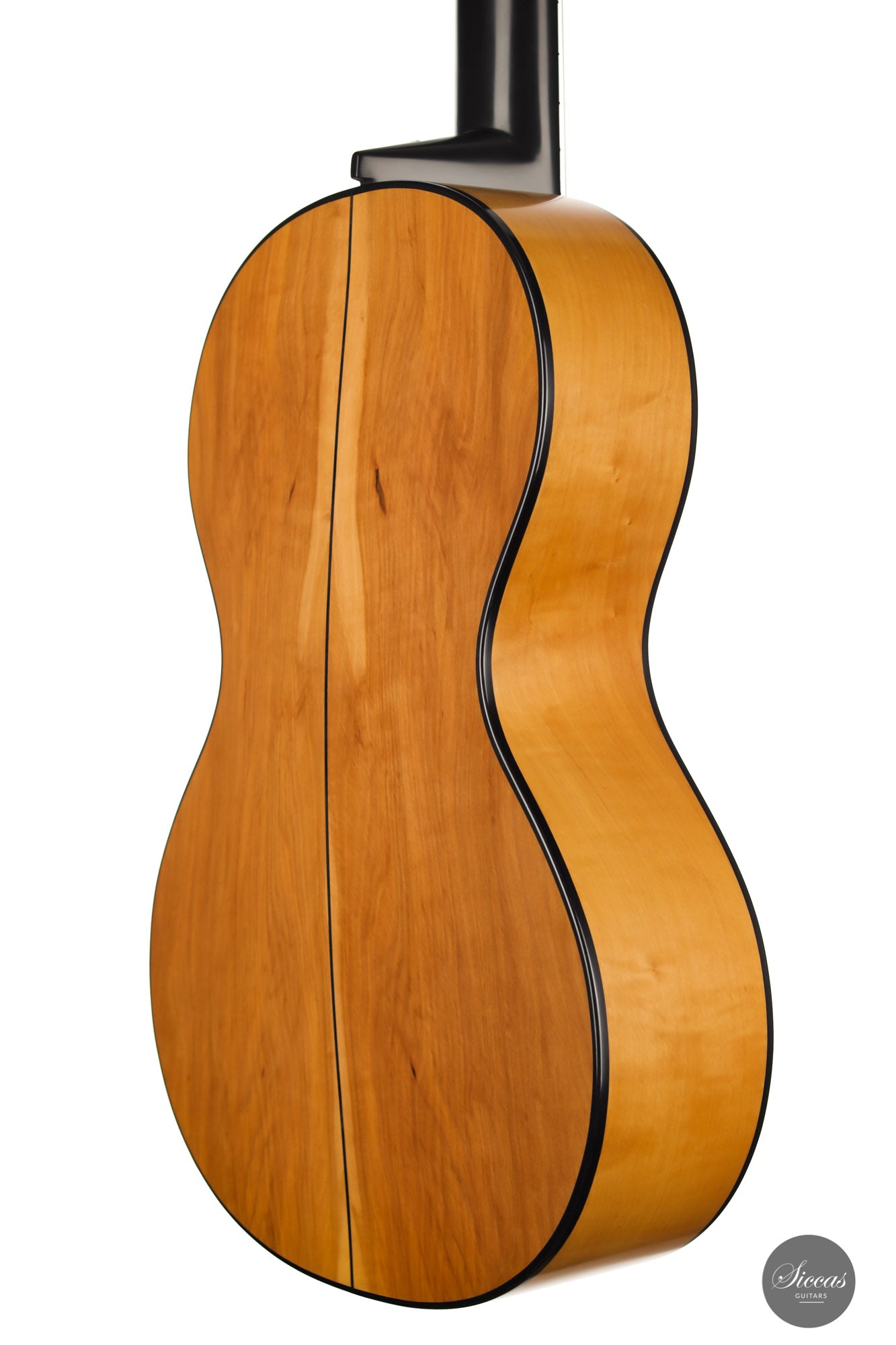 This guitar, opus 40 built in 2020, comes straight from Martin Okenica's workshop. It is a faithful copy of a Johann Georg Stauffer guitar (1778 - 1853) from 1829. Even the tuning mechanics has been copied identically and handcrafted by the Slovakian luthier himself. The fantastic playability and the impressive sound of Stauffer guitars are easily found and matched in this instrument. Moreover, the playing ease in the left hand is enhanced by the possibility of adjusting the height of the strings with a single turn of a key. This is made possible by a mechanical system for adjusting the angle of the neck, which has also been copied from the original guitar. In short, it is an excellent romantic guitar, ready to accompany the guitarist in the discovery of the sounds of the Viennese guitar tradition of the 19th century.