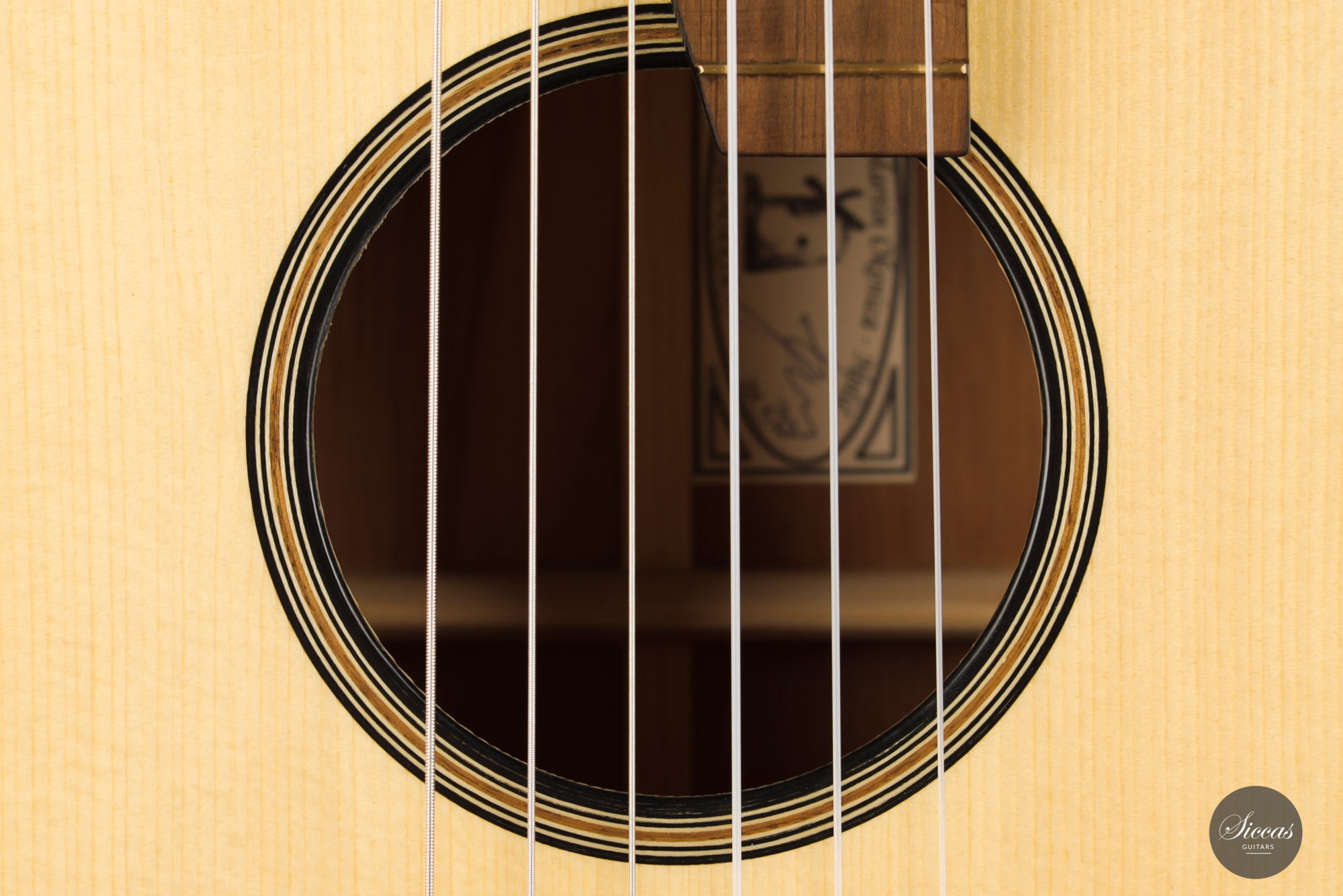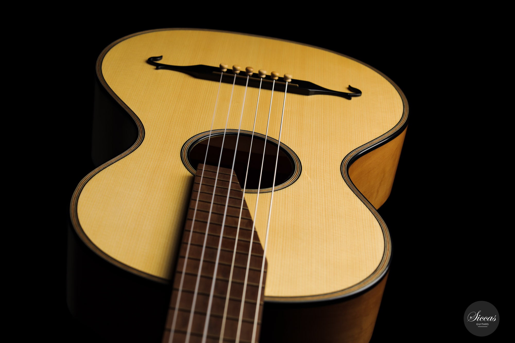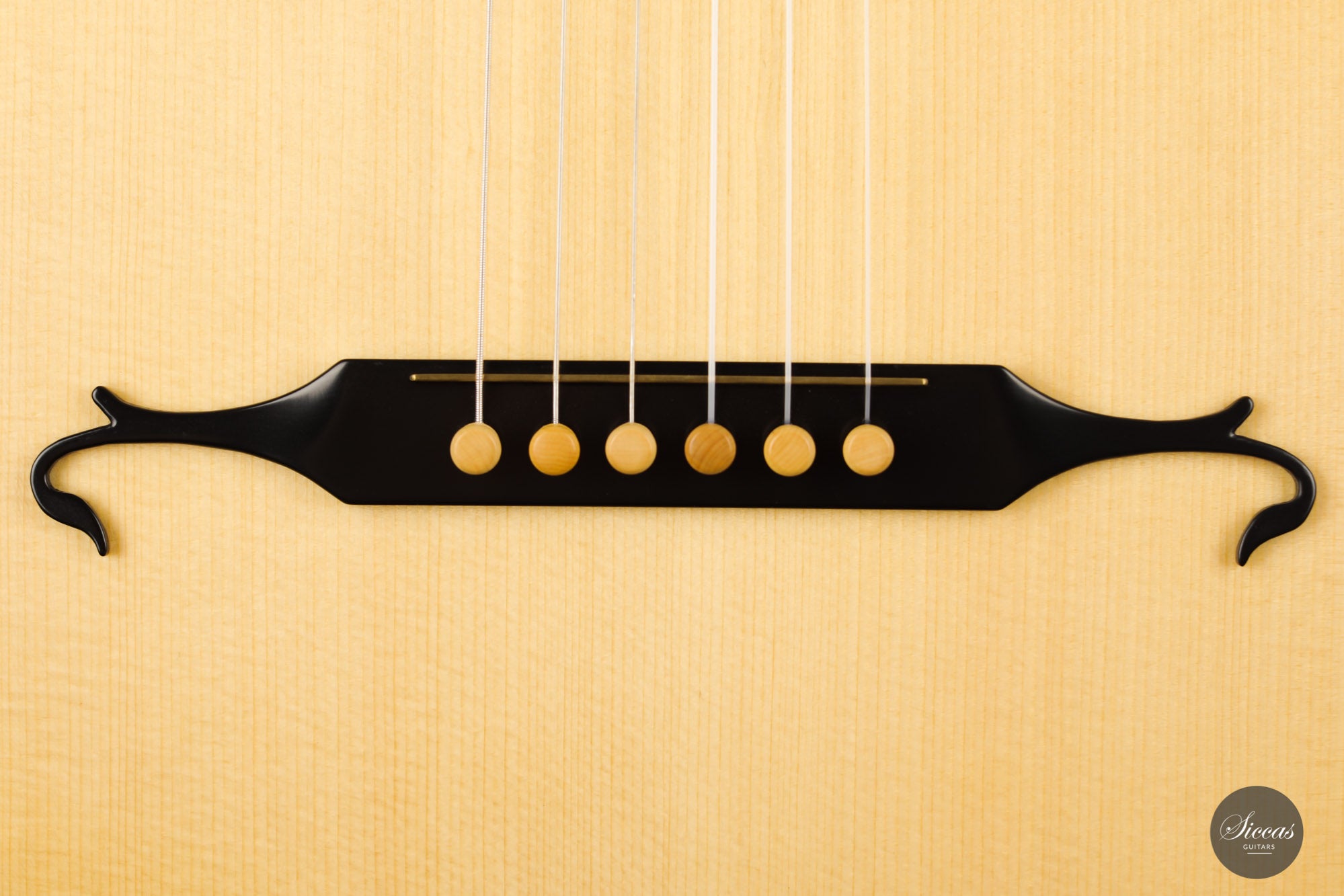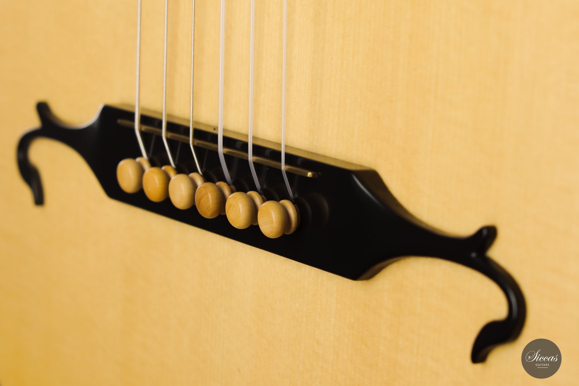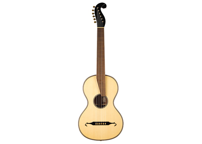 This guitar, opus 40 built in 2020, comes straight from Martin Okenica's workshop. It is a faithful copy of a Johann Georg Stauffer guitar (1778 - 1853) from 1829. Even the tuning mechanics has been copied identically and handcrafted by the Slovakian luthier himself. The fantastic playability and the impressive sound of Stauffer guitars are easily found and matched in this instrument. Moreover, the playing ease in the left hand is enhanced by the possibility of adjusting the height of the strings with a single turn of a key. This is made possible by a mechanical system for adjusting the angle of the neck, which has also been copied from the original guitar. In short, it is an excellent romantic guitar, ready to accompany the guitarist in the discovery of the sounds of the Viennese guitar tradition of the 19th century.