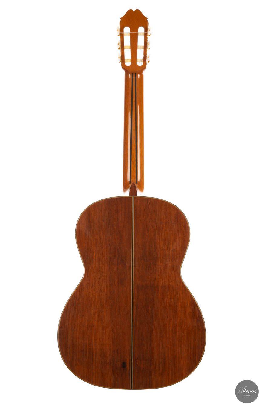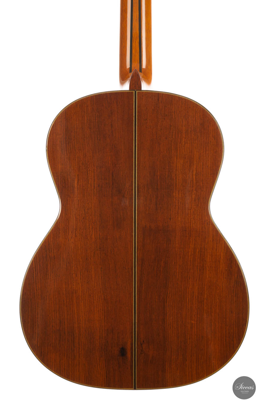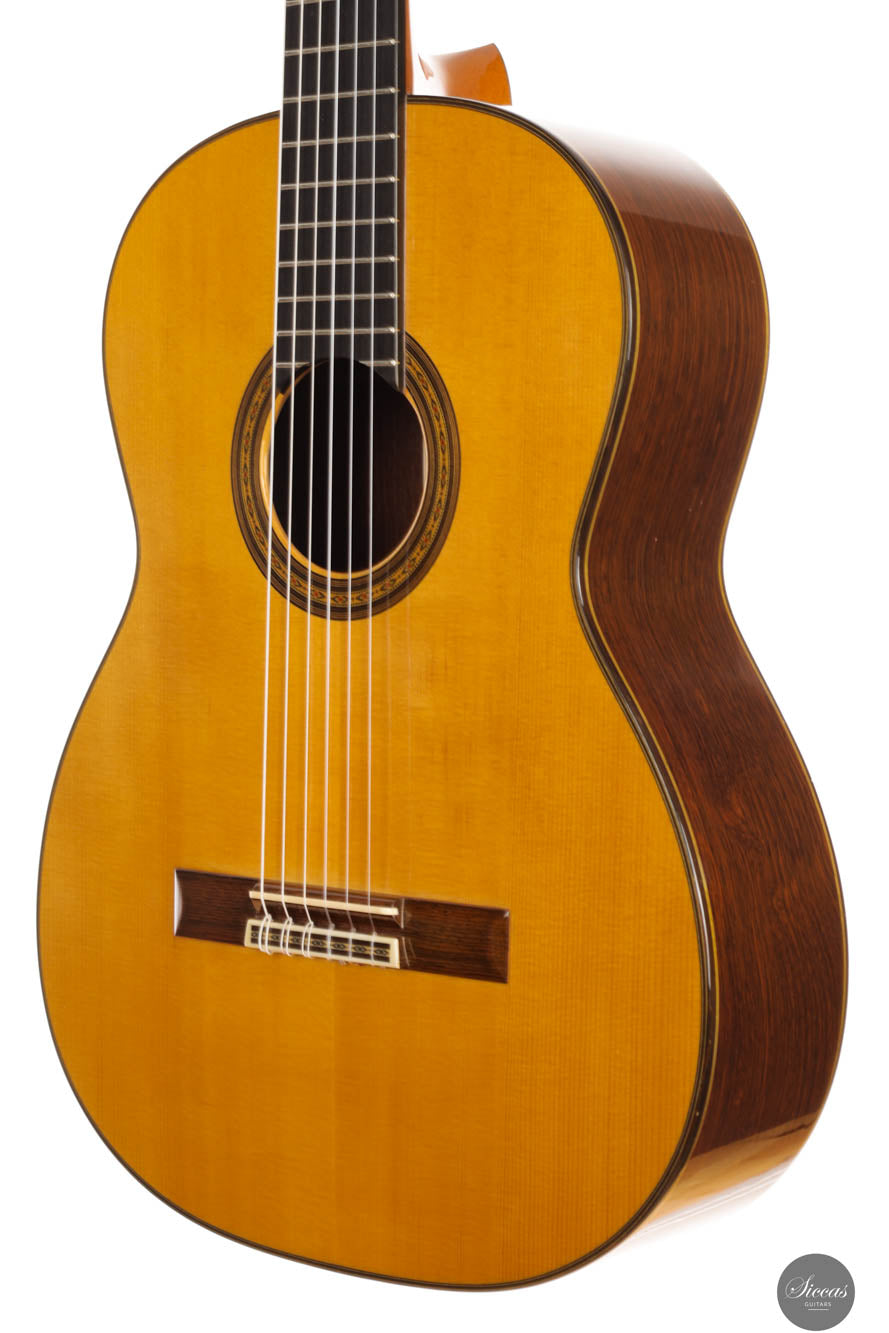 Diese wunderschöne Gitarre besitzt alle ästhetischen Qualitäten von Kohno-Gitarren, wie perfekte Handwerkskunst und eine Fichtendecke mit einer schönen honigfarbenen, sogenannten „Cashew“-Oberfläche. Die Form des Kopfstocks ist eine Kombination aus der Kopfform der Gitarren von Robert Bouchet und Masaru Kohno. Der von dieser Gitarre erzeugte Klang ist einfach erstaunlich und übertrifft unsere Erwartungen für ein so zugängliches Modell bei weitem. Kraft und Projektion werden mit einer fantastischen Bespielbarkeit kombiniert. Die erste Saite ist brillant und singt elegant mit großartigem Sustain. Es ist eine Gitarre mit einem fast spanischen Anschlag sowie sehr gut definierten und präzisen Bässen. Eine sehr schöne Überraschung und ein Instrument, das gleichermaßen allen Arten von Gitarristen, Amateuren und Profis, empfohlen wird. Die Gitarre ist in einem sehr guten Zustand mit minimalen Spielspuren.