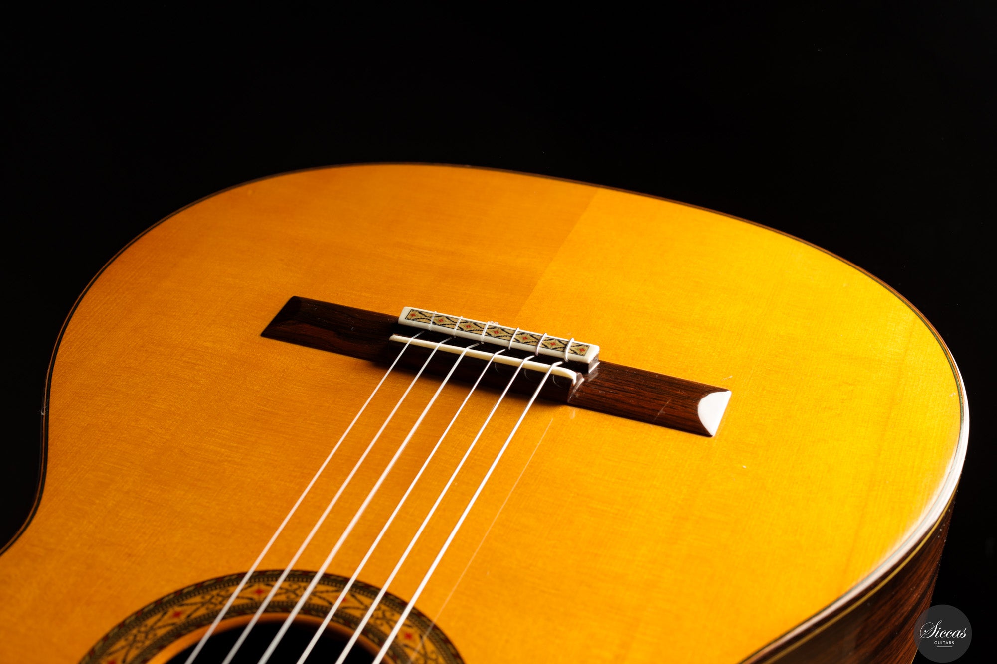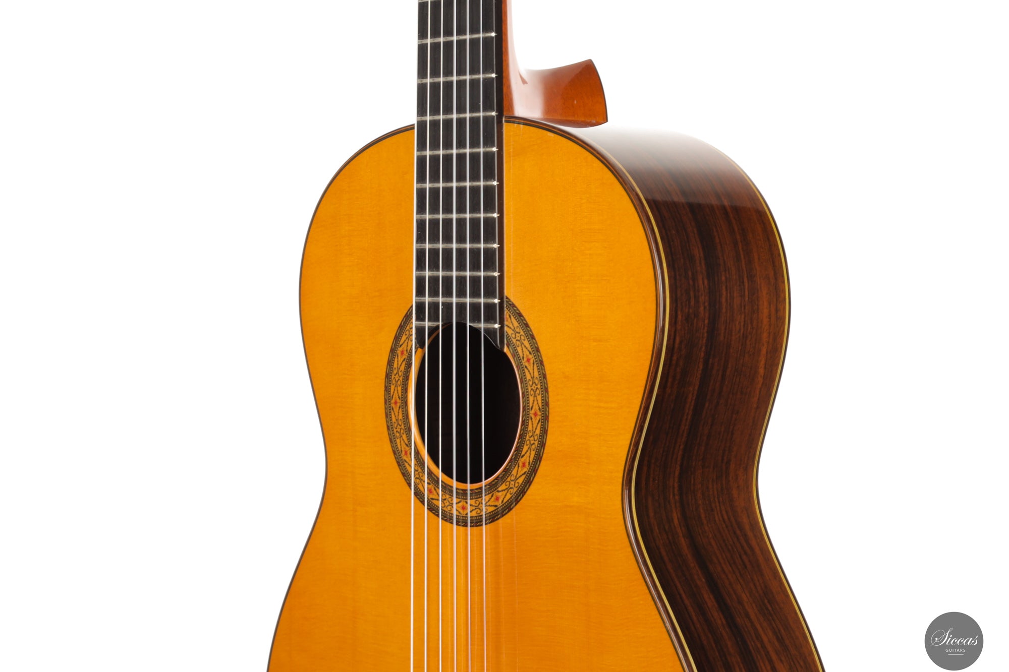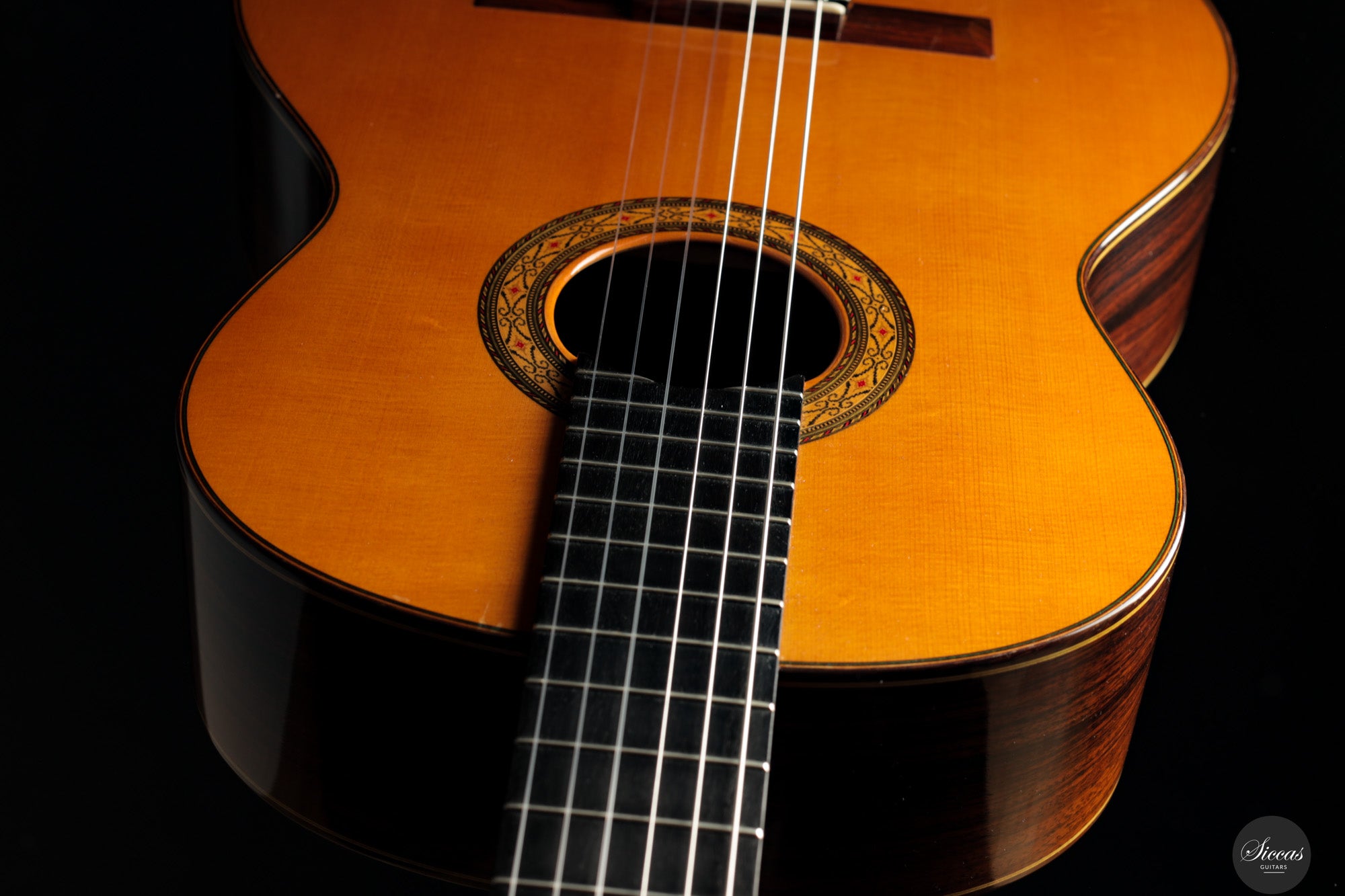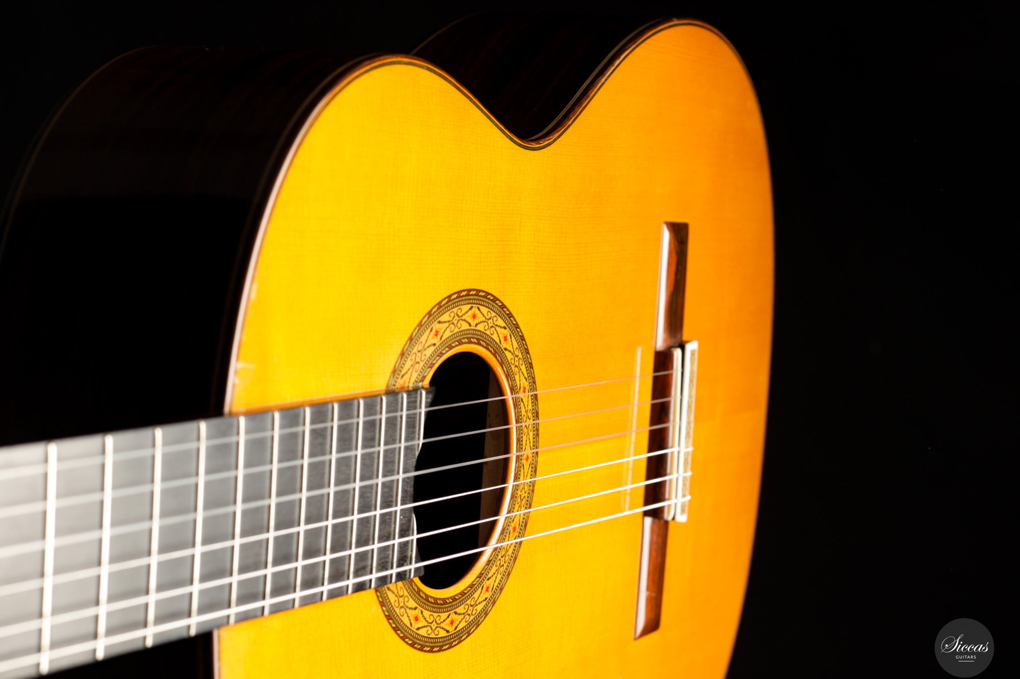 Die Mensur von 660 mm verleiht dem Instrument eine etwas festere Spielspannung, sorgt jedoch auch für mehr Artikulationsschärfe und klaren Tonansatz. Für feinfühlige Spieler ist der Unterschied spürbar, bleibt jedoch in der Handhabung komfortabel. Die Fichtendecke und der Korpus aus indischem Palisander sind mit dem für Kohno typischen Kaschuhlack überzogen – klanglich durchlässig und optisch warm.