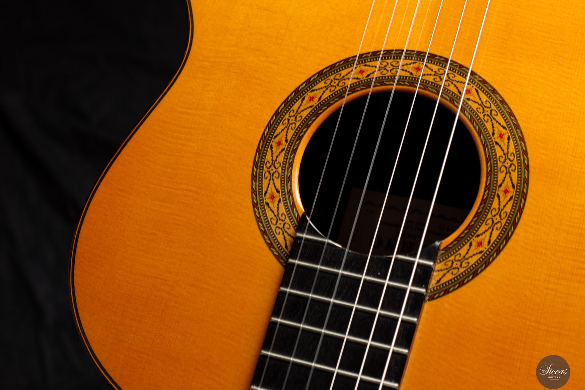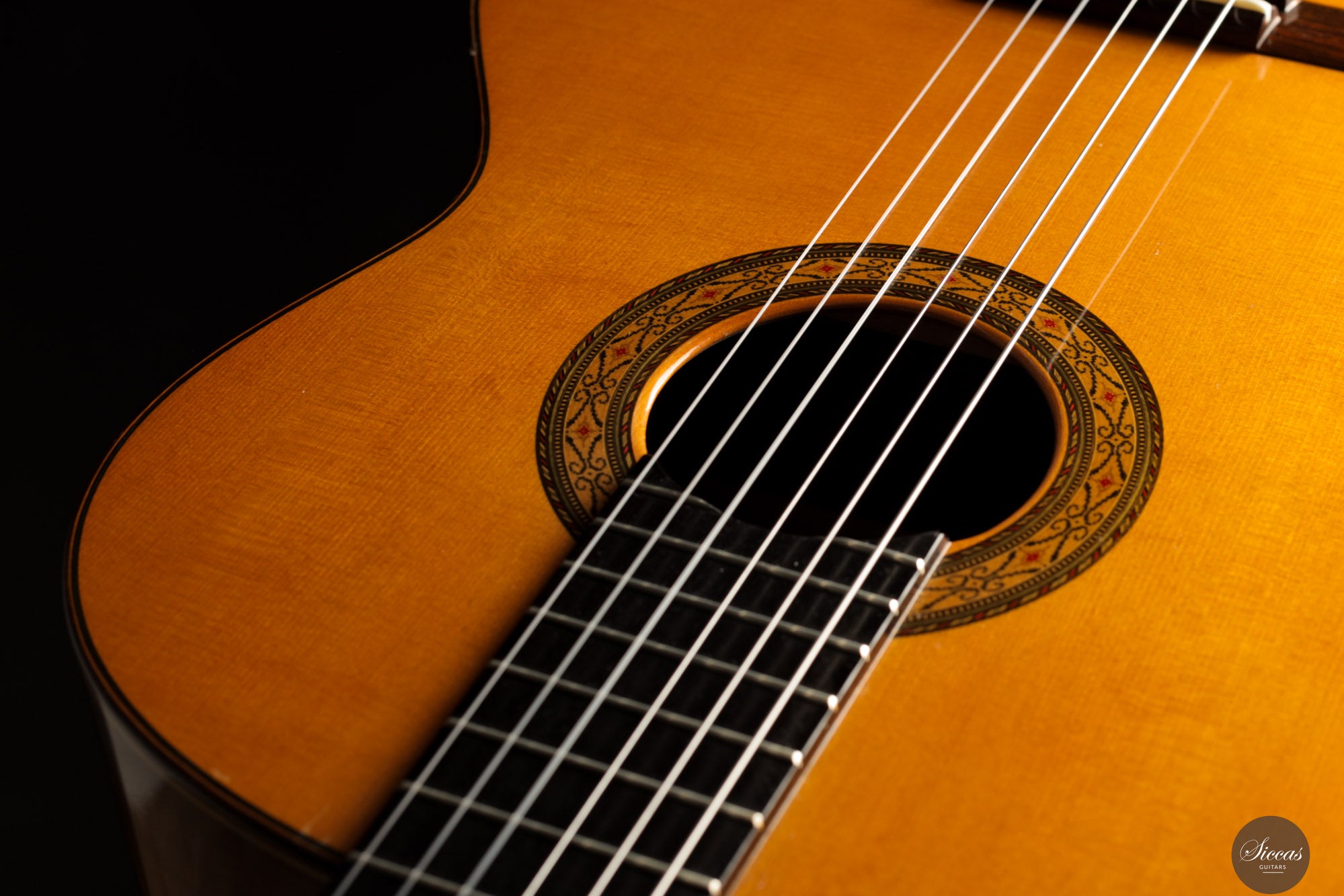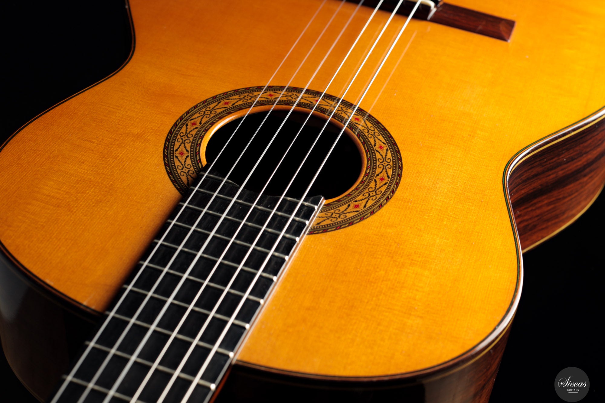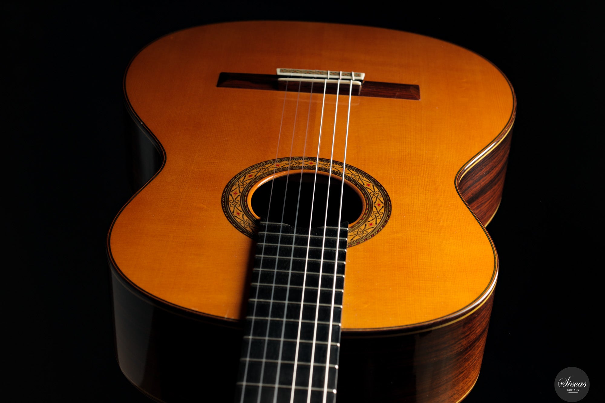 Die Mensur von 660 mm verleiht dem Instrument eine etwas festere Spielspannung, sorgt jedoch auch für mehr Artikulationsschärfe und klaren Tonansatz. Für feinfühlige Spieler ist der Unterschied spürbar, bleibt jedoch in der Handhabung komfortabel. Die Fichtendecke und der Korpus aus indischem Palisander sind mit dem für Kohno typischen Kaschuhlack überzogen – klanglich durchlässig und optisch warm.