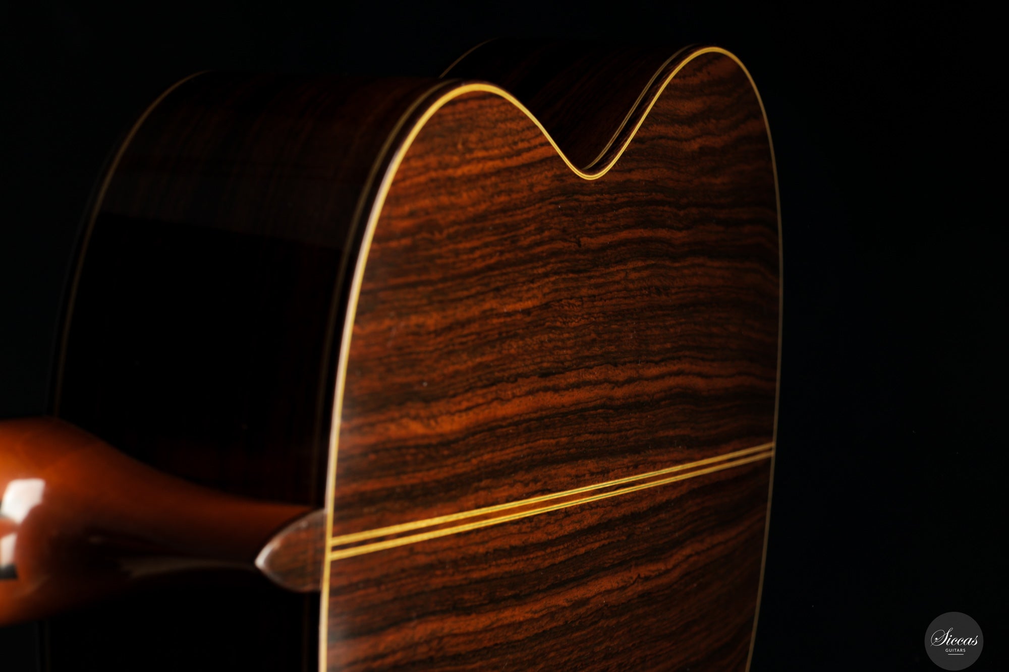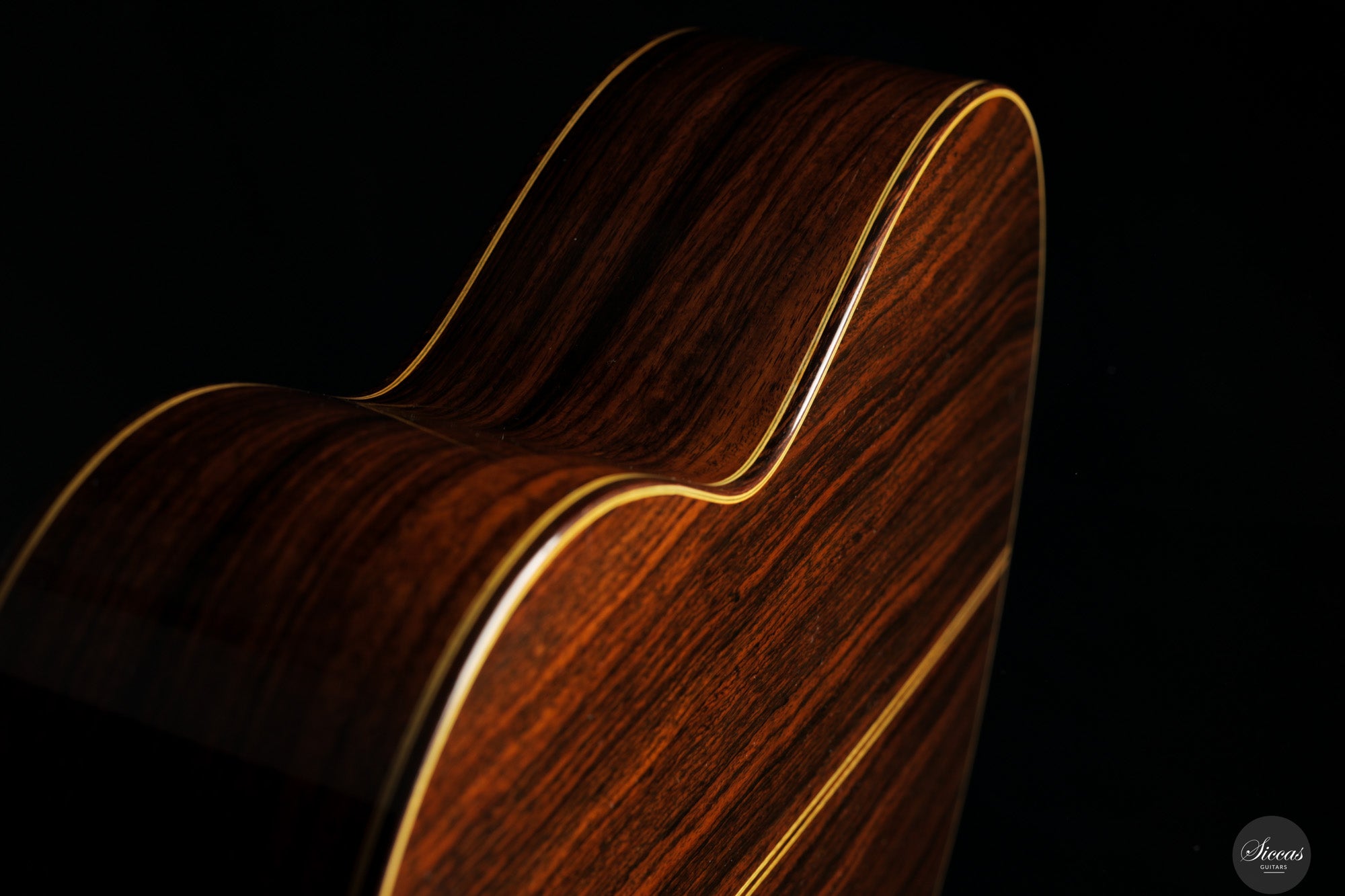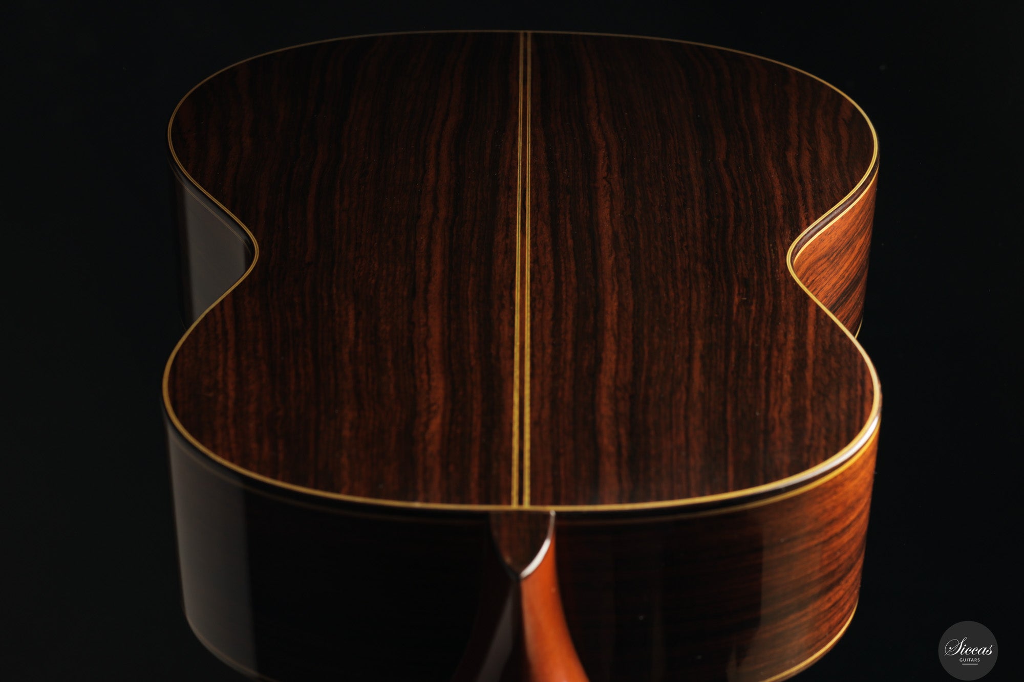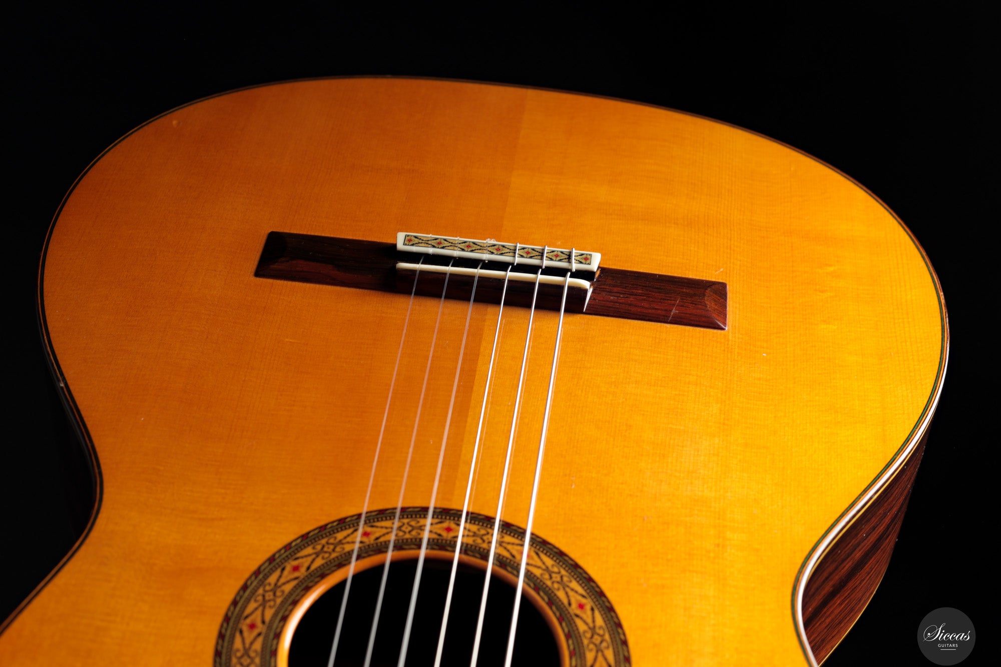 Die Mensur von 660 mm verleiht dem Instrument eine etwas festere Spielspannung, sorgt jedoch auch für mehr Artikulationsschärfe und klaren Tonansatz. Für feinfühlige Spieler ist der Unterschied spürbar, bleibt jedoch in der Handhabung komfortabel. Die Fichtendecke und der Korpus aus indischem Palisander sind mit dem für Kohno typischen Kaschuhlack überzogen – klanglich durchlässig und optisch warm.