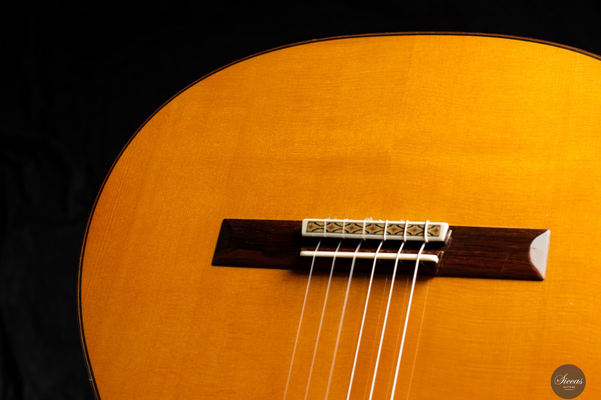 Dieses Model 10 aus dem Jahr 1976 stammt aus Kohno’s reifer Schaffenszeit. Die Gitarre zeichnet sich durch eine außergewöhnlich gute Balance zwischen den Registern aus, mit kontrollierten Obertönen, gleichmäßigem Nachklang und einem fokussierten Grundklang. Die Übergänge zwischen den Registern sind fließend, ohne dominante Frequenzen – ein Kennzeichen von Kohnos struktureller Sorgfalt.