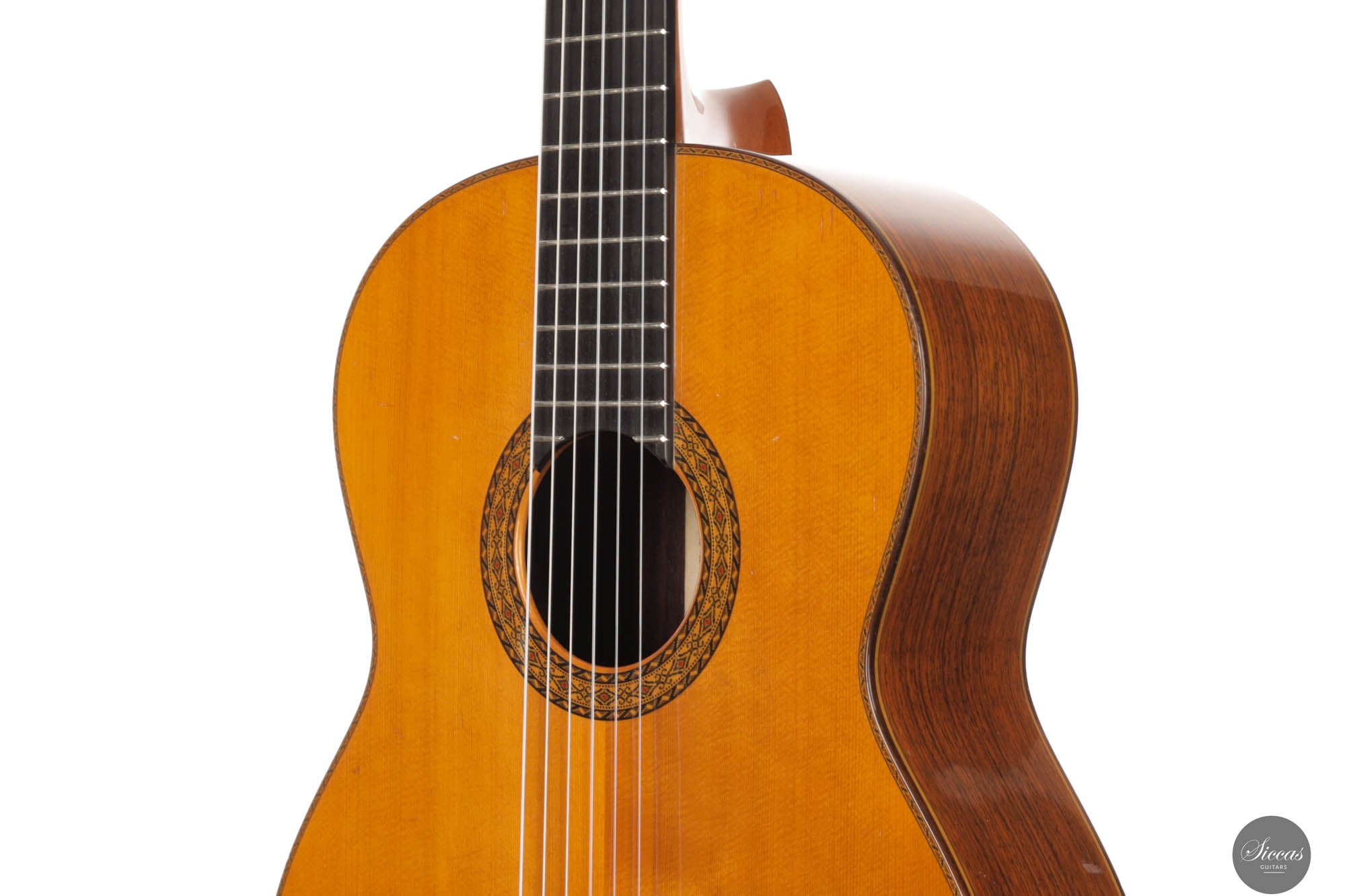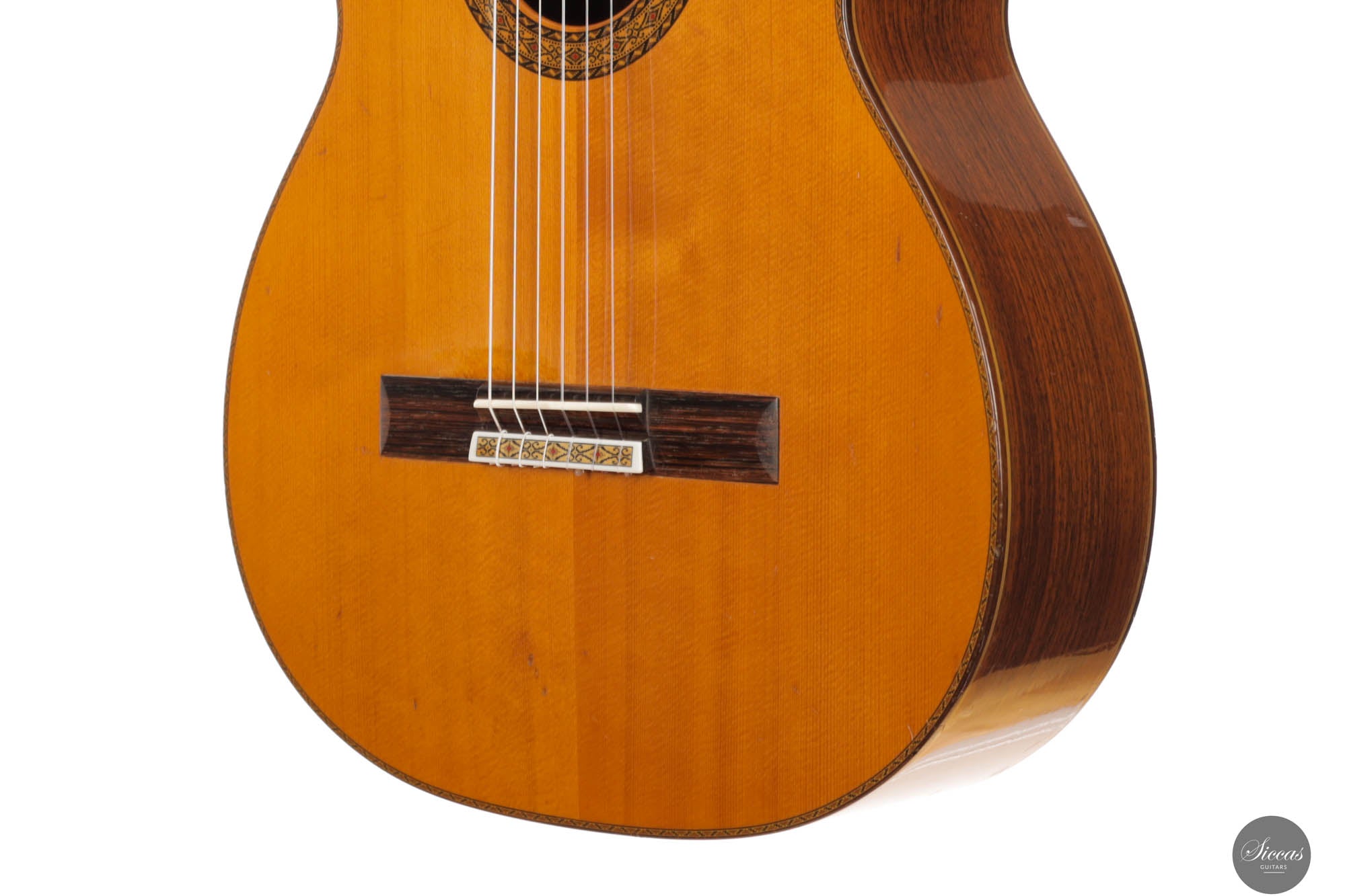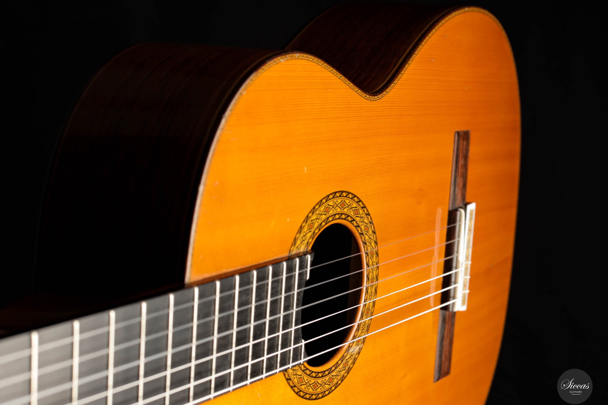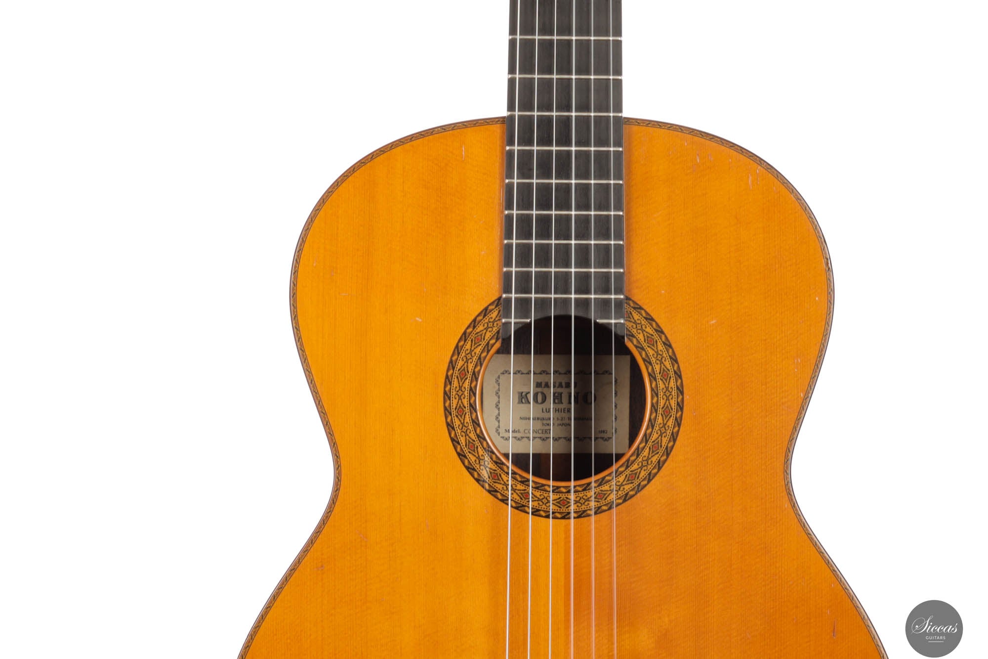Nummerierungssystem für seine Modelle, das ursprünglich die Einzelhandelspreise in Japan widerspiegelte; zum Beispiel wurde eine Nr. 20 für 200.000 japanische Yen verkauft. Dieses System wurde jedoch aufgrund des Wirtschaftswachstums und der Inflation obsolet, was im Laufe der Jahre zu Unstimmigkeiten bei der Bezeichnung der Qualität der Modelle führte. Ab 1982 wurde die Bezeichnung Kohno ausschließlich den hochwertigsten Konzertgitarren zugeordnet, was dieses Instrument zu einem der ersten in dieser Reihe macht. Das Instrument ist mit Boden und Zargen aus indischem Palisander und einer Fichtendecke ausgestattet und verfügt über feine Details, hochwertige Mechaniken und eindrucksvolle handgearbeitete Randeinlagen um das Schallloch und die Zargen. Trotz einiger Gebrauchsspuren befindet sich die Gitarre in einem sehr guten Zustand und weist keinerlei Risse oder strukturelle Probleme auf. Außerdem wurde der Sechs-Loch-Steg auf zwölf Löcher erweitert, um den Saitenwechsel zu erleichtern. Der typische Kohno-Klang - klar, holzig und etwas dunkel für ein Fichtenmodell - macht die Gitarre zu einer erstklassigen Wahl für anspruchsvolle Gitarristen.