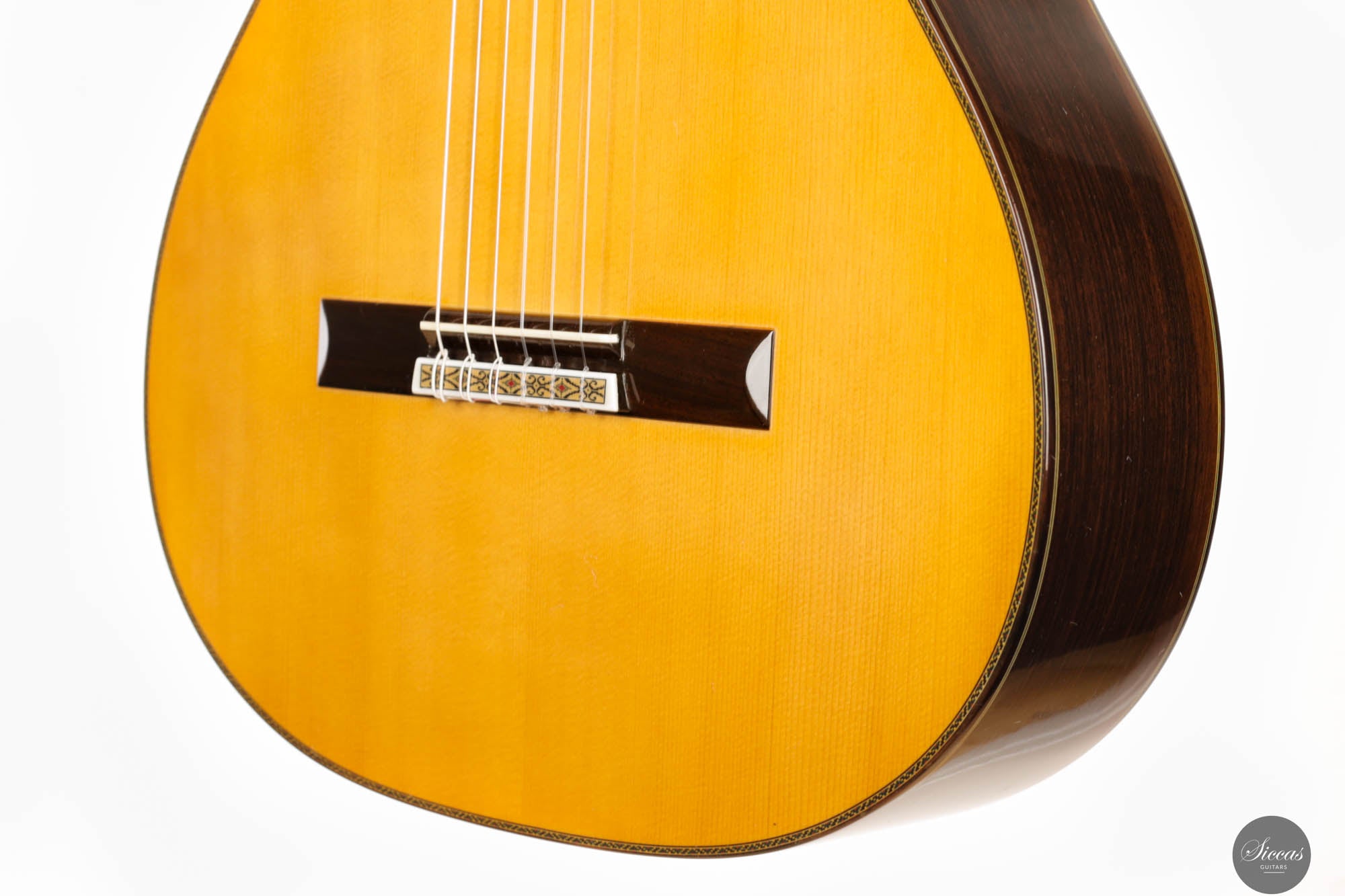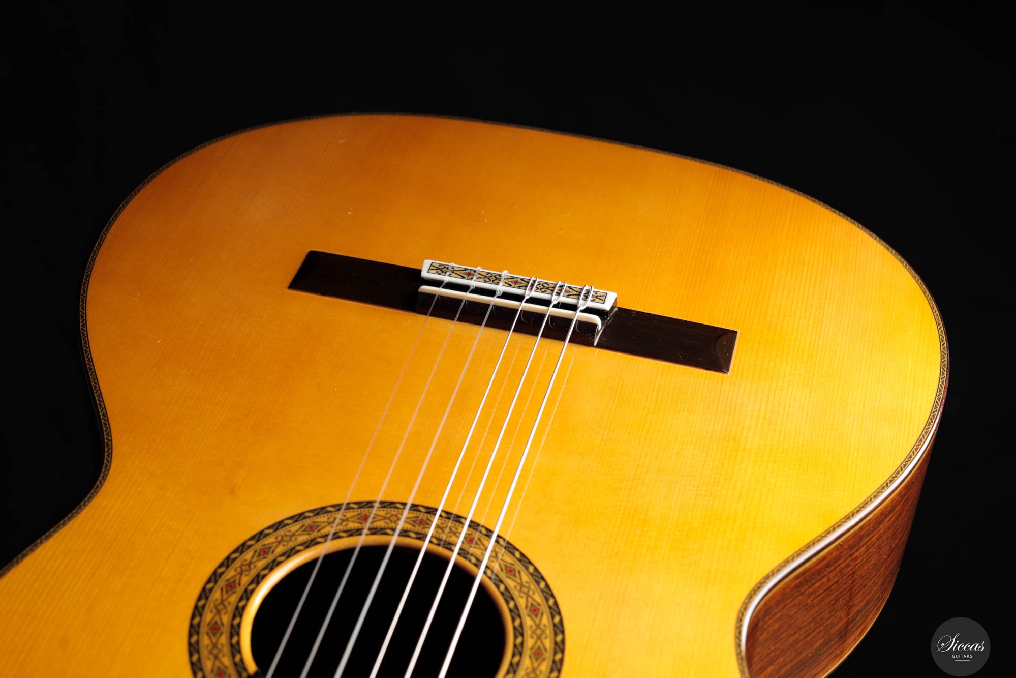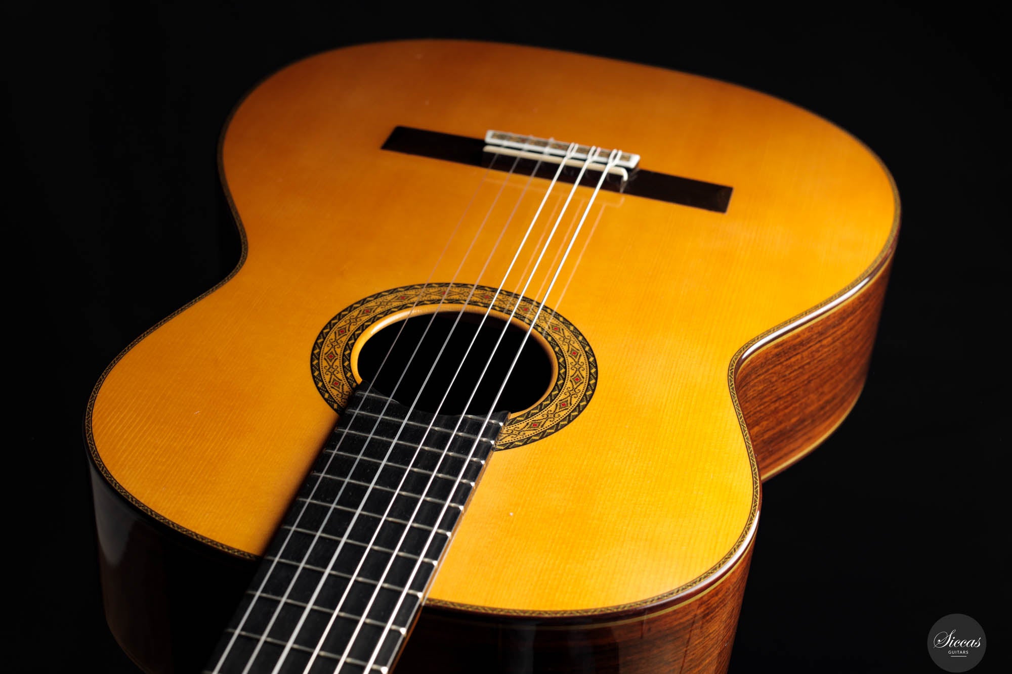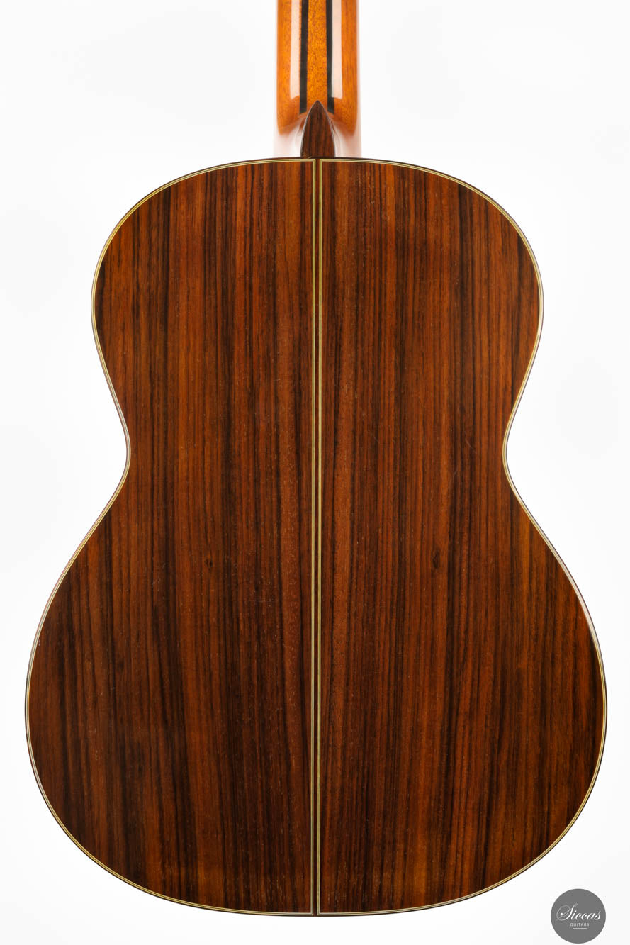 Diese Konzertgitarre von Masaru Kohno aus dem Jahr 1983 ist ein Meisterwerk, das außergewöhnliche Handwerkskunst repräsentiert und bei Gitarristen unterschiedlichster Erfahrungsstufen sehr beliebt ist. Sie zeichnet sich durch eine ausgewogene Klangqualität aus und eignet sich für eine breite Palette an Musikstilen und Genres, dank ihrer Fichtendecke, die ihr ein klares und lebendiges Timbre verleiht, das auch anspruchsvolle Hörer begeistert. Ungeachtet ihrer langen Lebensdauer befindet sich die Kohno Concert in einem sehr guten Zustand. Sie weist lediglich einige Gebrauchsspuren auf, die ihren Charakter unterstreichen, ohne ihre strukturelle Integrität zu beeinträchtigen. Die Sorgfalt, mit der Masaru Kohno die Gitarre gebaut hat, ist offensichtlich, ebenso wie die gewissenhafte Pflege, die sie im Laufe der Jahre erfahren hat. Die Ästhetik der Gitarre wird durch den markanten Boden und die Zargen aus indischem Palisander unterstrichen, was sie optisch ebenso faszinierend macht, wie ihre klangliche Qualität. Diese Kombination aus hervorragendem Klang, Spielbarkeit und optischer Attraktivität macht die Masaru Kohno Concert zu einem wahren Highlight unter den klassischen Gitarren.