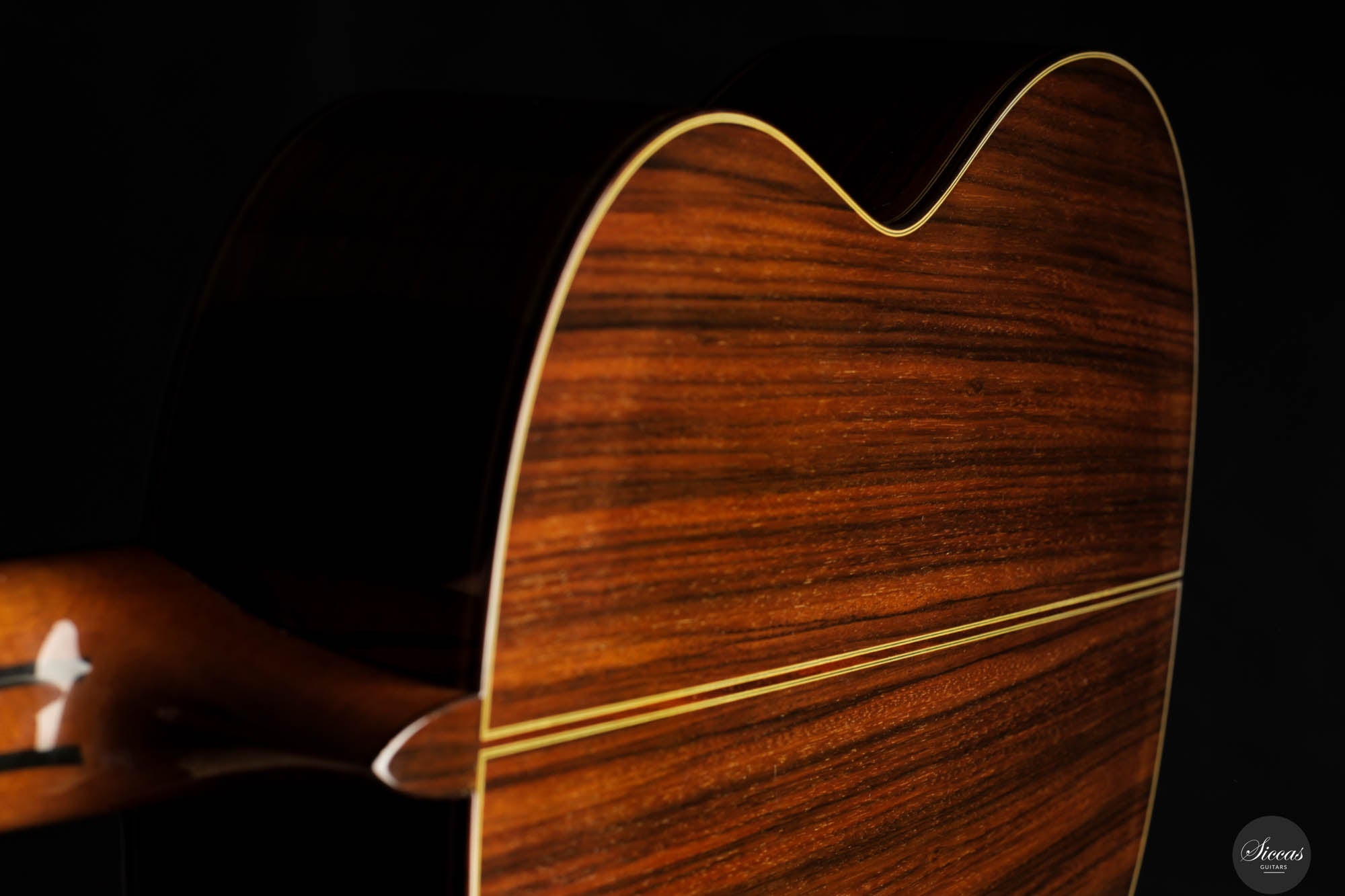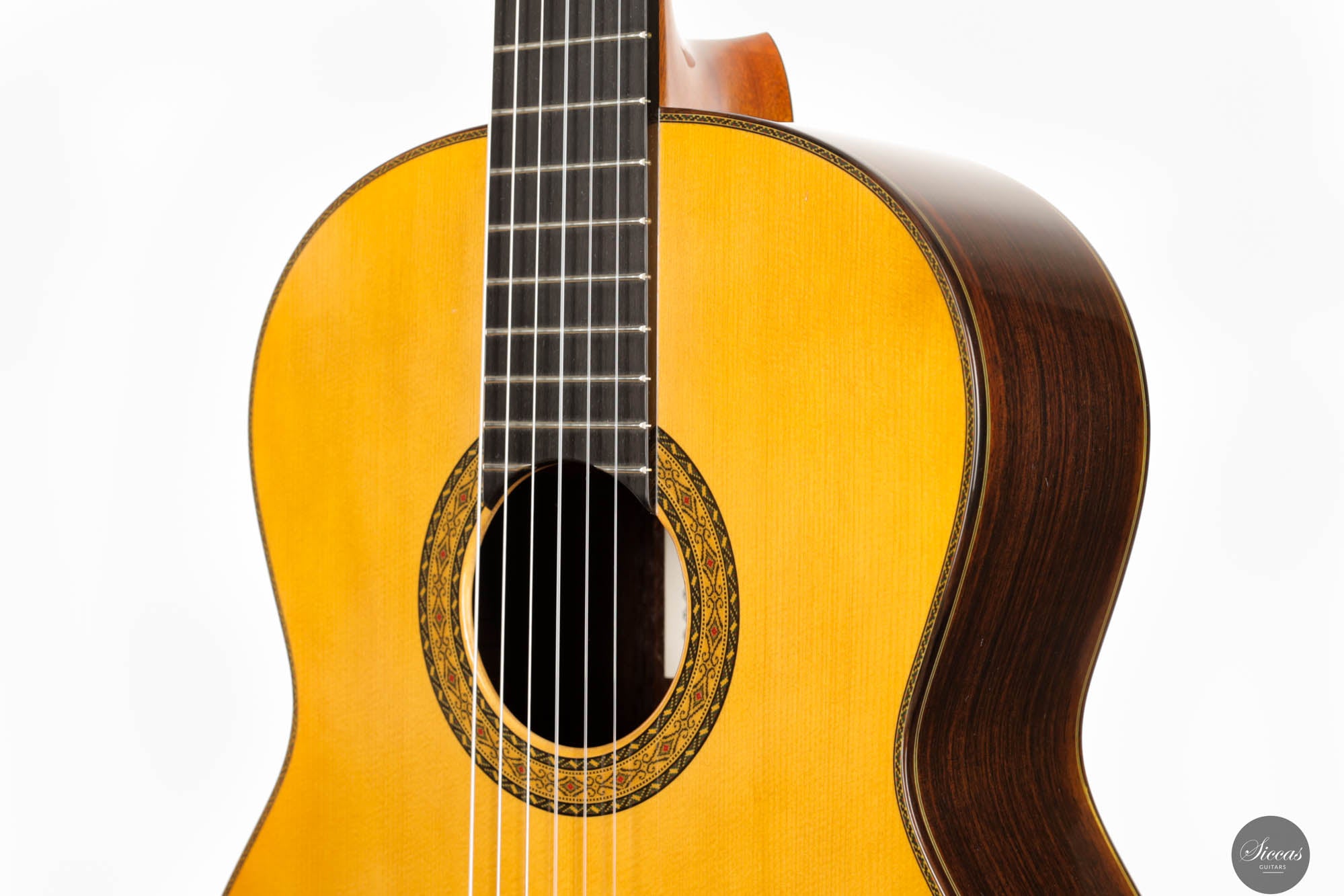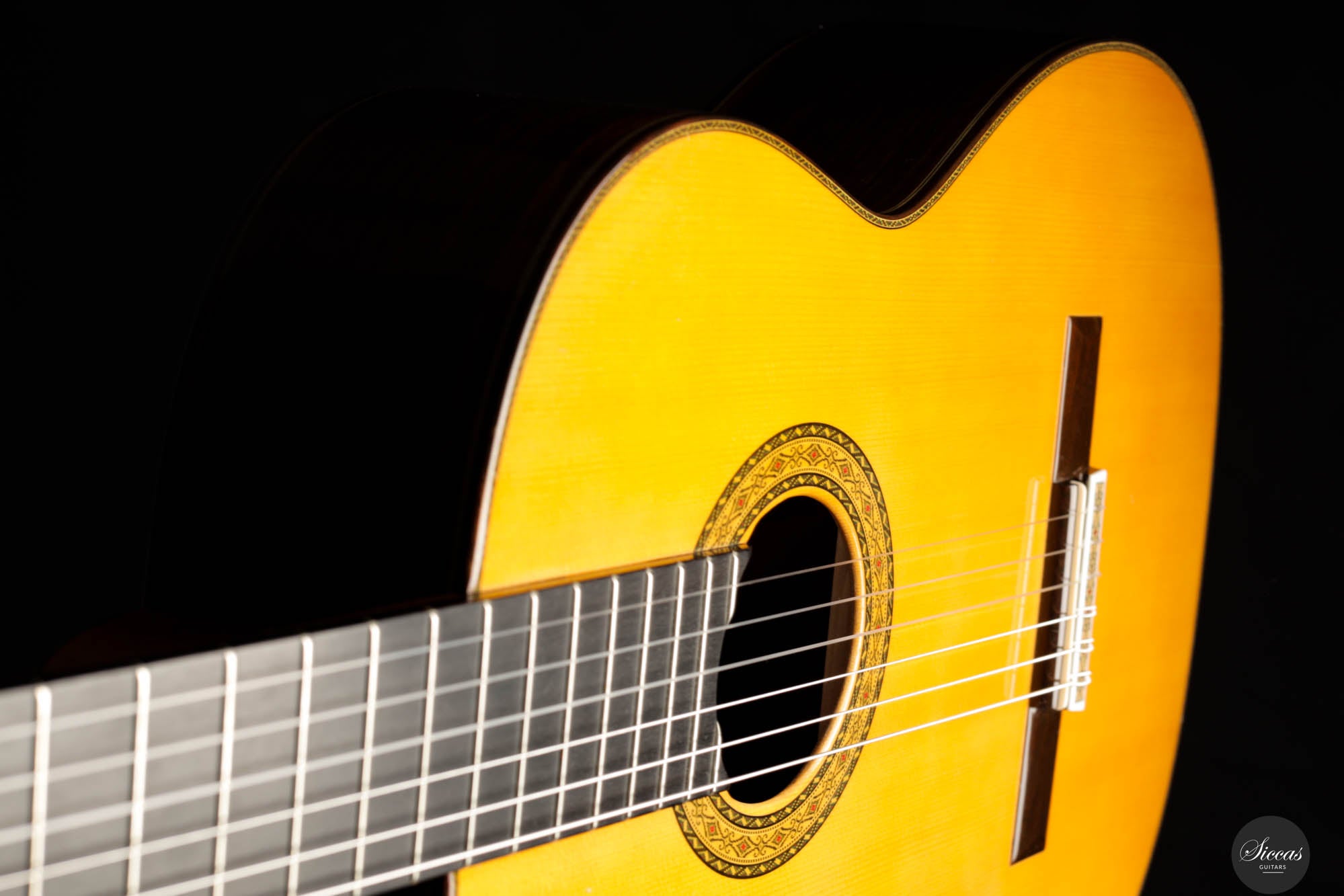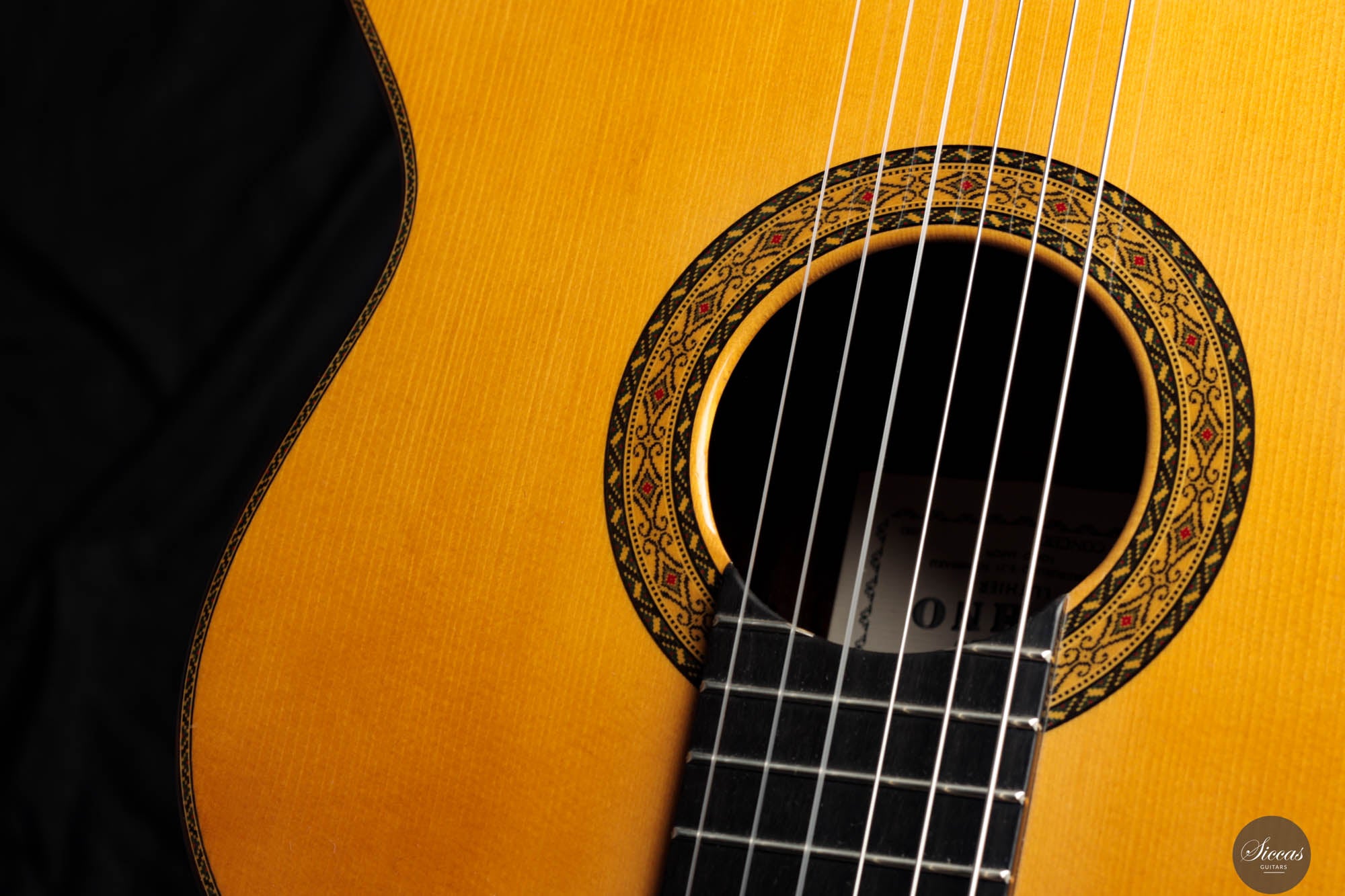 Diese Konzertgitarre von Masaru Kohno aus dem Jahr 1983 ist ein Meisterwerk, das außergewöhnliche Handwerkskunst repräsentiert und bei Gitarristen unterschiedlichster Erfahrungsstufen sehr beliebt ist. Sie zeichnet sich durch eine ausgewogene Klangqualität aus und eignet sich für eine breite Palette an Musikstilen und Genres, dank ihrer Fichtendecke, die ihr ein klares und lebendiges Timbre verleiht, das auch anspruchsvolle Hörer begeistert. Ungeachtet ihrer langen Lebensdauer befindet sich die Kohno Concert in einem sehr guten Zustand. Sie weist lediglich einige Gebrauchsspuren auf, die ihren Charakter unterstreichen, ohne ihre strukturelle Integrität zu beeinträchtigen. Die Sorgfalt, mit der Masaru Kohno die Gitarre gebaut hat, ist offensichtlich, ebenso wie die gewissenhafte Pflege, die sie im Laufe der Jahre erfahren hat. Die Ästhetik der Gitarre wird durch den markanten Boden und die Zargen aus indischem Palisander unterstrichen, was sie optisch ebenso faszinierend macht, wie ihre klangliche Qualität. Diese Kombination aus hervorragendem Klang, Spielbarkeit und optischer Attraktivität macht die Masaru Kohno Concert zu einem wahren Highlight unter den klassischen Gitarren.