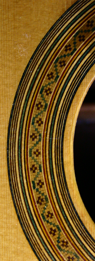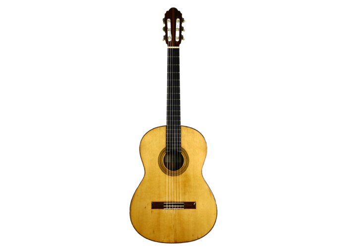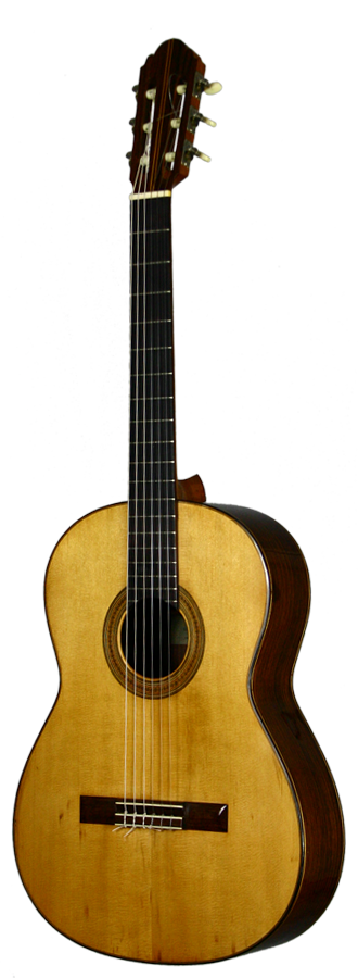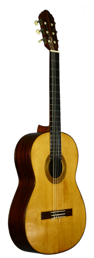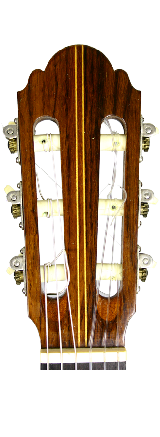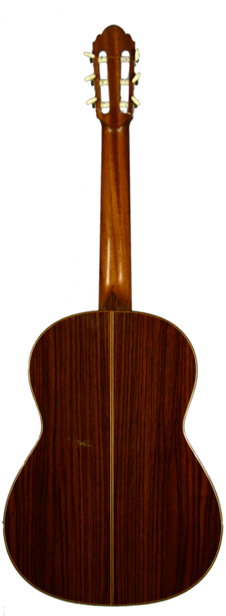 Masaru Kono baute diese wunderschöne Konzertgitarre im Jahr 1963. Sie besitzt noch das alte Label: "Masaru Kono - Constructor de Guitarras - TOKIO 1963". Die Decke besteht aus fein gemaserter Fichte. Das Schallloch ist mit braunen und roten dünnen Furnieren umrandet. In diesen, im Kreis angelegten Furnieren, befindet sich eine durch ein Mosaik dargestellte grüne wellenförmige Ranke, die in regelmäßigen Abständen mit roten Mosaikblumen verziert ist. Die Zargen und der Boden wurden aus Ostindischem Palisander gefertigt. Diese einmalige Gitarre überzeugt durch ihren kräfitigen aber nicht dominante Klang bis in die höchsten Lagen. Bald werden wir auch ein Video zu dieser Gitarre einstellen.