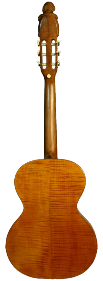 Diese prächtige Gitarre aus dem Hause Amberger besitzt eine Decke aus deutscher Fichte, die von hellen und dunklen Furnieren umrandet ist. Der Steg hat an seinen Enden Blüten die aus Perlmutt gefertigt sind. Der zweiteilige Boden sowie die Zargen sind aus geflammtem Ahorn. Der Kopf ist mit einer Verzapfung mit dem Hals verbunden und besteht wie der Hals vermutlich aus einem Fruchtholz.