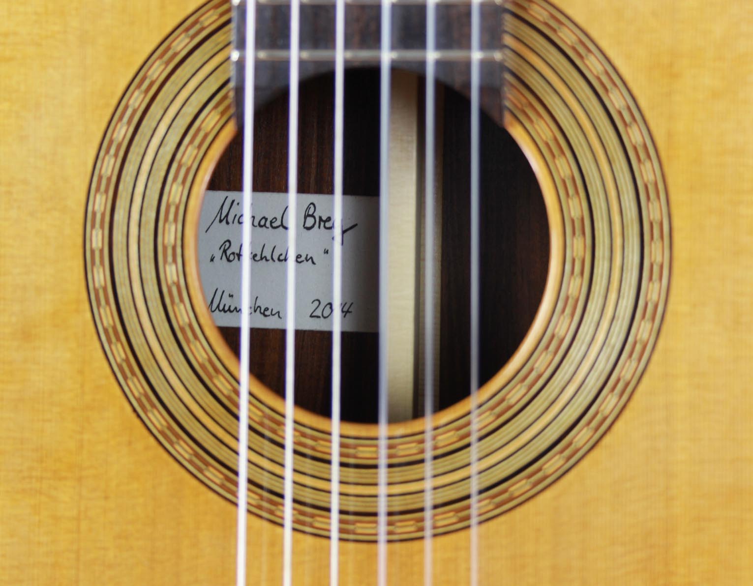 Die Konstruktionsweise der Michael Brey Konzertgitarren basiert auf der Tradition von Antonio de Torres (1817 – 1892), dem Wegbereiter des modernen Konzertgitarrenbaus. Eine symmetrische Fächerbeleistung der Decke, sowie eine sehr leichte Bauweise sind die traditionellen Merkmale meiner Gitarren. Um die Spannungen in der Decke und dem Boden zu reduzieren und deren Schwingungsfähigkeit zu optimieren verwendet Michael Brey eine Verstrebung zwischen dem Halsfuß und dem Endklotz.