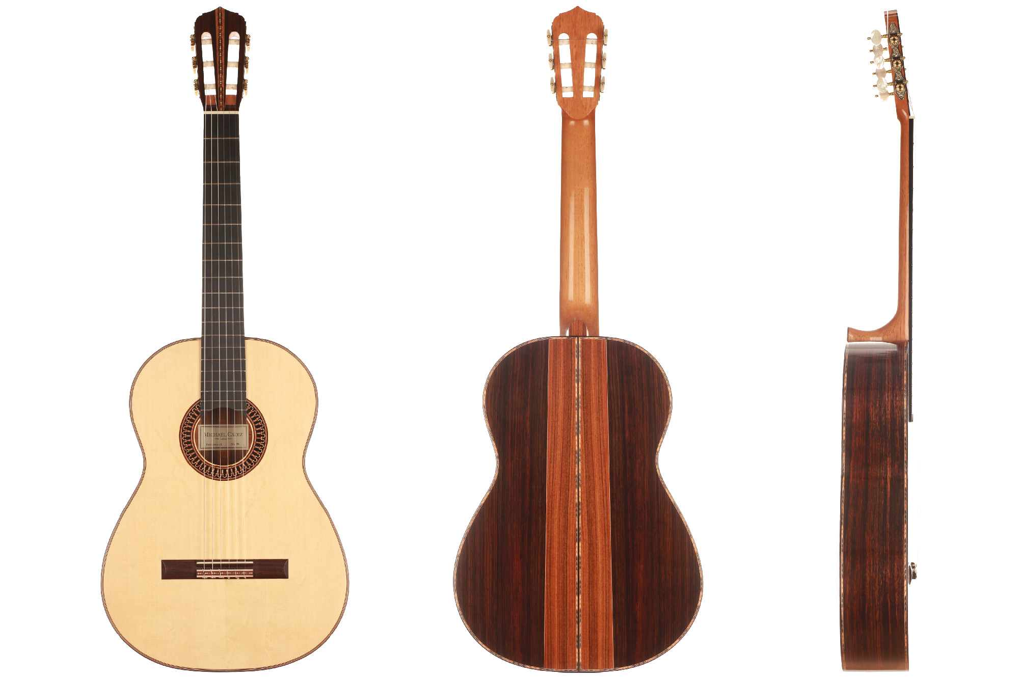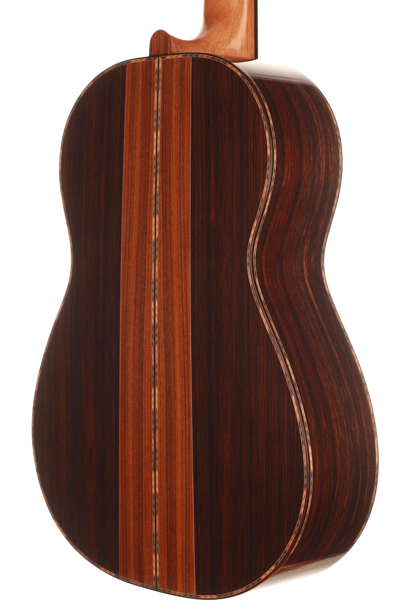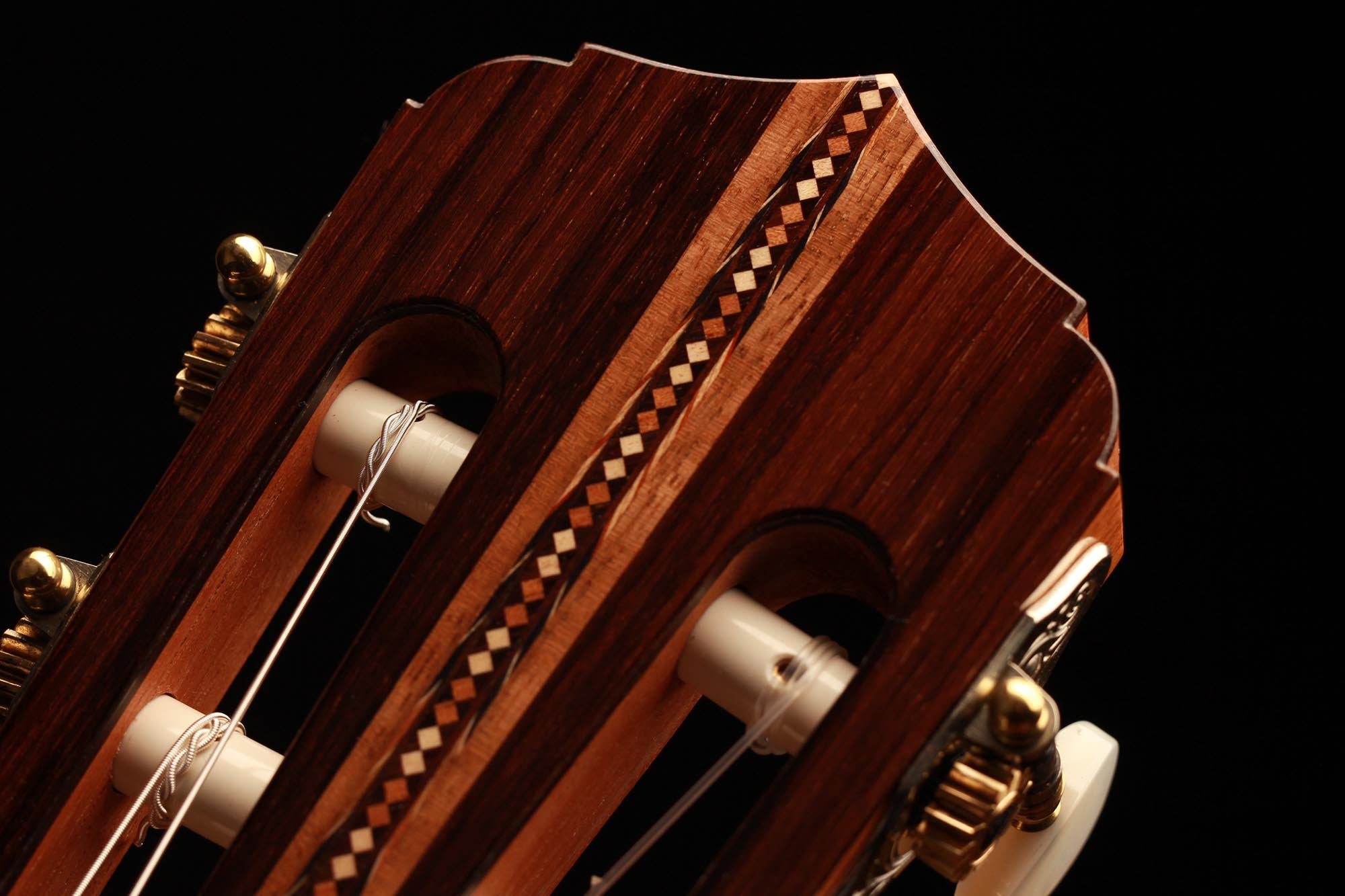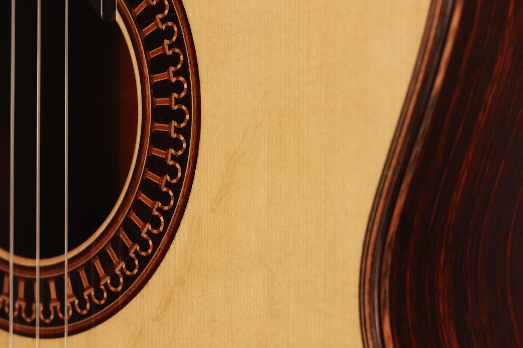 What an incredible guitar! This instrument, built on the model of José Luis Romanillos' guitars, is amazingly faithful to the style of the great master. This guitar shows an extraordinary know-how, both in terms of marquetry and acoustic properties. It is perfect in every detail. The beauty of the wood is underlined by the purity of the French varnish and by the elegance of the Rodgers silver tuners. It is a very light and spontaneous guitar with a brilliant endless sound that offers a fantastic playing ease. The subtlety of the sound colours and the timelessness of its timbre place this guitar at the highest level of contemporary lutherie.