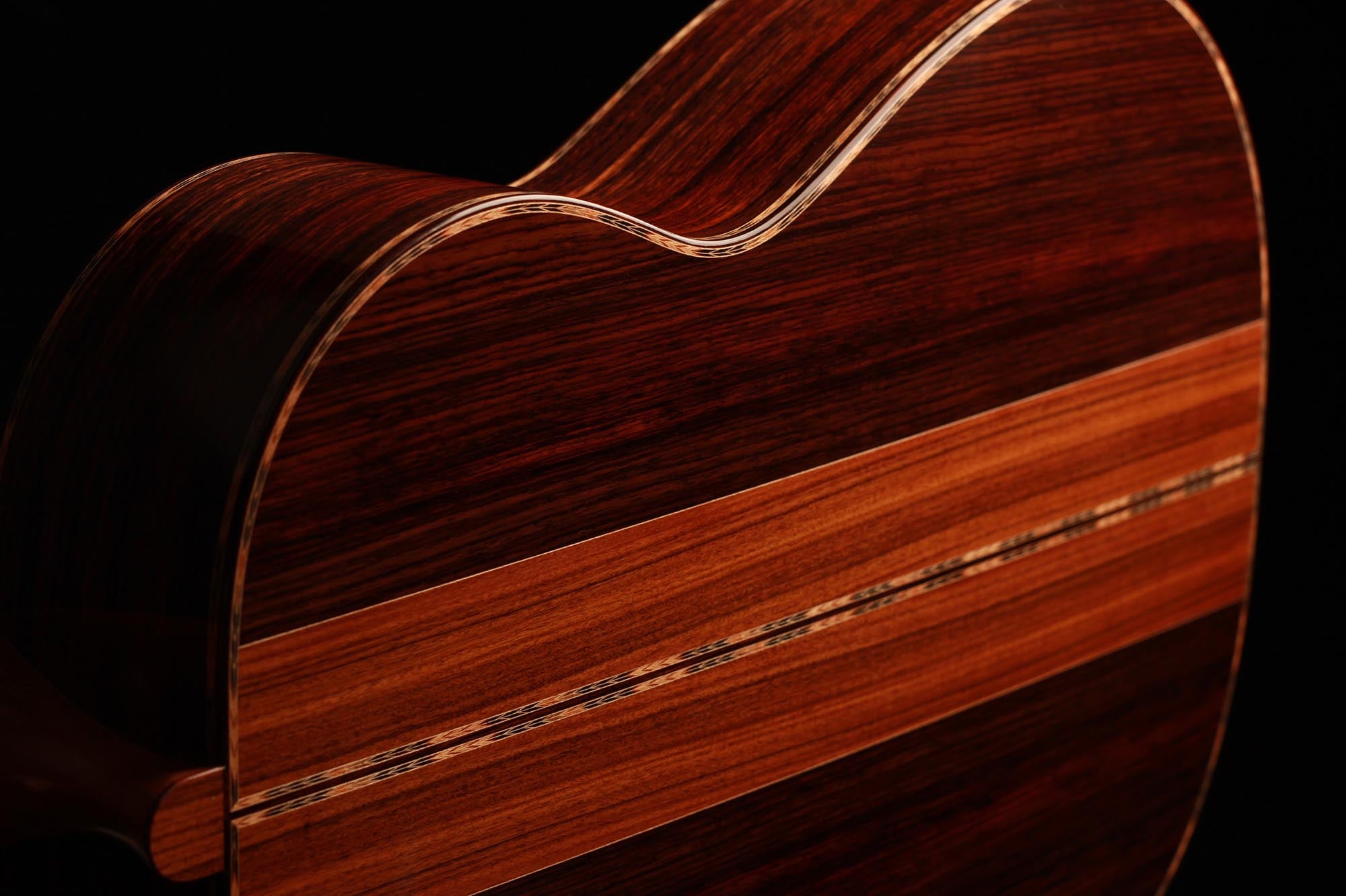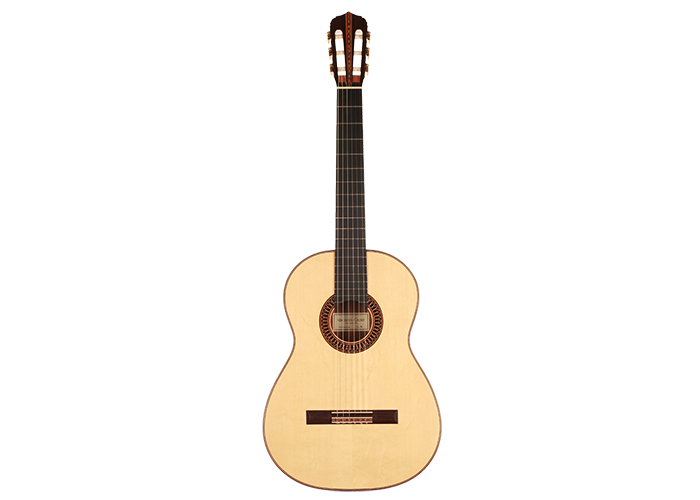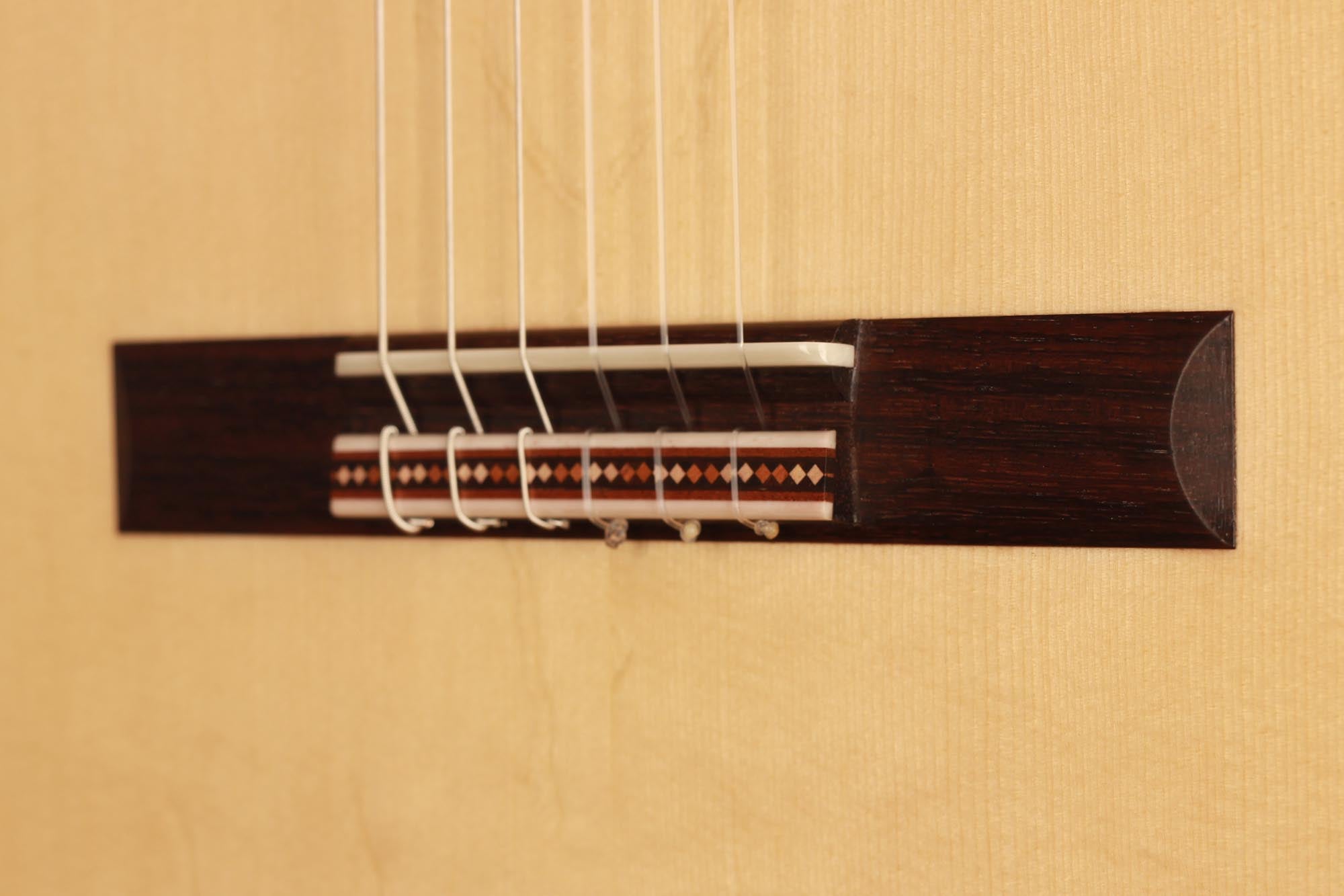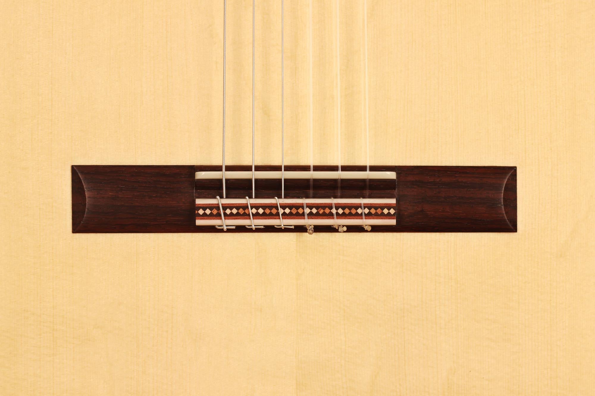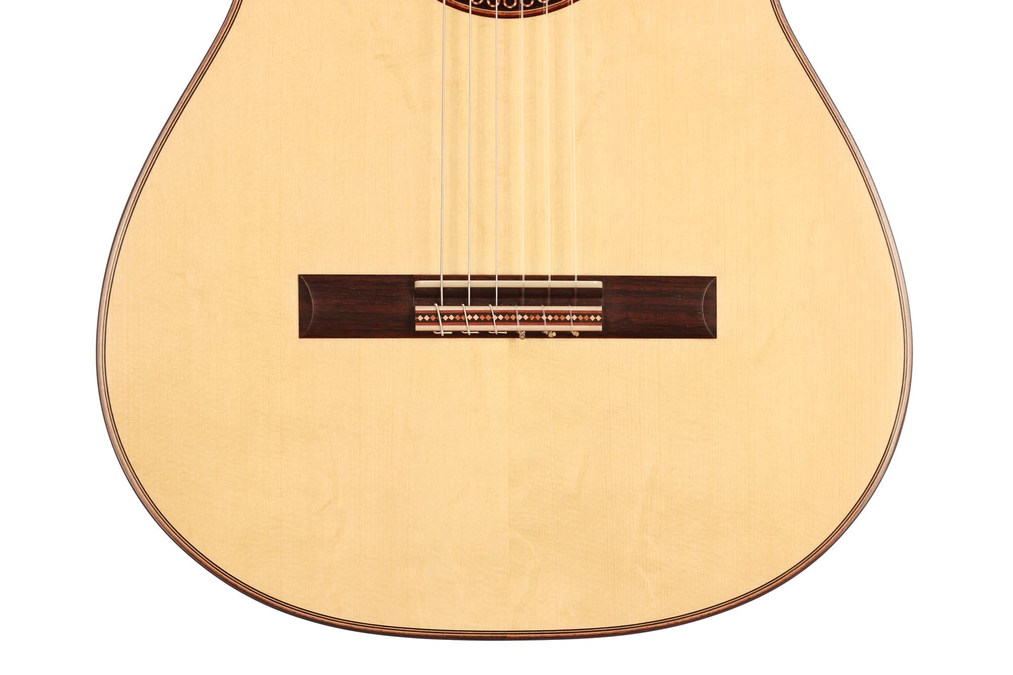 What an incredible guitar! This instrument, built on the model of José Luis Romanillos' guitars, is amazingly faithful to the style of the great master. This guitar shows an extraordinary know-how, both in terms of marquetry and acoustic properties. It is perfect in every detail. The beauty of the wood is underlined by the purity of the French varnish and by the elegance of the Rodgers silver tuners. It is a very light and spontaneous guitar with a brilliant endless sound that offers a fantastic playing ease. The subtlety of the sound colours and the timelessness of its timbre place this guitar at the highest level of contemporary lutherie.