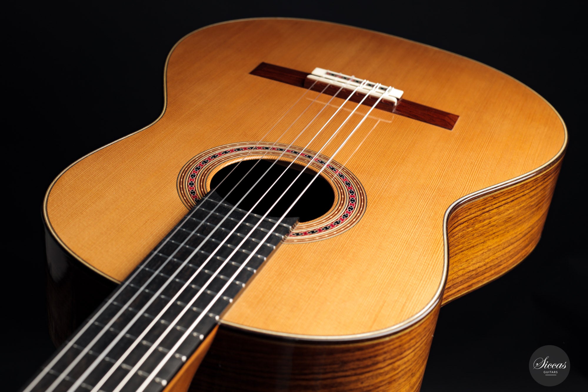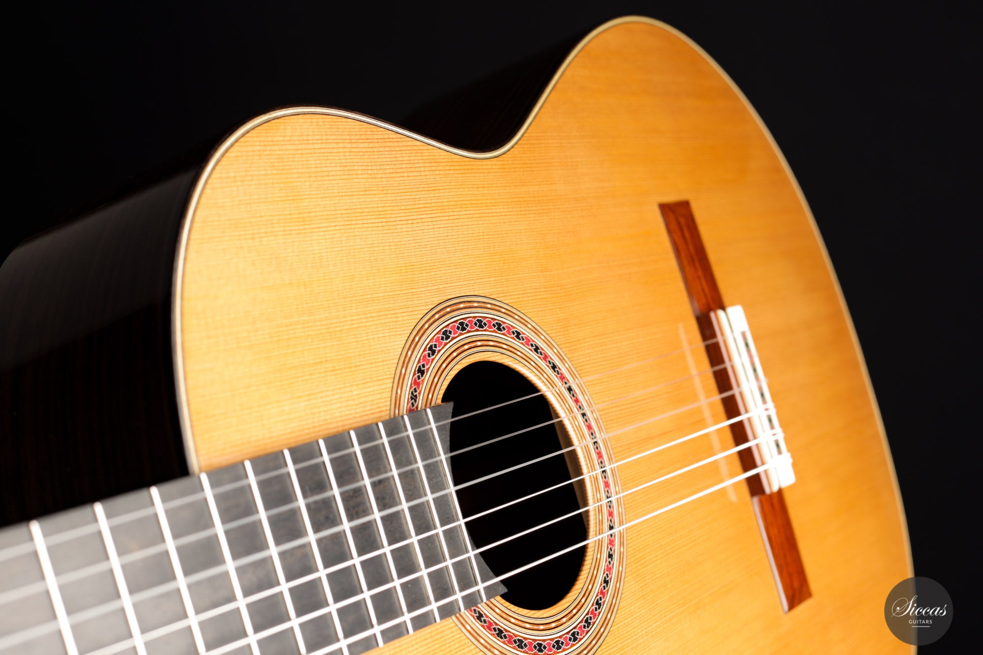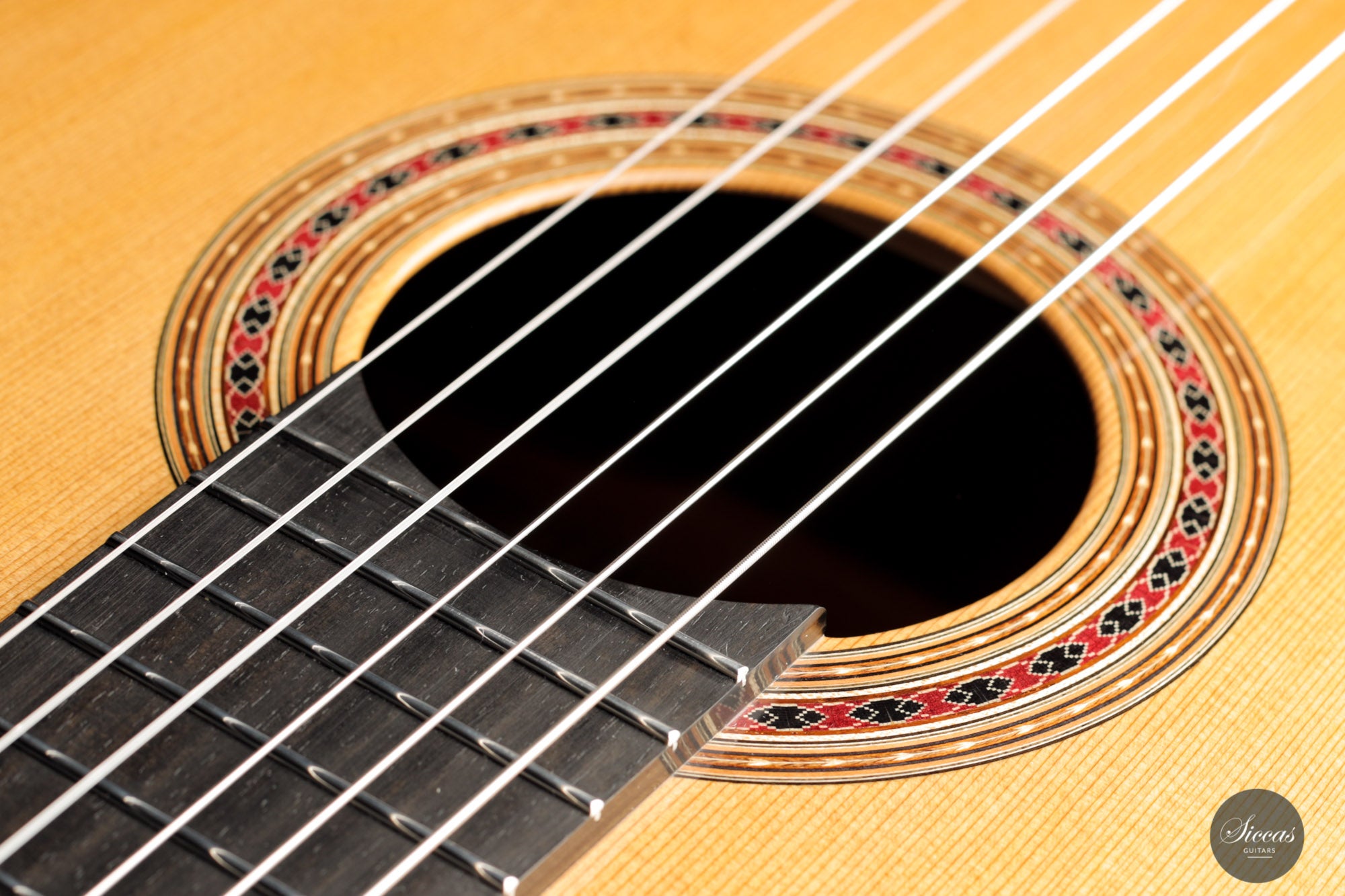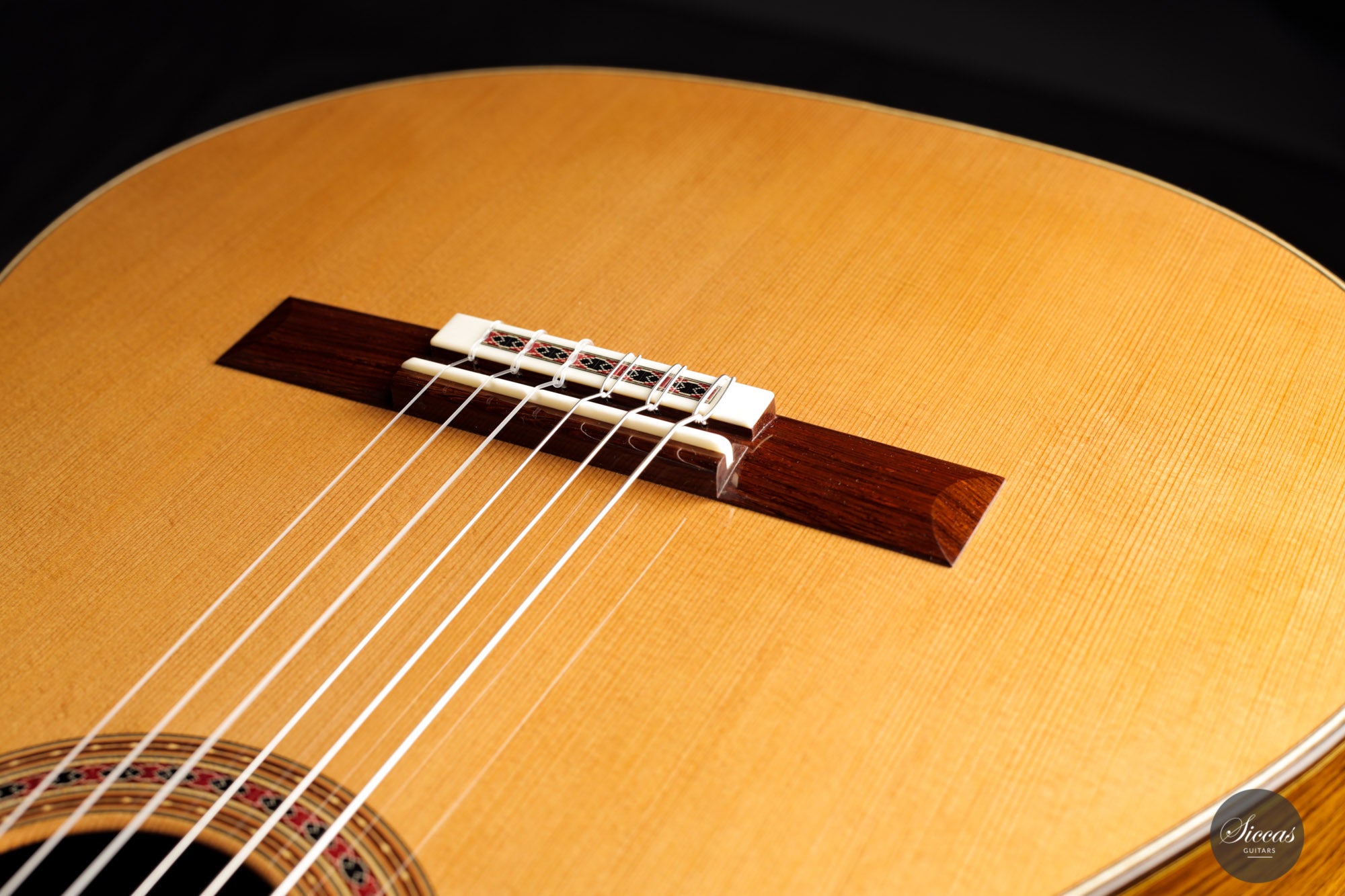 Diese besondere Gitarre, die 2018 gebaut wurde, ist auf jeden Fall ein außergewöhnliches Instrument. Diese "Hommage à Daniel Friederich" ist ein Wunder an Klang und Handwerkskunst. Bis ins kleinste Detail ist sie einer Gitarre des großen Pariser Meisters aus dem Jahr 1999 nachempfunden und ist sie ein wahres Meisterwerk. Auf den ersten Blick hat man das Gefühl, eine fast nagelneue Friederich mit nur wenigen Spielspuren zu sehen. Wenn man die Gitarre in die Hand nimmt und spielt, bestätigt sich der erste Eindruck, und der Eindruck ist vollkommen. Für den Gitarristen, der einer Friederich aus Zedernholz der 90er Jahre so nahe wie möglich kommen möchte, ist dieses Instrument genau das, was er schon immer gescuht hat. Und an Michel Belair möchten wir sagen: Chapeau!