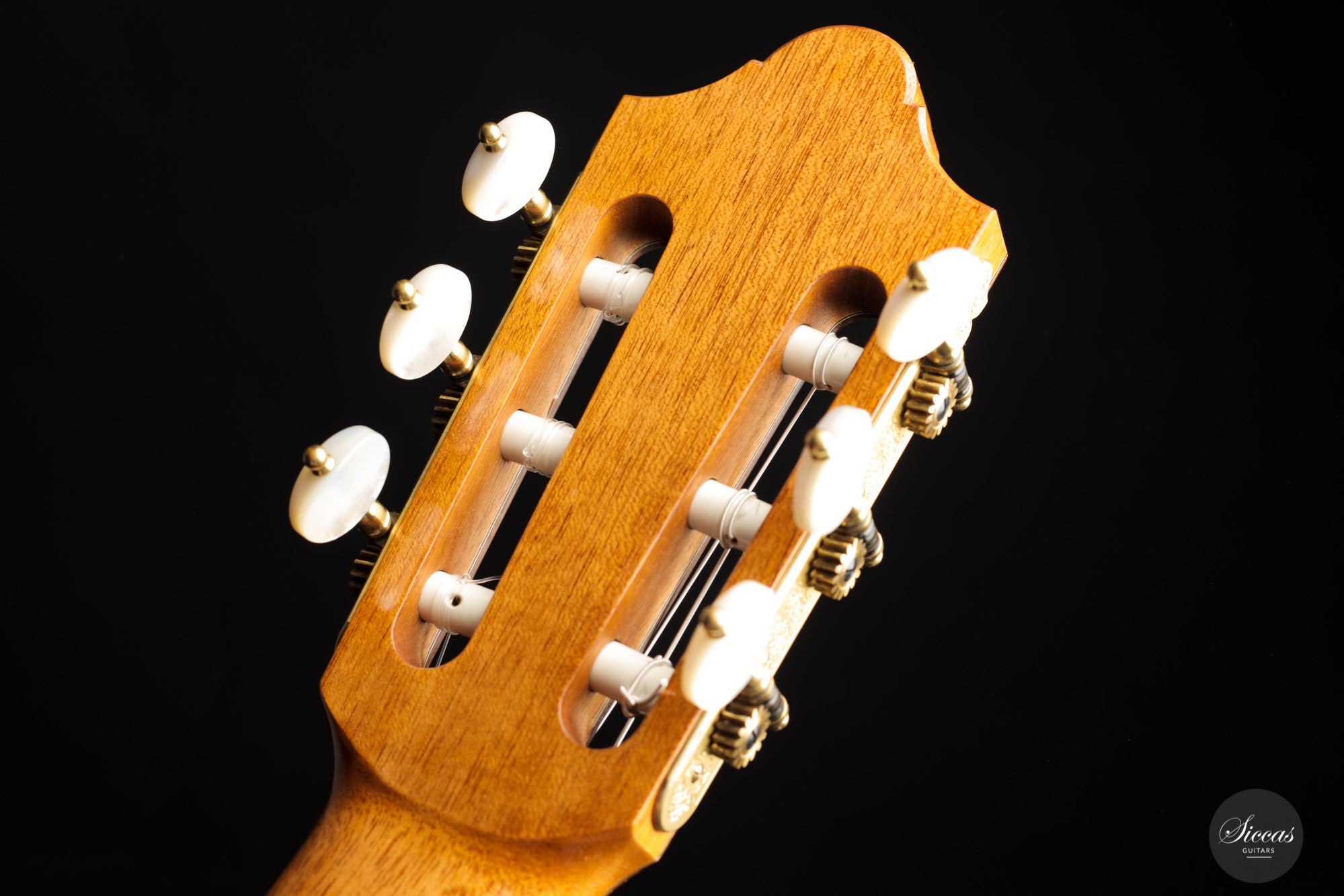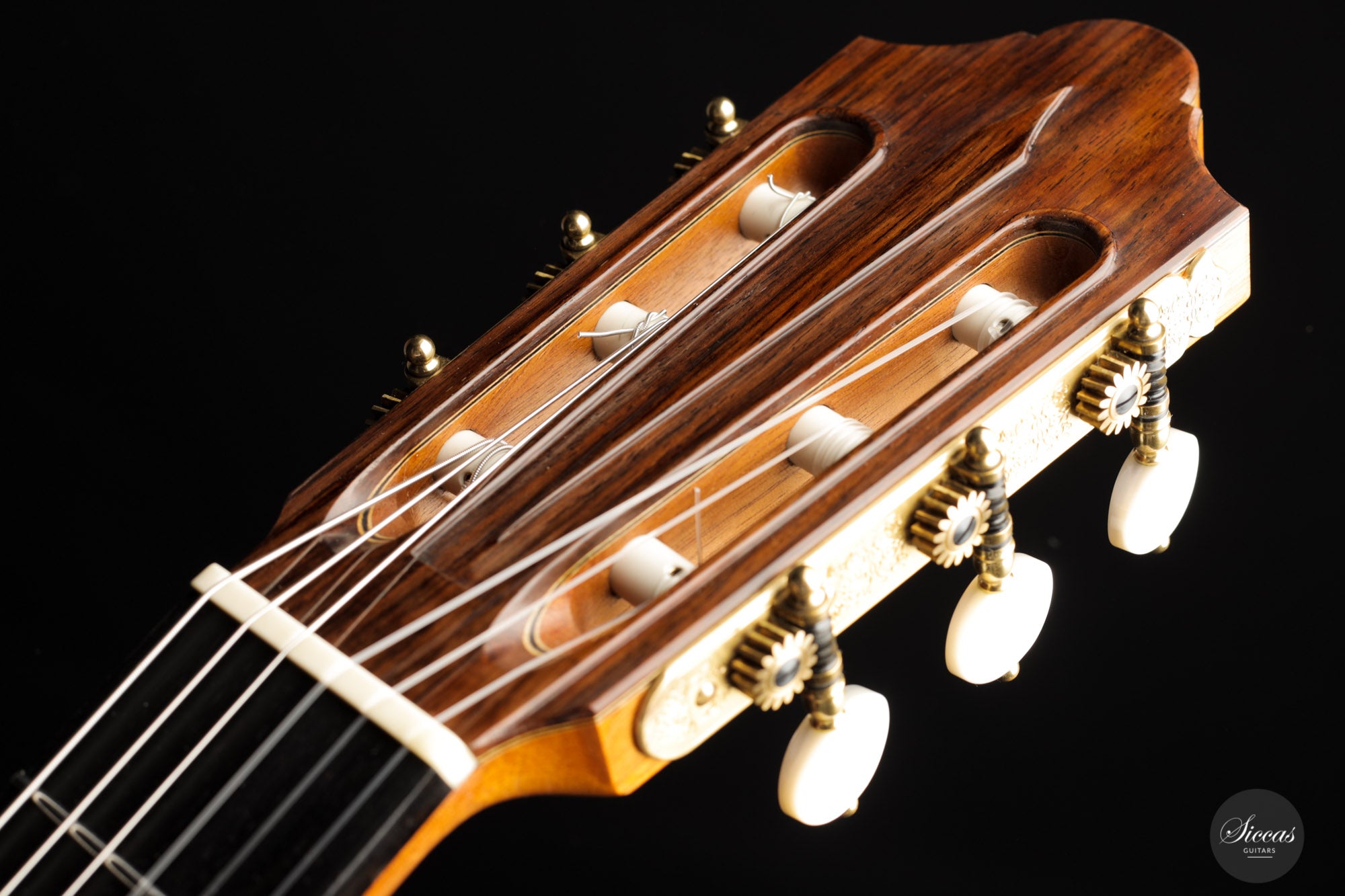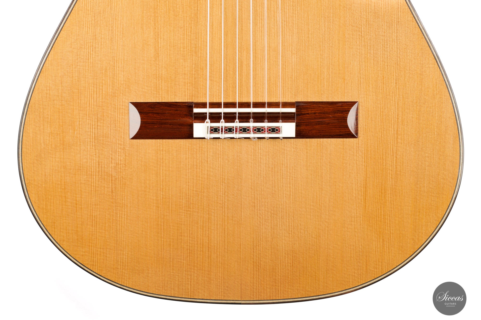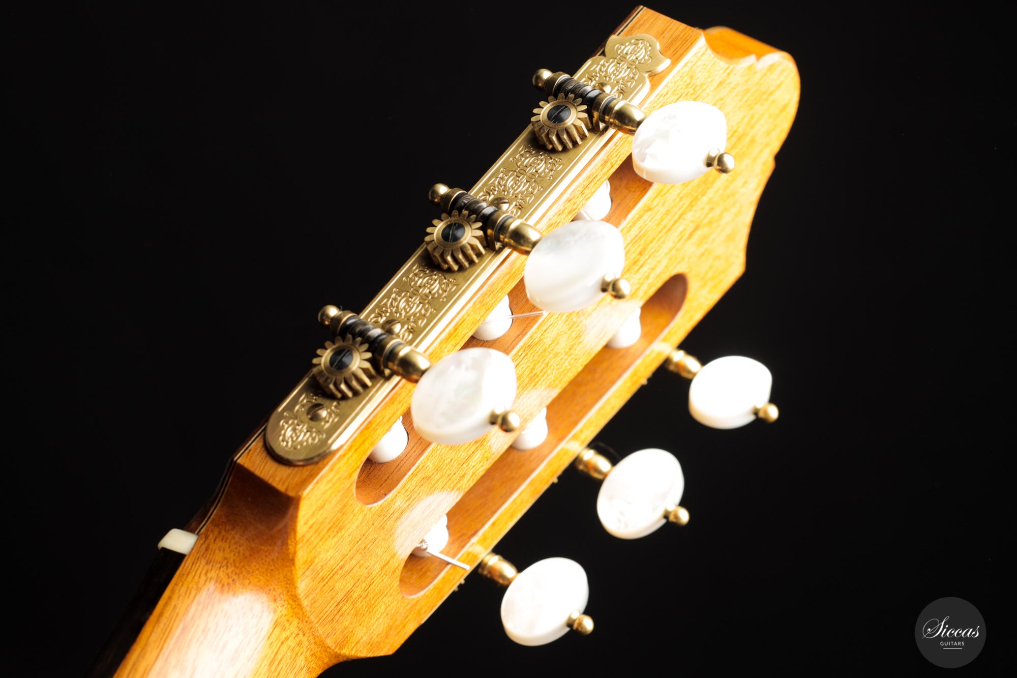 Diese besondere Gitarre, die 2018 gebaut wurde, ist auf jeden Fall ein außergewöhnliches Instrument. Diese "Hommage à Daniel Friederich" ist ein Wunder an Klang und Handwerkskunst. Bis ins kleinste Detail ist sie einer Gitarre des großen Pariser Meisters aus dem Jahr 1999 nachempfunden und ist sie ein wahres Meisterwerk. Auf den ersten Blick hat man das Gefühl, eine fast nagelneue Friederich mit nur wenigen Spielspuren zu sehen. Wenn man die Gitarre in die Hand nimmt und spielt, bestätigt sich der erste Eindruck, und der Eindruck ist vollkommen. Für den Gitarristen, der einer Friederich aus Zedernholz der 90er Jahre so nahe wie möglich kommen möchte, ist dieses Instrument genau das, was er schon immer gescuht hat. Und an Michel Belair möchten wir sagen: Chapeau!