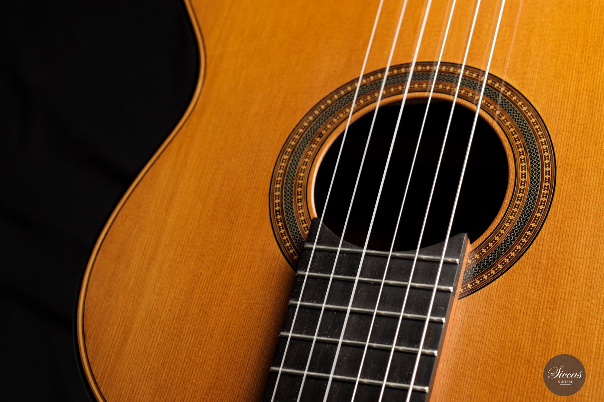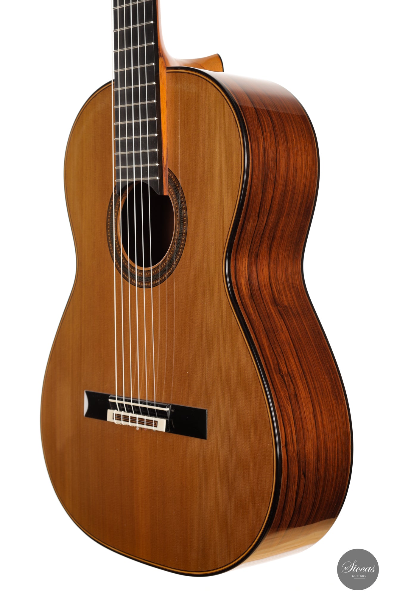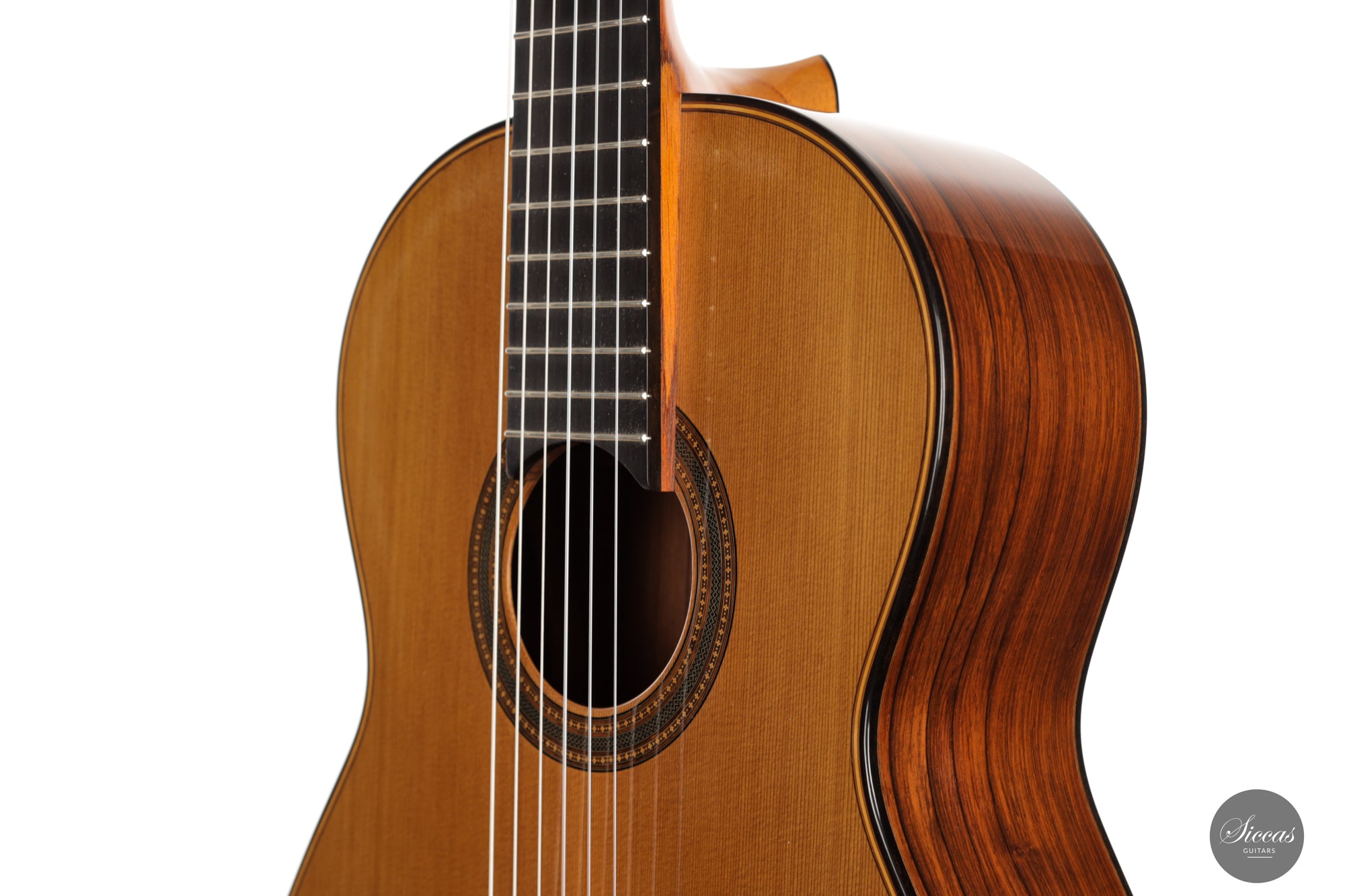 Ästhetisch gesehen ist zwar ein kleiner Haarriss auf dem Rücken aus Madagaskar-Palisander vorhanden, doch dies mindert nicht den allgemeinen Reiz der Gitarre. Darüber hinaus zeigt das Instrument nur oberflächliche Spielspuren, was auf seine geschätzte Geschichte hinweist und eine glänzende Zukunft verspricht. Für diejenigen mit anspruchsvollem Geschmack und Wertschätzung für erstklassige Handwerkskunst ist diese Kreation von Michel Brück nichts weniger als ein Meisterwerk.