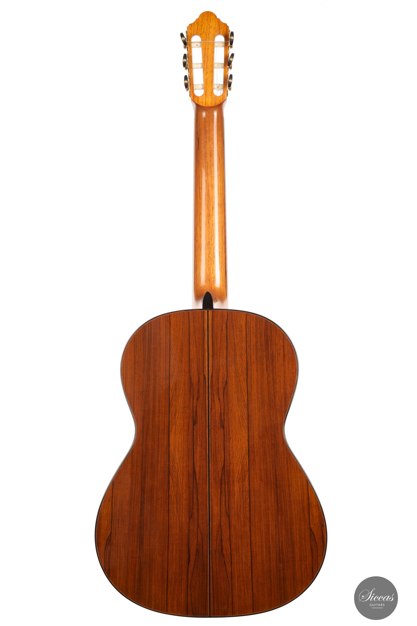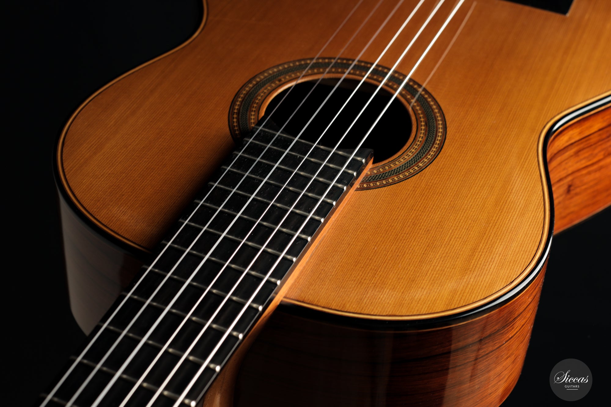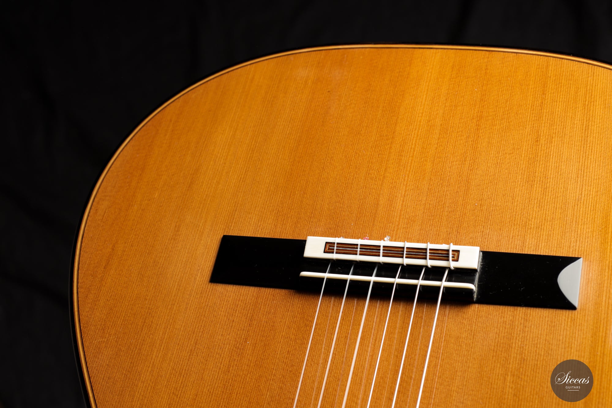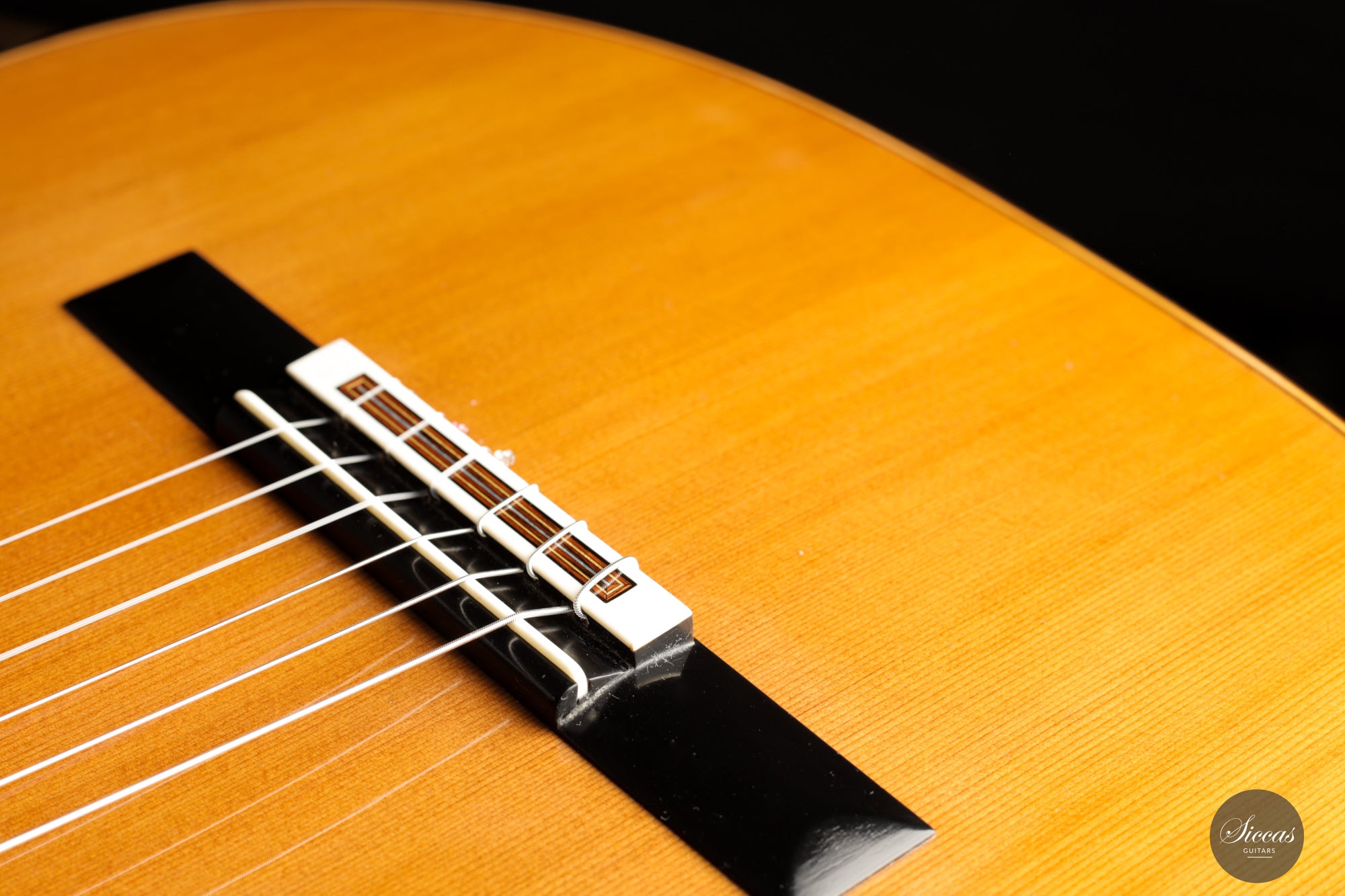 Ästhetisch gesehen ist zwar ein kleiner Haarriss auf dem Rücken aus Madagaskar-Palisander vorhanden, doch dies mindert nicht den allgemeinen Reiz der Gitarre. Darüber hinaus zeigt das Instrument nur oberflächliche Spielspuren, was auf seine geschätzte Geschichte hinweist und eine glänzende Zukunft verspricht. Für diejenigen mit anspruchsvollem Geschmack und Wertschätzung für erstklassige Handwerkskunst ist diese Kreation von Michel Brück nichts weniger als ein Meisterwerk.