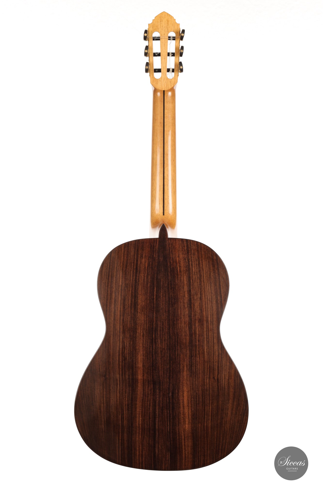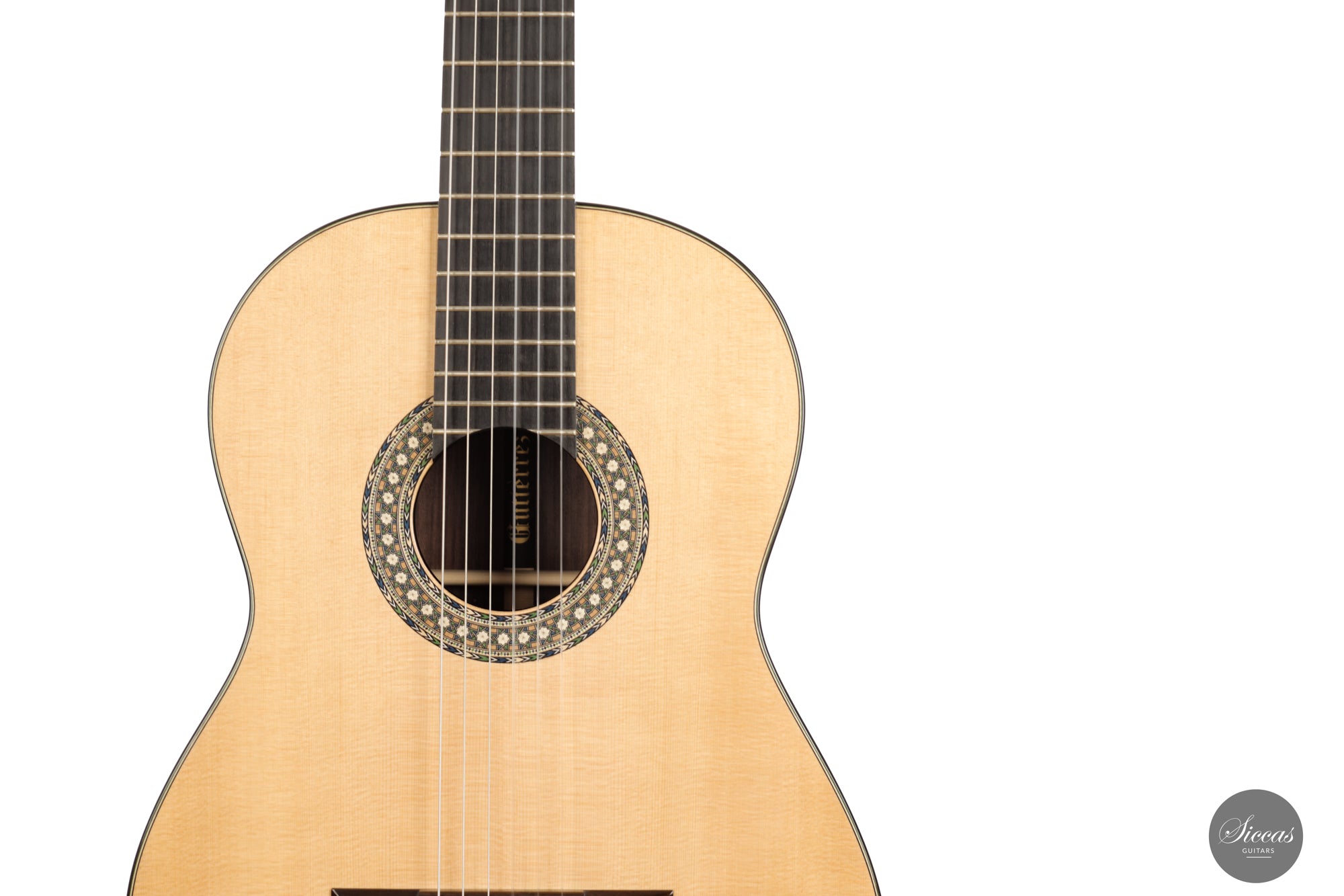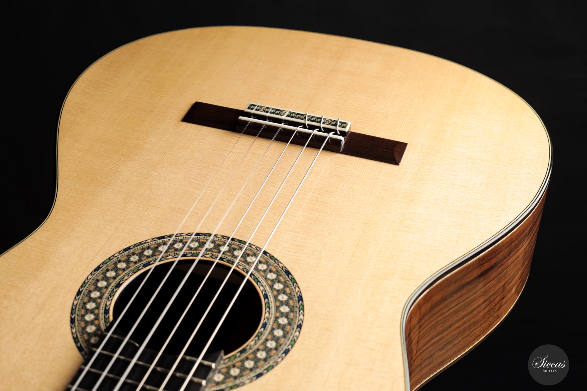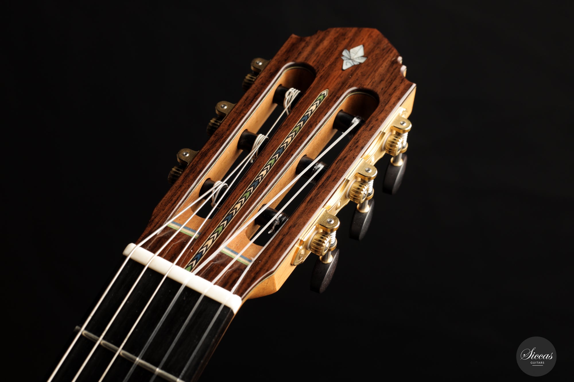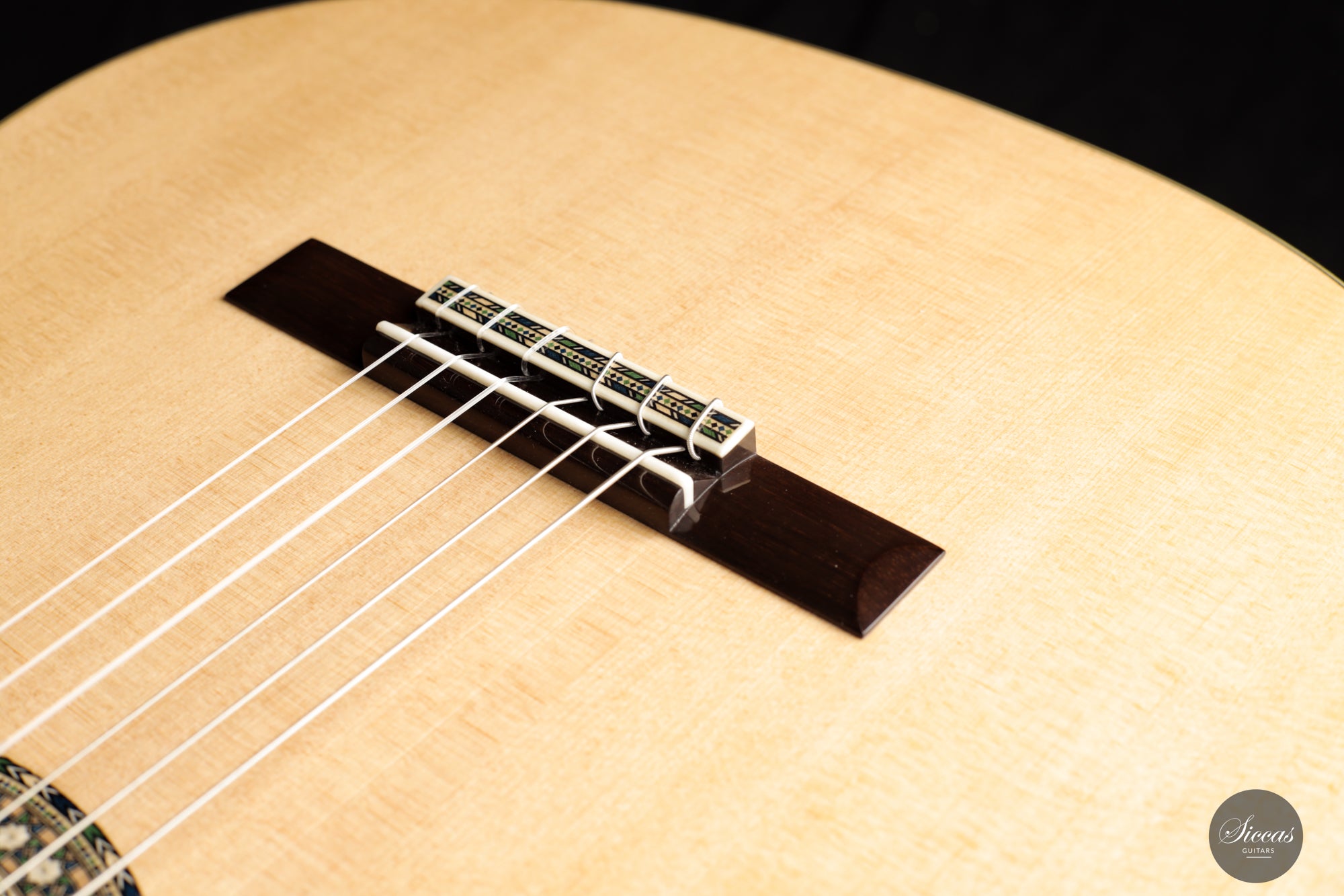 Dieses wunderbare Instrument aus dem Jahr 2022 wurde mit einer Fichtendecke mit Gitterverstrebungen (Lattice) gebaut. Ästhetisch ist sie stark von der maurischen Kunst inspiriert, wie sie in den Ornamenten der Alhambra in Granada, Spanien, dargestellt ist. Das prächtige und farbenreiche geometrische Mosaik der Rosette verleiht diesem Instrument ein einzigartiges Erscheinungsbild und lässt Miguel Angels meisterliche Kunstfertigkeit erkennen. Die Ansprache und das Klangvolumen dieses Modells sowie die 65 cm Mensur und der 52 mm Sattel machen es zu einer hervorragenden Konzertgitarre, welche für die meisten Gitarristen geeignet ist und einen fantastischen Spielkomfort sowie einen eleganten, tragenden Gesamtklang mit sich bringt.