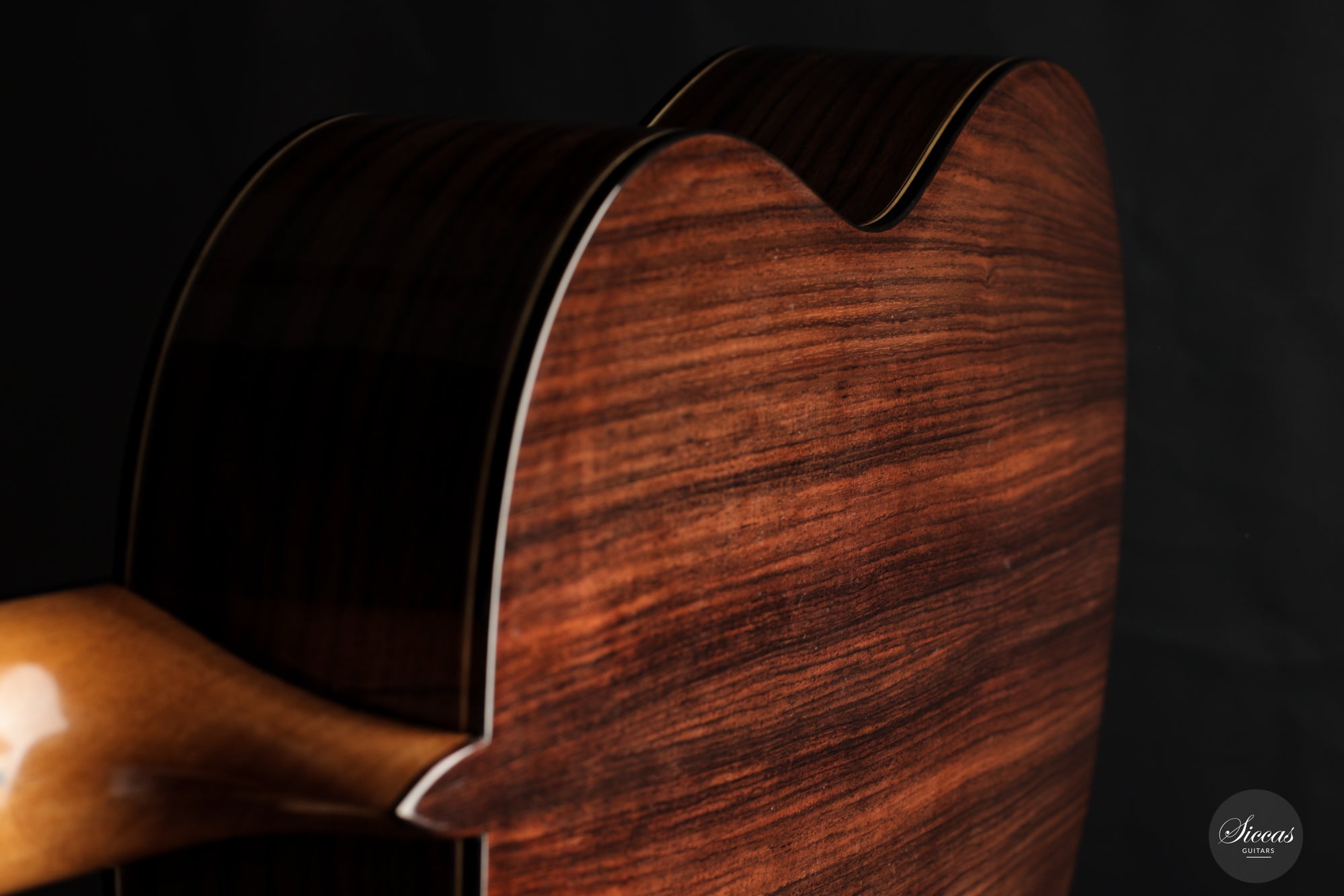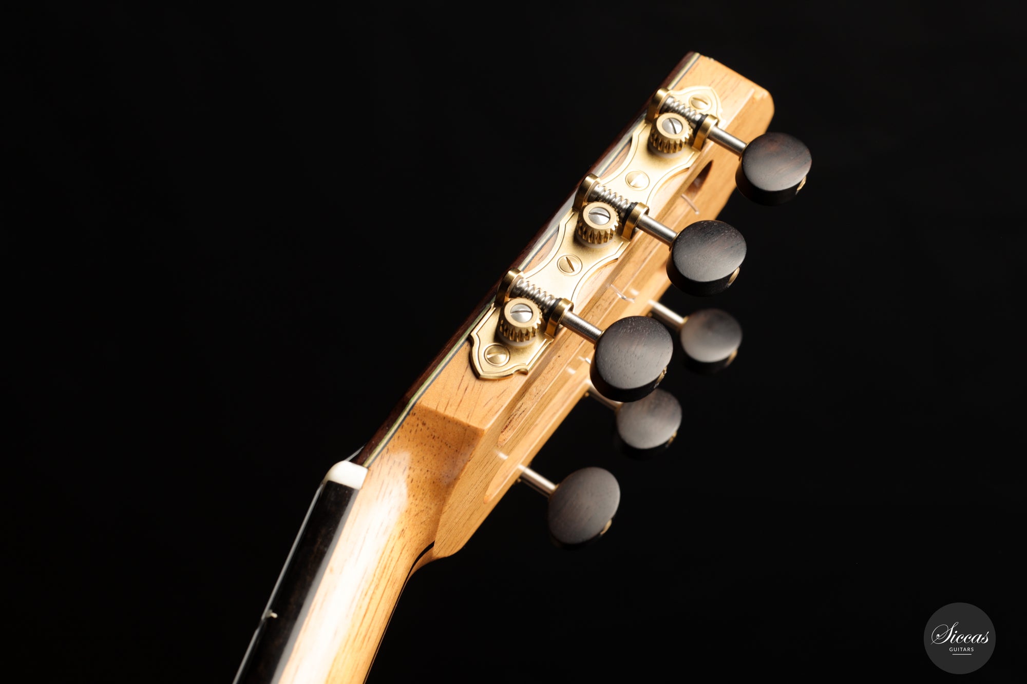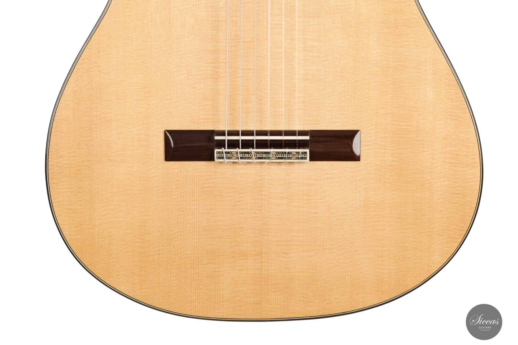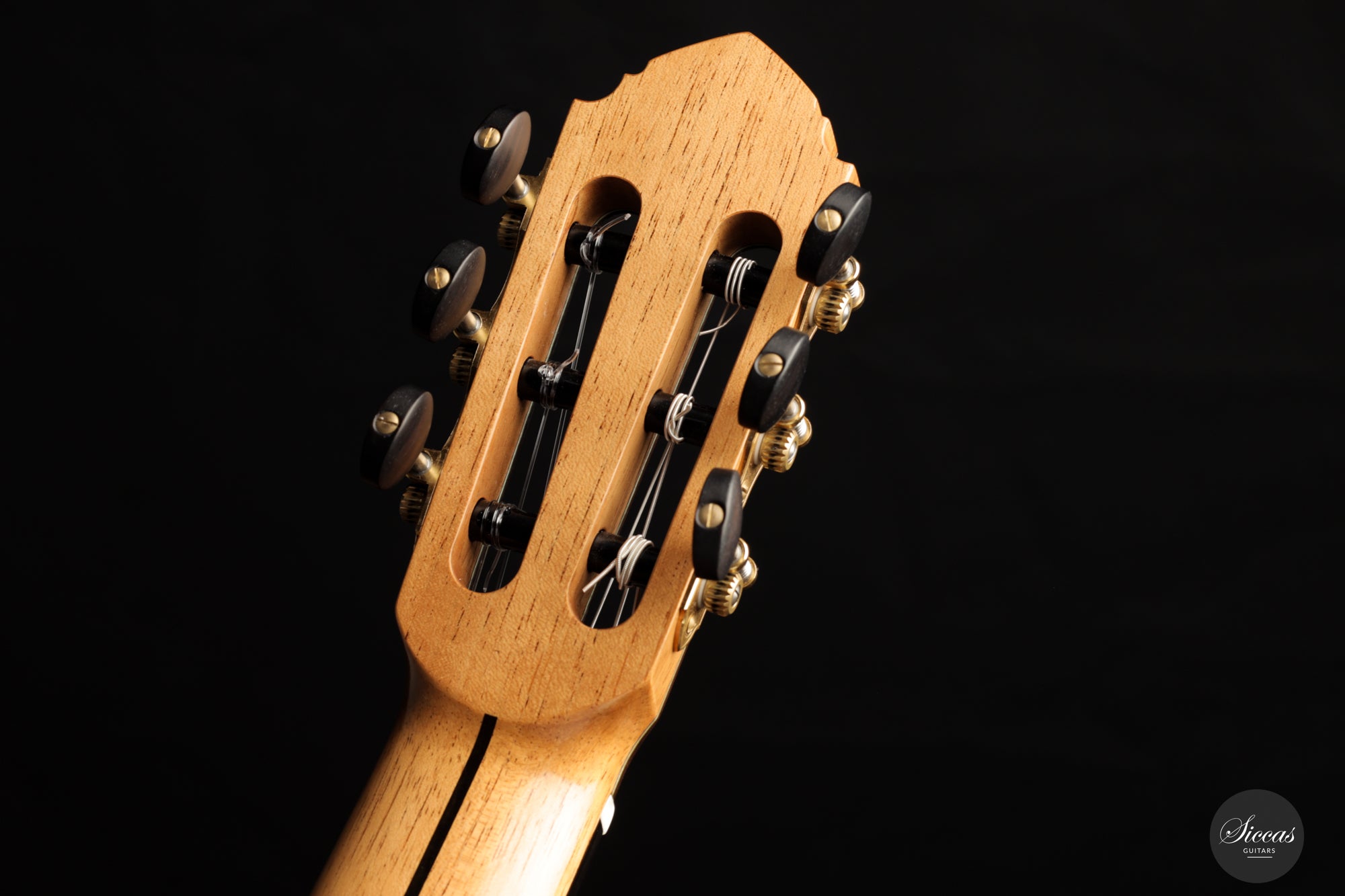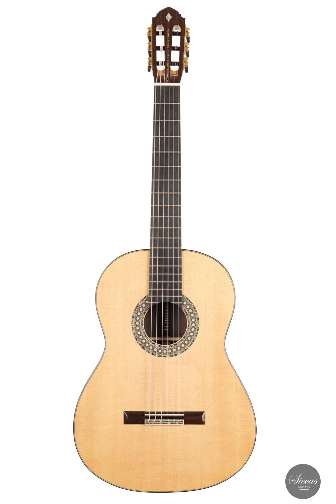 Dieses wunderbare Instrument aus dem Jahr 2022 wurde mit einer Fichtendecke mit Gitterverstrebungen (Lattice) gebaut. Ästhetisch ist sie stark von der maurischen Kunst inspiriert, wie sie in den Ornamenten der Alhambra in Granada, Spanien, dargestellt ist. Das prächtige und farbenreiche geometrische Mosaik der Rosette verleiht diesem Instrument ein einzigartiges Erscheinungsbild und lässt Miguel Angels meisterliche Kunstfertigkeit erkennen. Die Ansprache und das Klangvolumen dieses Modells sowie die 65 cm Mensur und der 52 mm Sattel machen es zu einer hervorragenden Konzertgitarre, welche für die meisten Gitarristen geeignet ist und einen fantastischen Spielkomfort sowie einen eleganten, tragenden Gesamtklang mit sich bringt.