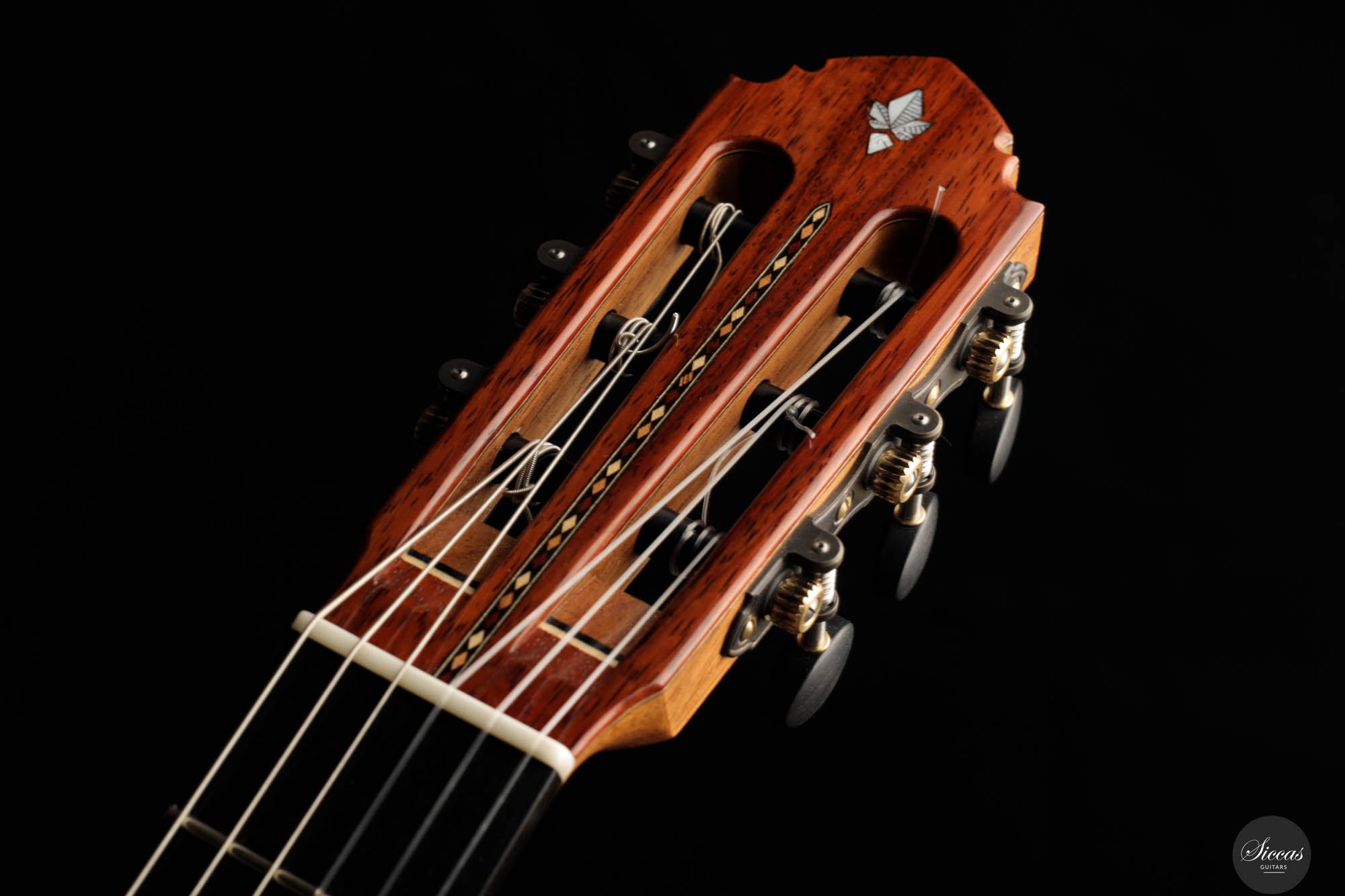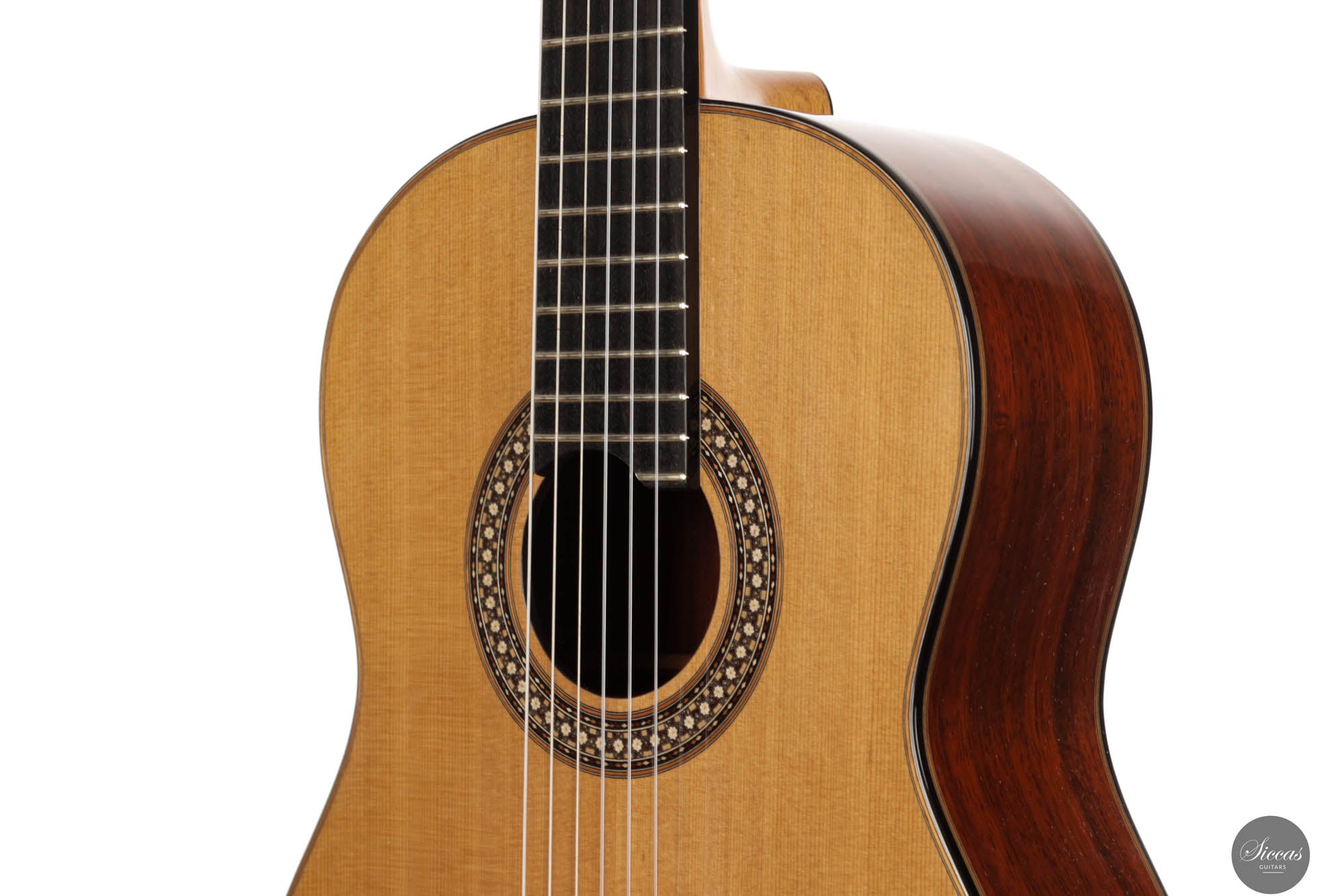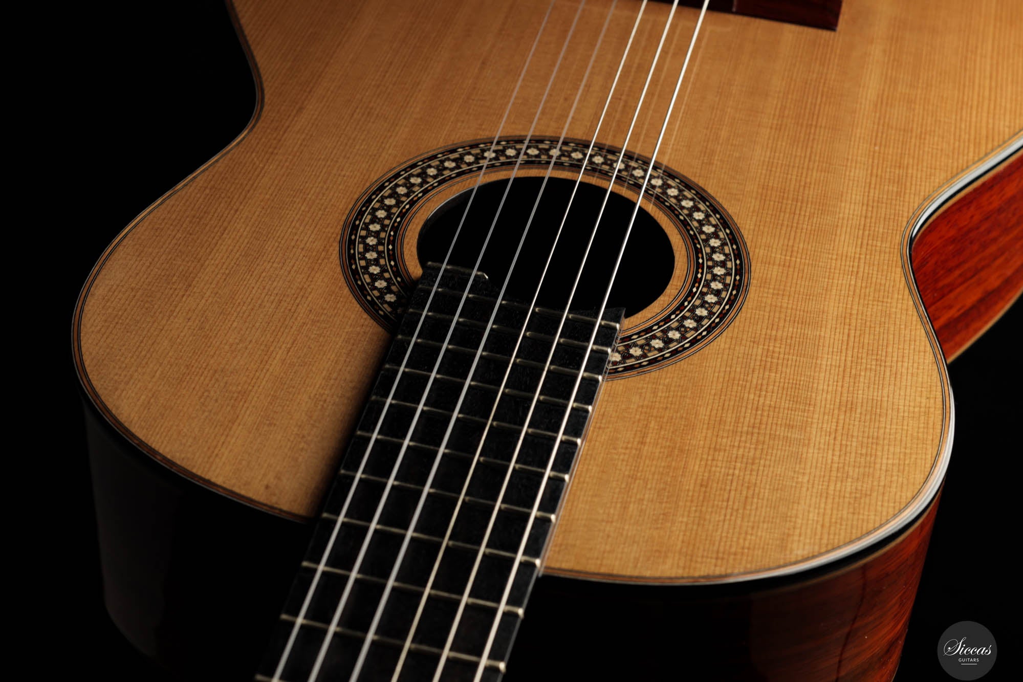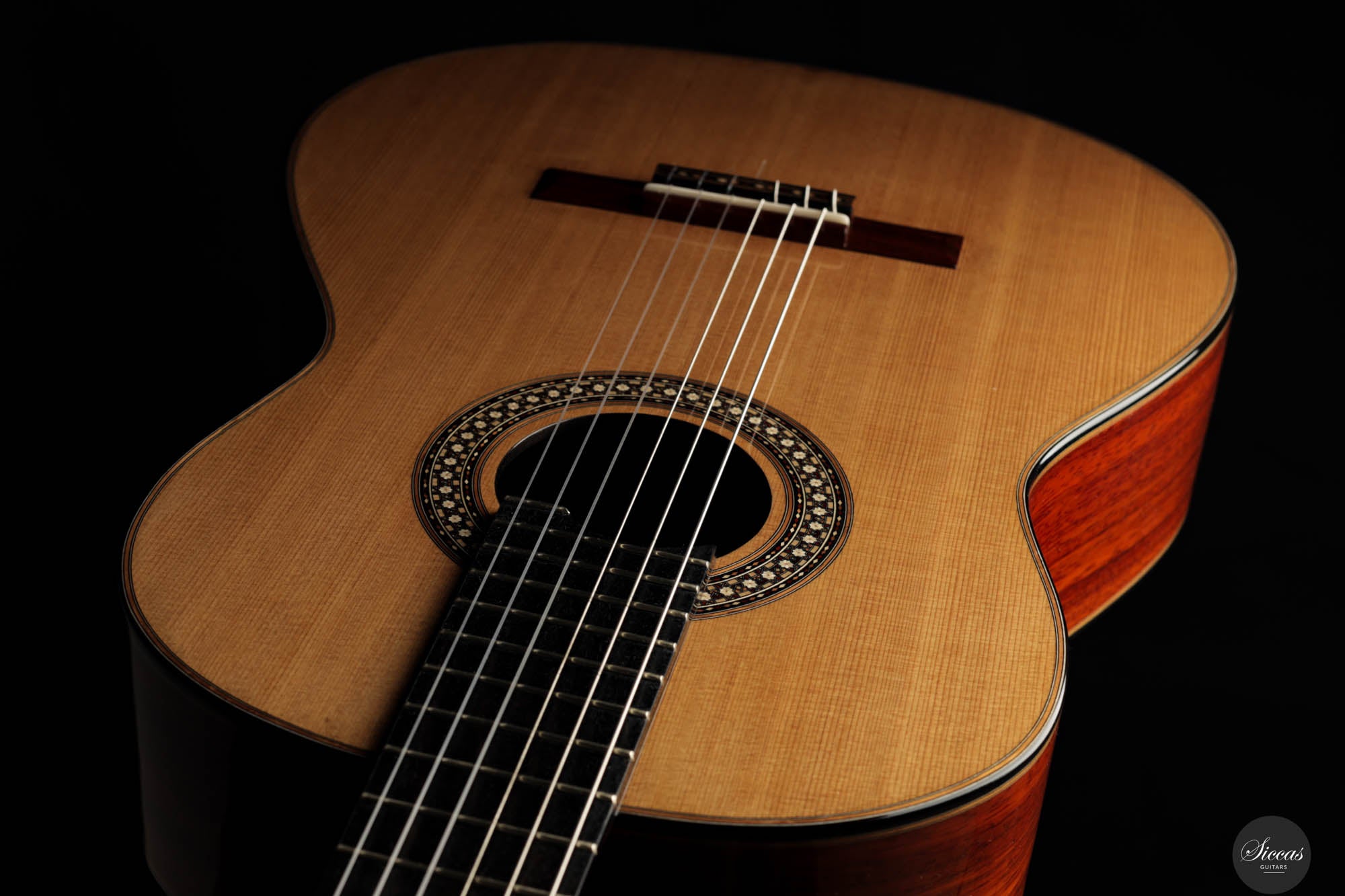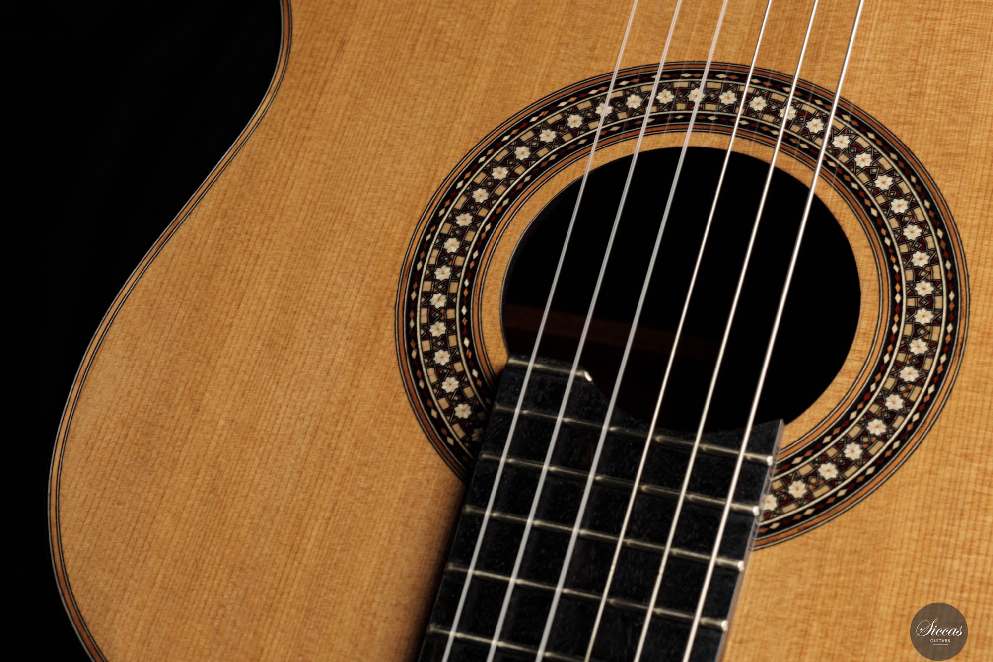 The 2024 Limited Edition crafted by Miguel is an exquisite manifestation of luthiery, merging traditional materials with a nuanced artistic sensibility. The guitar features a resonant cedar soundboard paired harmoniously with padouk for the back, sides, and bridge, enriching the instrument’s sonic depth with its striking visual presence. The ebony fingerboard and cedar neck refine the tactile experience, enhancing the fluid playability. The intricate marquetry on the headstock veneer, rosette, profiles, and bridge captivates the eye, featuring an elegant interplay of natural hues that form interlocking diamonds and a central mosaic of nasrid stars, a homage to historical artistry.