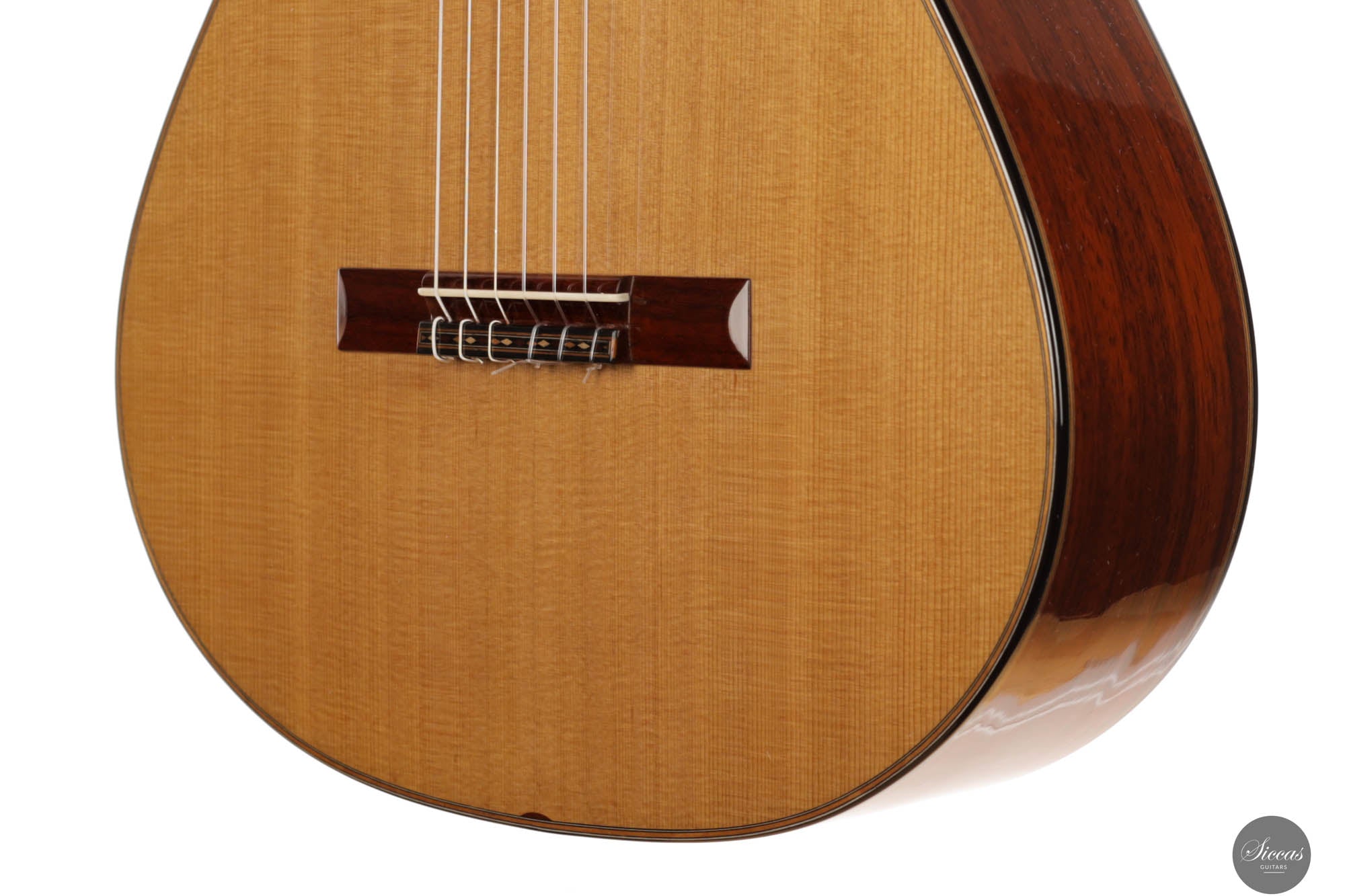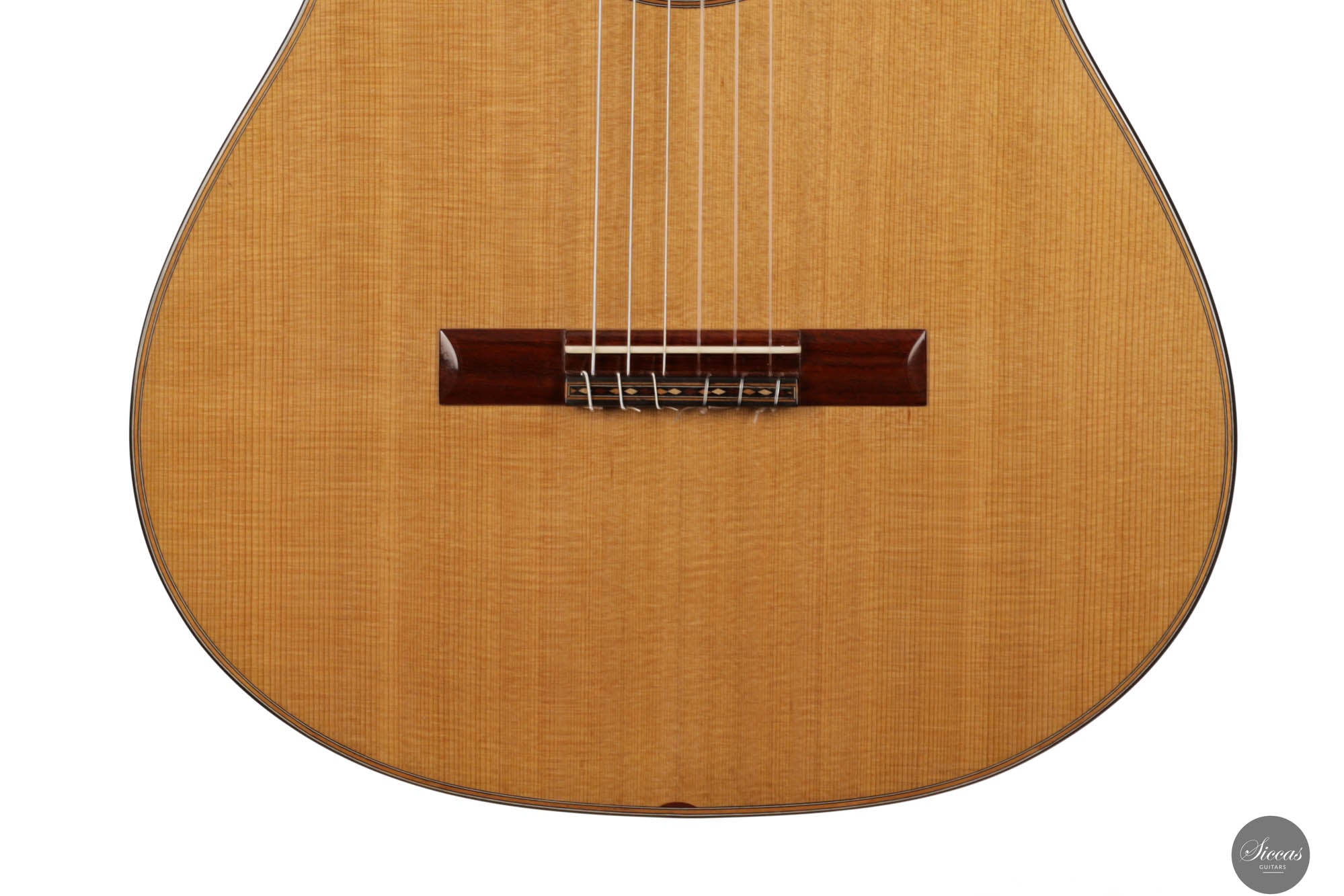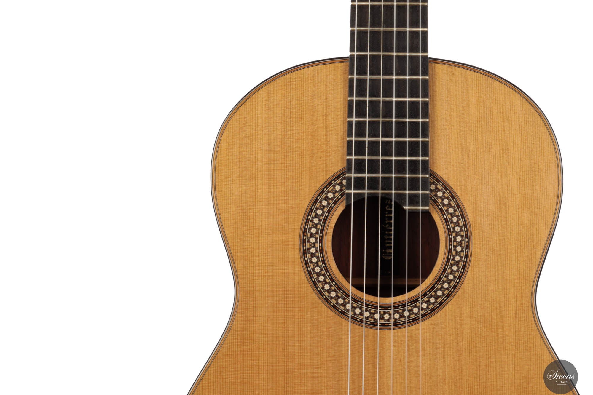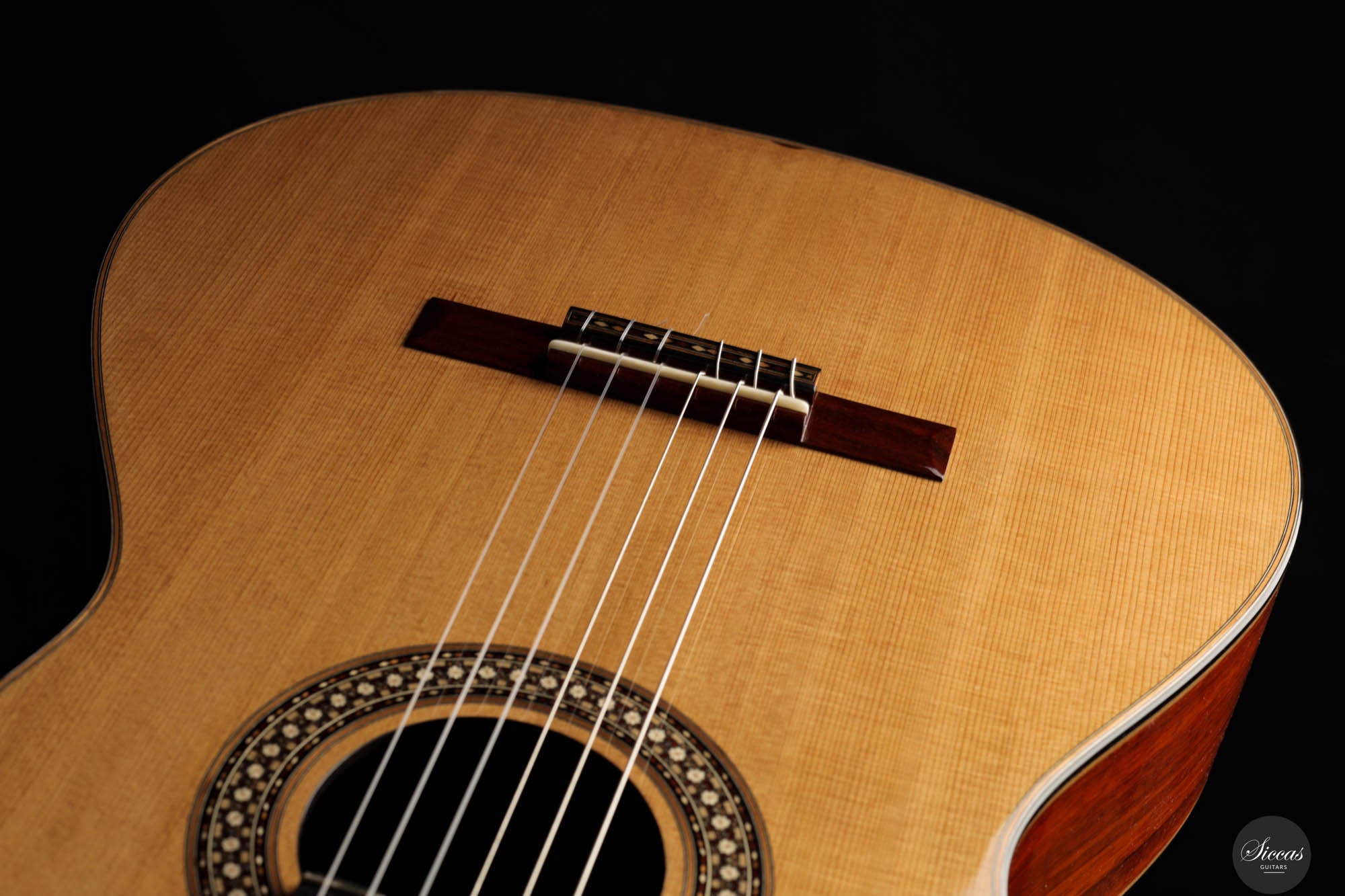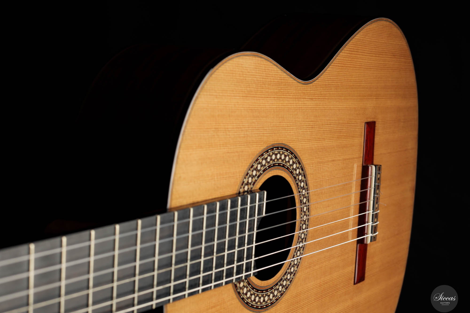 The 2024 Limited Edition crafted by Miguel is an exquisite manifestation of luthiery, merging traditional materials with a nuanced artistic sensibility. The guitar features a resonant cedar soundboard paired harmoniously with padouk for the back, sides, and bridge, enriching the instrument’s sonic depth with its striking visual presence. The ebony fingerboard and cedar neck refine the tactile experience, enhancing the fluid playability. The intricate marquetry on the headstock veneer, rosette, profiles, and bridge captivates the eye, featuring an elegant interplay of natural hues that form interlocking diamonds and a central mosaic of nasrid stars, a homage to historical artistry.