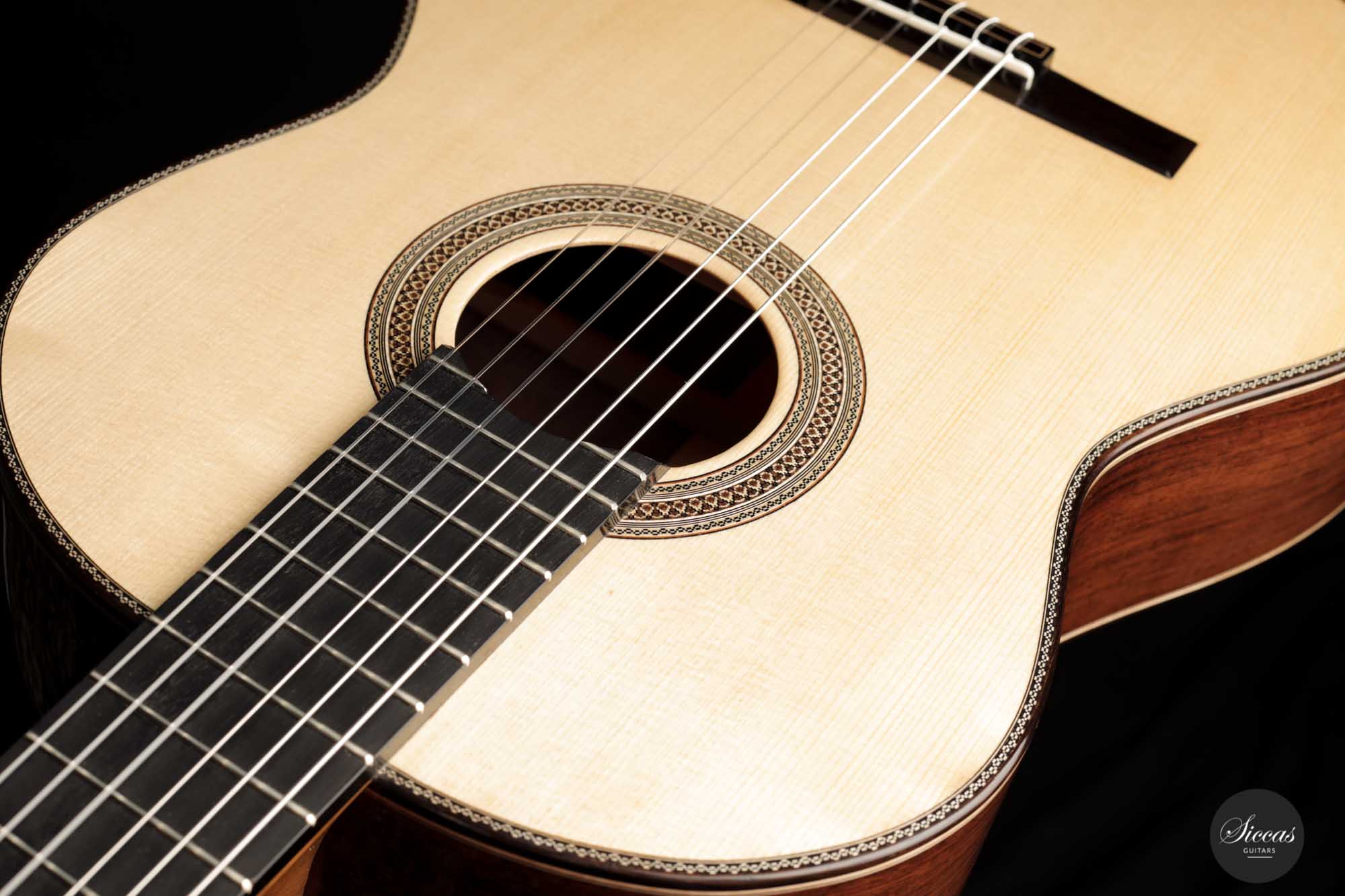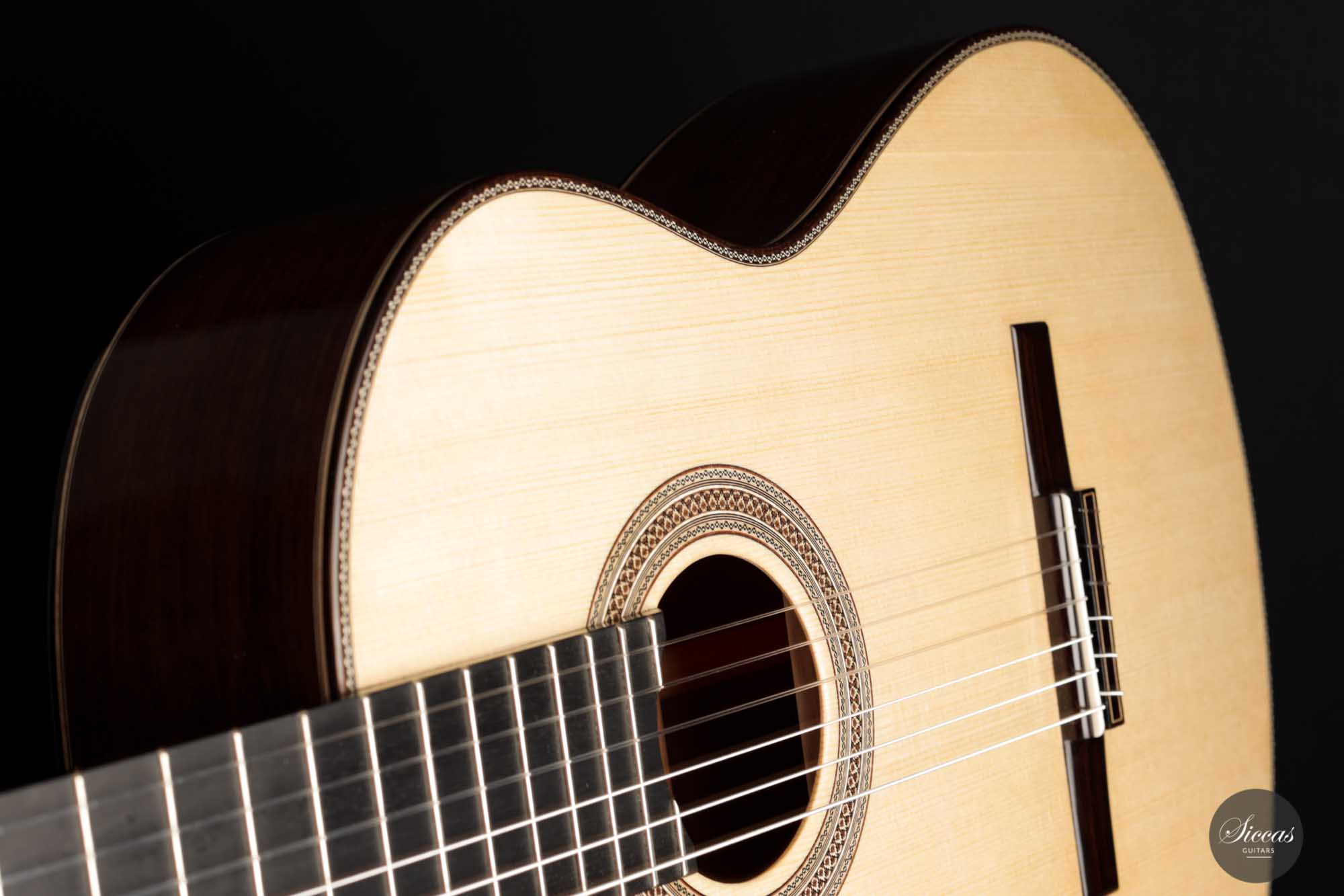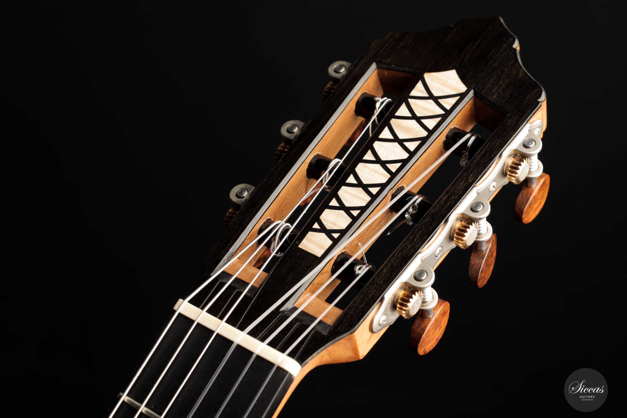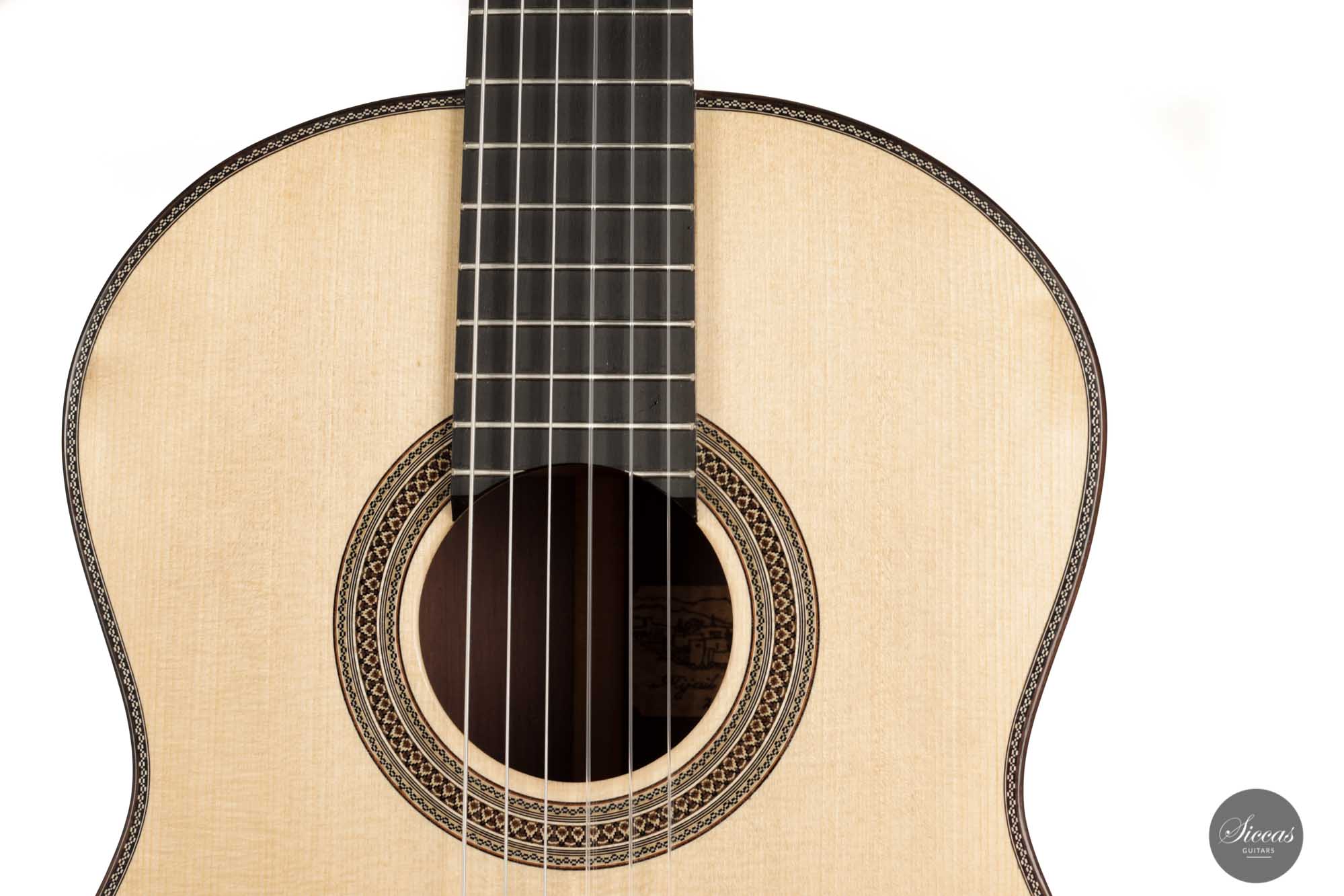 Hier haben wir eine herrliche Gitarre mit 63 cm Mensur und einem schwungvollen spanischen Klang. Diese reich verzierte, brandneue Gitarre kommt direkt aus der Werkstatt von Mijail und zeigt bereits eine große Offenheit im Klang. Der Diskant klingt klar und kraftvoll, unterstützt von selbstbewussten, satten Bässen. Darüber hinaus wird die Bespielbarkeit dank der kürzeren 63cm-Mensur auf ein neues Niveau gehoben, wodurch Streckungen für die linke Hand zum Kinderspiel wird. Gitarren mit einer Mensur von 63 cm sind nicht oft zu finden, und diese hier ist sowohl optisch als auch klanglich bemerkenswert.