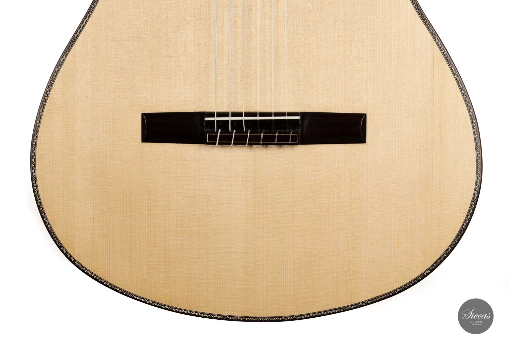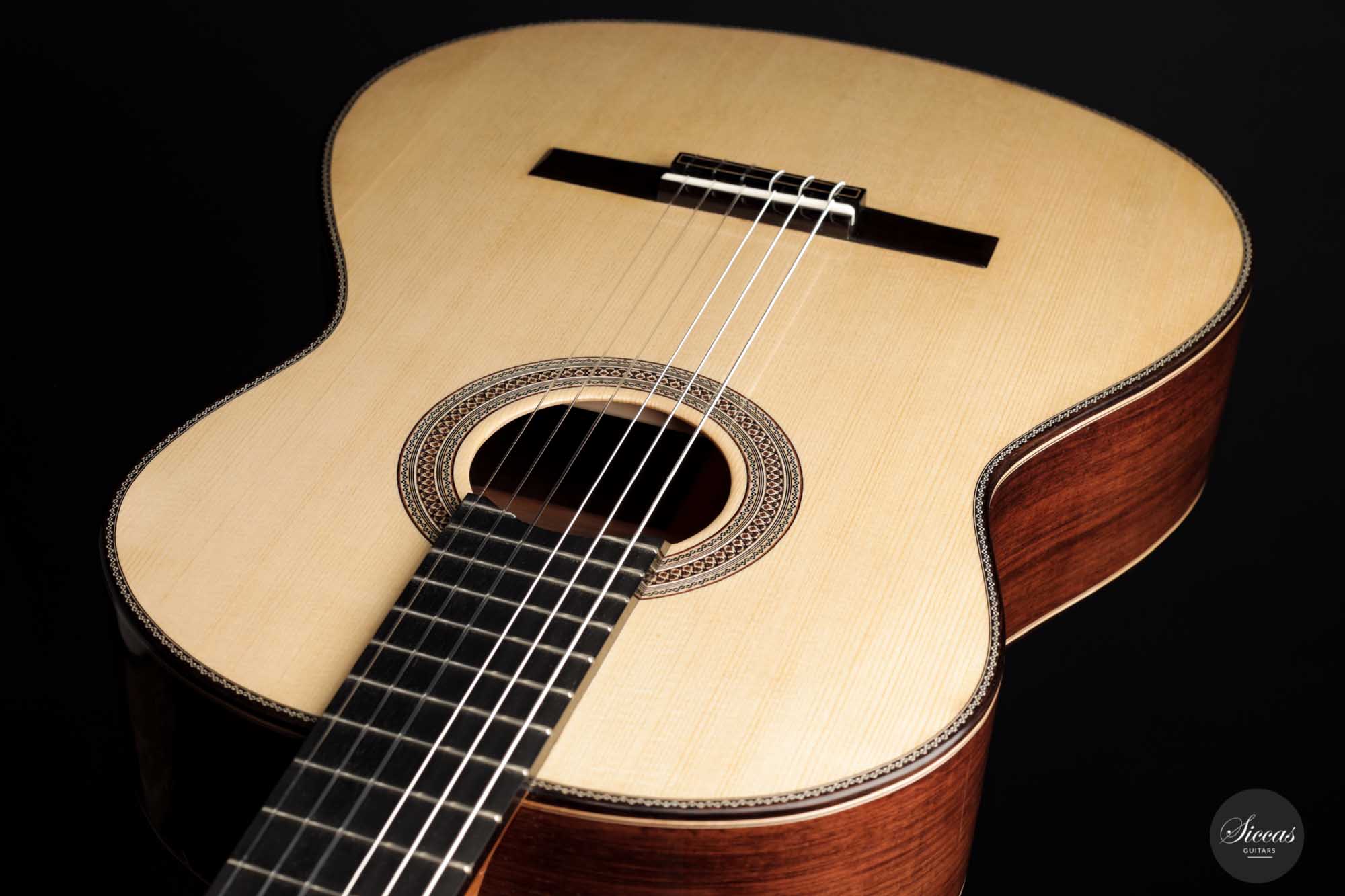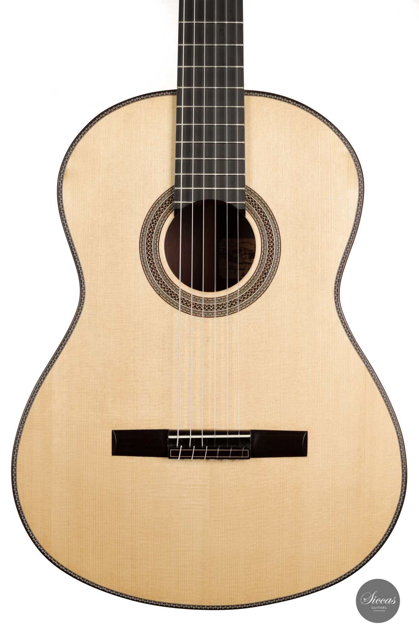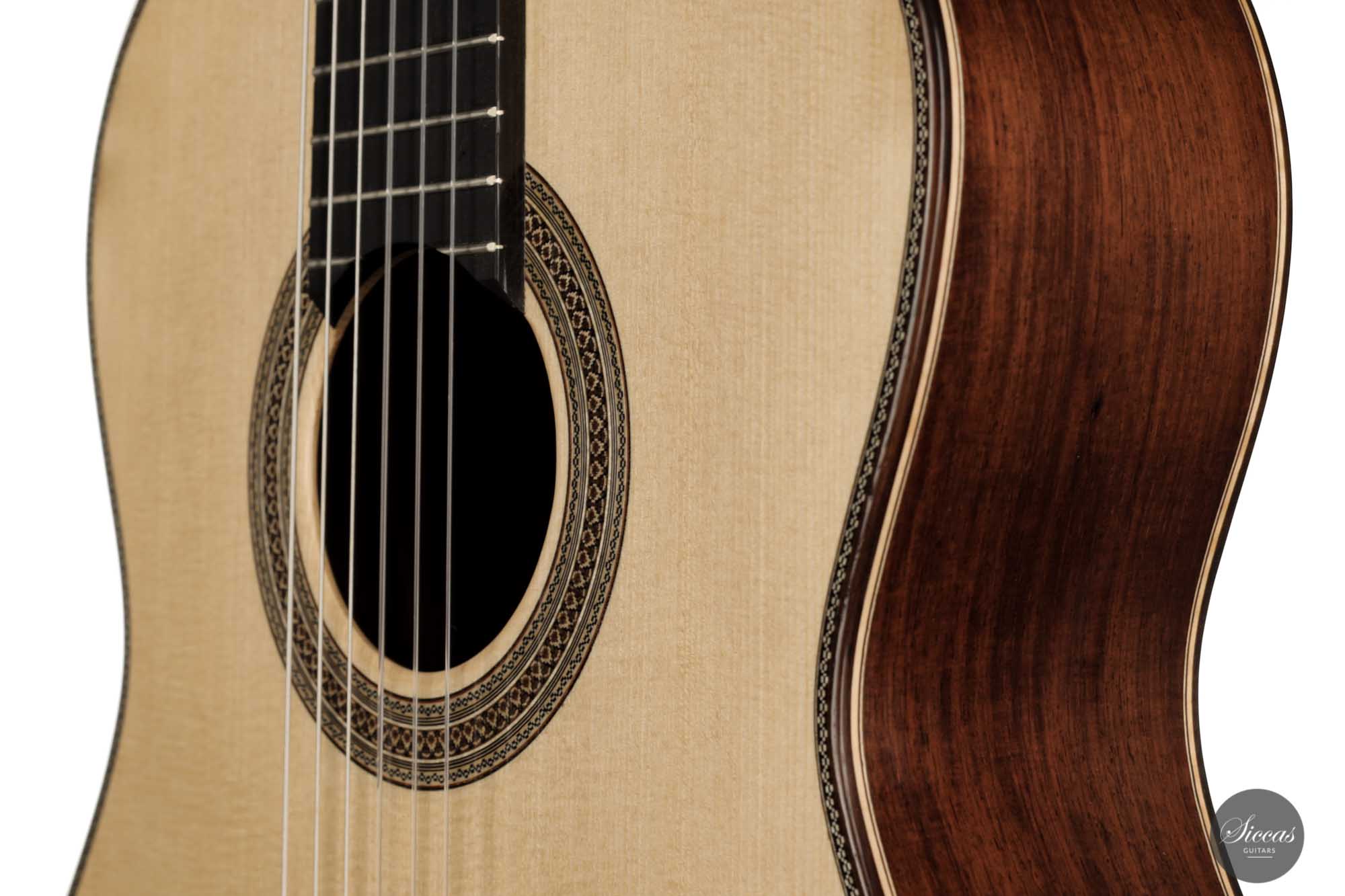 Hier haben wir eine herrliche Gitarre mit 63 cm Mensur und einem schwungvollen spanischen Klang. Diese reich verzierte, brandneue Gitarre kommt direkt aus der Werkstatt von Mijail und zeigt bereits eine große Offenheit im Klang. Der Diskant klingt klar und kraftvoll, unterstützt von selbstbewussten, satten Bässen. Darüber hinaus wird die Bespielbarkeit dank der kürzeren 63cm-Mensur auf ein neues Niveau gehoben, wodurch Streckungen für die linke Hand zum Kinderspiel wird. Gitarren mit einer Mensur von 63 cm sind nicht oft zu finden, und diese hier ist sowohl optisch als auch klanglich bemerkenswert.