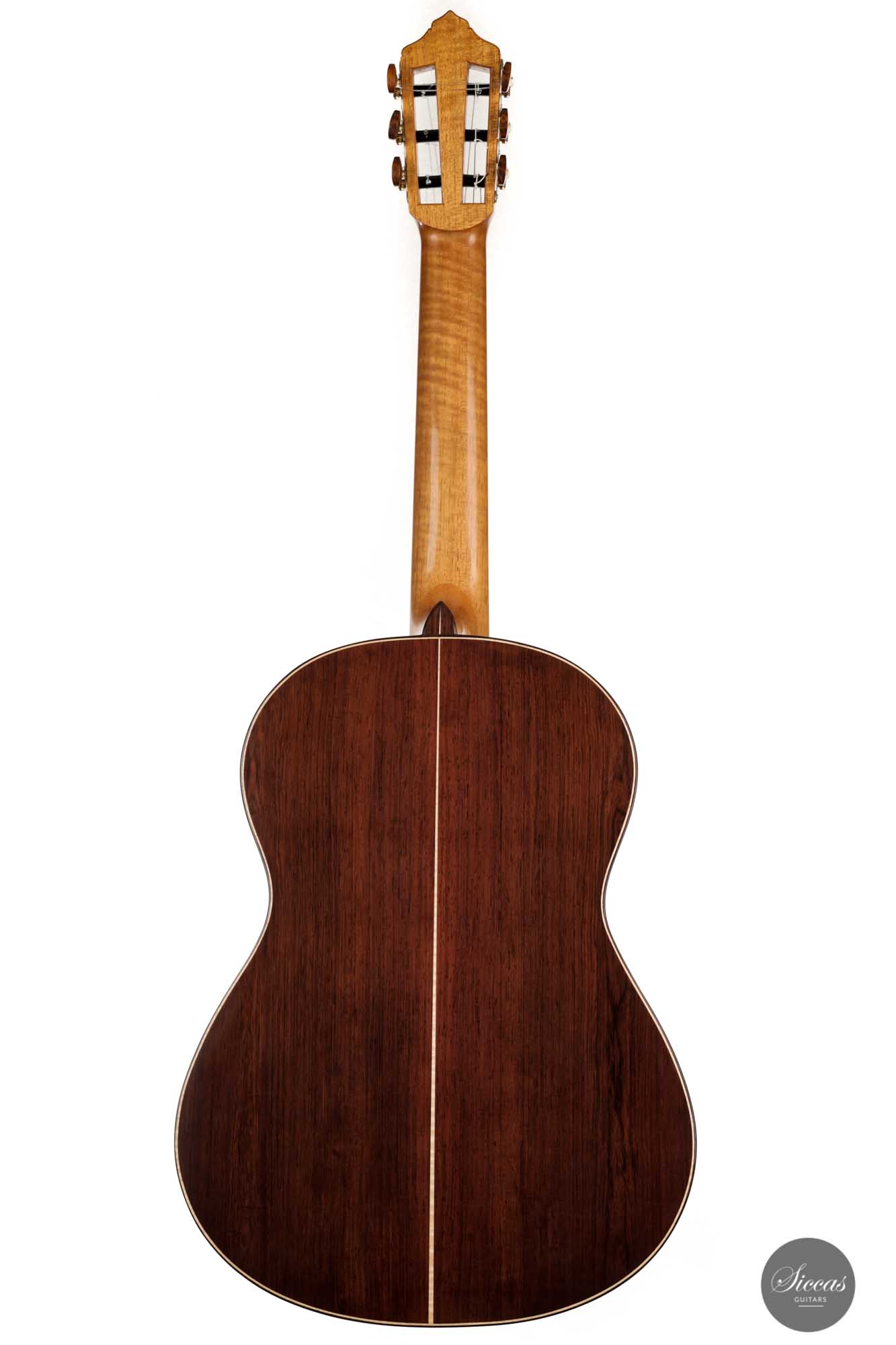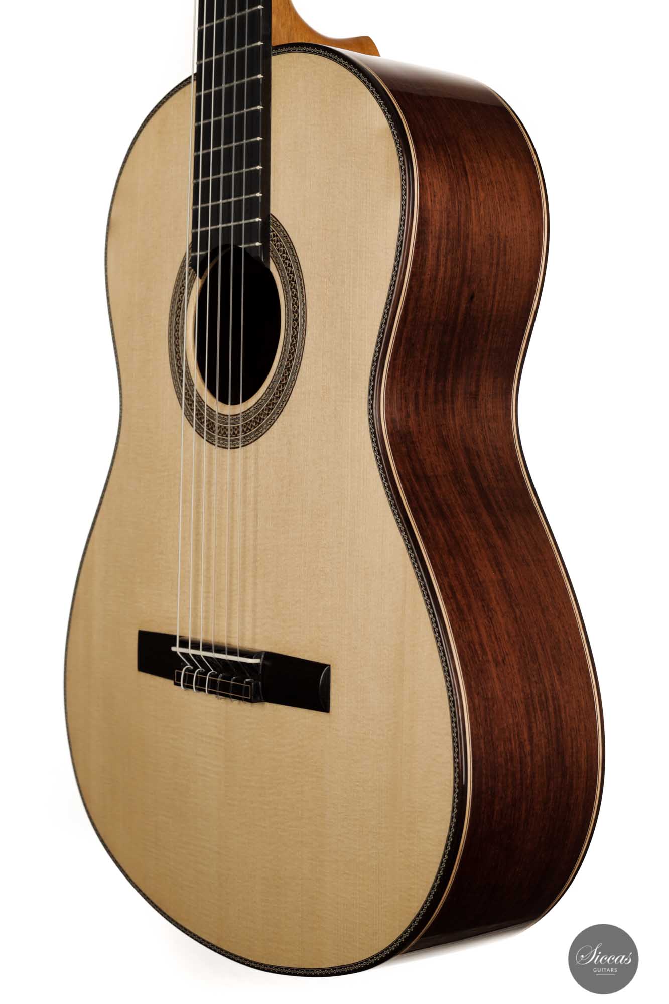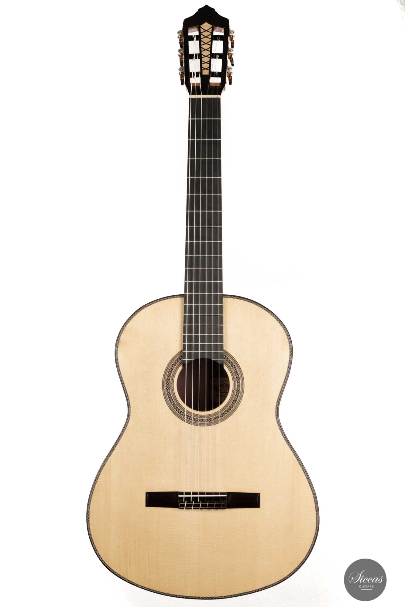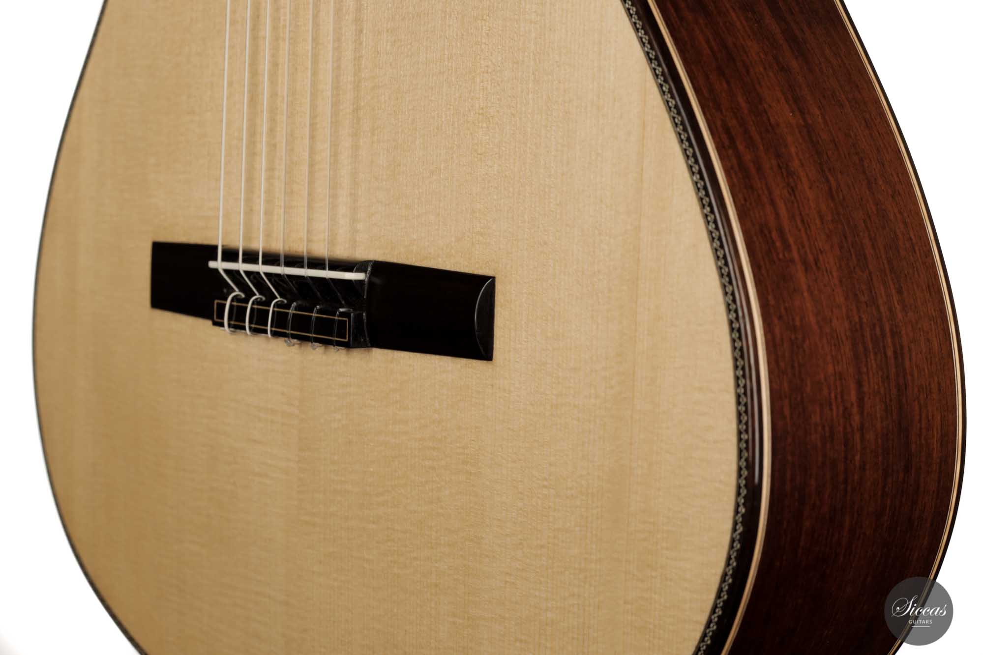 Hier haben wir eine herrliche Gitarre mit 63 cm Mensur und einem schwungvollen spanischen Klang. Diese reich verzierte, brandneue Gitarre kommt direkt aus der Werkstatt von Mijail und zeigt bereits eine große Offenheit im Klang. Der Diskant klingt klar und kraftvoll, unterstützt von selbstbewussten, satten Bässen. Darüber hinaus wird die Bespielbarkeit dank der kürzeren 63cm-Mensur auf ein neues Niveau gehoben, wodurch Streckungen für die linke Hand zum Kinderspiel wird. Gitarren mit einer Mensur von 63 cm sind nicht oft zu finden, und diese hier ist sowohl optisch als auch klanglich bemerkenswert.