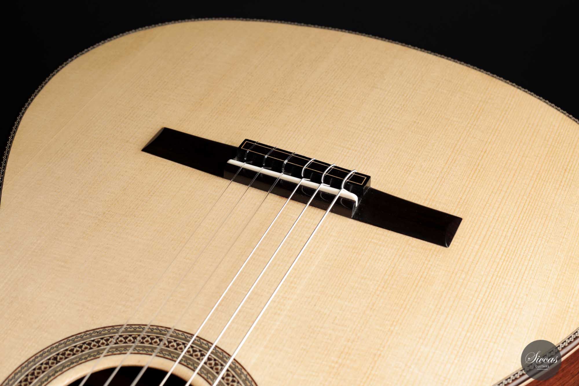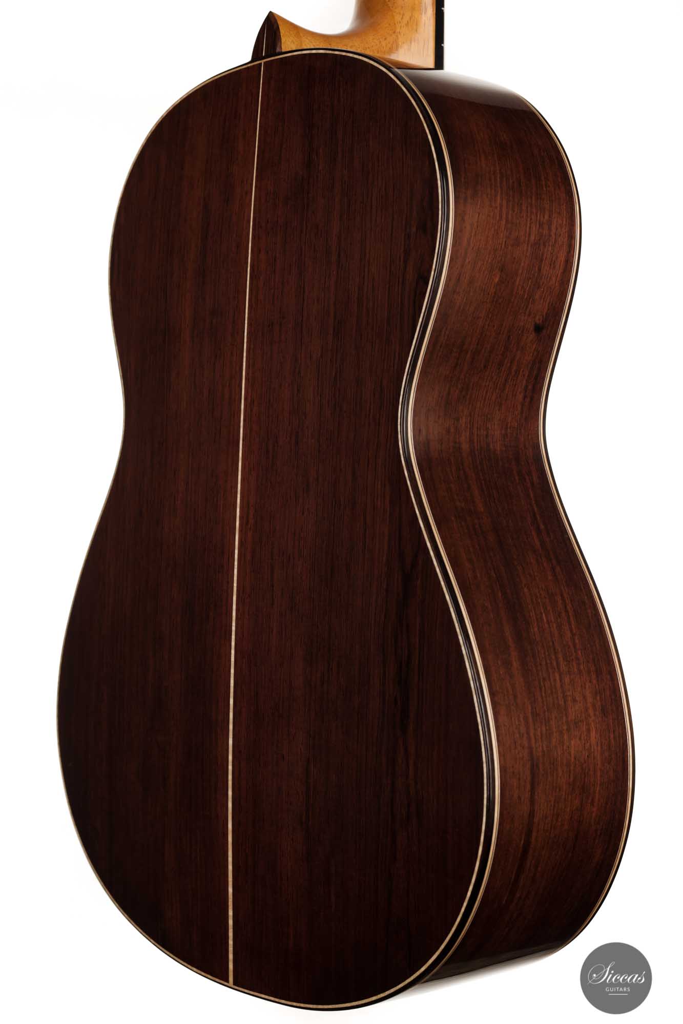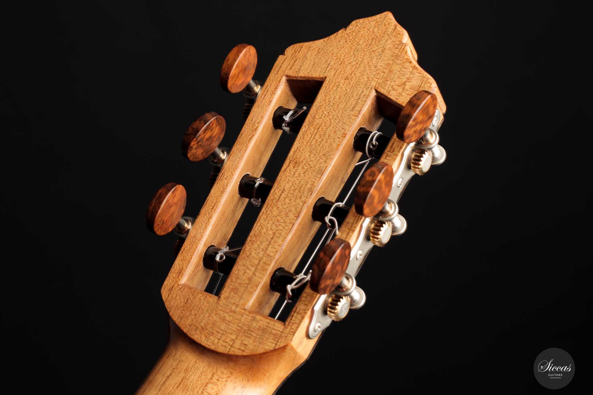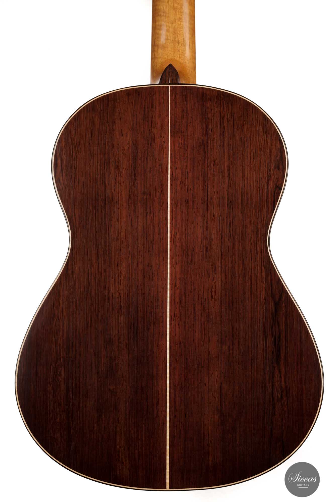 Hier haben wir eine herrliche Gitarre mit 63 cm Mensur und einem schwungvollen spanischen Klang. Diese reich verzierte, brandneue Gitarre kommt direkt aus der Werkstatt von Mijail und zeigt bereits eine große Offenheit im Klang. Der Diskant klingt klar und kraftvoll, unterstützt von selbstbewussten, satten Bässen. Darüber hinaus wird die Bespielbarkeit dank der kürzeren 63cm-Mensur auf ein neues Niveau gehoben, wodurch Streckungen für die linke Hand zum Kinderspiel wird. Gitarren mit einer Mensur von 63 cm sind nicht oft zu finden, und diese hier ist sowohl optisch als auch klanglich bemerkenswert.