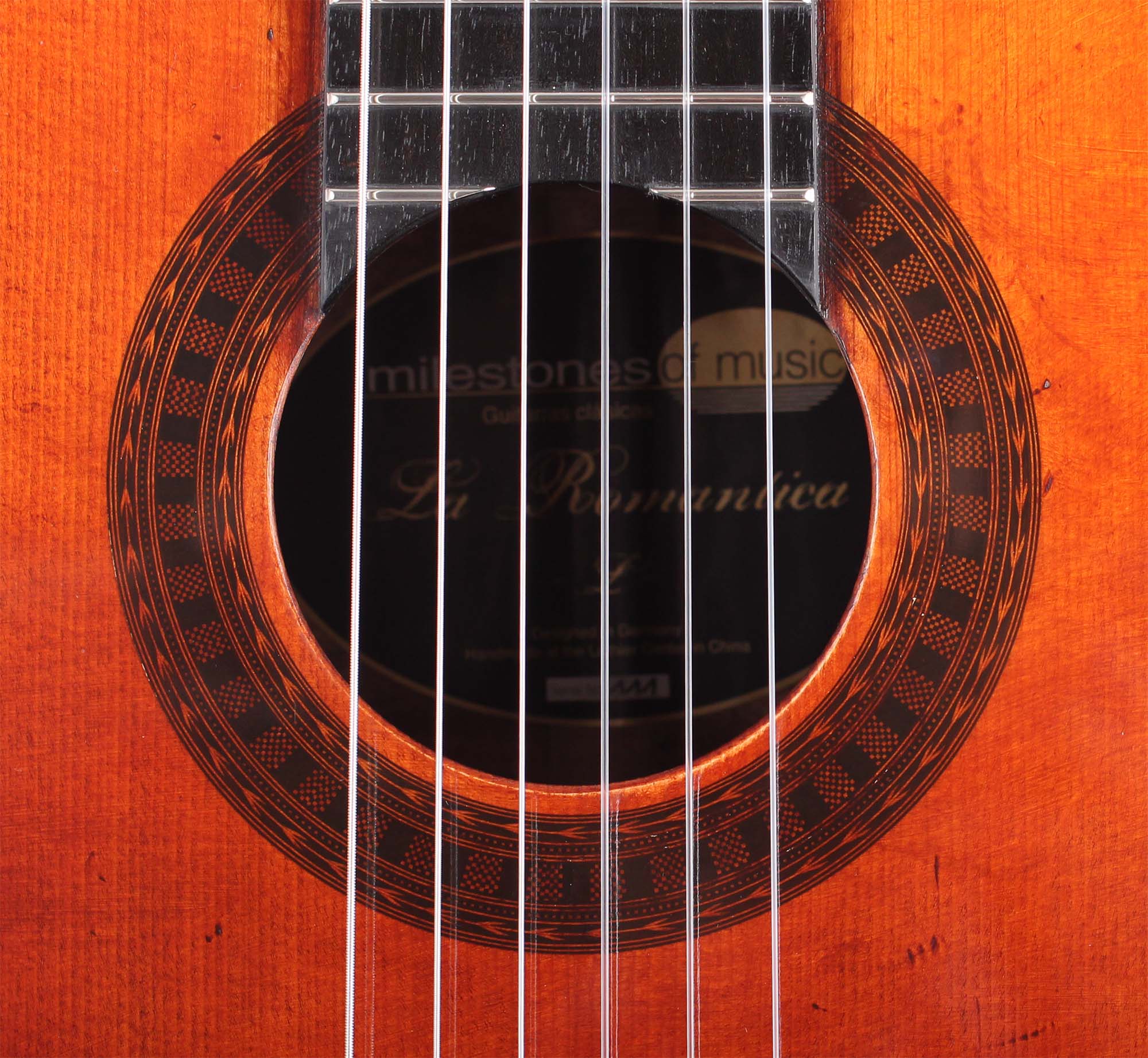 This guitar is based on a Lacôte model with modern elements like the headstock and the rosette. It's easy to play because auf the modern fretboard and a scale of 63 cm and a nut width of 50 mm. The rosette looks lovely and modern. This guitar model has a shellac finish. The sound of the La Romantica model is designed for early guitar music.