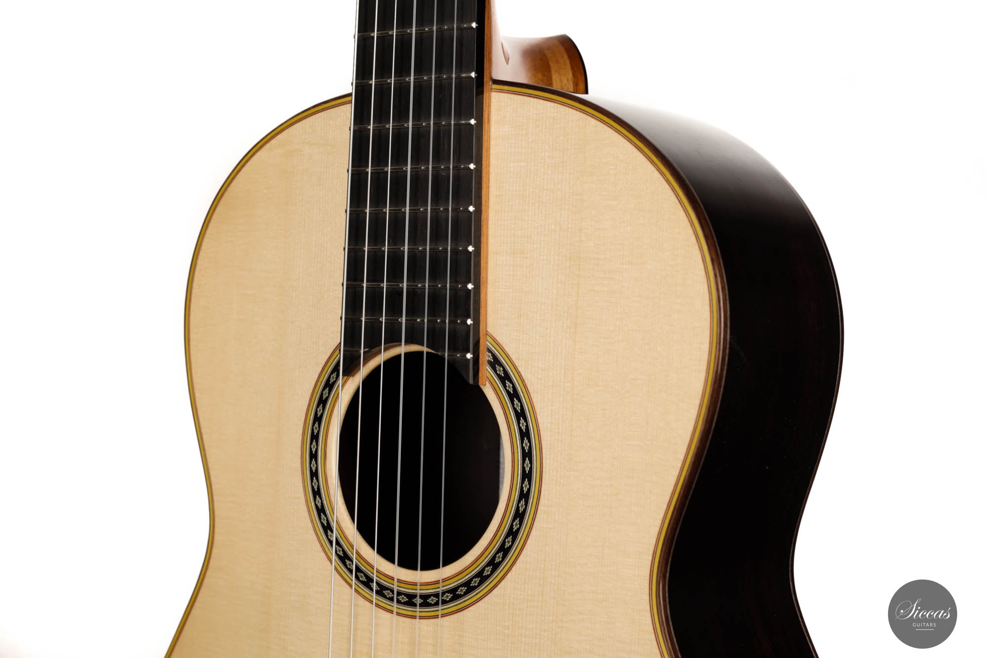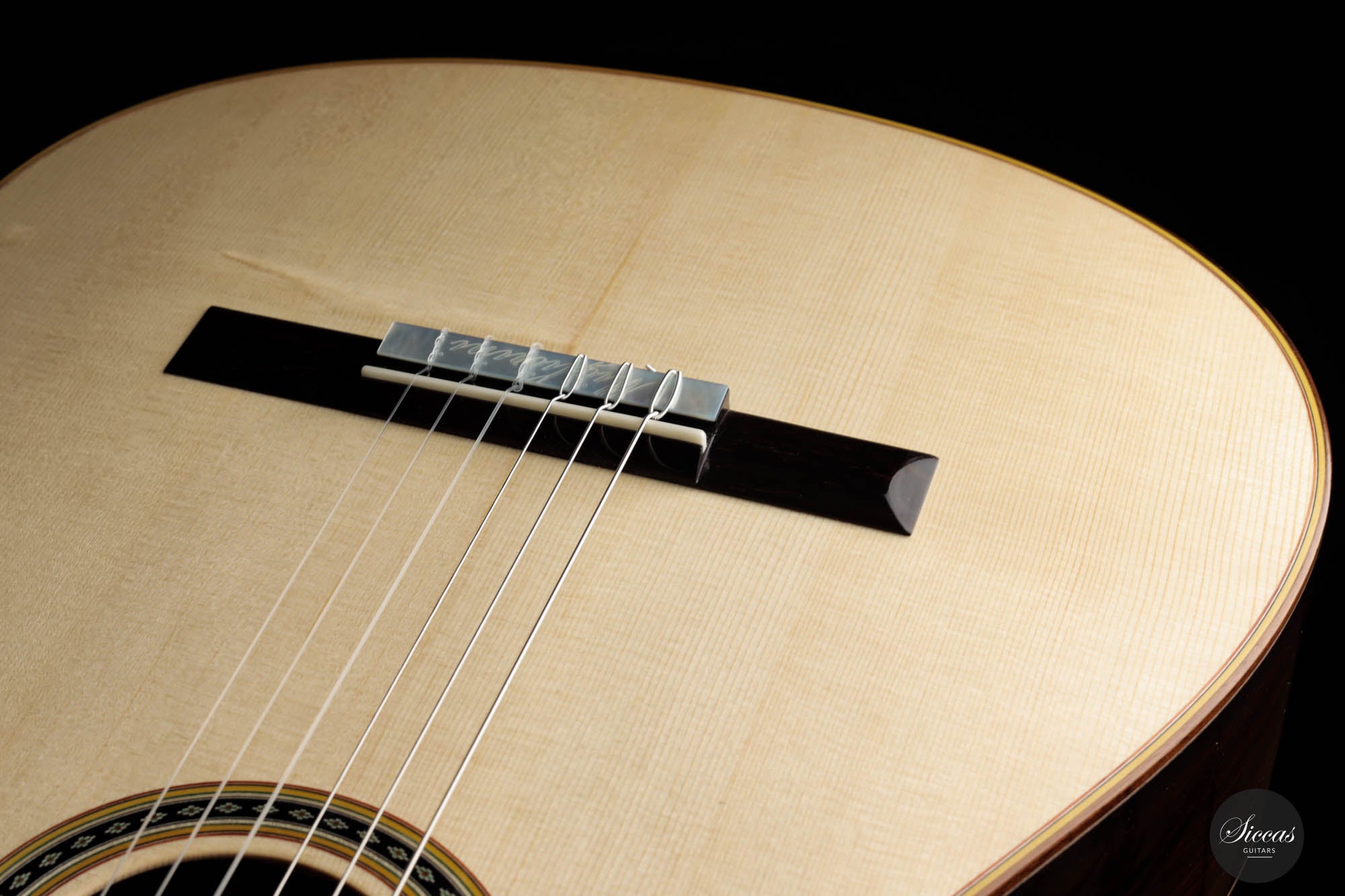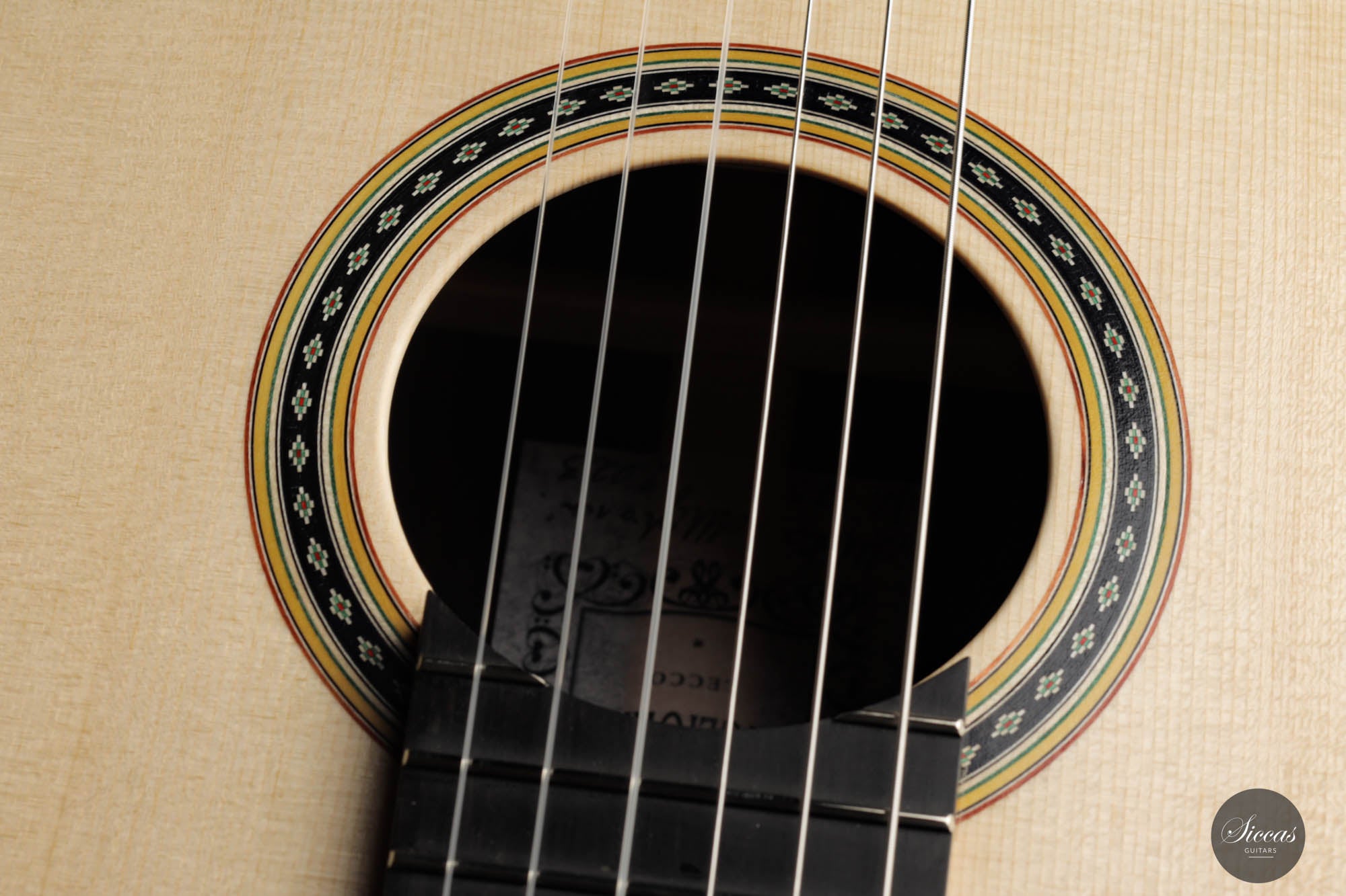Die 2023 Mirko Migliorini Double-Top-Gitarre ist ein außergewöhnliches Instrument, das modernes Design mit traditioneller Handwerkskunst verbindet. Die Gitarre ist sorgfältig mit einer Fichtendecke mit doppelter Decke gefertigt, die einen reichen und resonanten Klang erzeugt, während der Boden und die Zargen aus indischem Palisander einen warmen und ausgewogenen Klangcharakter bieten. Mirko hat erhebliche Anstrengungen unternommen, um ein Instrument zu schaffen, das sowohl mühelos zu spielen ist als auch die Anforderungen moderner Gitarristen aller Niveaus erfüllen kann. Die Gitarre verfügt über traditionelle Techniken und Designelemente, wie eine klassische Rosette und eine Kopfplatte, die zu ihrer zeitlosen Attraktivität beitragen. Für die Lackierung hat Mirko eine eigene Schellackrezeptur verwendet, die mit Nitrocellulose und anderen Harzen verstärkt wurde. Diese einzigartige Kombination sorgt für eine sehr dünne und dennoch starke Lackierung, die die Klangqualität der Gitarre verbessert. Die Lackierung ist außerdem sehr haltbar und wird die Gitarre über Jahre hinweg schützen. Insgesamt ist die 2023 Mirko Migliorini Double-Top-Gitarre ein außergewöhnliches Instrument, das Musiker aller Niveaus inspirieren wird.