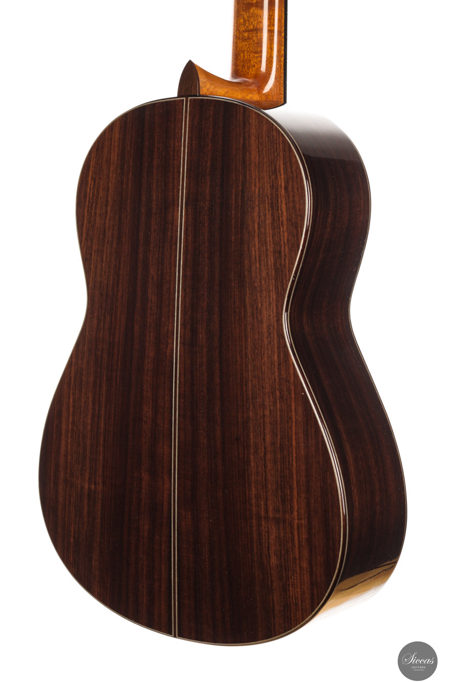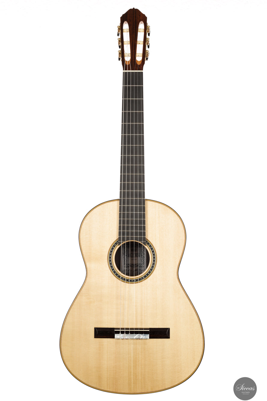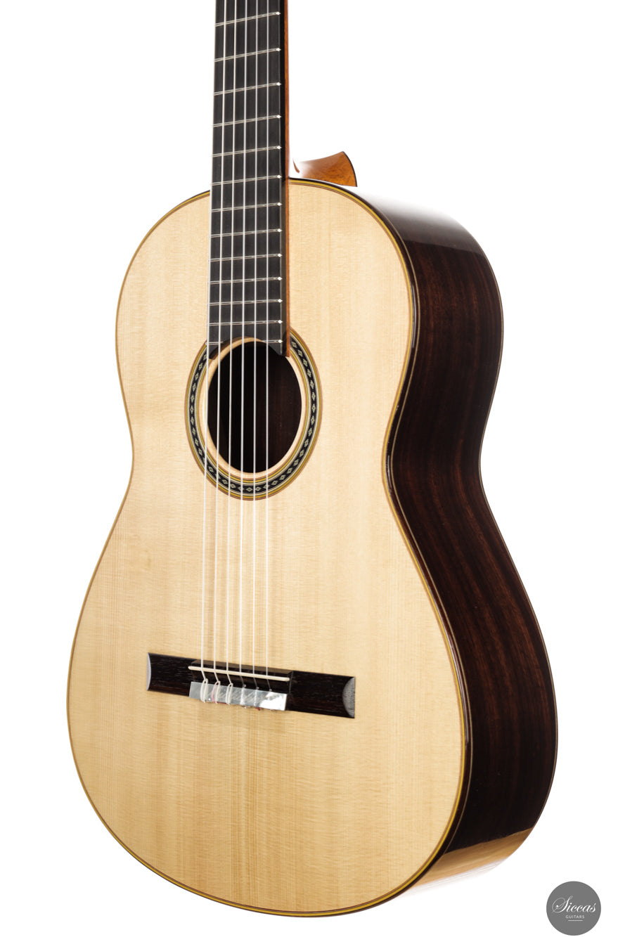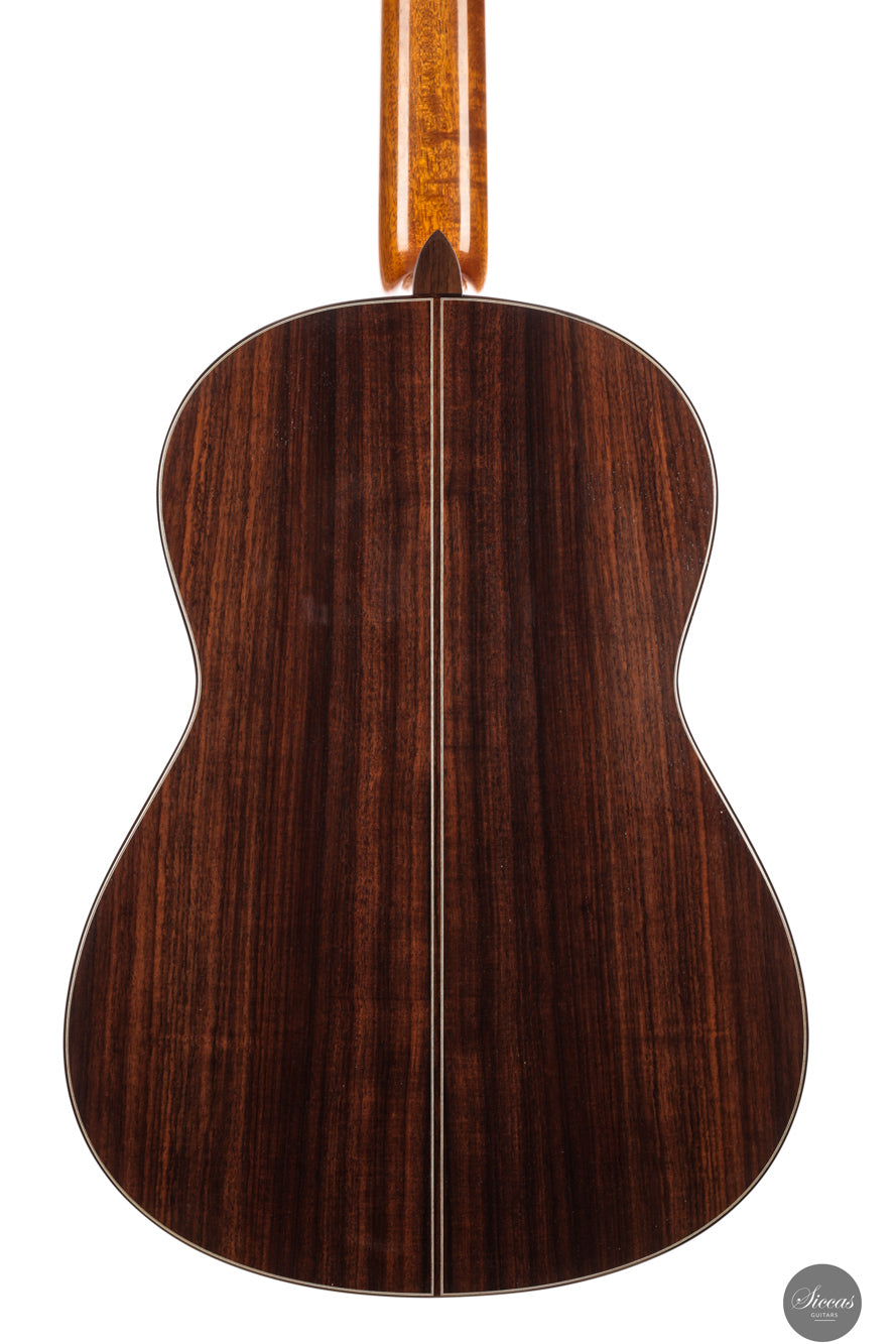 Diese Double Top Gitarre aus dem Jahr 2025 verbindet zeitgenössisches Design mit traditioneller Handwerkskunst. Die äußere Fichtendecke ist mit einer inneren Zederschicht kombiniert und bildet eine reaktionsfreudige und flexible Struktur, die sehr leicht auf den Anschlag reagiert. Der Korpus aus indischem Palisander ist mit einer dünnen Nitrozelluloselackierung versehen, welche das Holz schützt und gleichzeitig seine Schwingungsfreiheit erhält. Alessi Mechaniken sorgen für ein geschmeidiges und stabiles Stimmen.